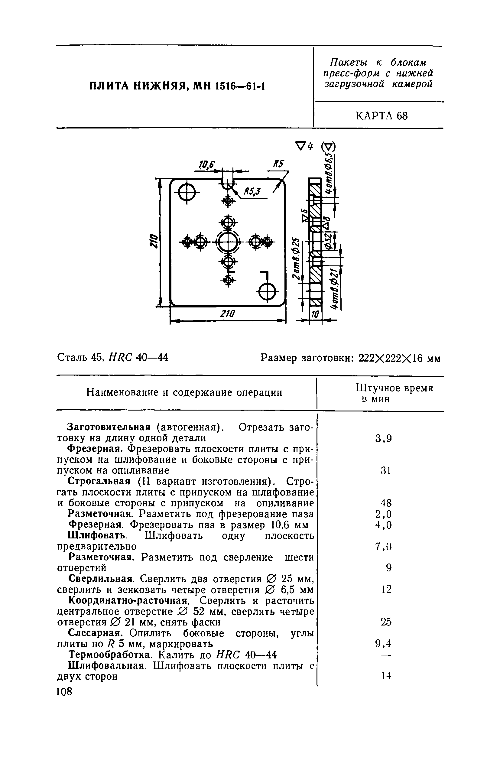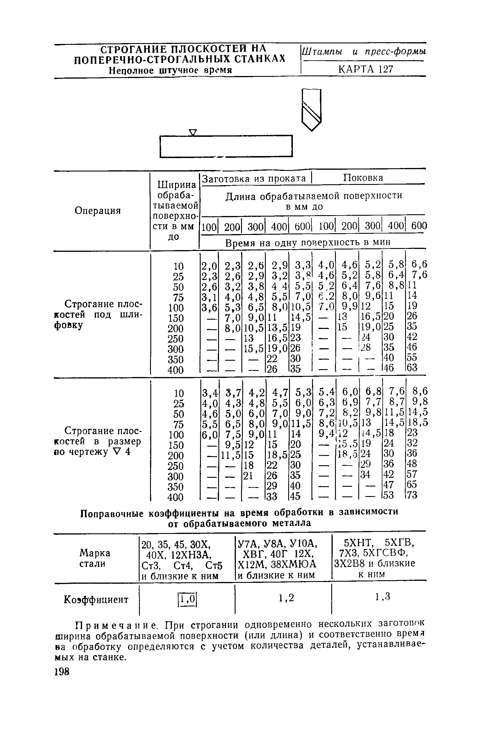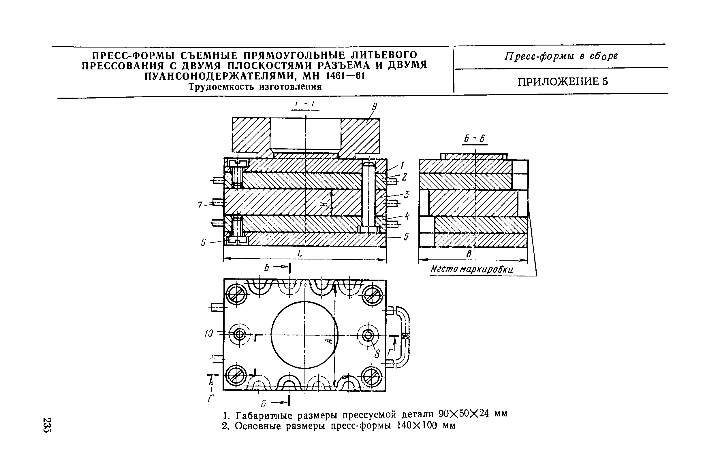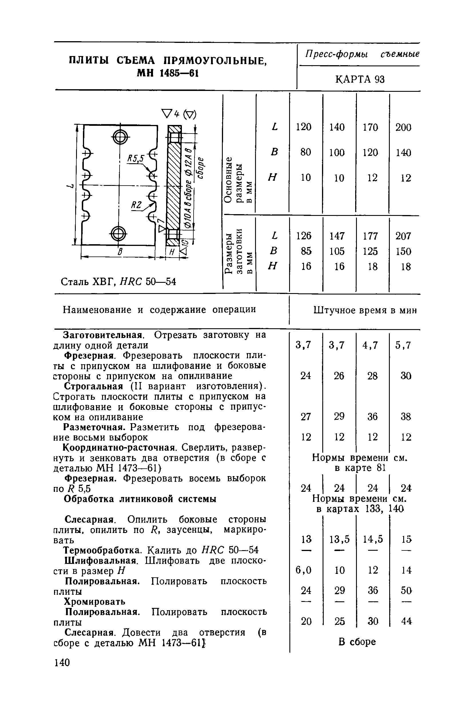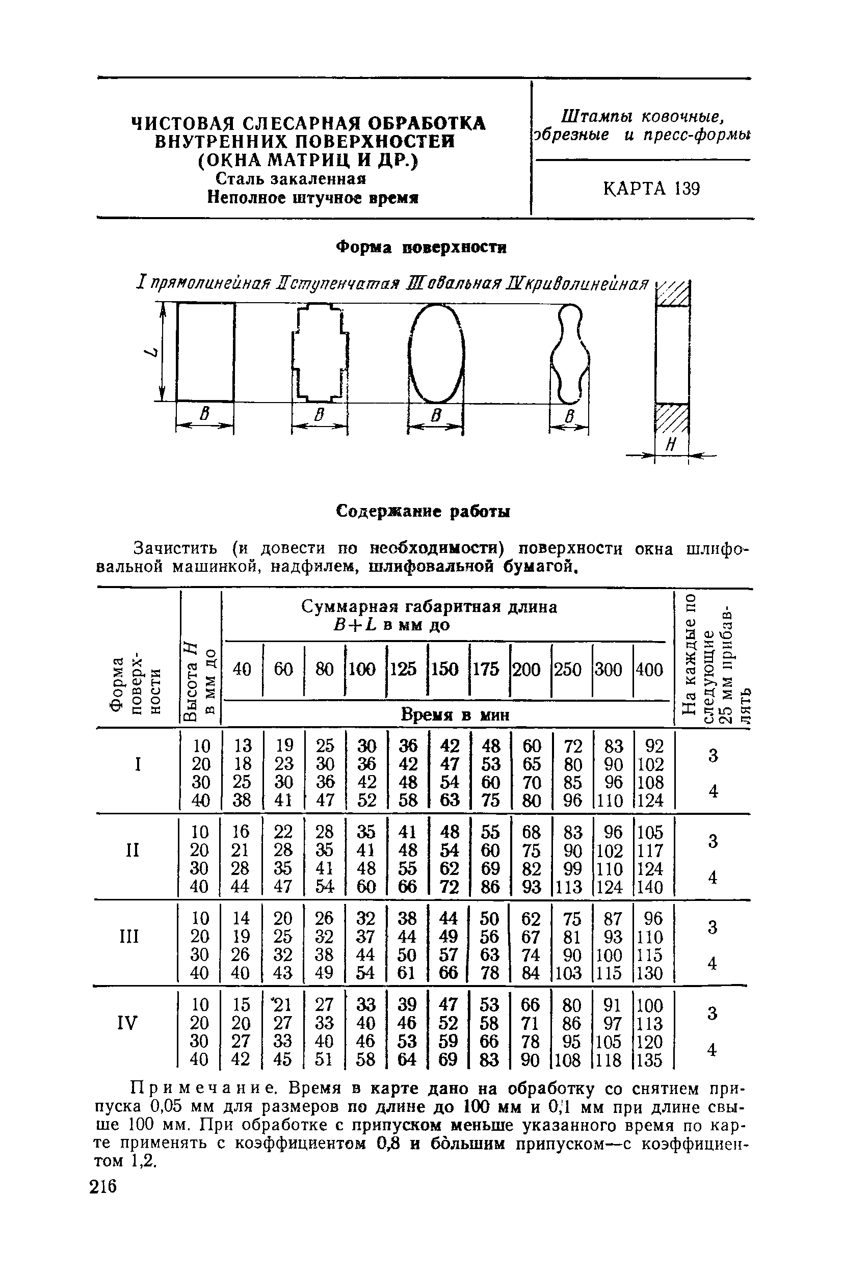 | Оглавление: | I. Типовые нормы времени на изготовление штампов II. Типовые нормы времени на изготовление пресс-форм Универсальные блоки пресс-форм с нижней загрузочной камерой Пакеты к блокам пресс-форм с нижней загрузочной камерой Пресс-формы съемные III. Нормативы неполного штучного времени и нормы времени на операции, не охваченные типовыми нормами времени IV. Подготовительно-заключительное время на партию Приложение 1. Штамп комбинированный, Трудоемкость изготовления Приложение 2. Пресс-формы для прессования изделий из реактопластов. Универсальные блоки с нижней загрузочной камерой, МН 1515-61. Трудоемкость изготовления Приложение 3. Пакеты к блокам пресс-форм с нижней загрузочной камерой, МН 1516-61 Приложение 4. Пресс-формы съемные круглые прямого прессования с двумя плоскостями разъема, МН 1452-61. Трудоемкость изготовления Приложение 5. Пресс-формы съемные прямоугольные литьевого прессования с двумя плоскостями разъема и двумя пуансонодержателями, МН 1461-61. Трудоемкость изготовления Приложение 6. Режимы резания, принятые при изготовлении штампов и пресс-форм Приложение 7. Припуски на механическую обработку Приложение 8. Перечень типовых моделей оборудования инструментального цеха штампов и пресс-форм Приложение 9. Теоретический вес заготовк |