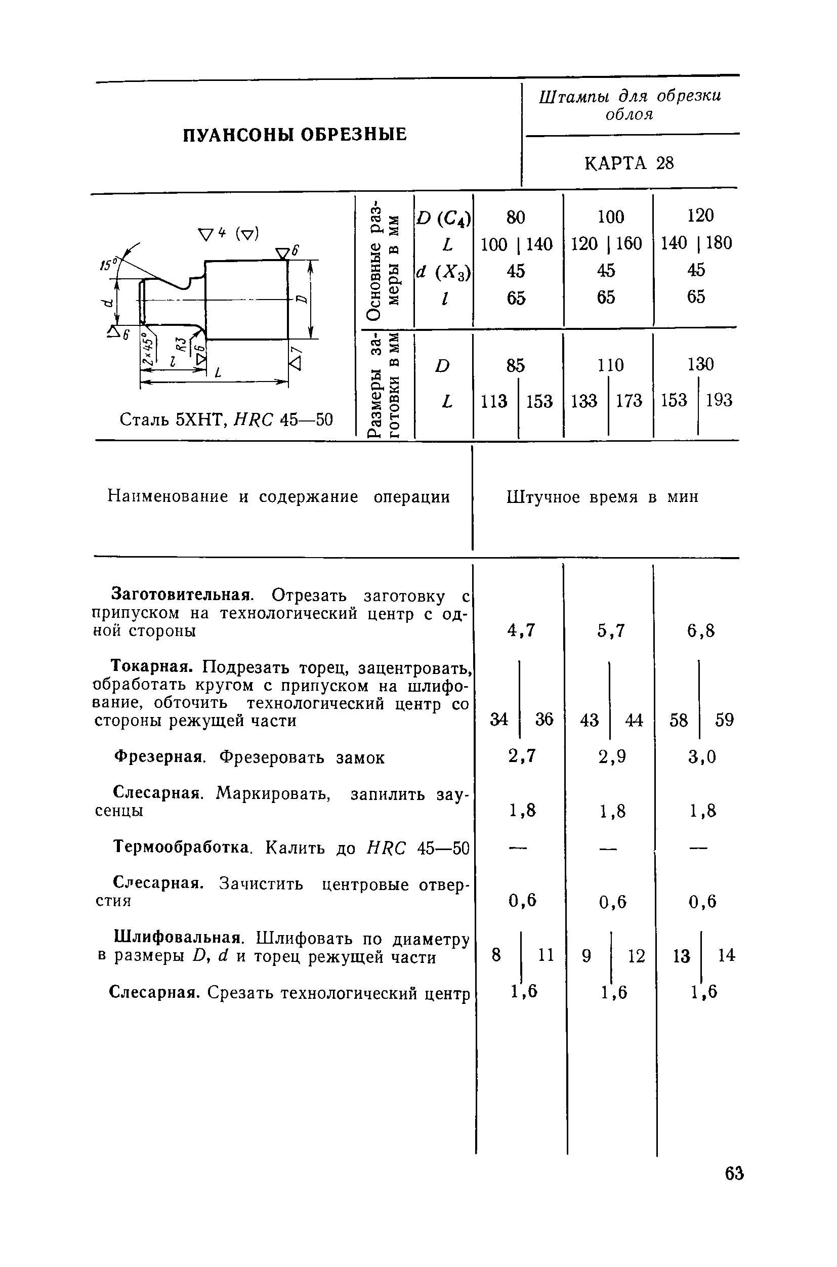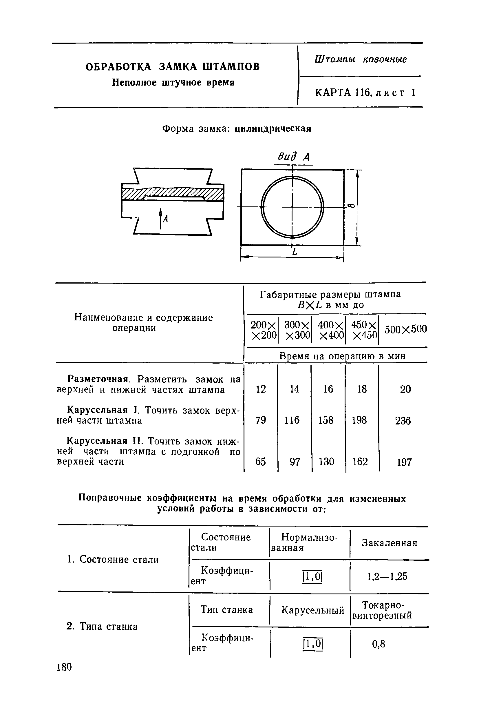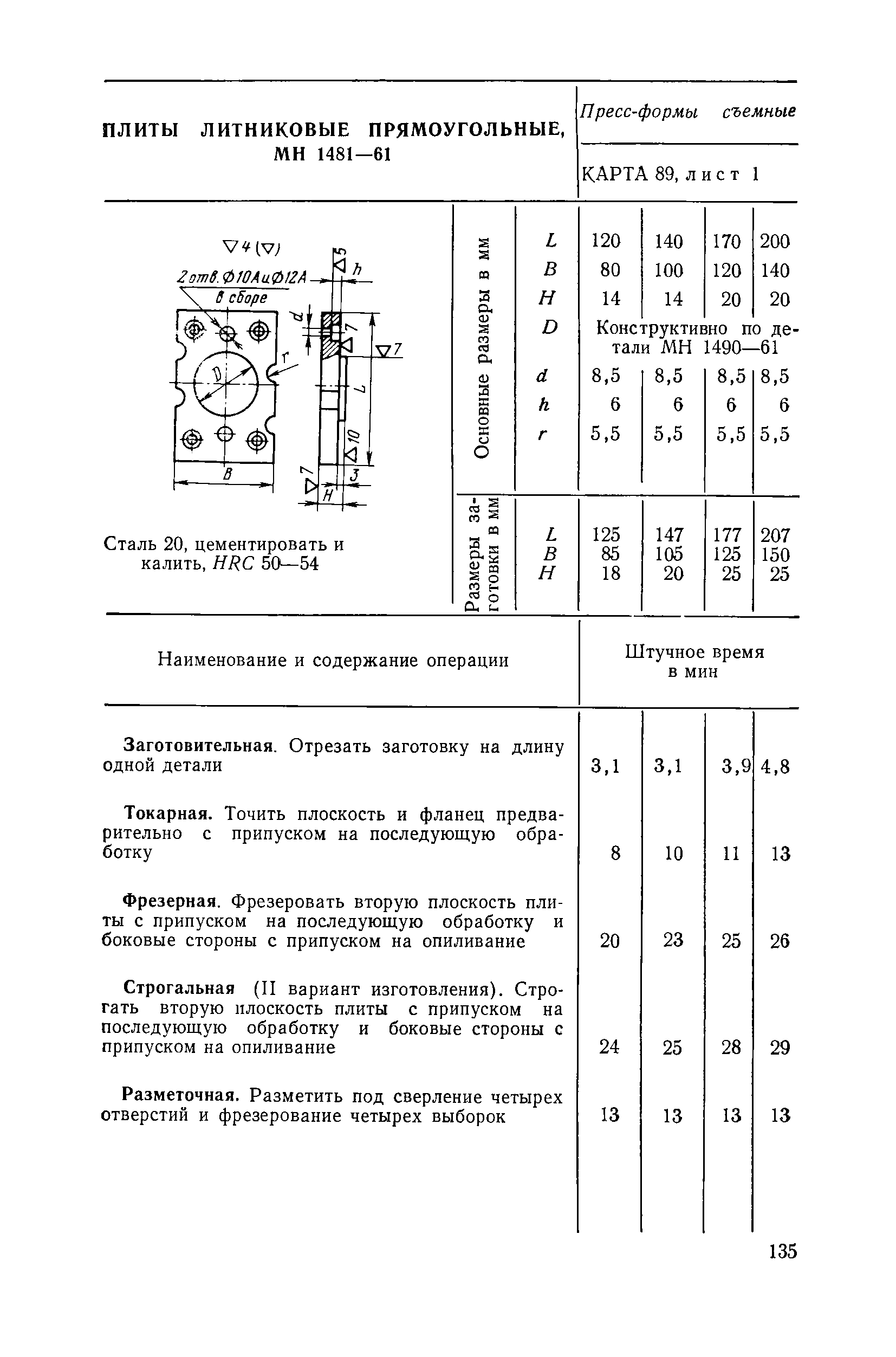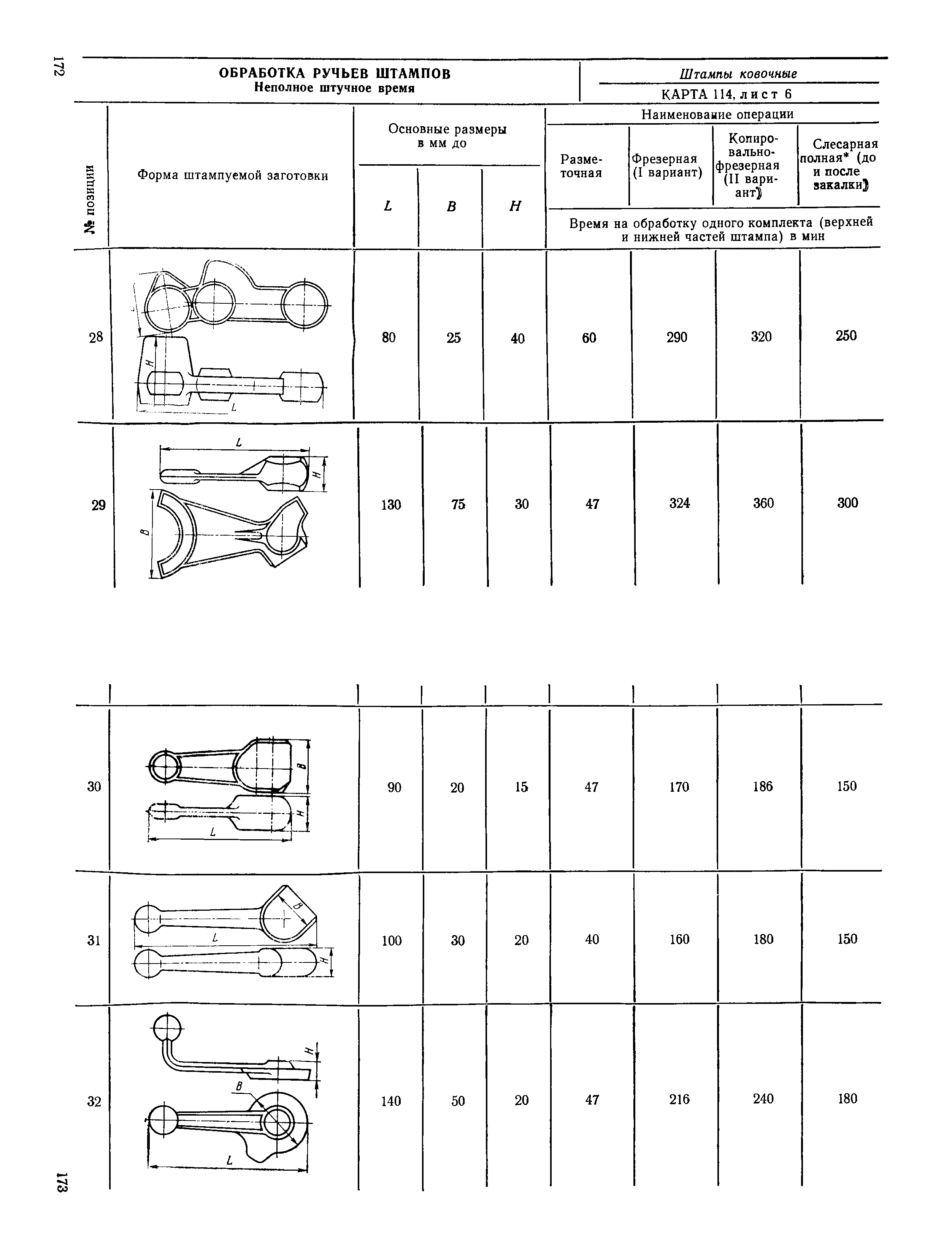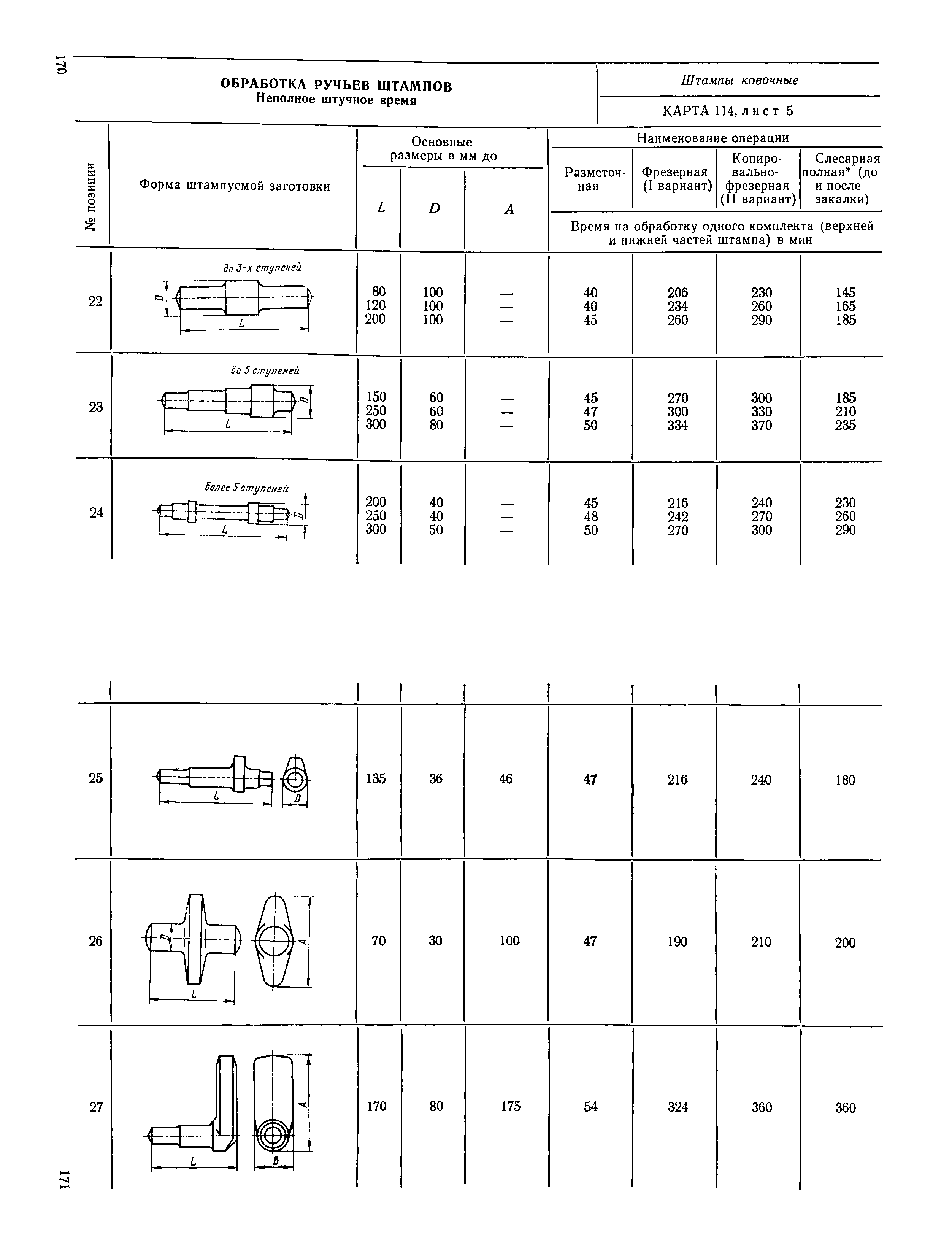| Оглавление: | I. Типовые нормы времени на изготовление штампов II. Типовые нормы времени на изготовление пресс-форм Универсальные блоки пресс-форм с нижней загрузочной камерой Пакеты к блокам пресс-форм с нижней загрузочной камерой Пресс-формы съемные III. Нормативы неполного штучного времени и нормы времени на операции, не охваченные типовыми нормами времени IV. Подготовительно-заключительное время на партию Приложение 1. Штамп комбинированный, Трудоемкость изготовления Приложение 2. Пресс-формы для прессования изделий из реактопластов. Универсальные блоки с нижней загрузочной камерой, МН 1515-61. Трудоемкость изготовления Приложение 3. Пакеты к блокам пресс-форм с нижней загрузочной камерой, МН 1516-61 Приложение 4. Пресс-формы съемные круглые прямого прессования с двумя плоскостями разъема, МН 1452-61. Трудоемкость изготовления Приложение 5. Пресс-формы съемные прямоугольные литьевого прессования с двумя плоскостями разъема и двумя пуансонодержателями, МН 1461-61. Трудоемкость изготовления Приложение 6. Режимы резания, принятые при изготовлении штампов и пресс-форм Приложение 7. Припуски на механическую обработку Приложение 8. Перечень типовых моделей оборудования инструментального цеха штампов и пресс-форм Приложение 9. Теоретический вес заготовк |