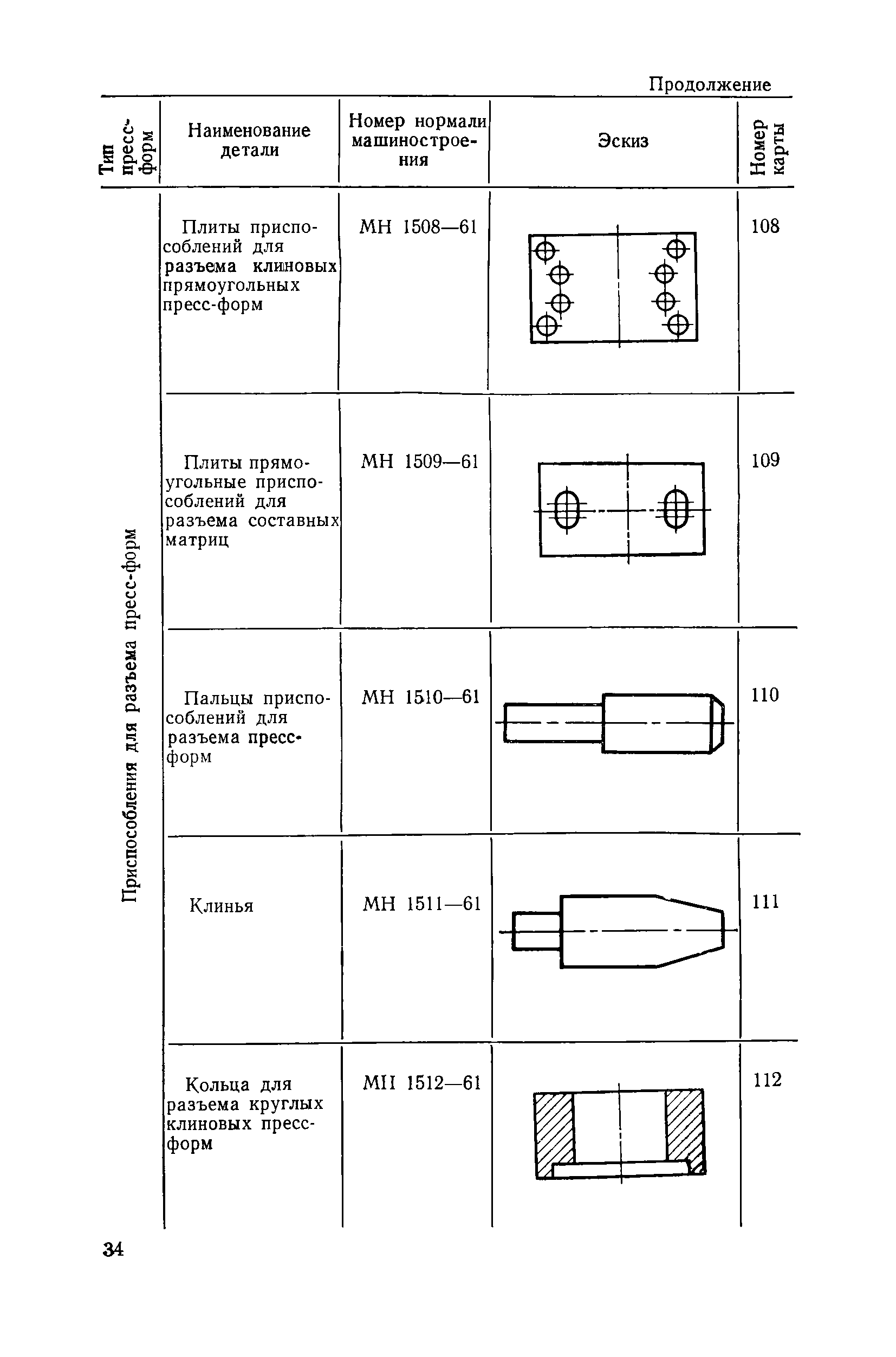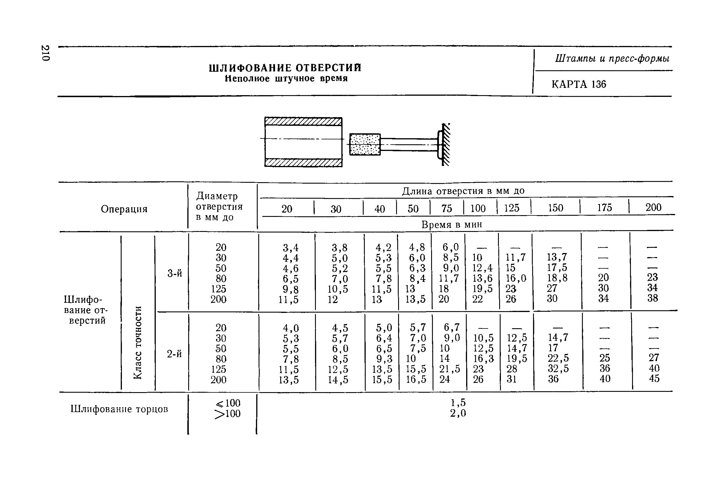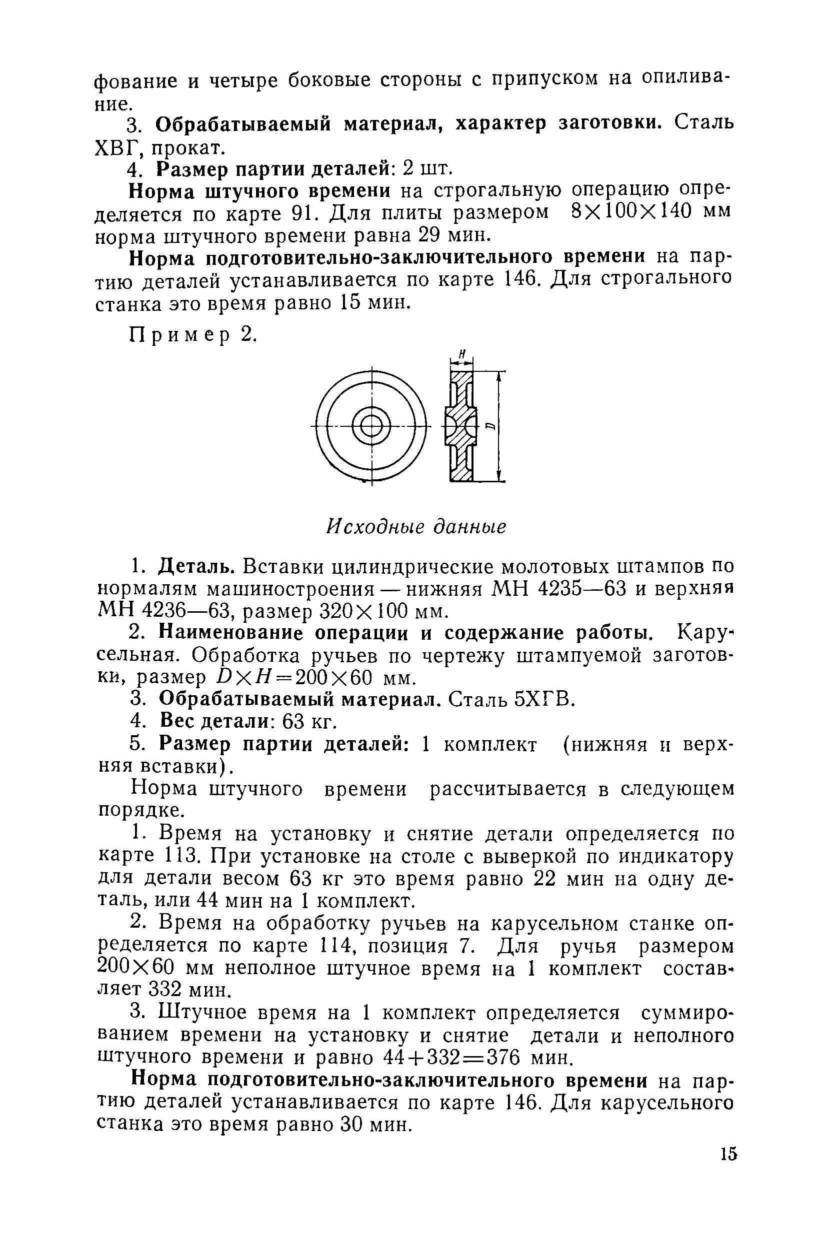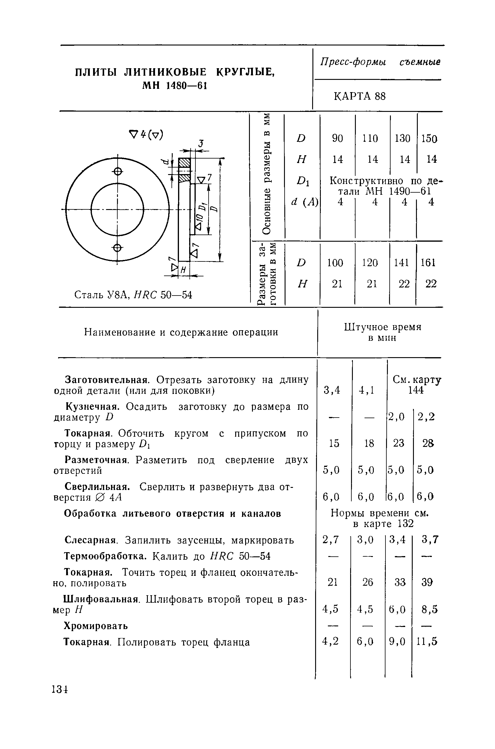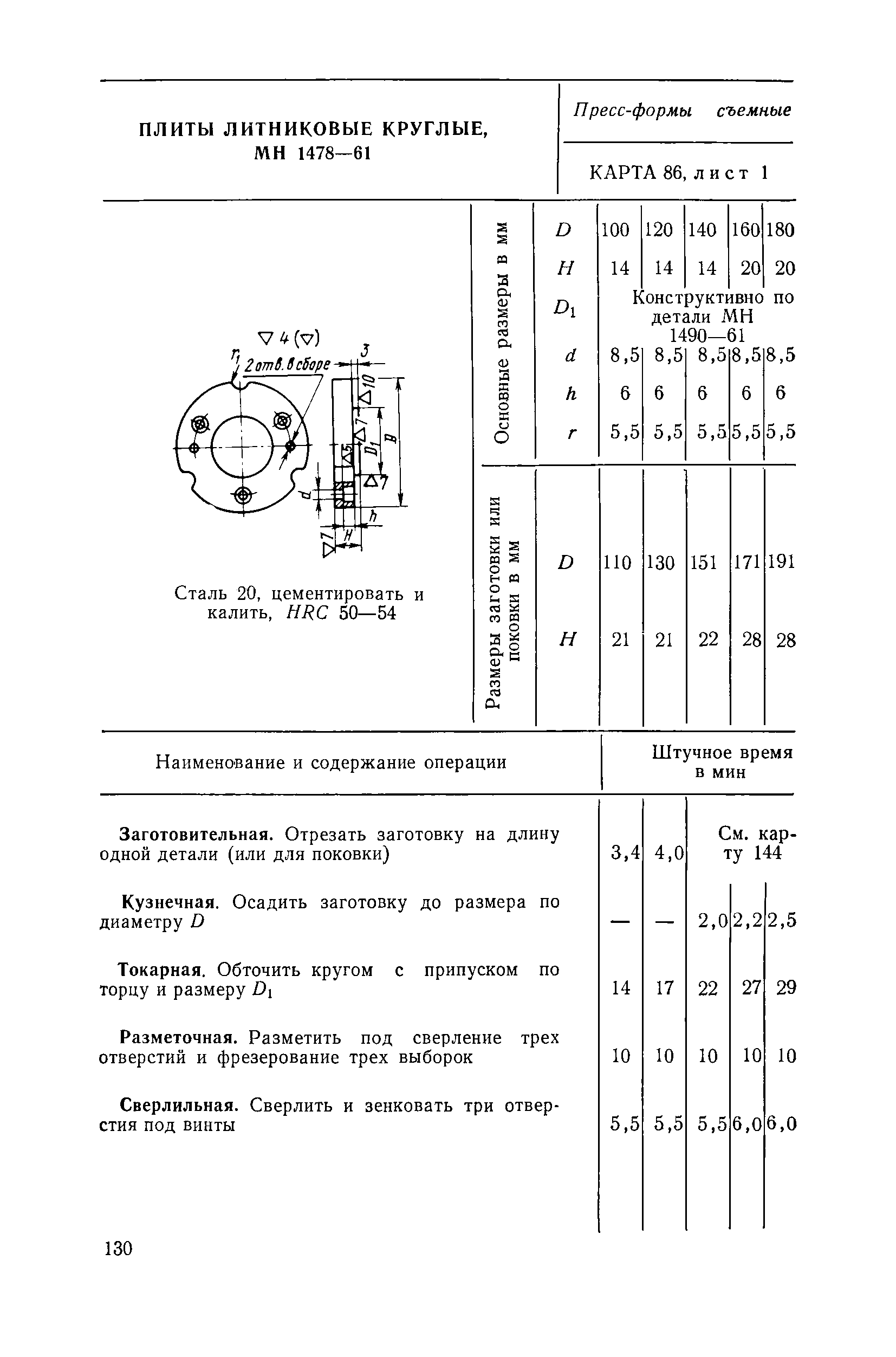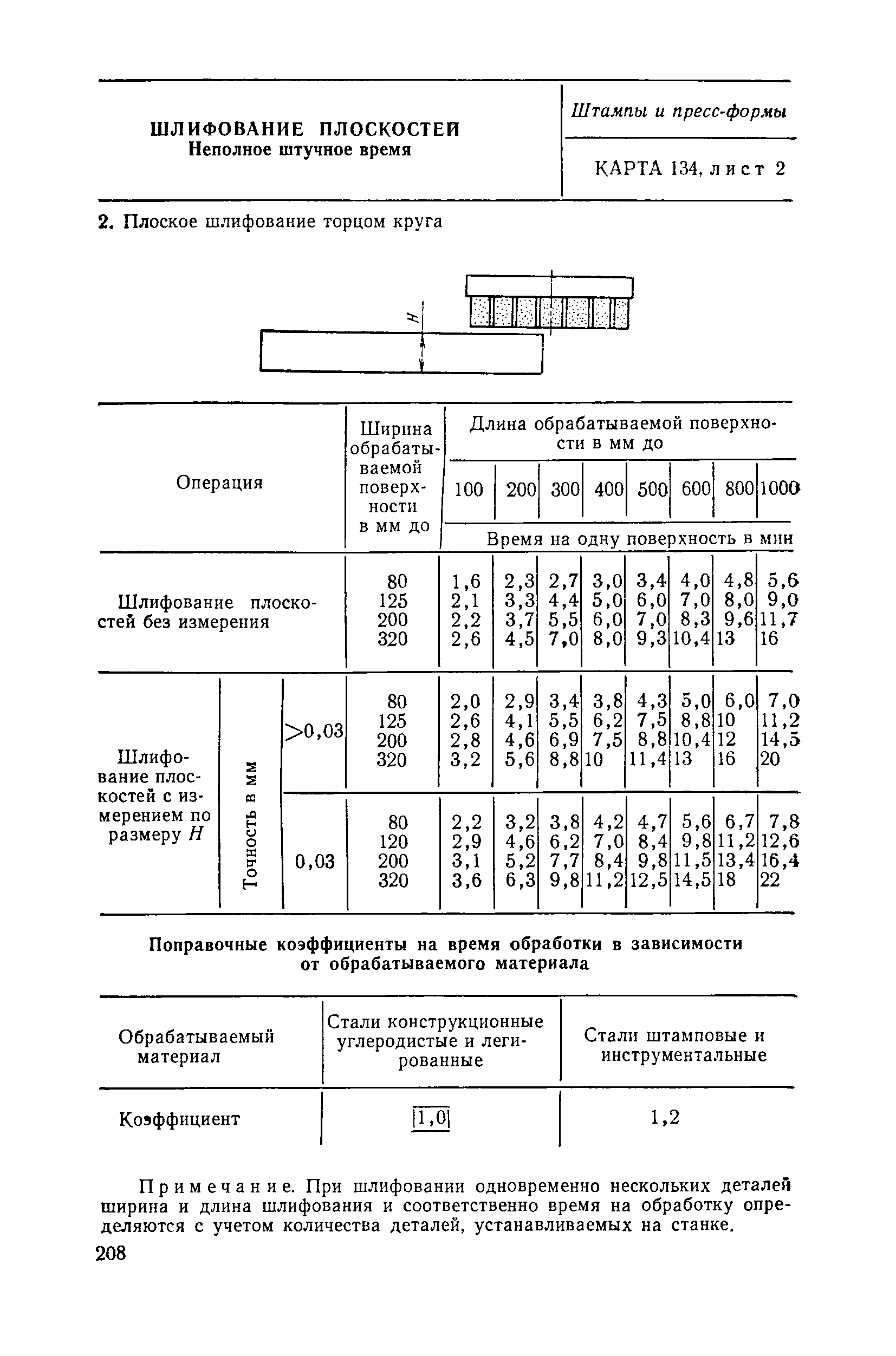 | Оглавление: | I. Типовые нормы времени на изготовление штампов II. Типовые нормы времени на изготовление пресс-форм Универсальные блоки пресс-форм с нижней загрузочной камерой Пакеты к блокам пресс-форм с нижней загрузочной камерой Пресс-формы съемные III. Нормативы неполного штучного времени и нормы времени на операции, не охваченные типовыми нормами времени IV. Подготовительно-заключительное время на партию Приложение 1. Штамп комбинированный, Трудоемкость изготовления Приложение 2. Пресс-формы для прессования изделий из реактопластов. Универсальные блоки с нижней загрузочной камерой, МН 1515-61. Трудоемкость изготовления Приложение 3. Пакеты к блокам пресс-форм с нижней загрузочной камерой, МН 1516-61 Приложение 4. Пресс-формы съемные круглые прямого прессования с двумя плоскостями разъема, МН 1452-61. Трудоемкость изготовления Приложение 5. Пресс-формы съемные прямоугольные литьевого прессования с двумя плоскостями разъема и двумя пуансонодержателями, МН 1461-61. Трудоемкость изготовления Приложение 6. Режимы резания, принятые при изготовлении штампов и пресс-форм Приложение 7. Припуски на механическую обработку Приложение 8. Перечень типовых моделей оборудования инструментального цеха штампов и пресс-форм Приложение 9. Теоретический вес заготовк |
