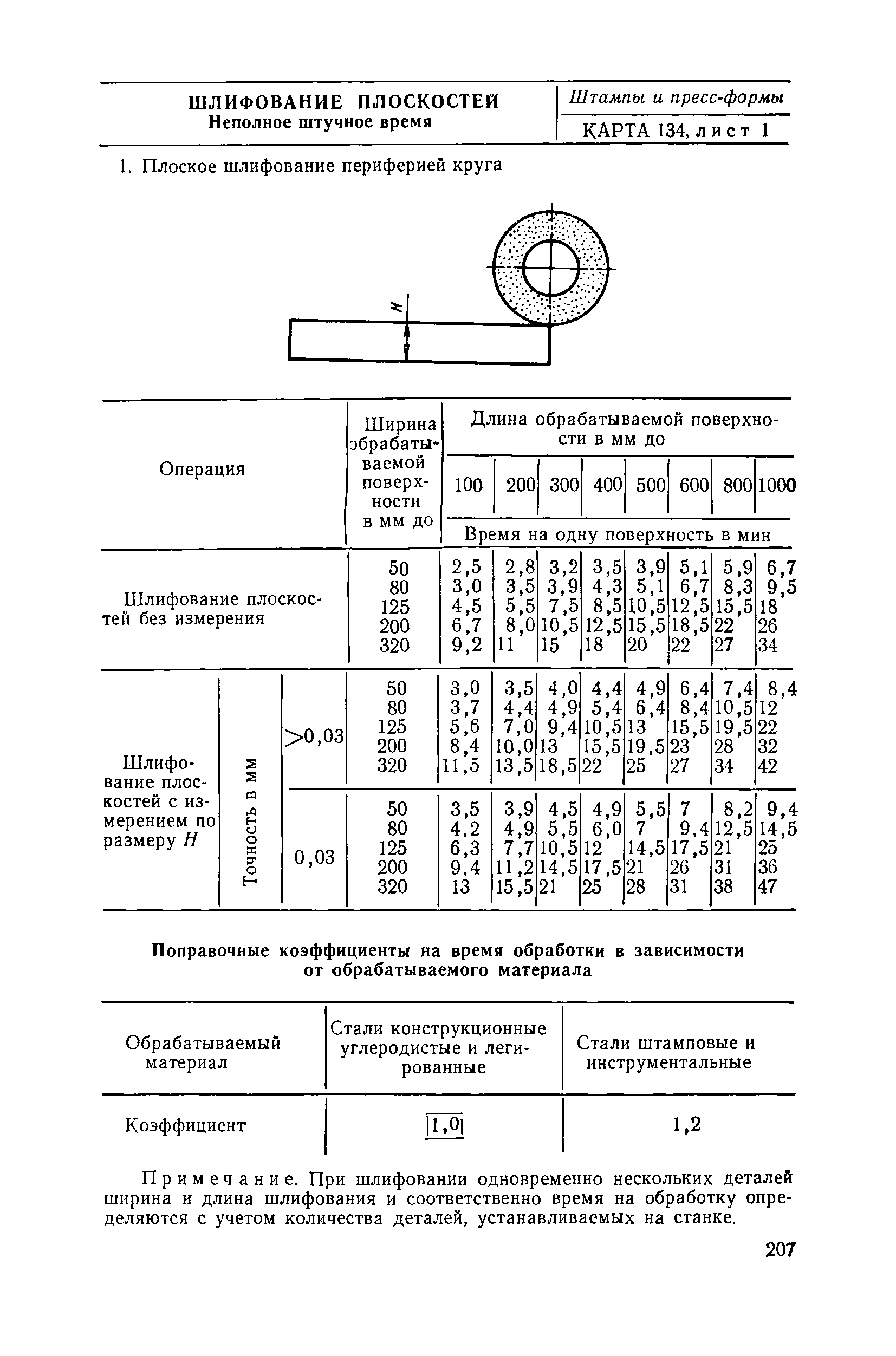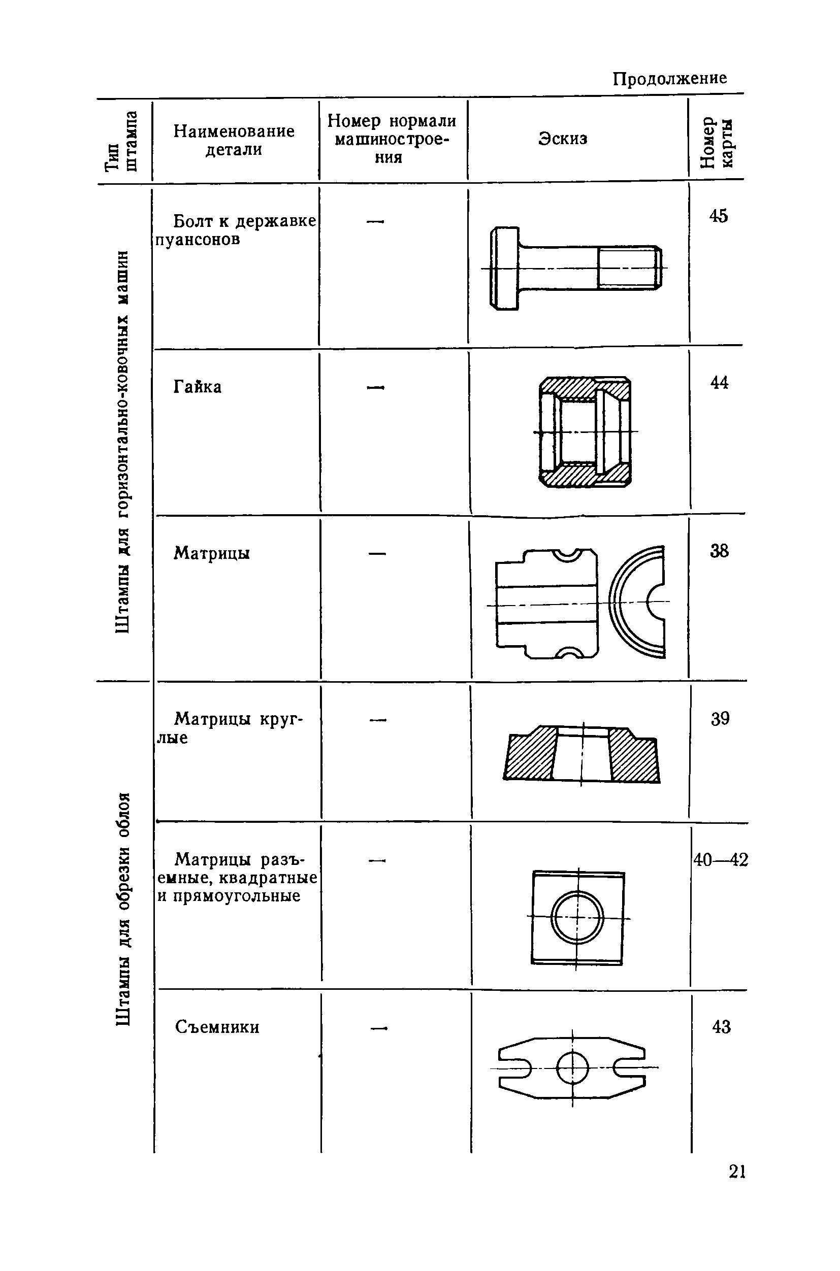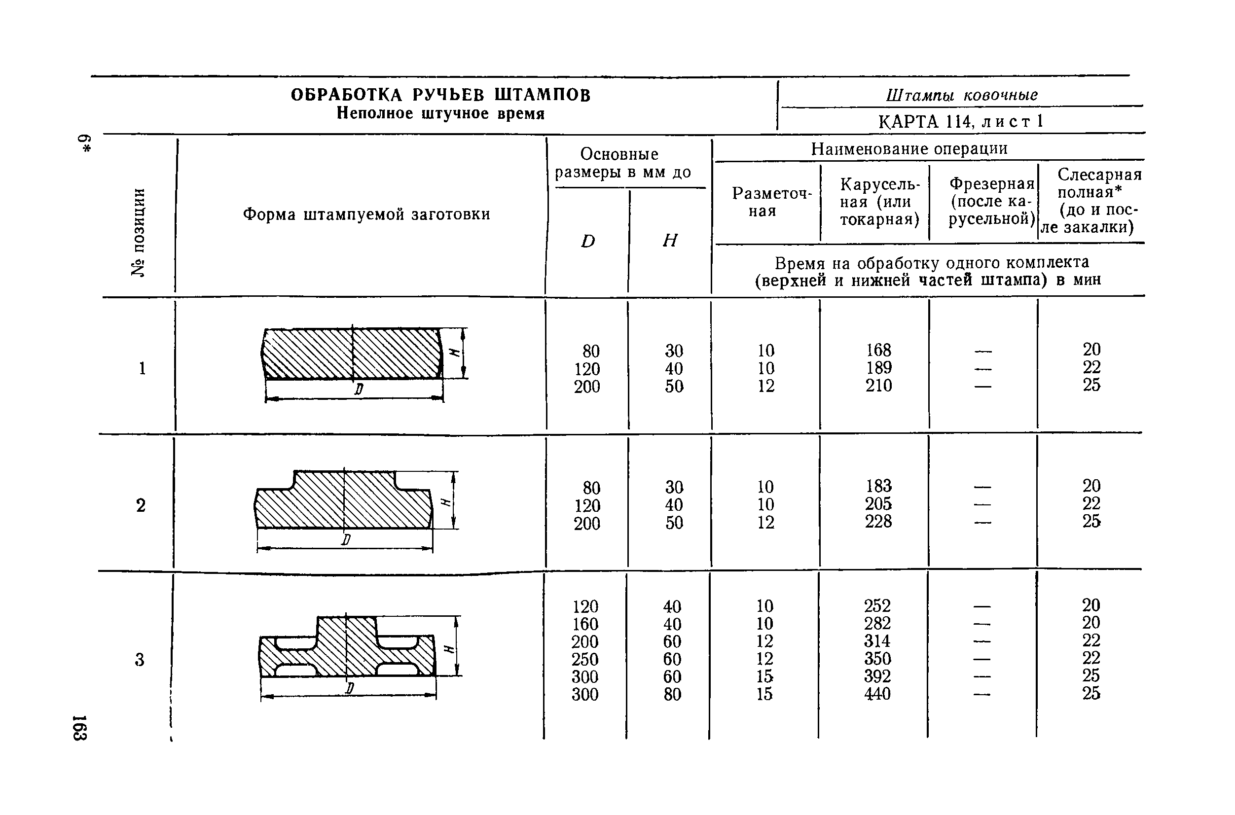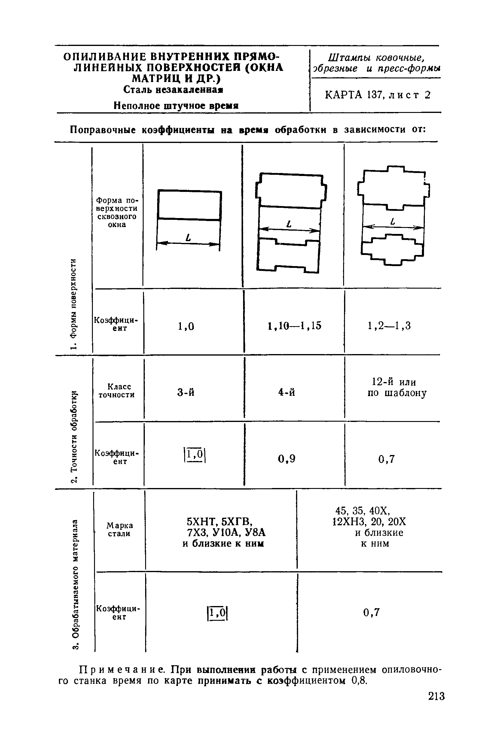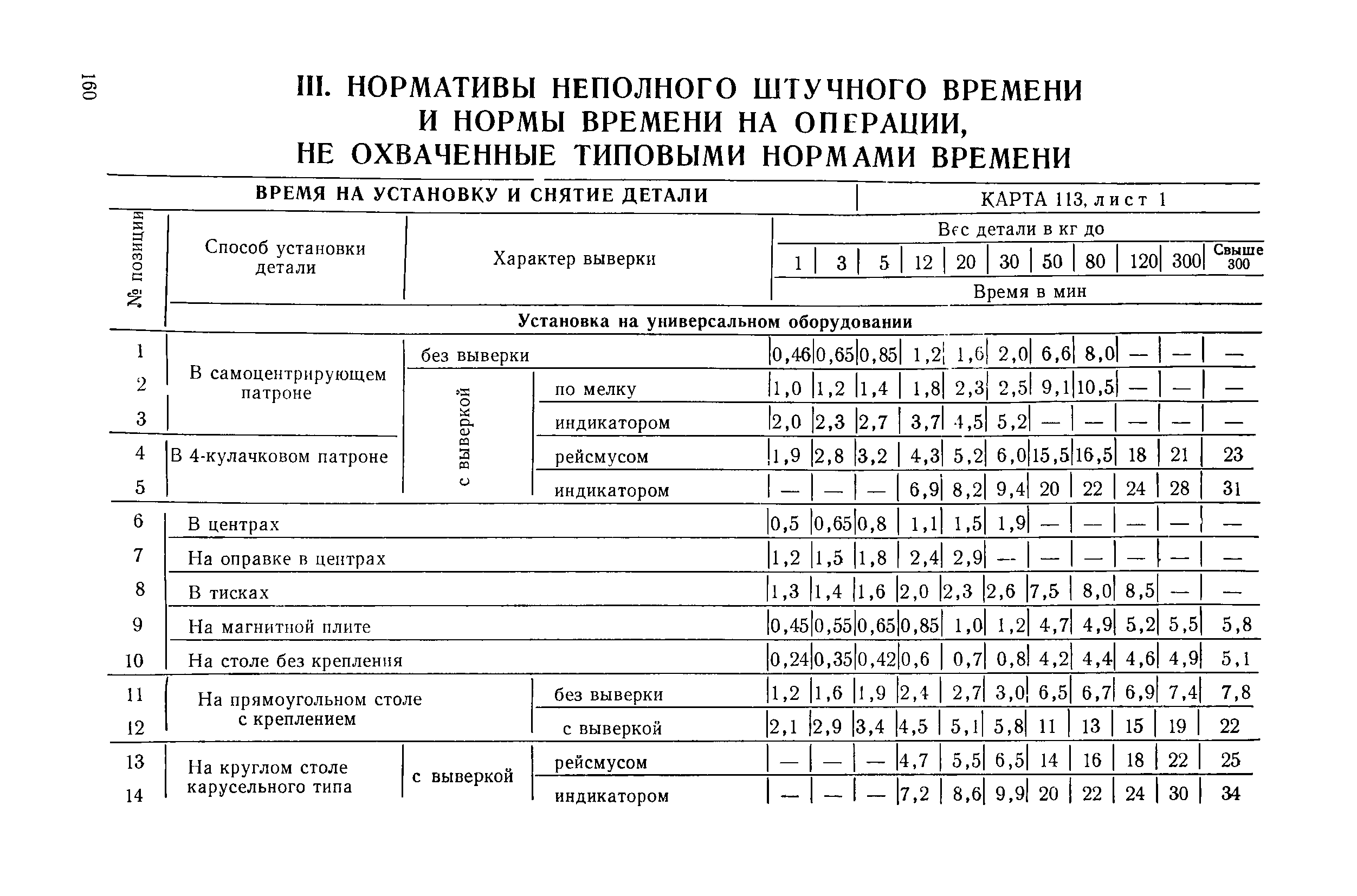 | Оглавление: | I. Типовые нормы времени на изготовление штампов II. Типовые нормы времени на изготовление пресс-форм Универсальные блоки пресс-форм с нижней загрузочной камерой Пакеты к блокам пресс-форм с нижней загрузочной камерой Пресс-формы съемные III. Нормативы неполного штучного времени и нормы времени на операции, не охваченные типовыми нормами времени IV. Подготовительно-заключительное время на партию Приложение 1. Штамп комбинированный, Трудоемкость изготовления Приложение 2. Пресс-формы для прессования изделий из реактопластов. Универсальные блоки с нижней загрузочной камерой, МН 1515-61. Трудоемкость изготовления Приложение 3. Пакеты к блокам пресс-форм с нижней загрузочной камерой, МН 1516-61 Приложение 4. Пресс-формы съемные круглые прямого прессования с двумя плоскостями разъема, МН 1452-61. Трудоемкость изготовления Приложение 5. Пресс-формы съемные прямоугольные литьевого прессования с двумя плоскостями разъема и двумя пуансонодержателями, МН 1461-61. Трудоемкость изготовления Приложение 6. Режимы резания, принятые при изготовлении штампов и пресс-форм Приложение 7. Припуски на механическую обработку Приложение 8. Перечень типовых моделей оборудования инструментального цеха штампов и пресс-форм Приложение 9. Теоретический вес заготовк |