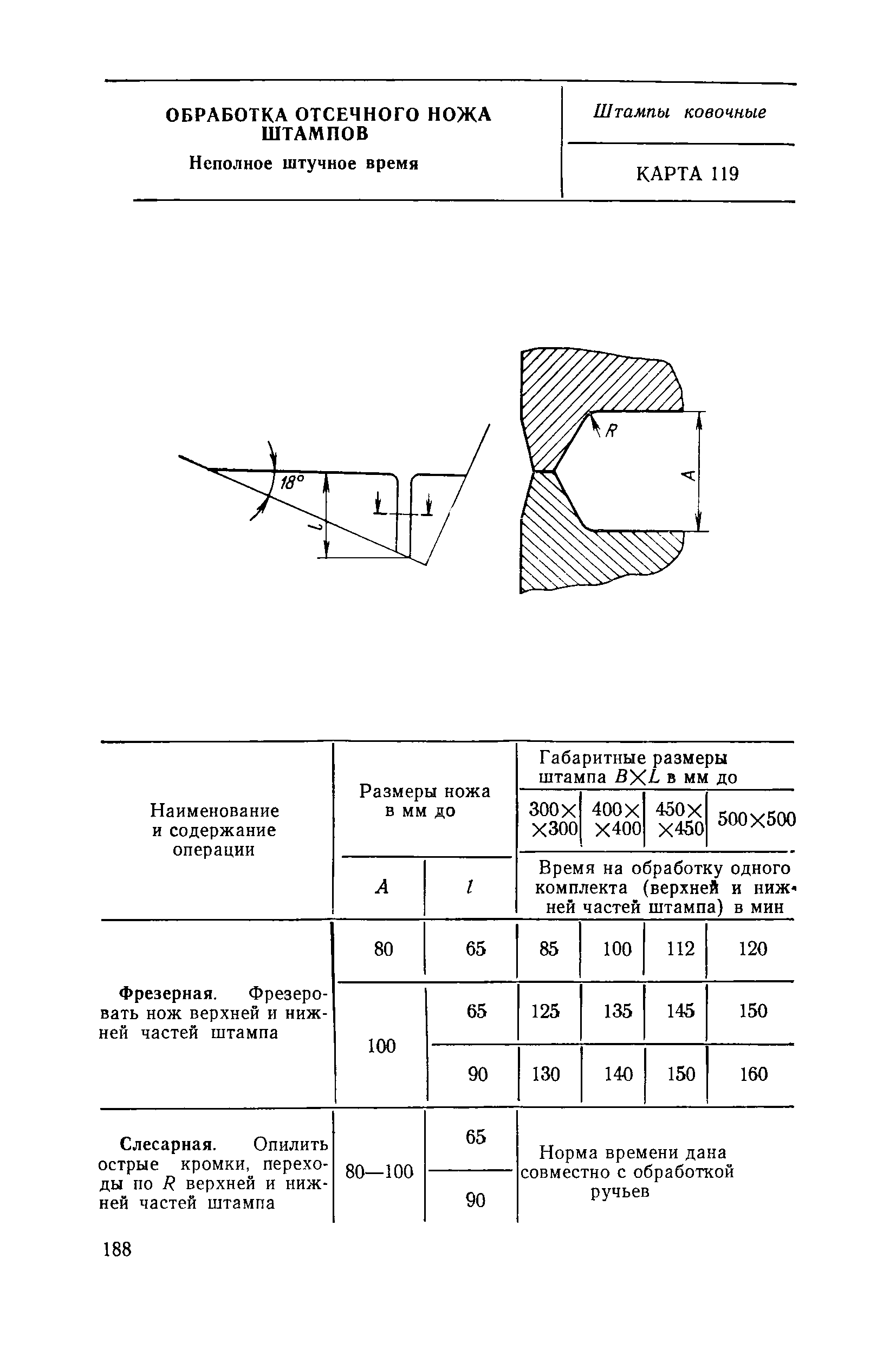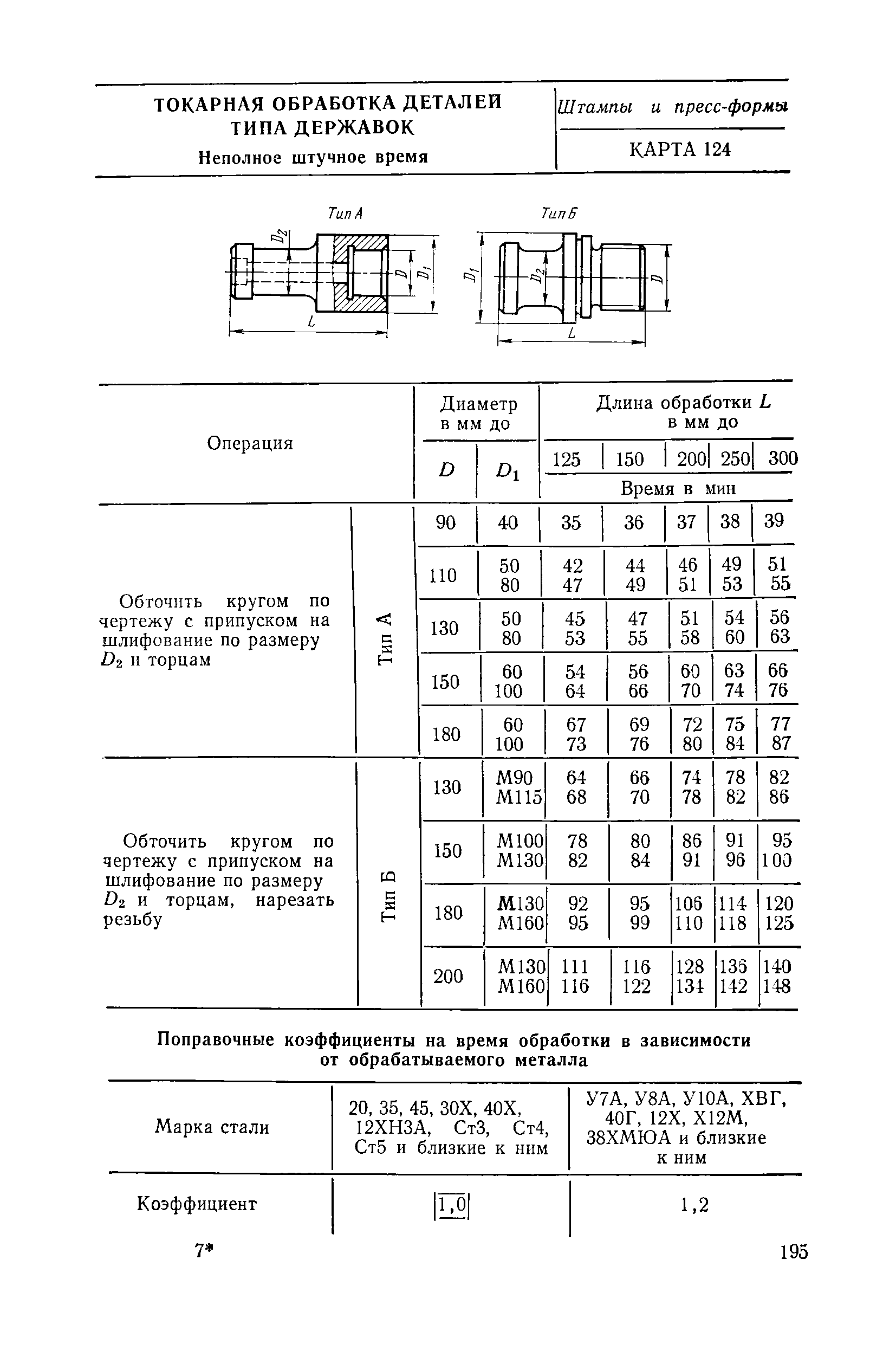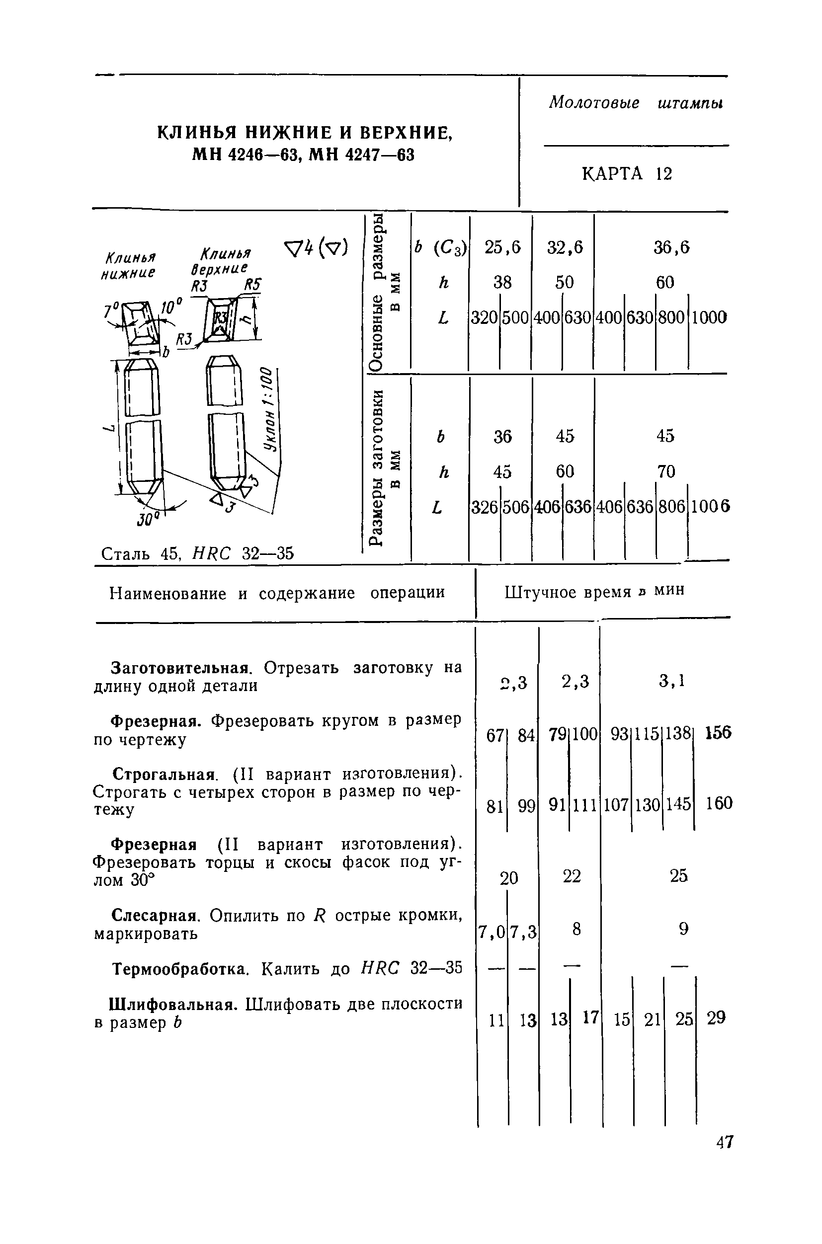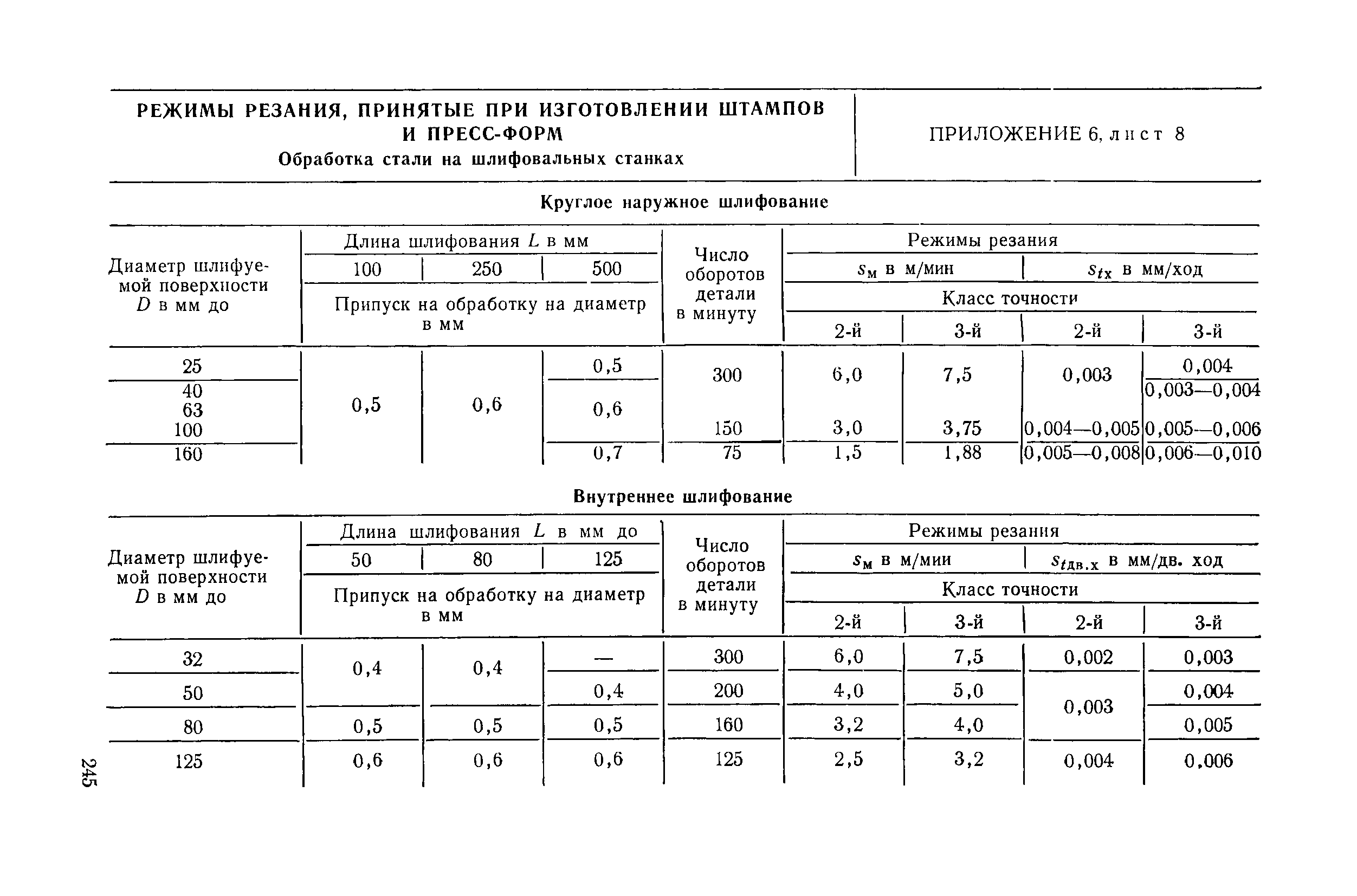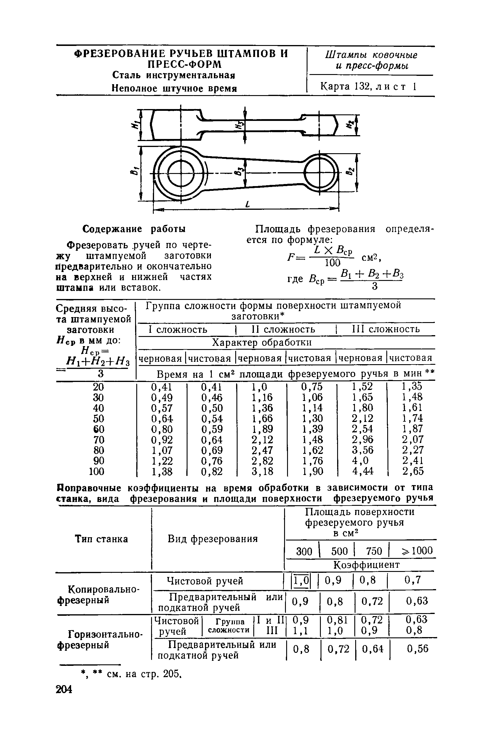 | Оглавление: | I. Типовые нормы времени на изготовление штампов II. Типовые нормы времени на изготовление пресс-форм Универсальные блоки пресс-форм с нижней загрузочной камерой Пакеты к блокам пресс-форм с нижней загрузочной камерой Пресс-формы съемные III. Нормативы неполного штучного времени и нормы времени на операции, не охваченные типовыми нормами времени IV. Подготовительно-заключительное время на партию Приложение 1. Штамп комбинированный, Трудоемкость изготовления Приложение 2. Пресс-формы для прессования изделий из реактопластов. Универсальные блоки с нижней загрузочной камерой, МН 1515-61. Трудоемкость изготовления Приложение 3. Пакеты к блокам пресс-форм с нижней загрузочной камерой, МН 1516-61 Приложение 4. Пресс-формы съемные круглые прямого прессования с двумя плоскостями разъема, МН 1452-61. Трудоемкость изготовления Приложение 5. Пресс-формы съемные прямоугольные литьевого прессования с двумя плоскостями разъема и двумя пуансонодержателями, МН 1461-61. Трудоемкость изготовления Приложение 6. Режимы резания, принятые при изготовлении штампов и пресс-форм Приложение 7. Припуски на механическую обработку Приложение 8. Перечень типовых моделей оборудования инструментального цеха штампов и пресс-форм Приложение 9. Теоретический вес заготовк |