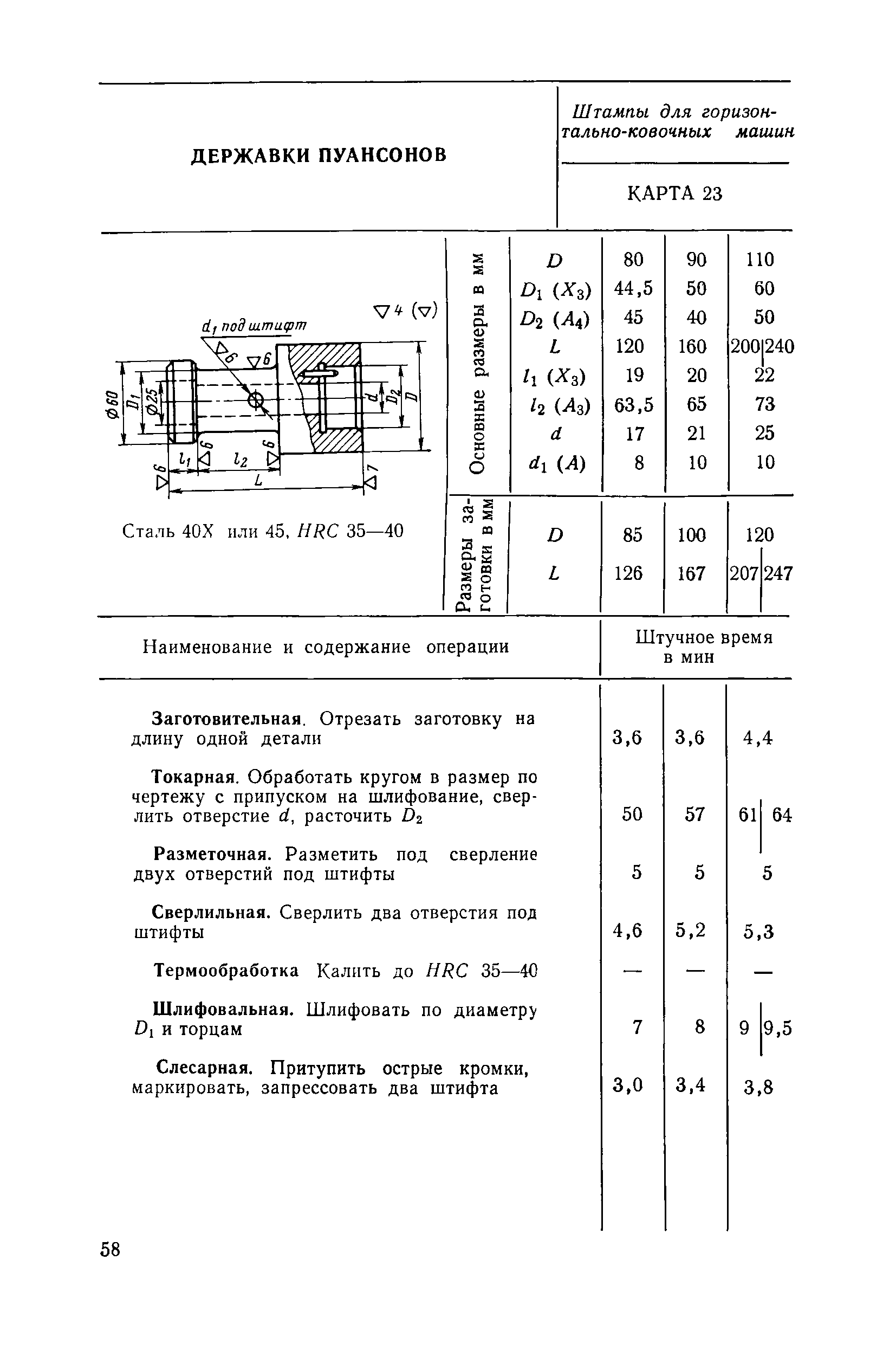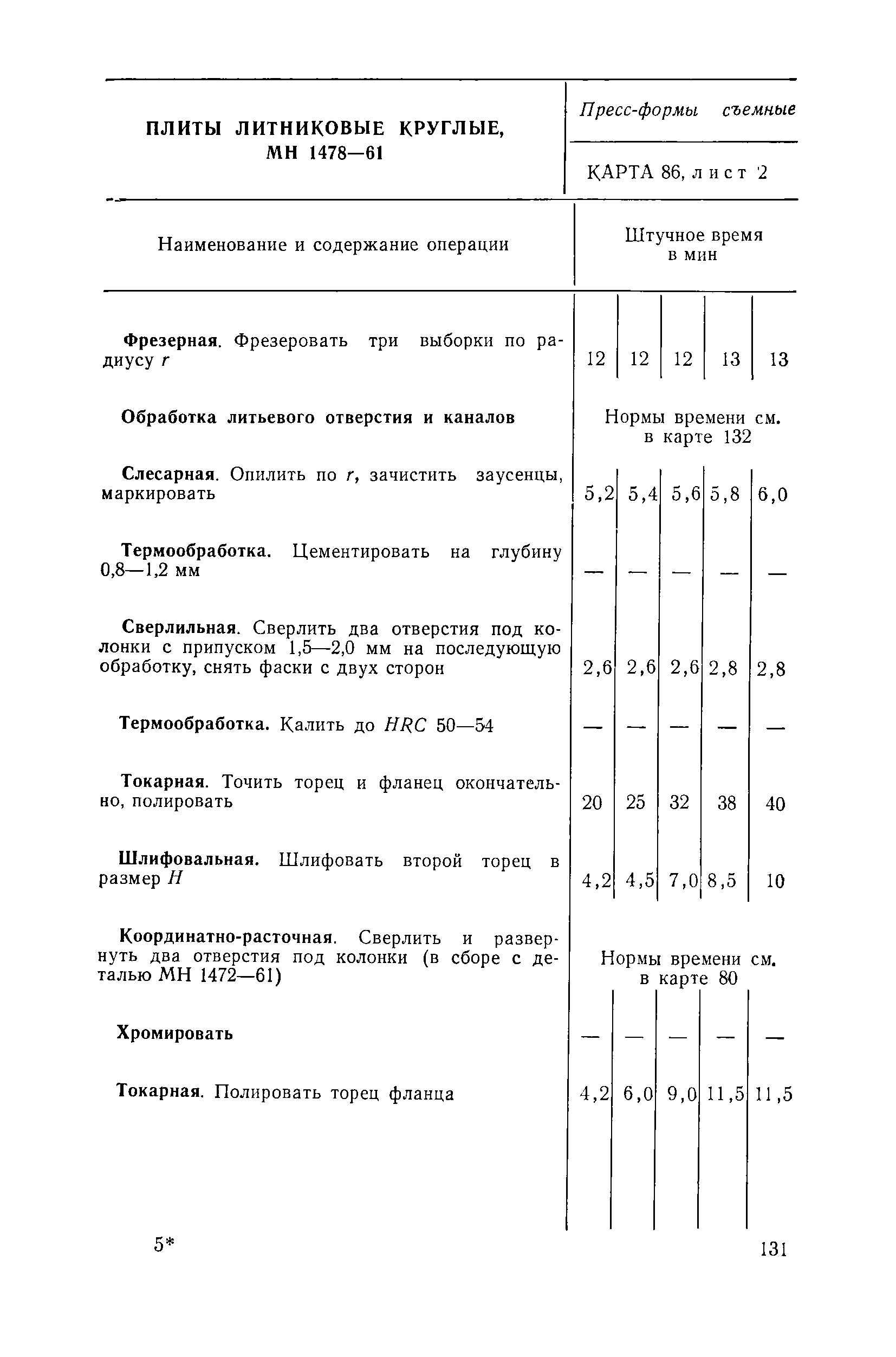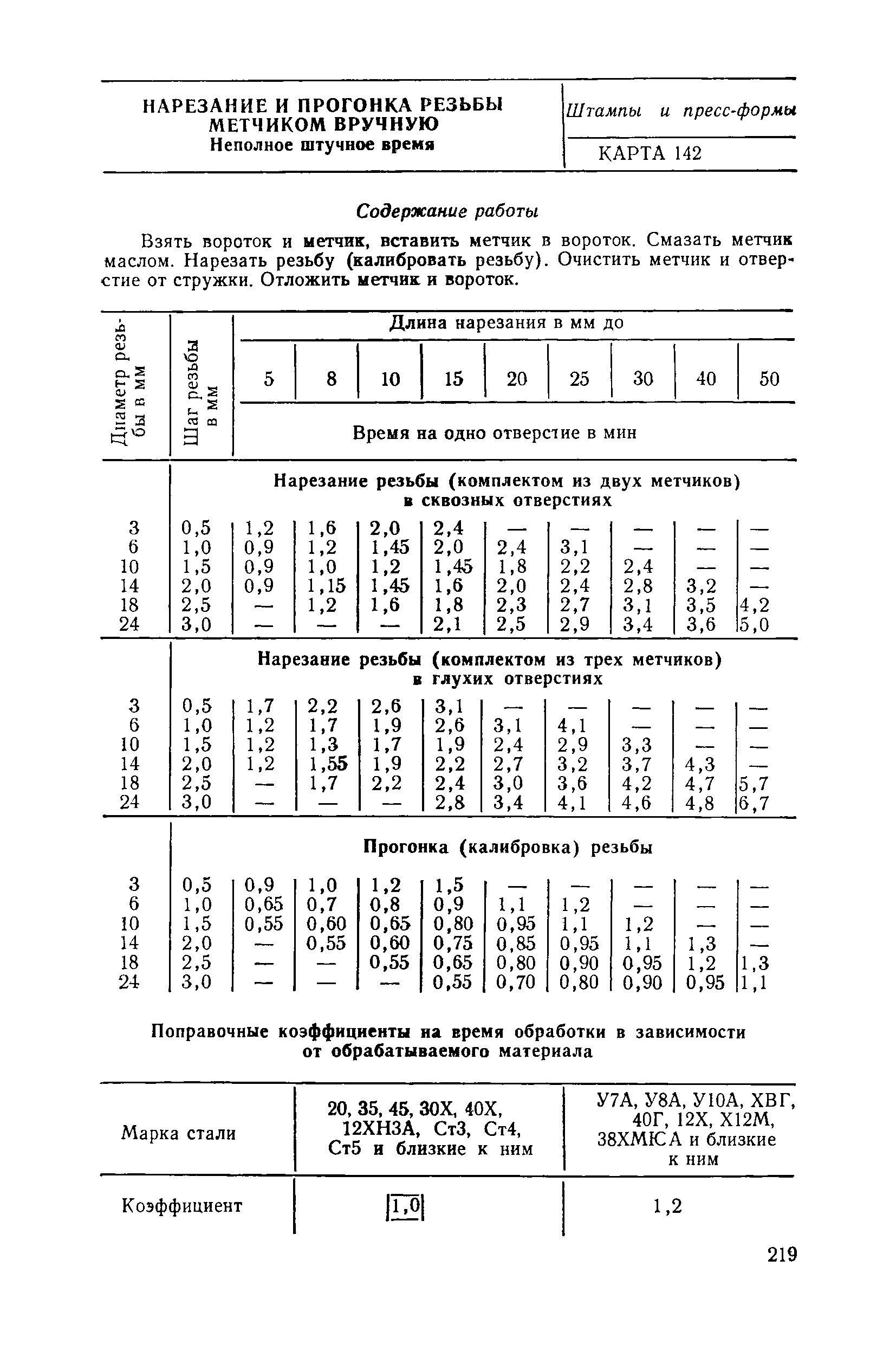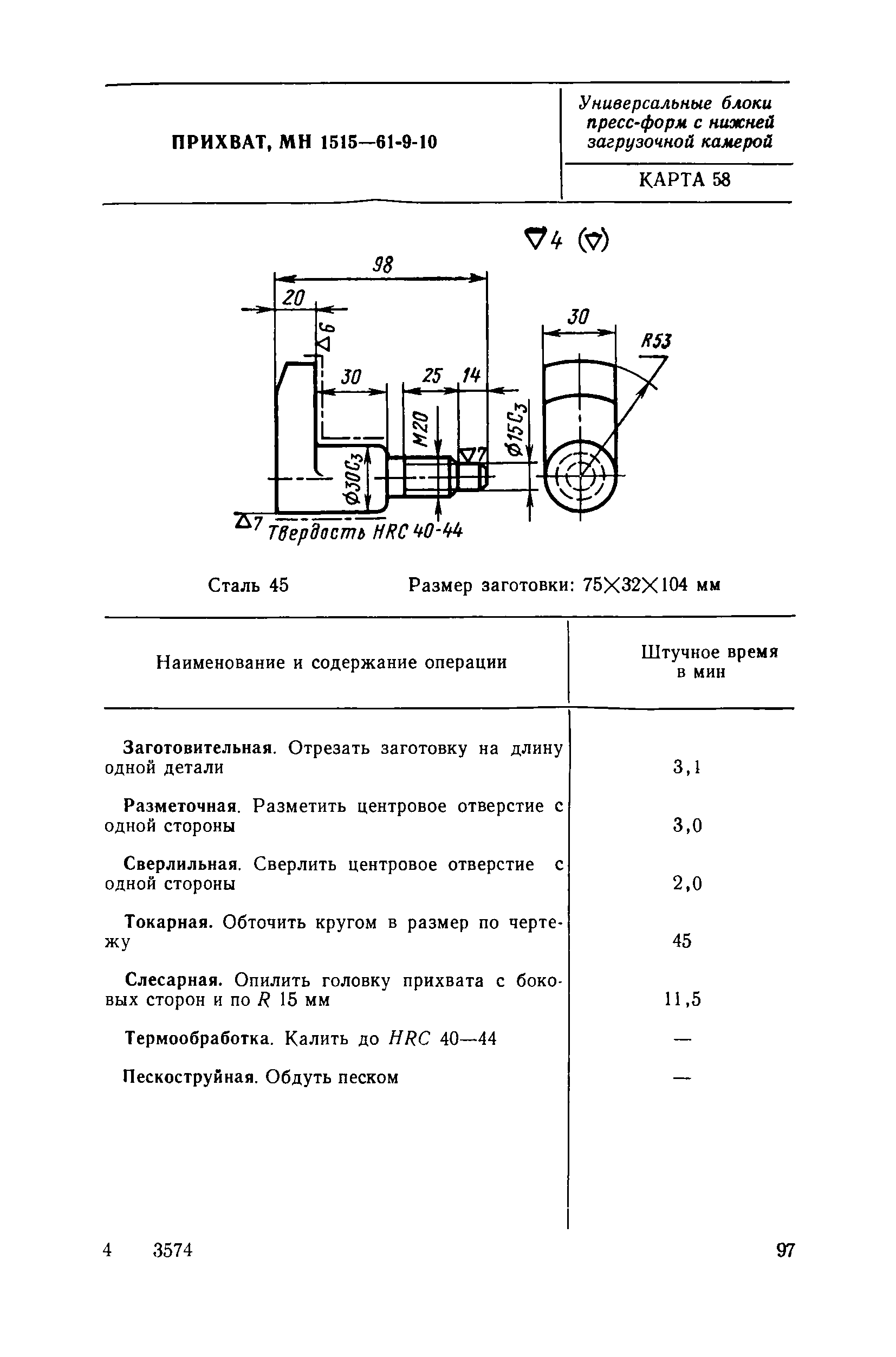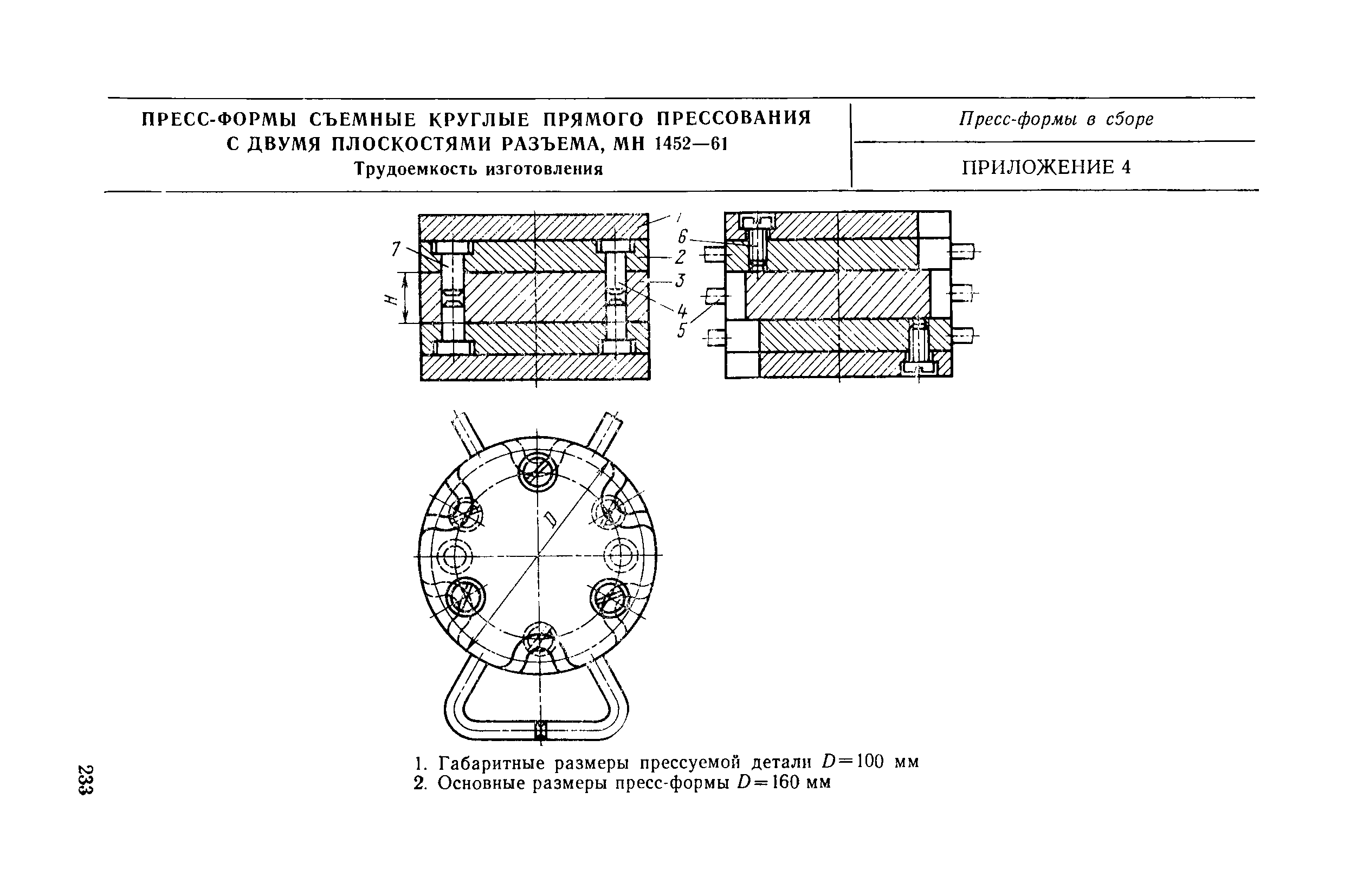 | Оглавление: | I. Типовые нормы времени на изготовление штампов II. Типовые нормы времени на изготовление пресс-форм Универсальные блоки пресс-форм с нижней загрузочной камерой Пакеты к блокам пресс-форм с нижней загрузочной камерой Пресс-формы съемные III. Нормативы неполного штучного времени и нормы времени на операции, не охваченные типовыми нормами времени IV. Подготовительно-заключительное время на партию Приложение 1. Штамп комбинированный, Трудоемкость изготовления Приложение 2. Пресс-формы для прессования изделий из реактопластов. Универсальные блоки с нижней загрузочной камерой, МН 1515-61. Трудоемкость изготовления Приложение 3. Пакеты к блокам пресс-форм с нижней загрузочной камерой, МН 1516-61 Приложение 4. Пресс-формы съемные круглые прямого прессования с двумя плоскостями разъема, МН 1452-61. Трудоемкость изготовления Приложение 5. Пресс-формы съемные прямоугольные литьевого прессования с двумя плоскостями разъема и двумя пуансонодержателями, МН 1461-61. Трудоемкость изготовления Приложение 6. Режимы резания, принятые при изготовлении штампов и пресс-форм Приложение 7. Припуски на механическую обработку Приложение 8. Перечень типовых моделей оборудования инструментального цеха штампов и пресс-форм Приложение 9. Теоретический вес заготовк |