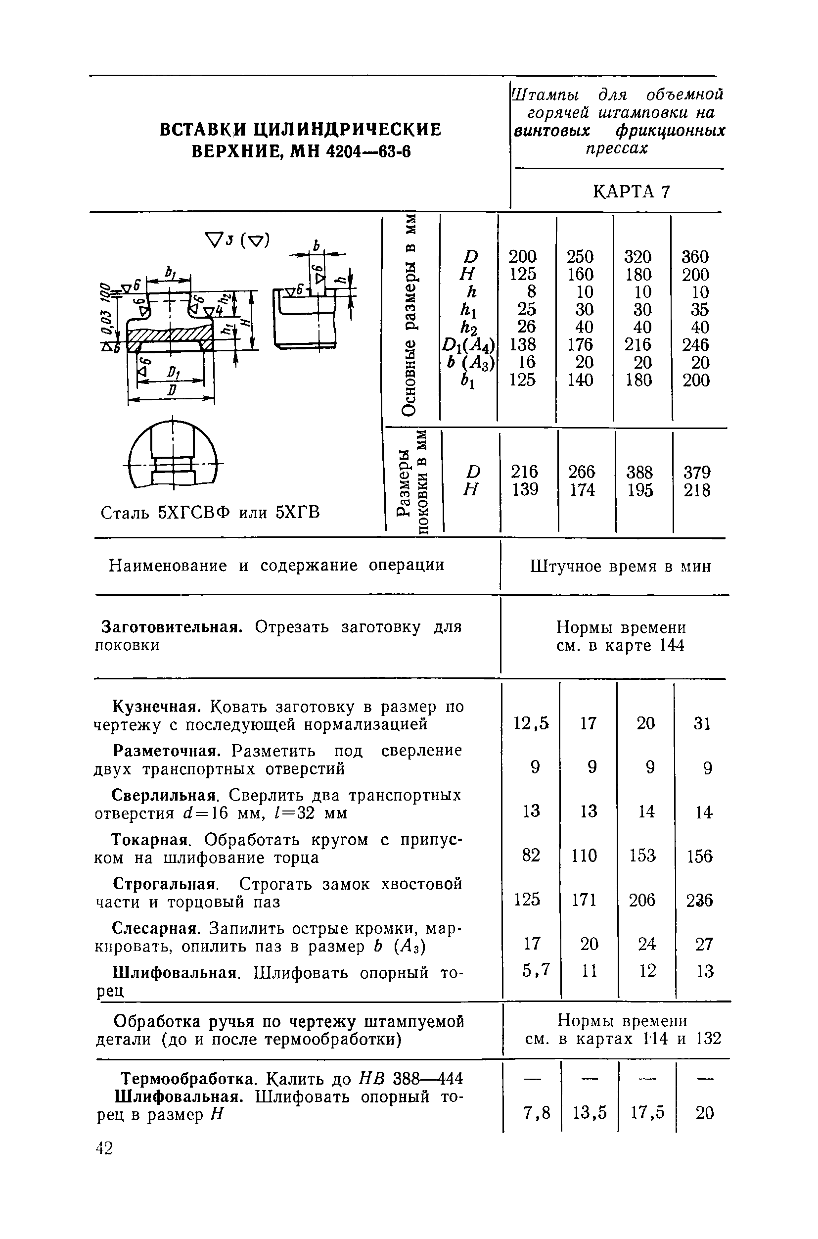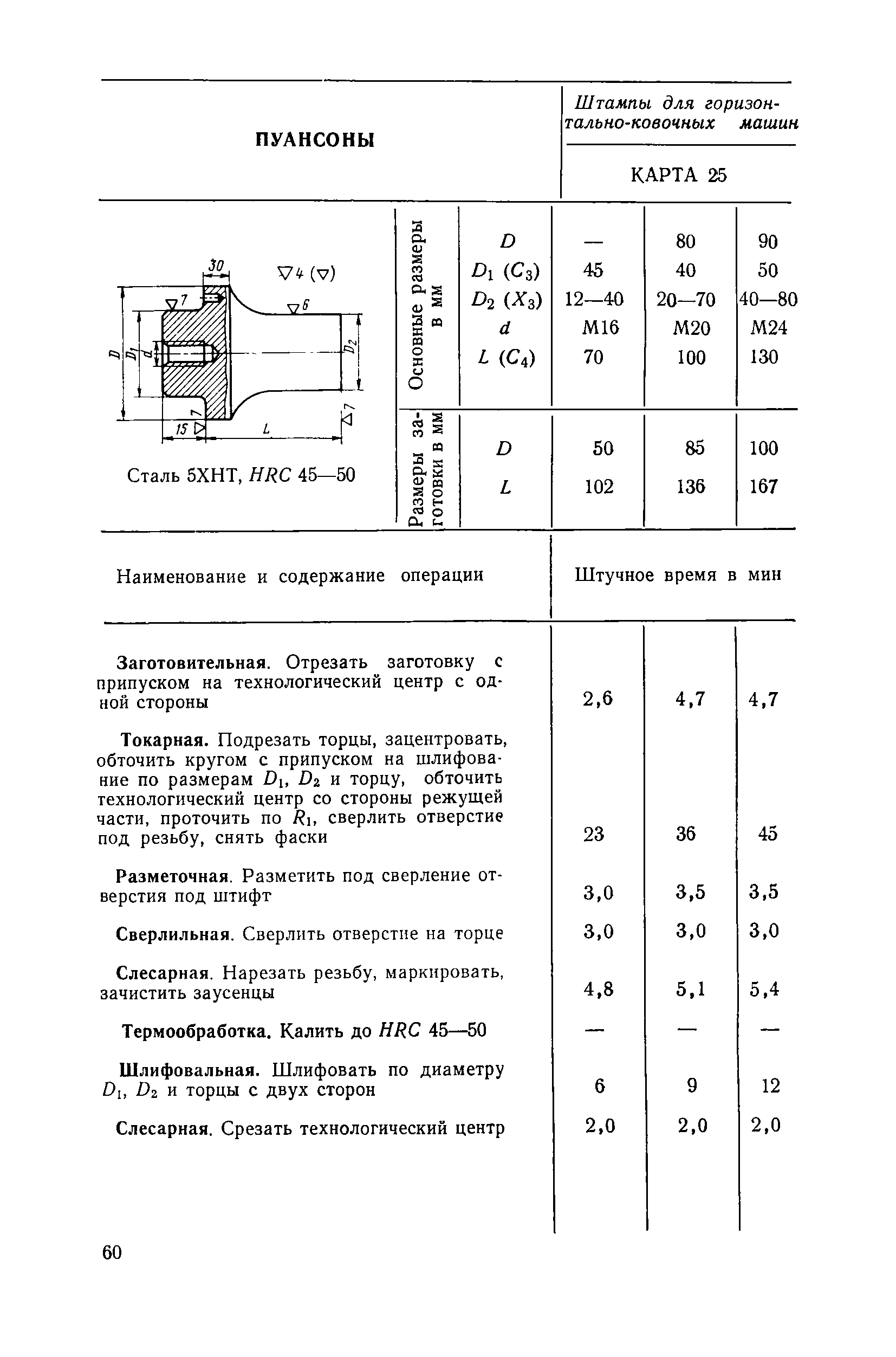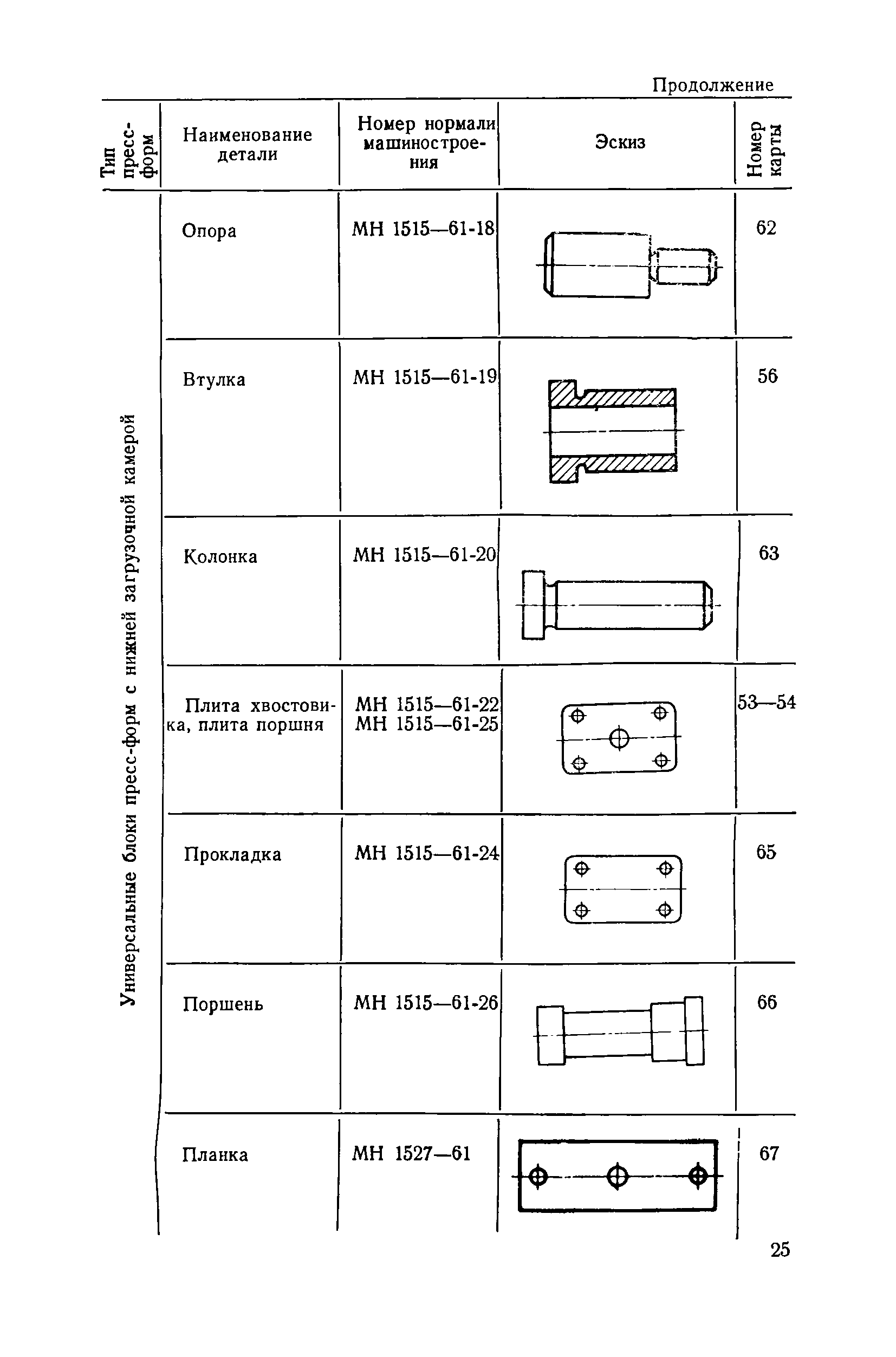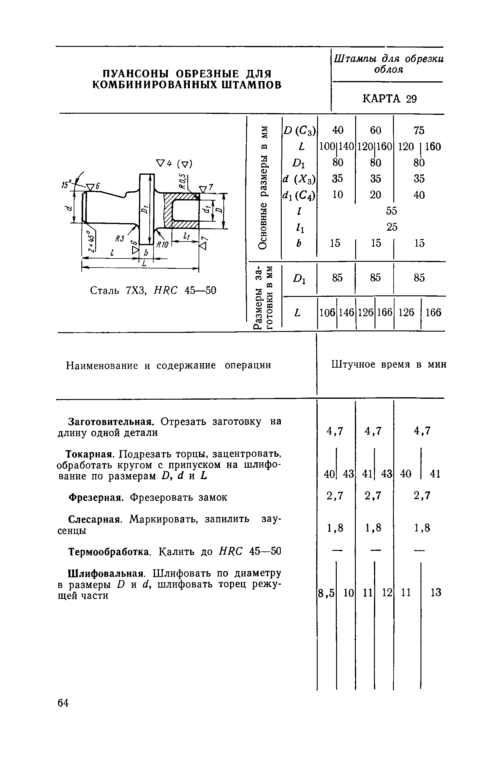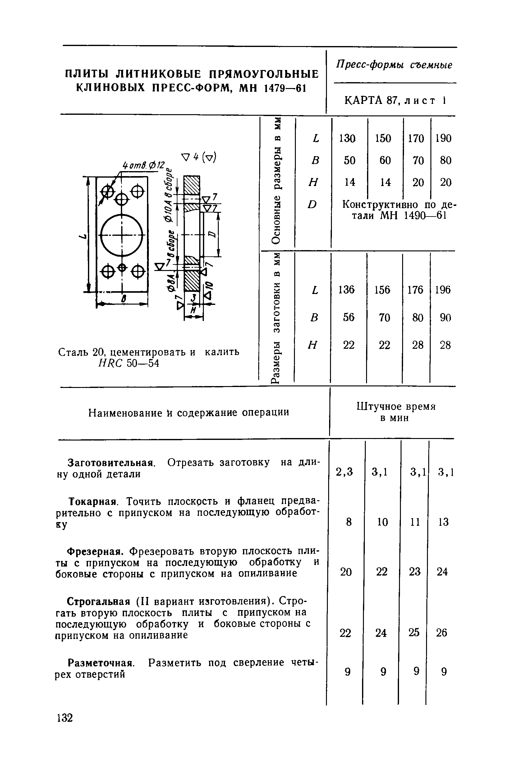 | Оглавление: | I. Типовые нормы времени на изготовление штампов II. Типовые нормы времени на изготовление пресс-форм Универсальные блоки пресс-форм с нижней загрузочной камерой Пакеты к блокам пресс-форм с нижней загрузочной камерой Пресс-формы съемные III. Нормативы неполного штучного времени и нормы времени на операции, не охваченные типовыми нормами времени IV. Подготовительно-заключительное время на партию Приложение 1. Штамп комбинированный, Трудоемкость изготовления Приложение 2. Пресс-формы для прессования изделий из реактопластов. Универсальные блоки с нижней загрузочной камерой, МН 1515-61. Трудоемкость изготовления Приложение 3. Пакеты к блокам пресс-форм с нижней загрузочной камерой, МН 1516-61 Приложение 4. Пресс-формы съемные круглые прямого прессования с двумя плоскостями разъема, МН 1452-61. Трудоемкость изготовления Приложение 5. Пресс-формы съемные прямоугольные литьевого прессования с двумя плоскостями разъема и двумя пуансонодержателями, МН 1461-61. Трудоемкость изготовления Приложение 6. Режимы резания, принятые при изготовлении штампов и пресс-форм Приложение 7. Припуски на механическую обработку Приложение 8. Перечень типовых моделей оборудования инструментального цеха штампов и пресс-форм Приложение 9. Теоретический вес заготовк |