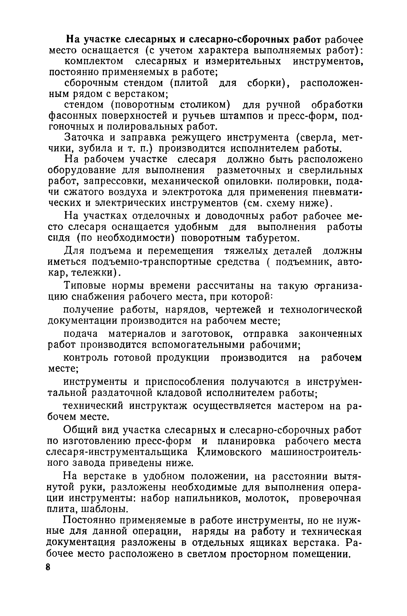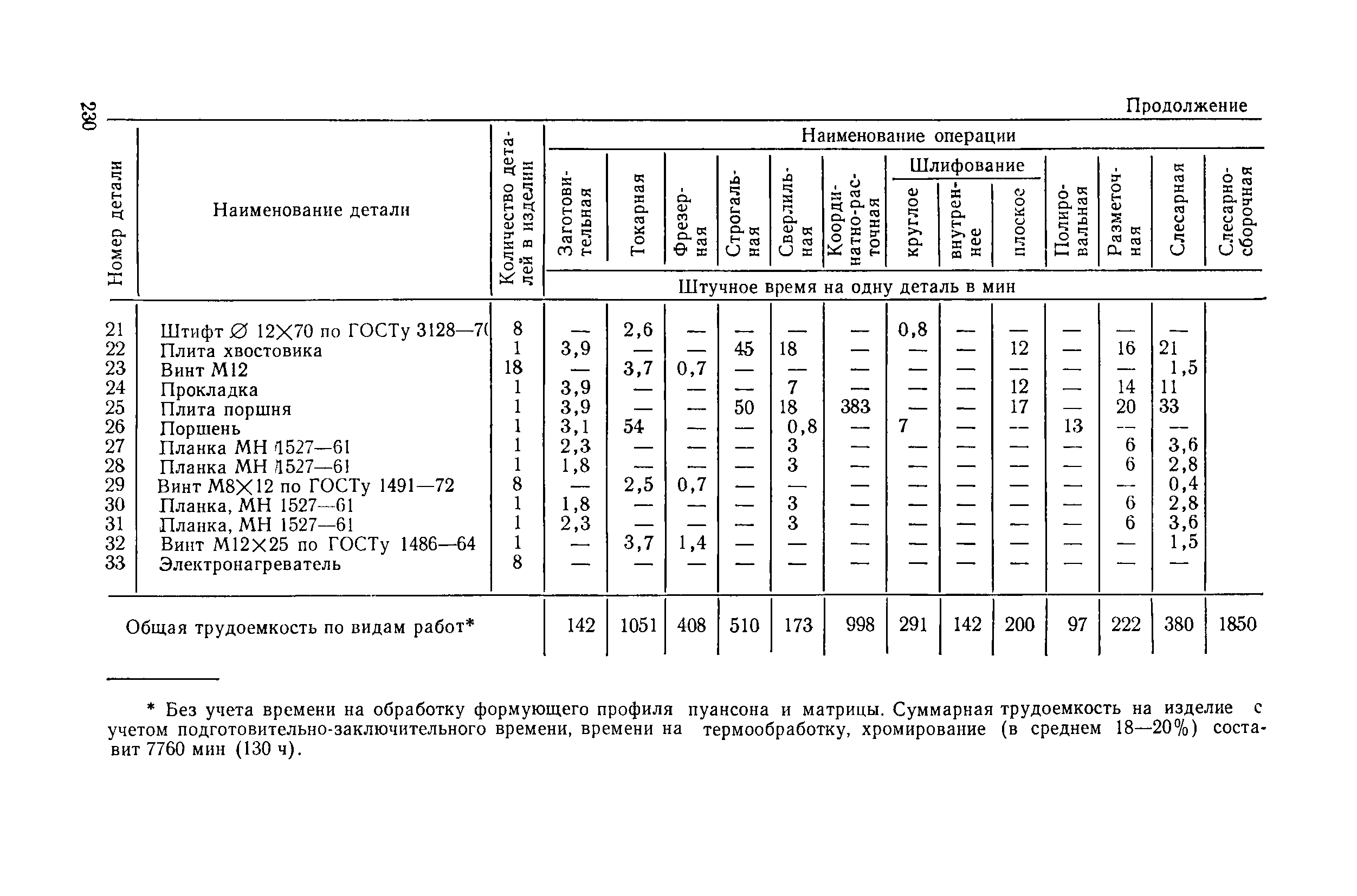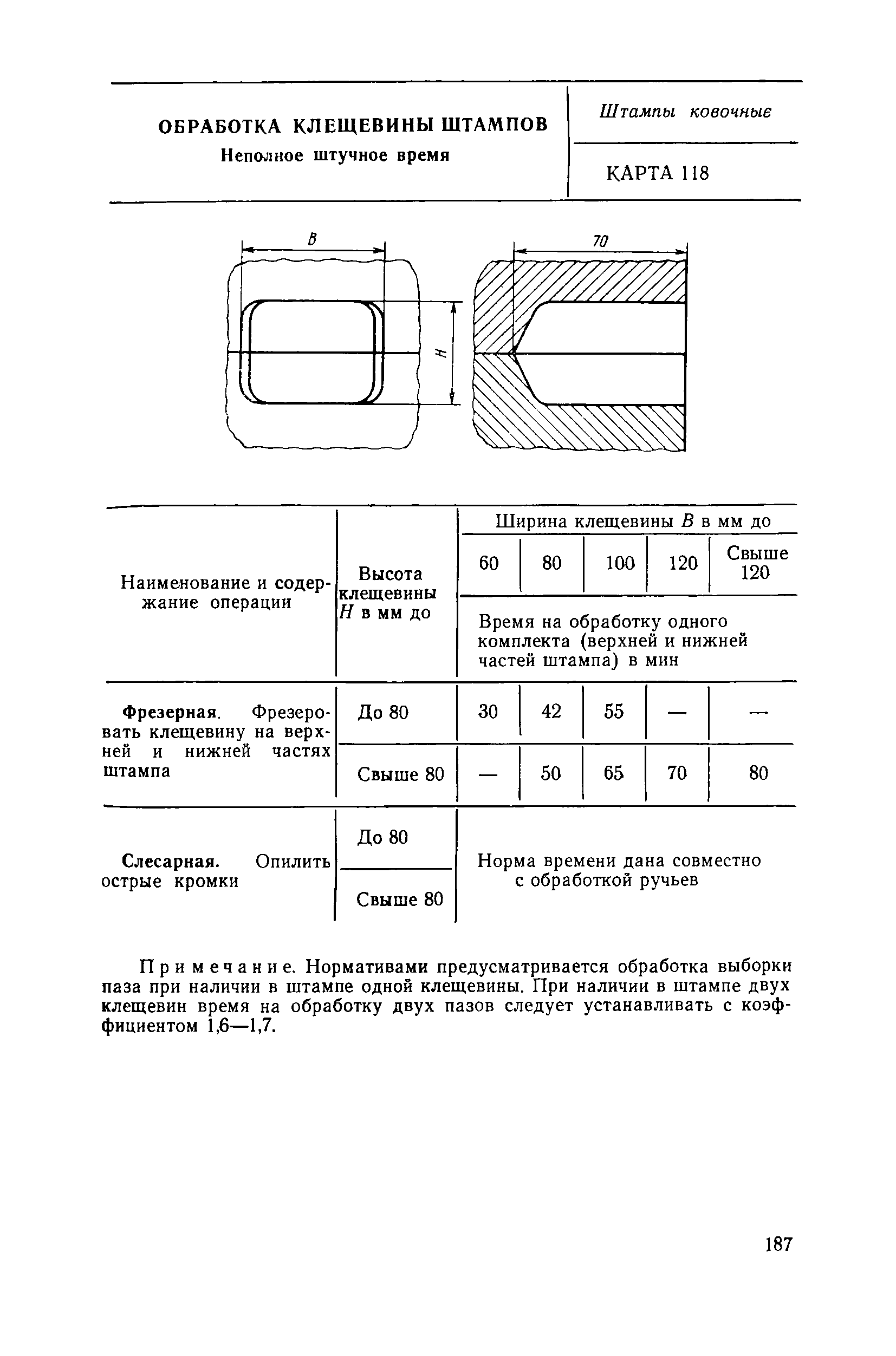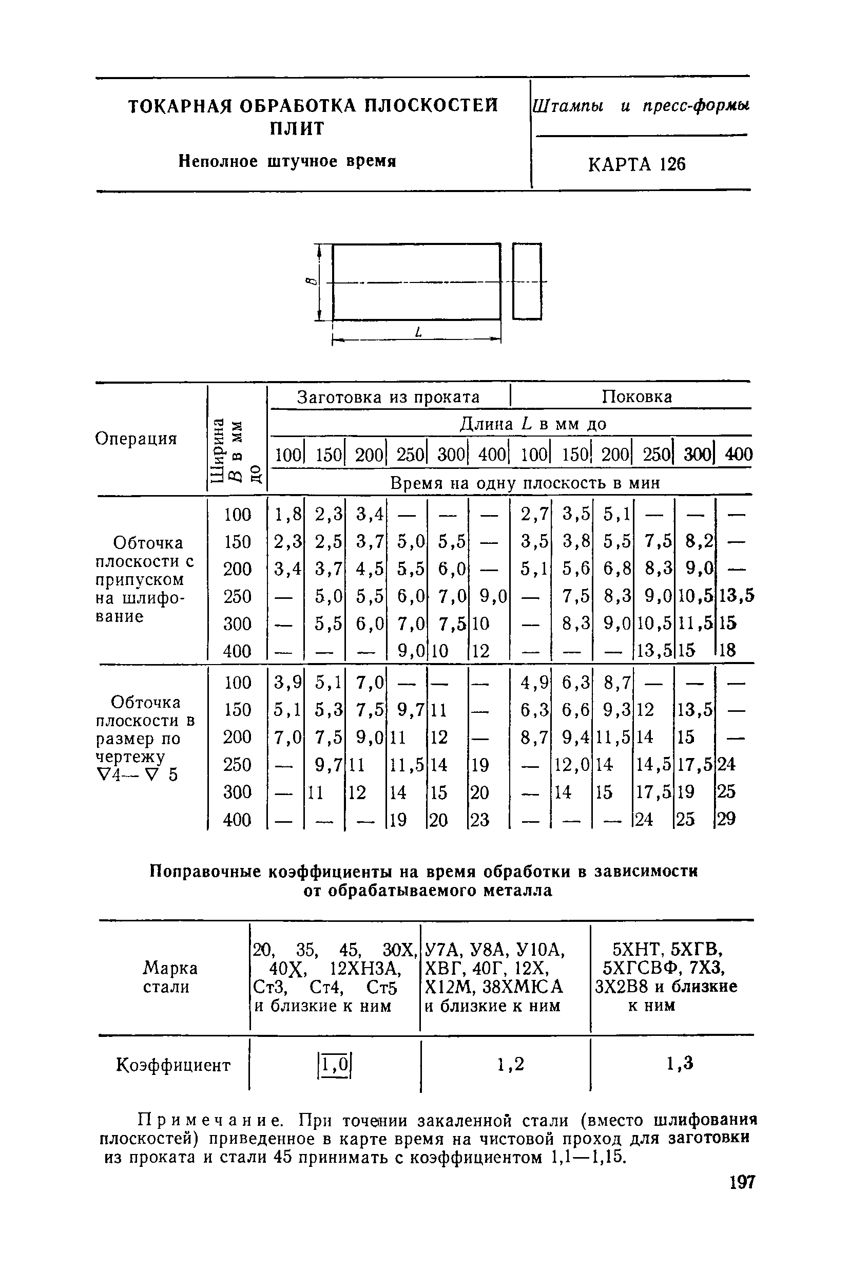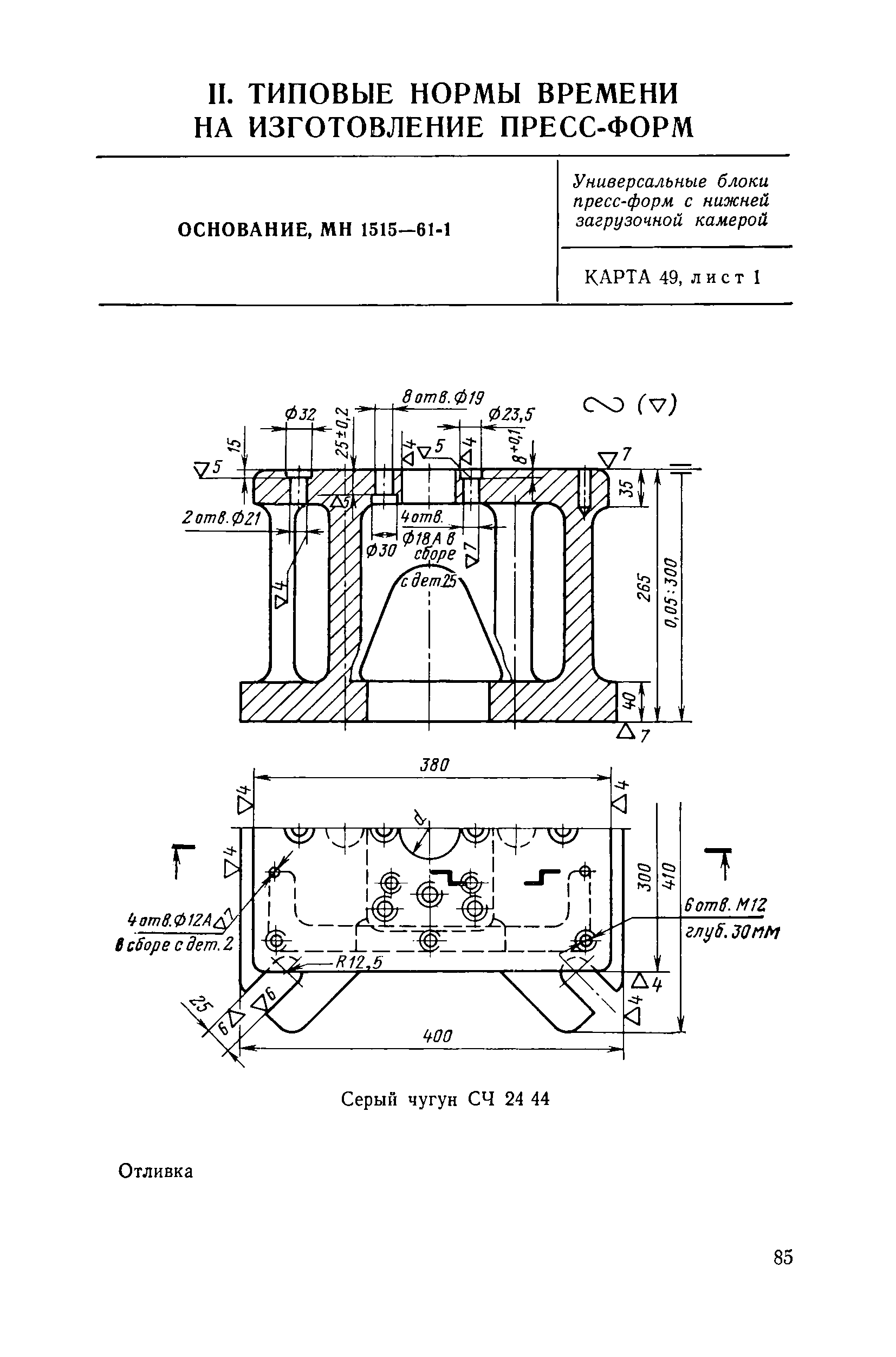 | Оглавление: | I. Типовые нормы времени на изготовление штампов II. Типовые нормы времени на изготовление пресс-форм Универсальные блоки пресс-форм с нижней загрузочной камерой Пакеты к блокам пресс-форм с нижней загрузочной камерой Пресс-формы съемные III. Нормативы неполного штучного времени и нормы времени на операции, не охваченные типовыми нормами времени IV. Подготовительно-заключительное время на партию Приложение 1. Штамп комбинированный, Трудоемкость изготовления Приложение 2. Пресс-формы для прессования изделий из реактопластов. Универсальные блоки с нижней загрузочной камерой, МН 1515-61. Трудоемкость изготовления Приложение 3. Пакеты к блокам пресс-форм с нижней загрузочной камерой, МН 1516-61 Приложение 4. Пресс-формы съемные круглые прямого прессования с двумя плоскостями разъема, МН 1452-61. Трудоемкость изготовления Приложение 5. Пресс-формы съемные прямоугольные литьевого прессования с двумя плоскостями разъема и двумя пуансонодержателями, МН 1461-61. Трудоемкость изготовления Приложение 6. Режимы резания, принятые при изготовлении штампов и пресс-форм Приложение 7. Припуски на механическую обработку Приложение 8. Перечень типовых моделей оборудования инструментального цеха штампов и пресс-форм Приложение 9. Теоретический вес заготовк |
