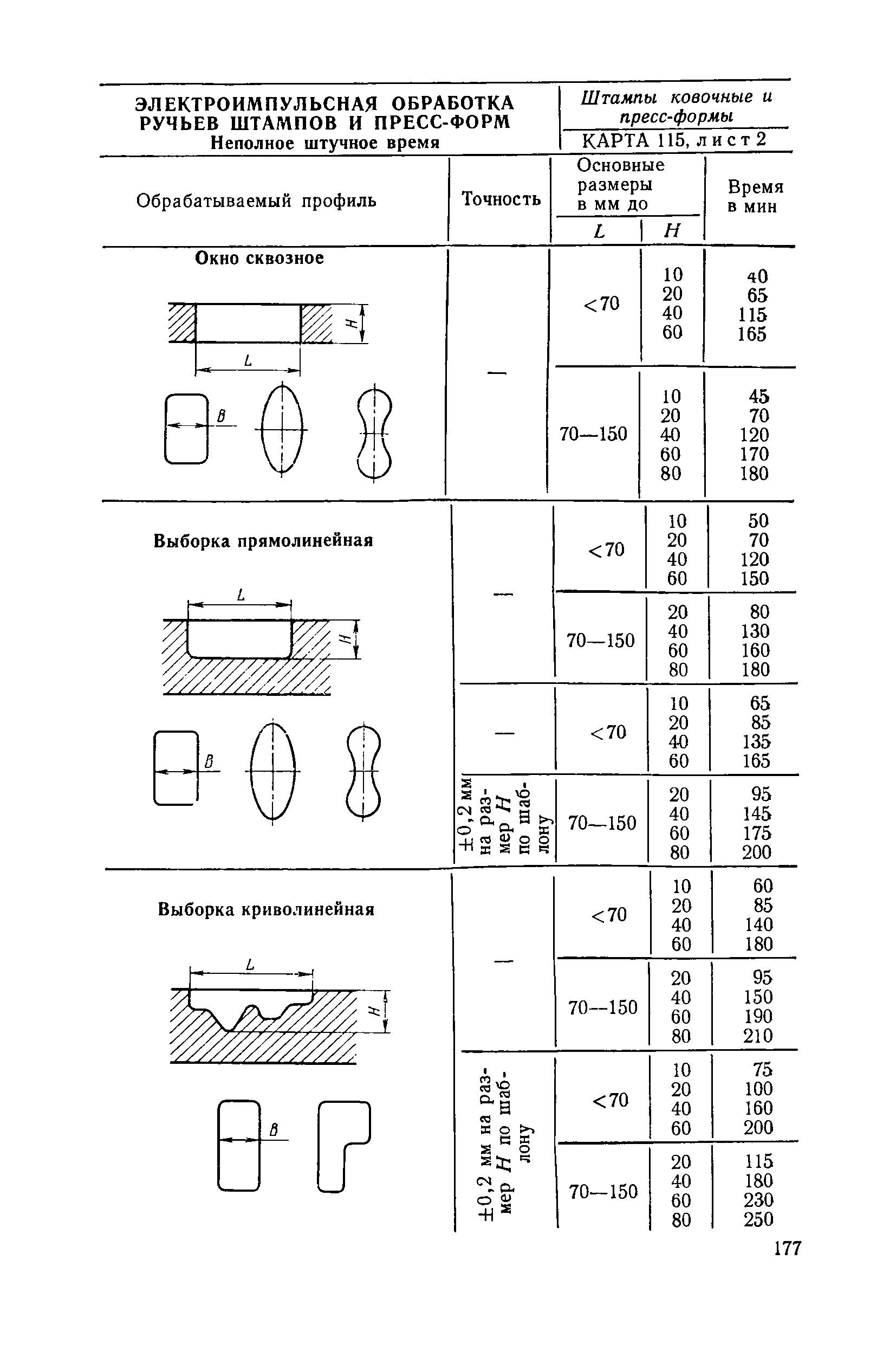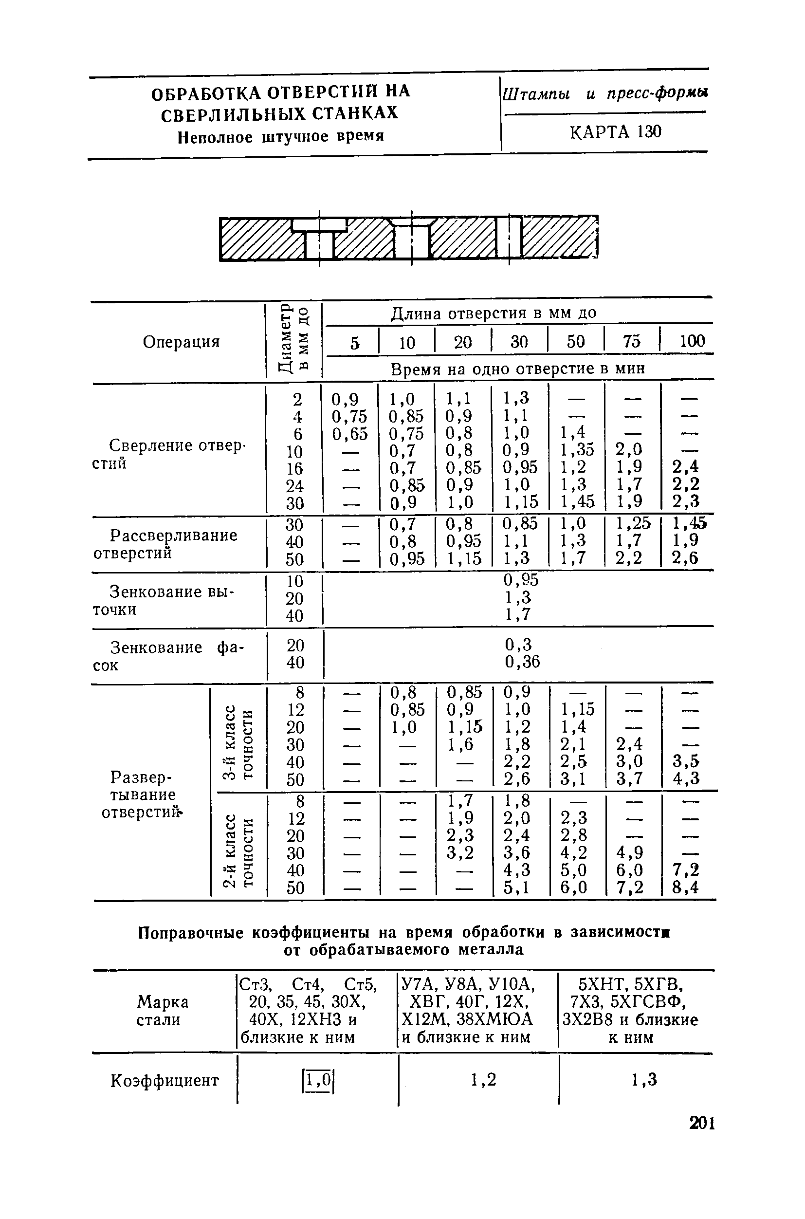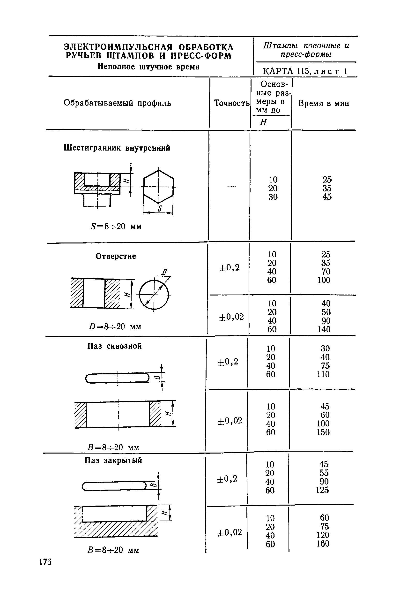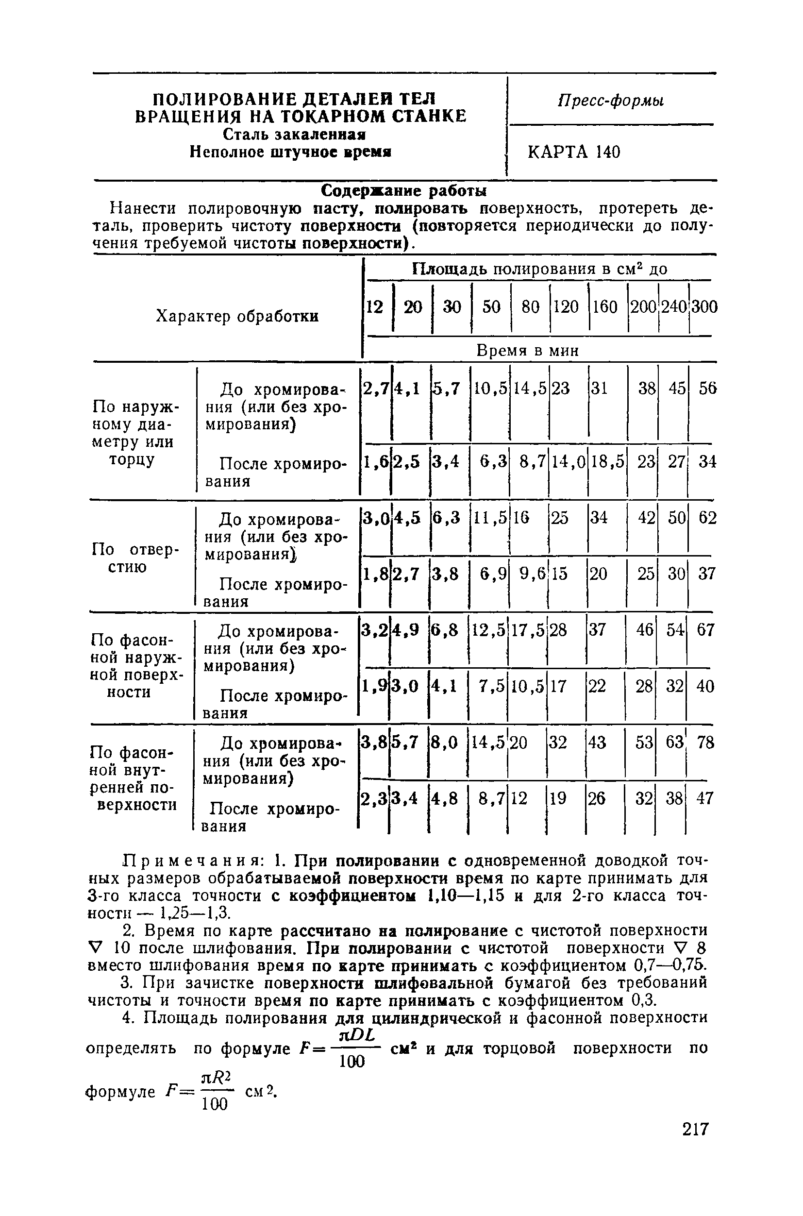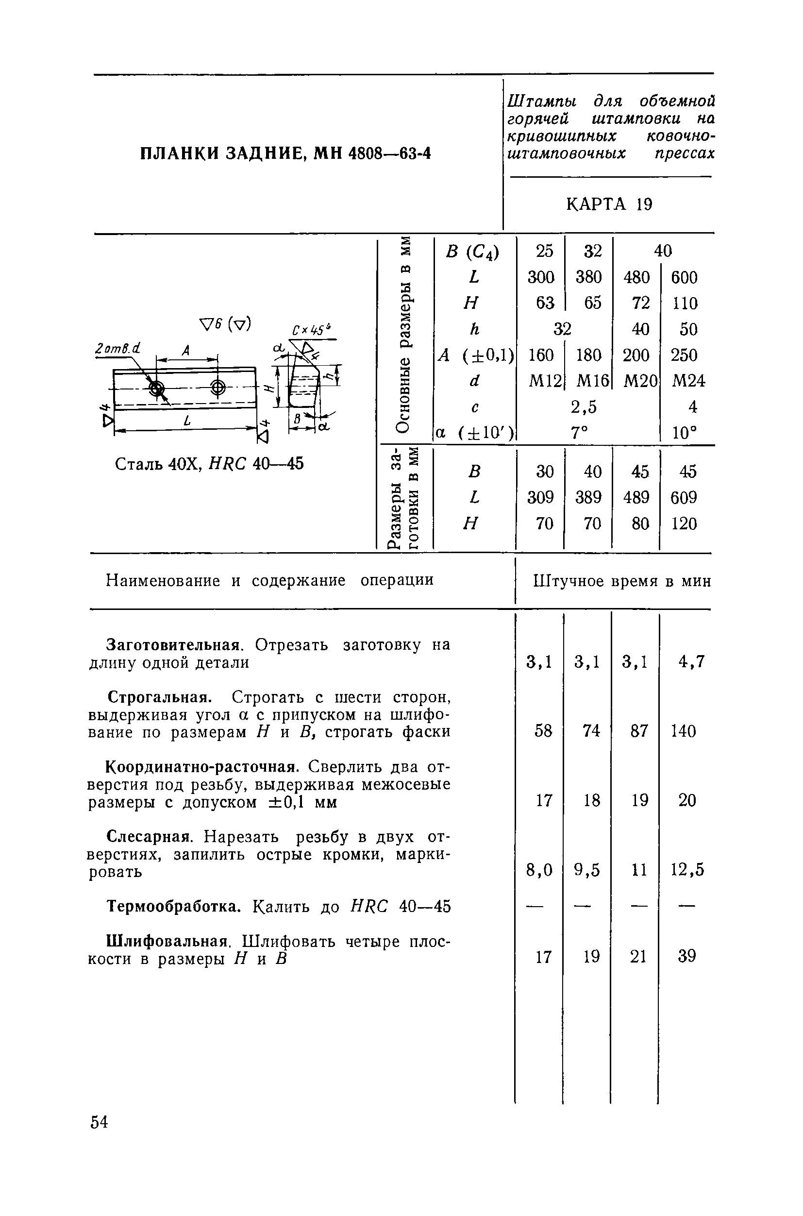 | Оглавление: | I. Типовые нормы времени на изготовление штампов II. Типовые нормы времени на изготовление пресс-форм Универсальные блоки пресс-форм с нижней загрузочной камерой Пакеты к блокам пресс-форм с нижней загрузочной камерой Пресс-формы съемные III. Нормативы неполного штучного времени и нормы времени на операции, не охваченные типовыми нормами времени IV. Подготовительно-заключительное время на партию Приложение 1. Штамп комбинированный, Трудоемкость изготовления Приложение 2. Пресс-формы для прессования изделий из реактопластов. Универсальные блоки с нижней загрузочной камерой, МН 1515-61. Трудоемкость изготовления Приложение 3. Пакеты к блокам пресс-форм с нижней загрузочной камерой, МН 1516-61 Приложение 4. Пресс-формы съемные круглые прямого прессования с двумя плоскостями разъема, МН 1452-61. Трудоемкость изготовления Приложение 5. Пресс-формы съемные прямоугольные литьевого прессования с двумя плоскостями разъема и двумя пуансонодержателями, МН 1461-61. Трудоемкость изготовления Приложение 6. Режимы резания, принятые при изготовлении штампов и пресс-форм Приложение 7. Припуски на механическую обработку Приложение 8. Перечень типовых моделей оборудования инструментального цеха штампов и пресс-форм Приложение 9. Теоретический вес заготовк |
