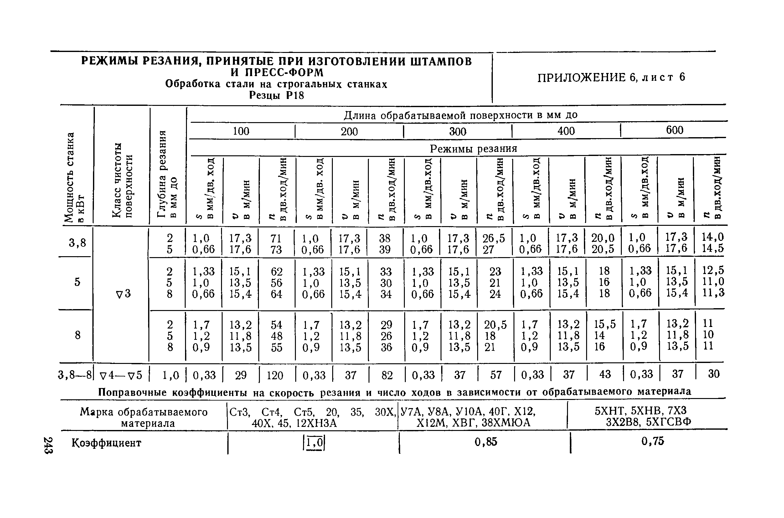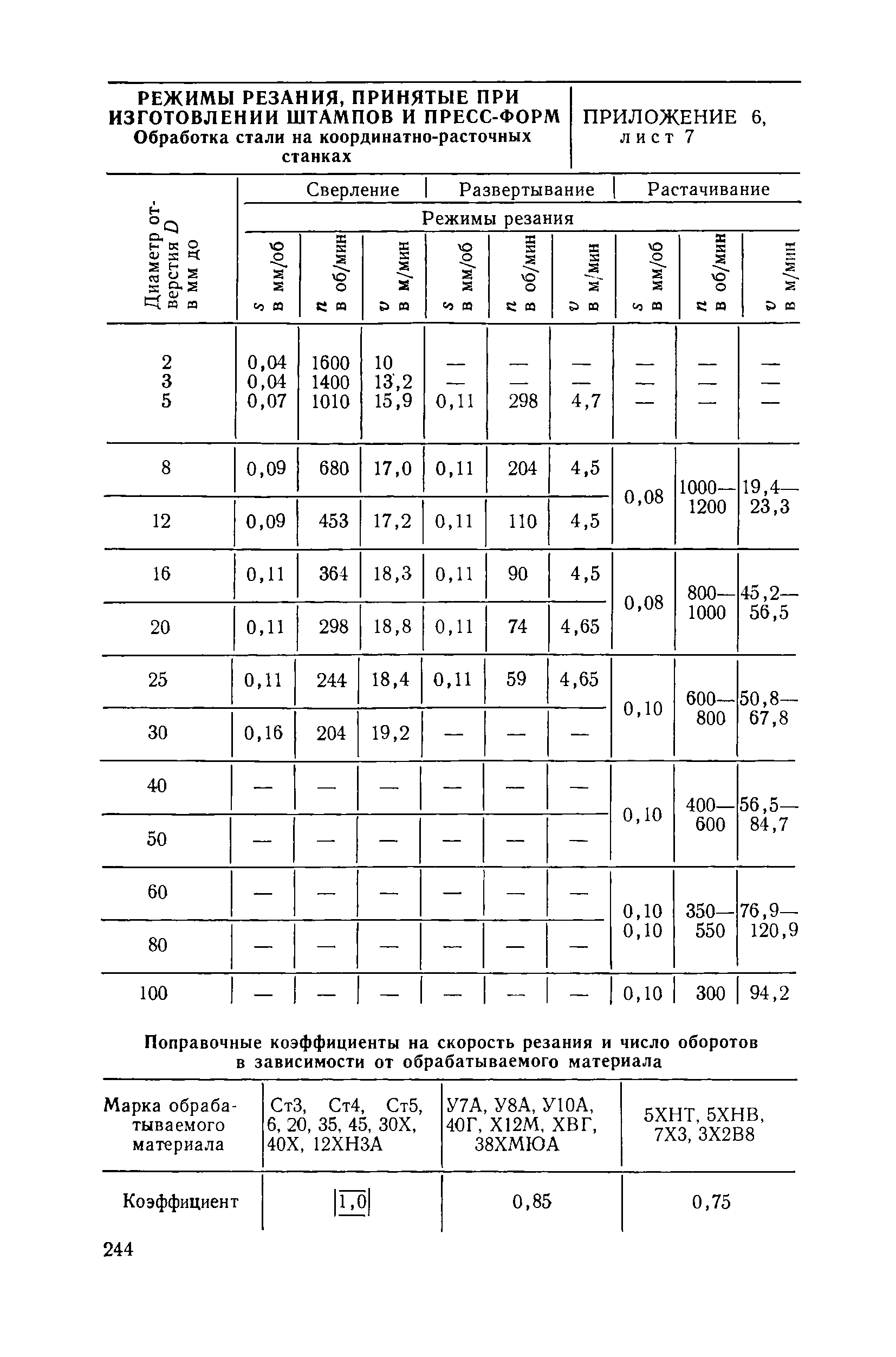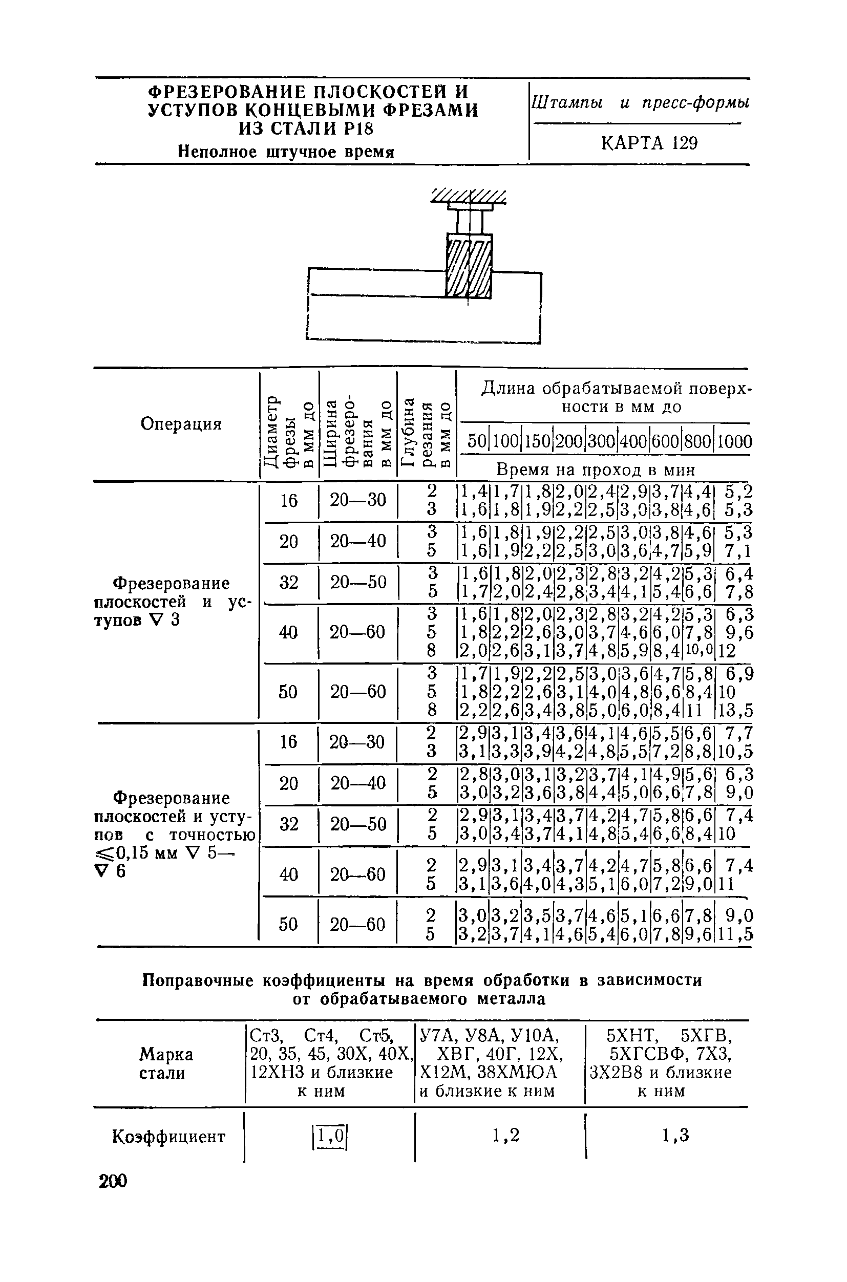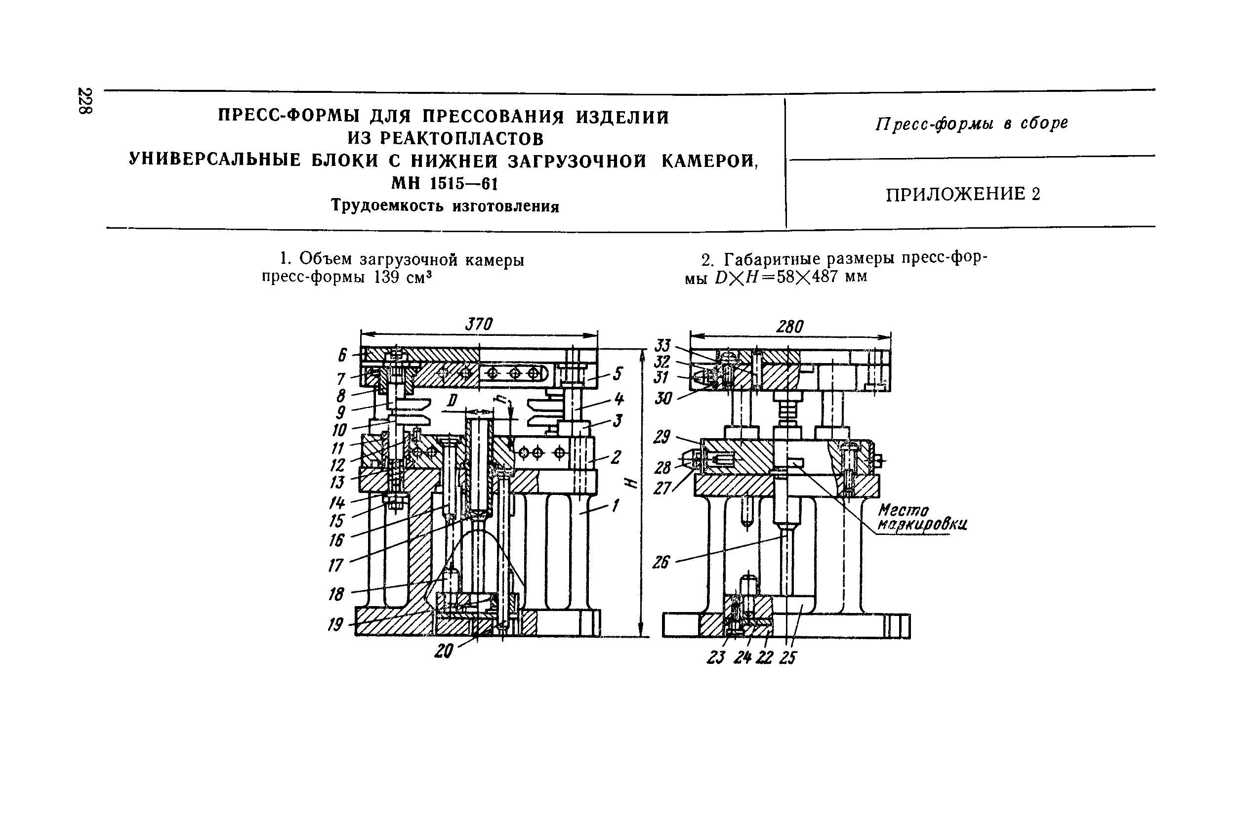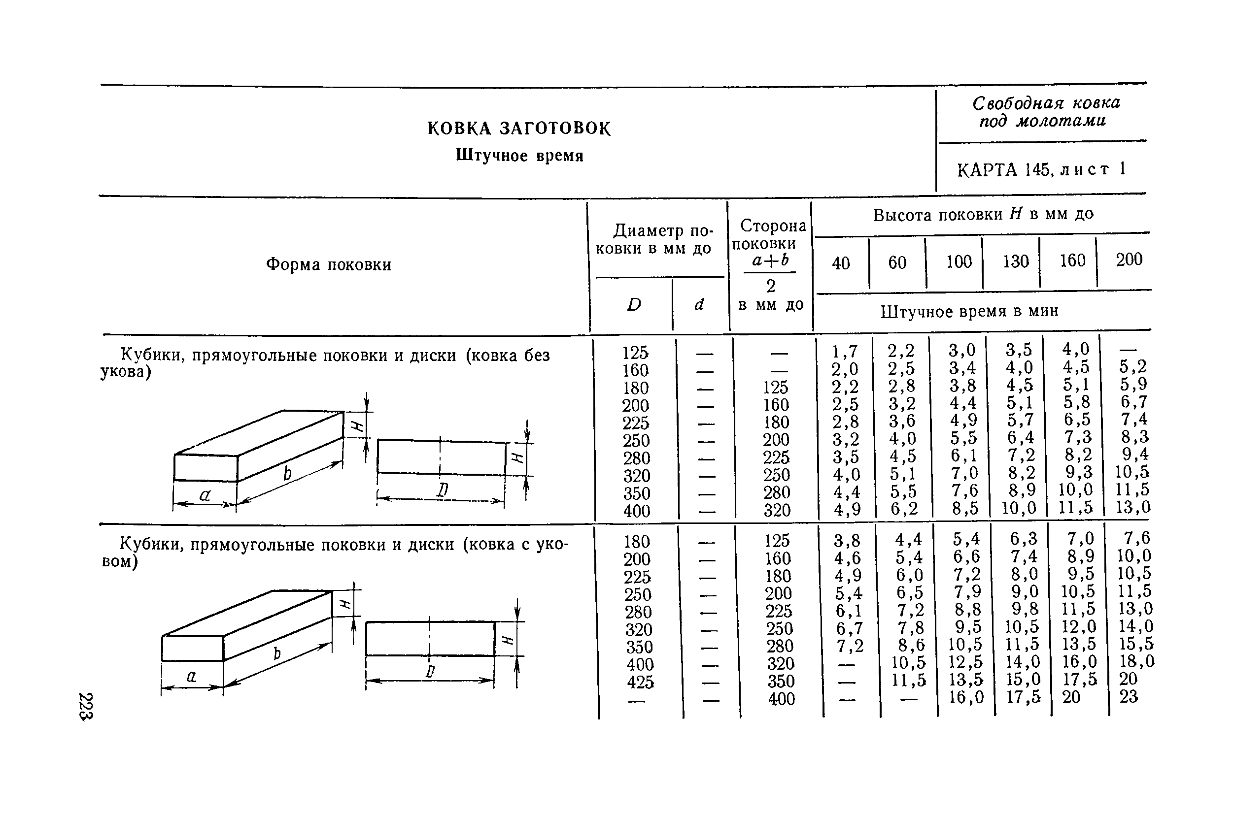 | Оглавление: | I. Типовые нормы времени на изготовление штампов II. Типовые нормы времени на изготовление пресс-форм Универсальные блоки пресс-форм с нижней загрузочной камерой Пакеты к блокам пресс-форм с нижней загрузочной камерой Пресс-формы съемные III. Нормативы неполного штучного времени и нормы времени на операции, не охваченные типовыми нормами времени IV. Подготовительно-заключительное время на партию Приложение 1. Штамп комбинированный, Трудоемкость изготовления Приложение 2. Пресс-формы для прессования изделий из реактопластов. Универсальные блоки с нижней загрузочной камерой, МН 1515-61. Трудоемкость изготовления Приложение 3. Пакеты к блокам пресс-форм с нижней загрузочной камерой, МН 1516-61 Приложение 4. Пресс-формы съемные круглые прямого прессования с двумя плоскостями разъема, МН 1452-61. Трудоемкость изготовления Приложение 5. Пресс-формы съемные прямоугольные литьевого прессования с двумя плоскостями разъема и двумя пуансонодержателями, МН 1461-61. Трудоемкость изготовления Приложение 6. Режимы резания, принятые при изготовлении штампов и пресс-форм Приложение 7. Припуски на механическую обработку Приложение 8. Перечень типовых моделей оборудования инструментального цеха штампов и пресс-форм Приложение 9. Теоретический вес заготовк |