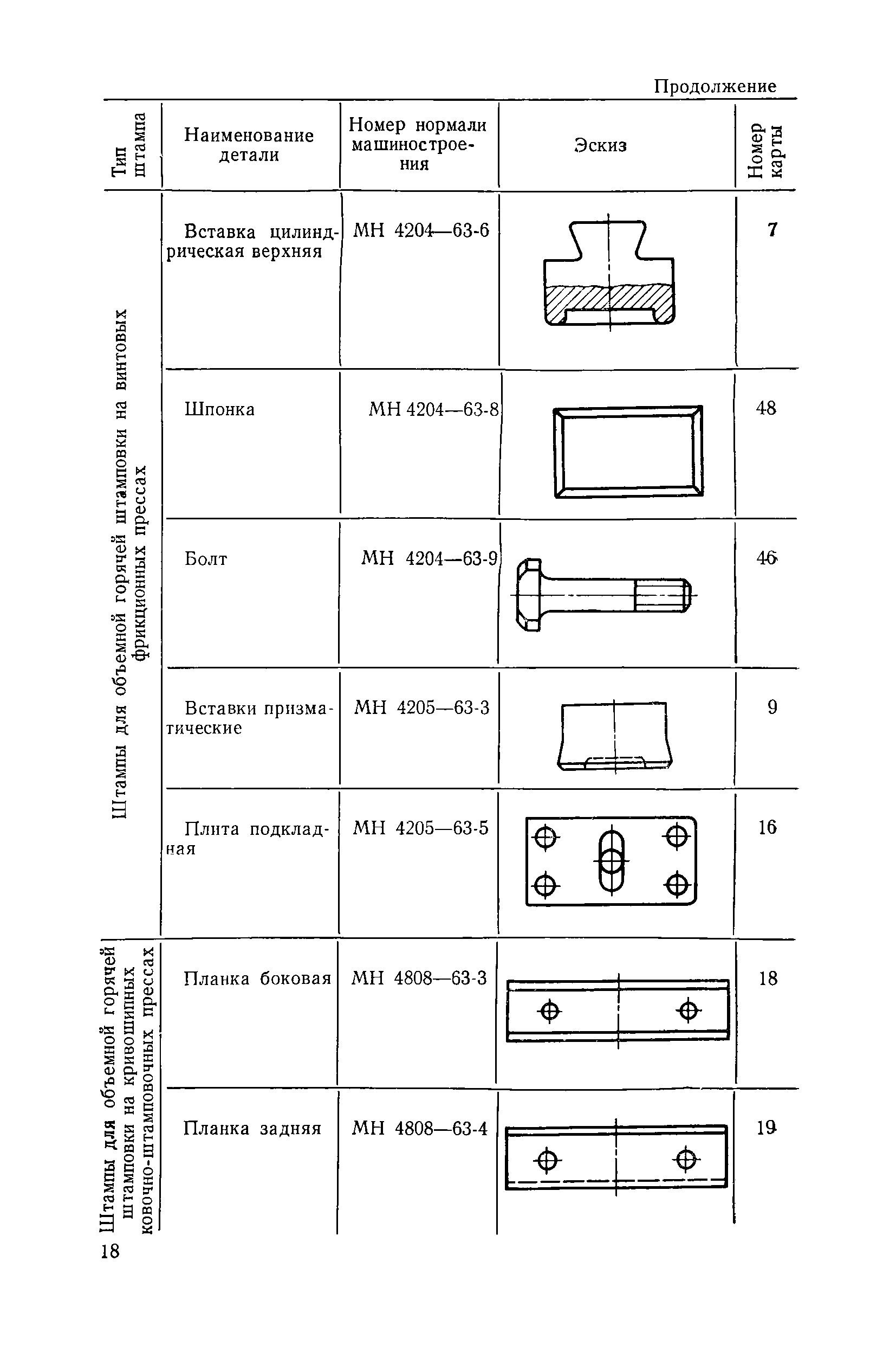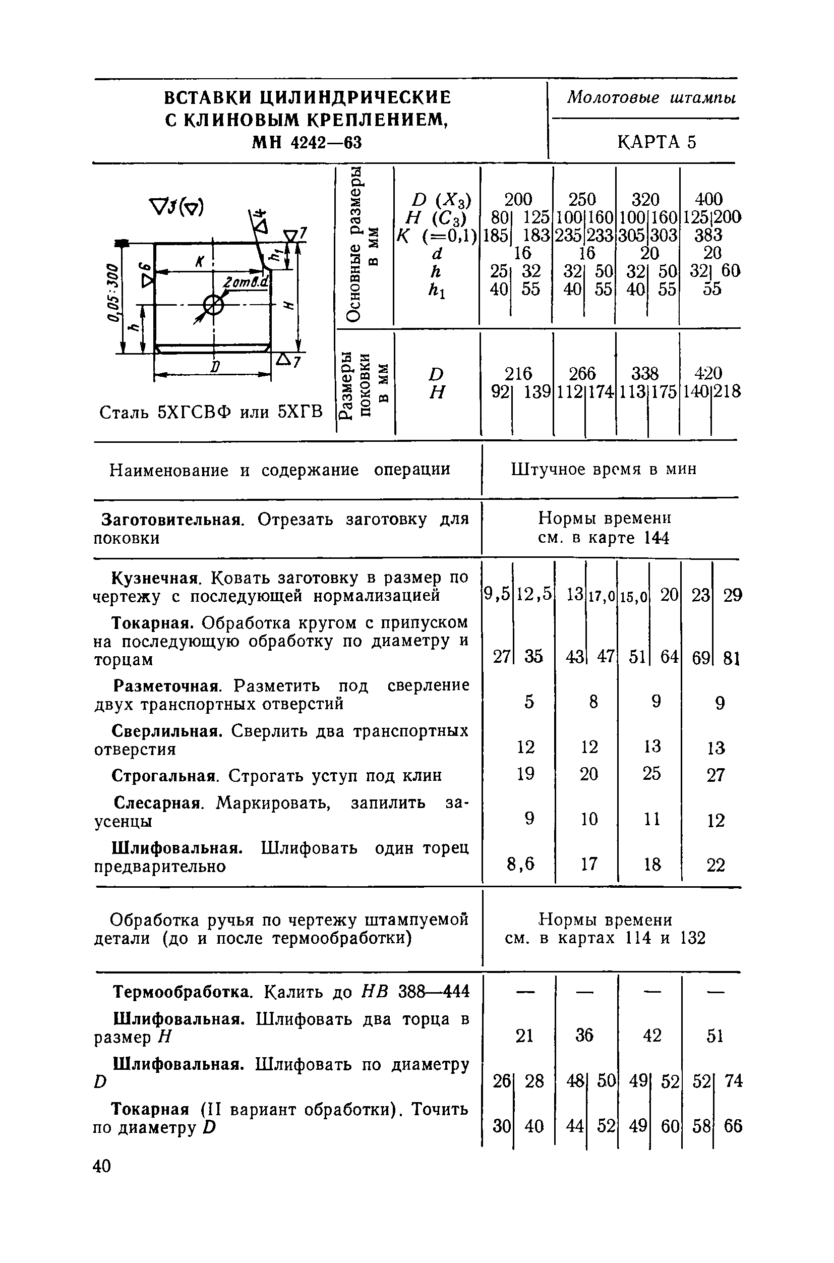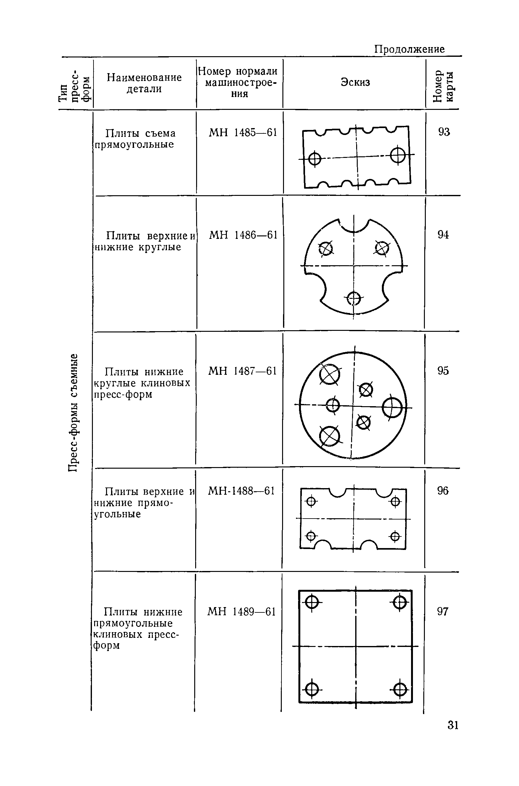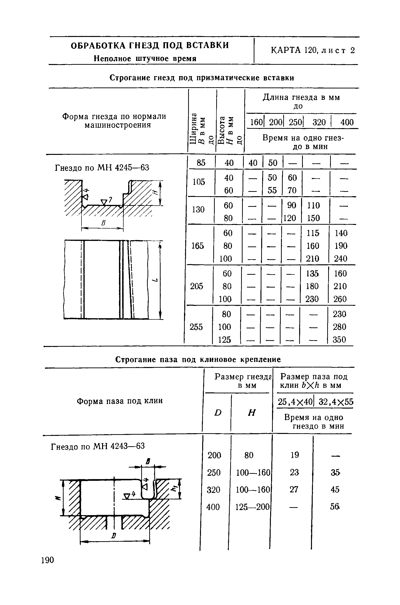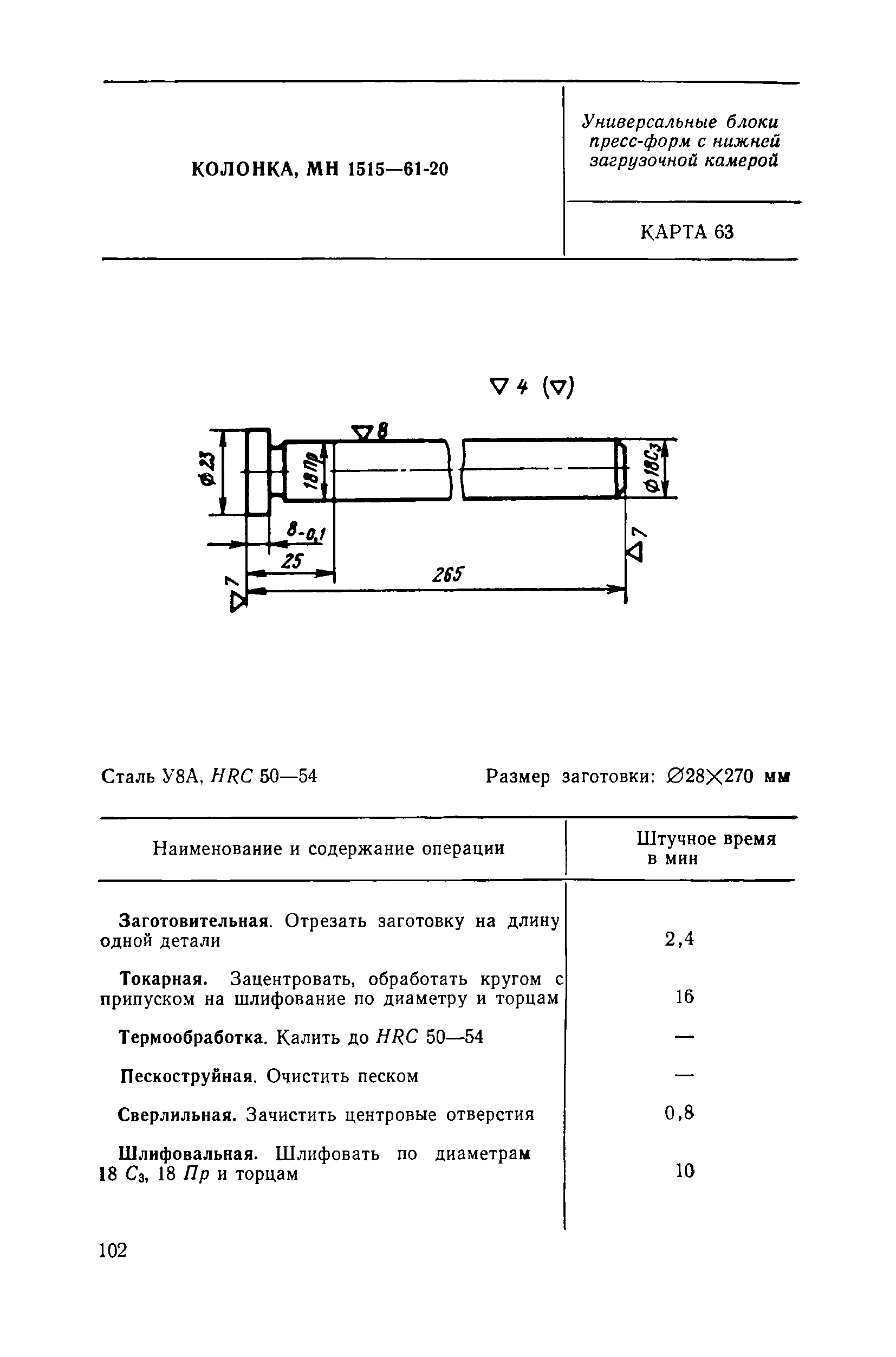 | Оглавление: | I. Типовые нормы времени на изготовление штампов II. Типовые нормы времени на изготовление пресс-форм Универсальные блоки пресс-форм с нижней загрузочной камерой Пакеты к блокам пресс-форм с нижней загрузочной камерой Пресс-формы съемные III. Нормативы неполного штучного времени и нормы времени на операции, не охваченные типовыми нормами времени IV. Подготовительно-заключительное время на партию Приложение 1. Штамп комбинированный, Трудоемкость изготовления Приложение 2. Пресс-формы для прессования изделий из реактопластов. Универсальные блоки с нижней загрузочной камерой, МН 1515-61. Трудоемкость изготовления Приложение 3. Пакеты к блокам пресс-форм с нижней загрузочной камерой, МН 1516-61 Приложение 4. Пресс-формы съемные круглые прямого прессования с двумя плоскостями разъема, МН 1452-61. Трудоемкость изготовления Приложение 5. Пресс-формы съемные прямоугольные литьевого прессования с двумя плоскостями разъема и двумя пуансонодержателями, МН 1461-61. Трудоемкость изготовления Приложение 6. Режимы резания, принятые при изготовлении штампов и пресс-форм Приложение 7. Припуски на механическую обработку Приложение 8. Перечень типовых моделей оборудования инструментального цеха штампов и пресс-форм Приложение 9. Теоретический вес заготовк |