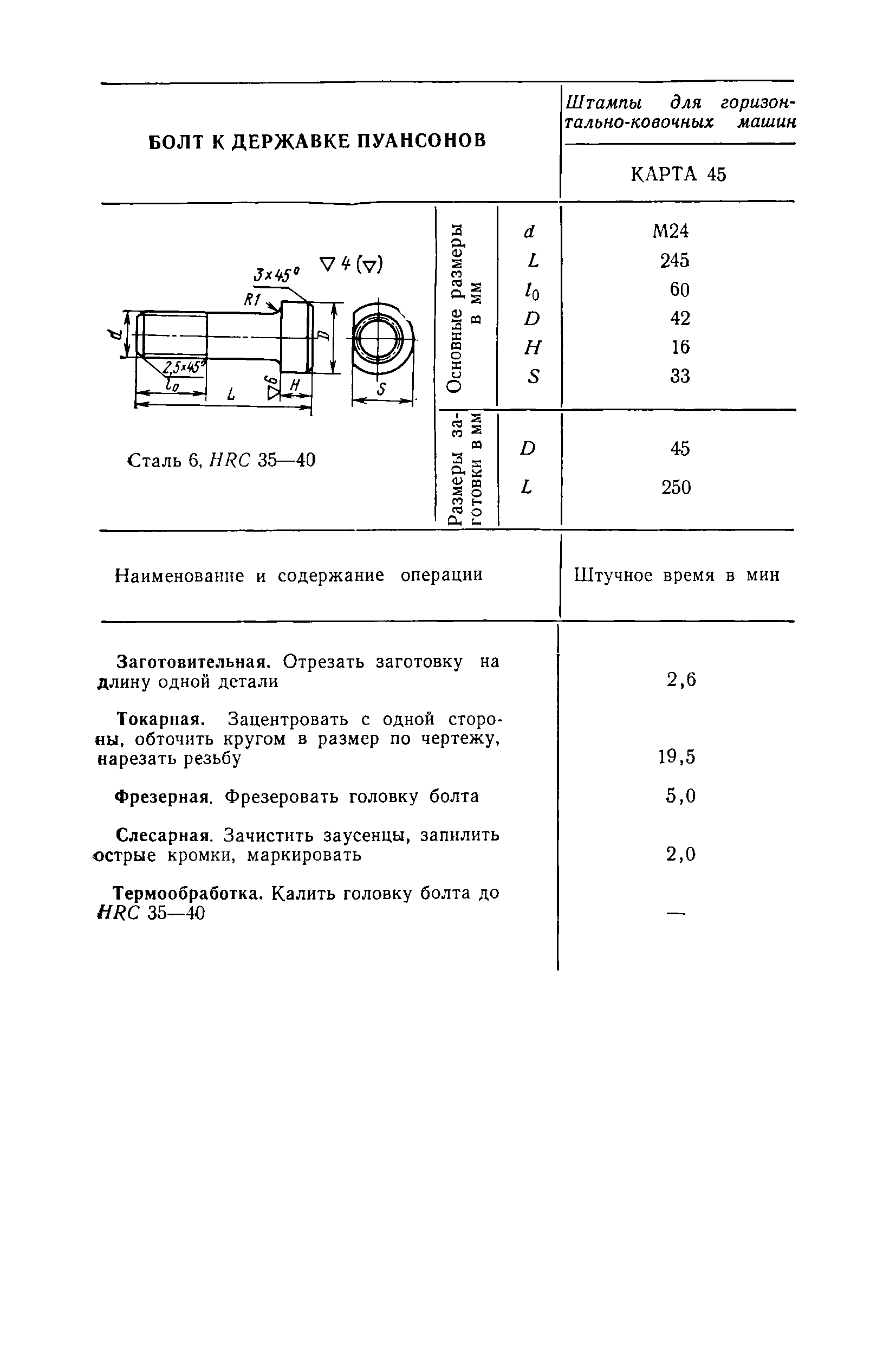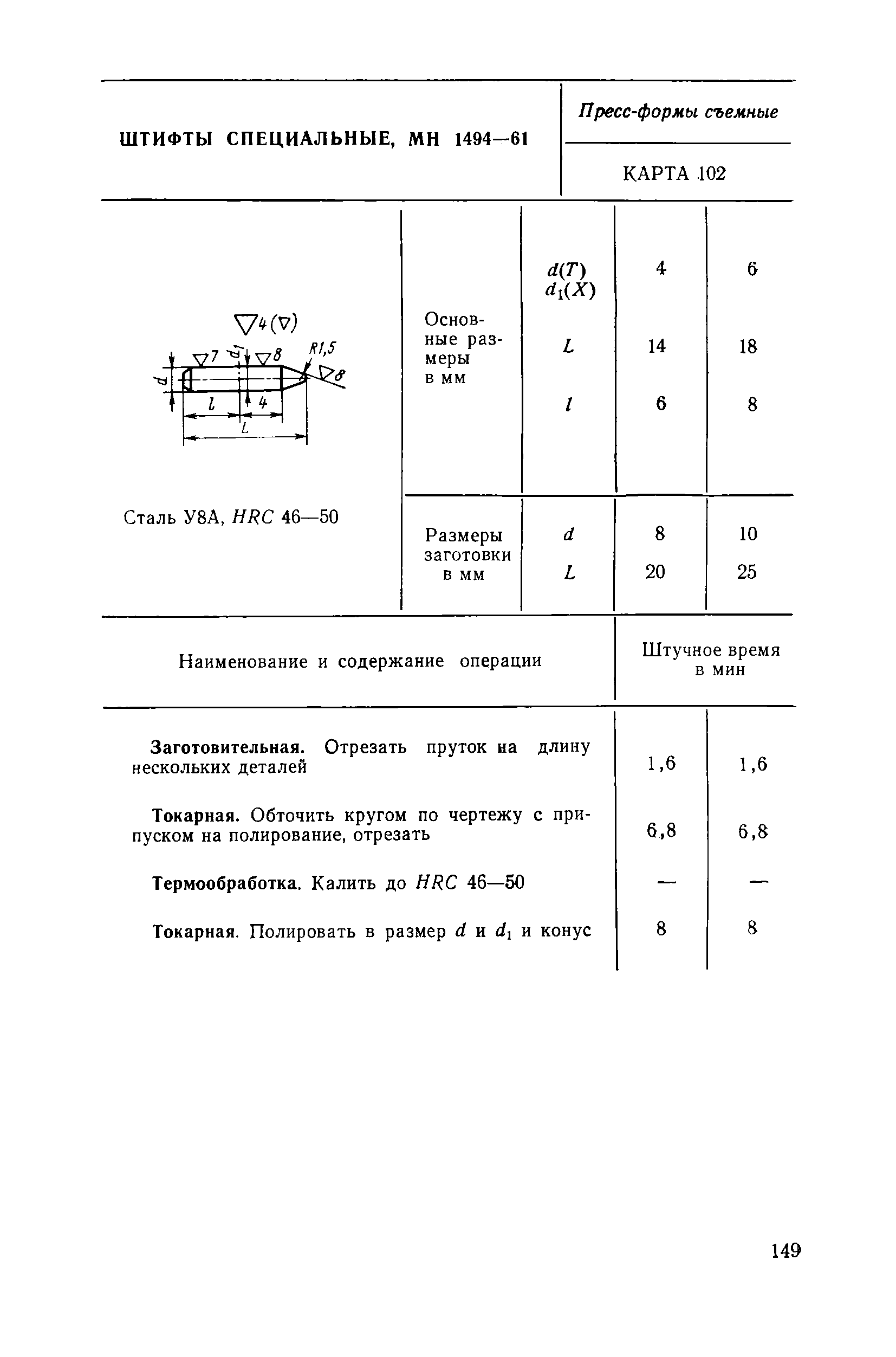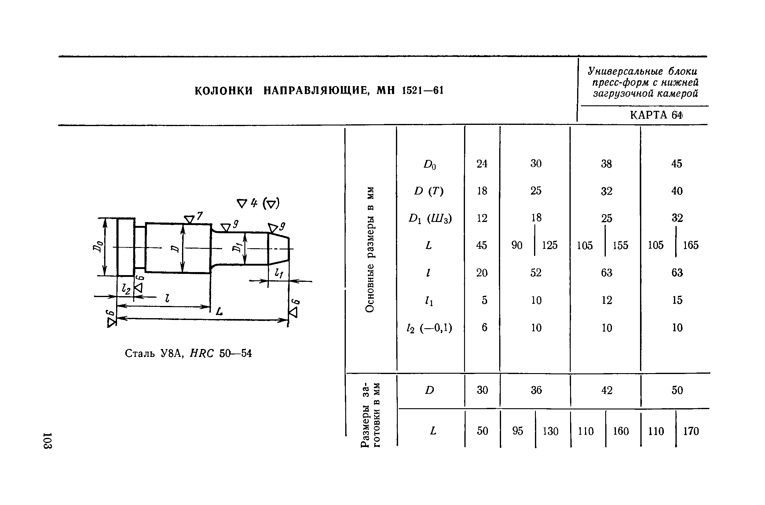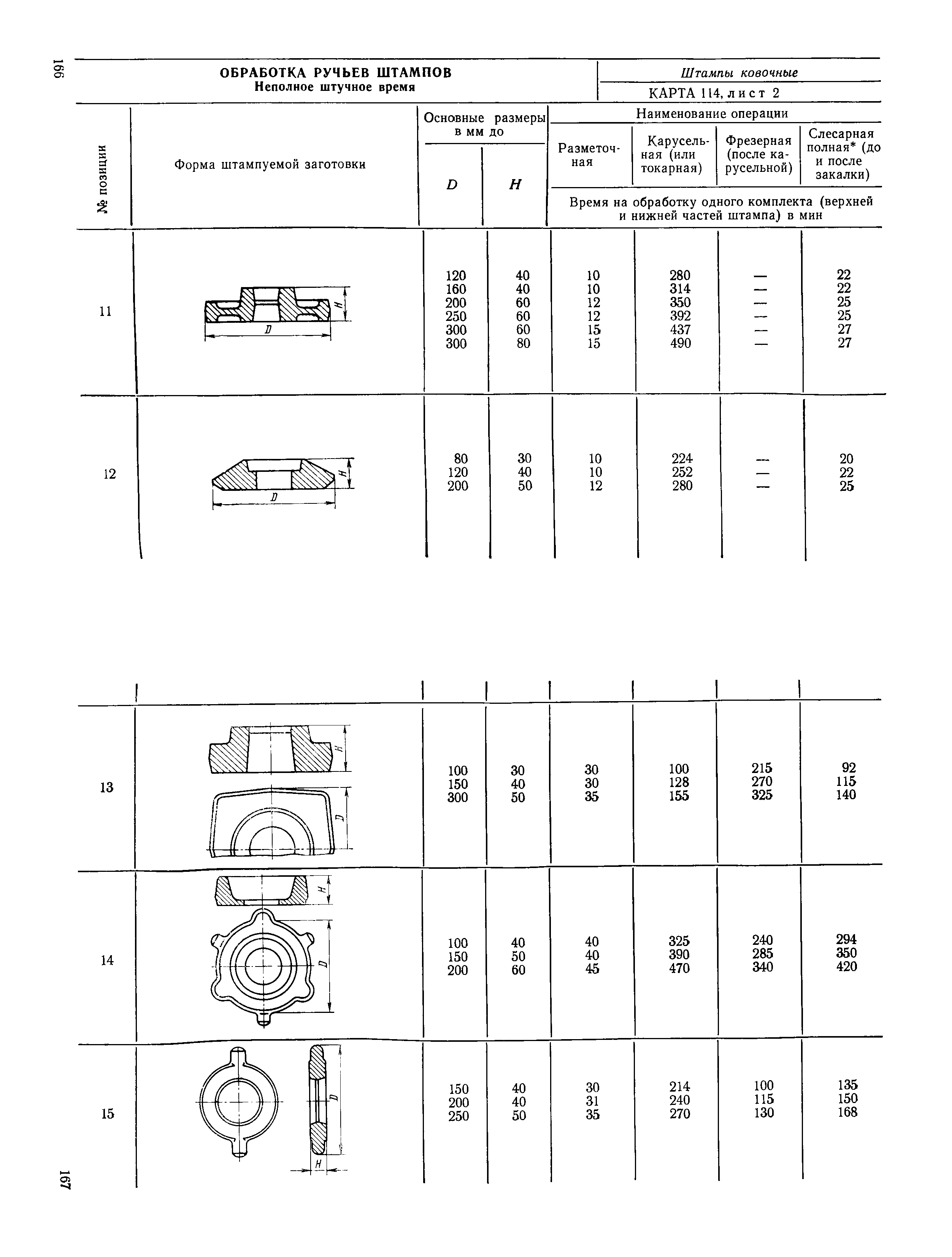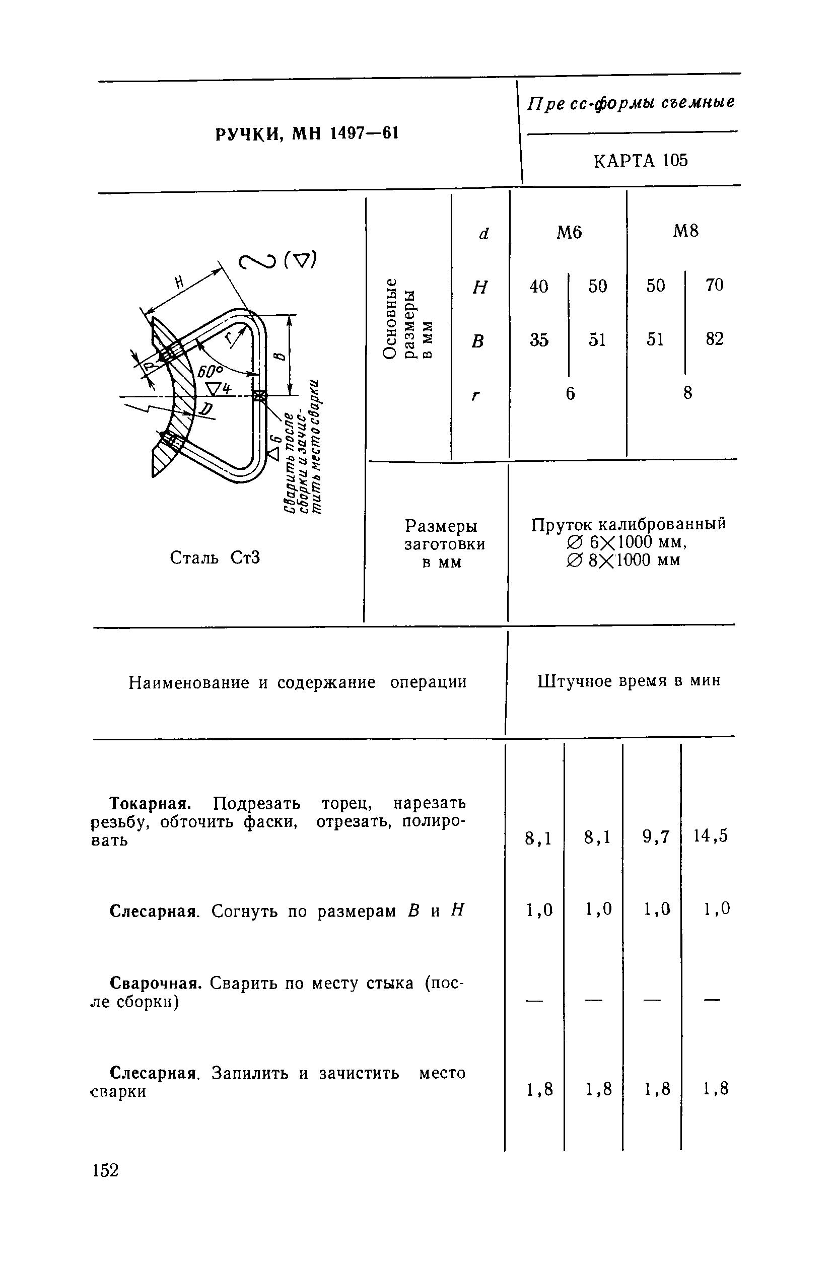 | Оглавление: | I. Типовые нормы времени на изготовление штампов II. Типовые нормы времени на изготовление пресс-форм Универсальные блоки пресс-форм с нижней загрузочной камерой Пакеты к блокам пресс-форм с нижней загрузочной камерой Пресс-формы съемные III. Нормативы неполного штучного времени и нормы времени на операции, не охваченные типовыми нормами времени IV. Подготовительно-заключительное время на партию Приложение 1. Штамп комбинированный, Трудоемкость изготовления Приложение 2. Пресс-формы для прессования изделий из реактопластов. Универсальные блоки с нижней загрузочной камерой, МН 1515-61. Трудоемкость изготовления Приложение 3. Пакеты к блокам пресс-форм с нижней загрузочной камерой, МН 1516-61 Приложение 4. Пресс-формы съемные круглые прямого прессования с двумя плоскостями разъема, МН 1452-61. Трудоемкость изготовления Приложение 5. Пресс-формы съемные прямоугольные литьевого прессования с двумя плоскостями разъема и двумя пуансонодержателями, МН 1461-61. Трудоемкость изготовления Приложение 6. Режимы резания, принятые при изготовлении штампов и пресс-форм Приложение 7. Припуски на механическую обработку Приложение 8. Перечень типовых моделей оборудования инструментального цеха штампов и пресс-форм Приложение 9. Теоретический вес заготовк |
