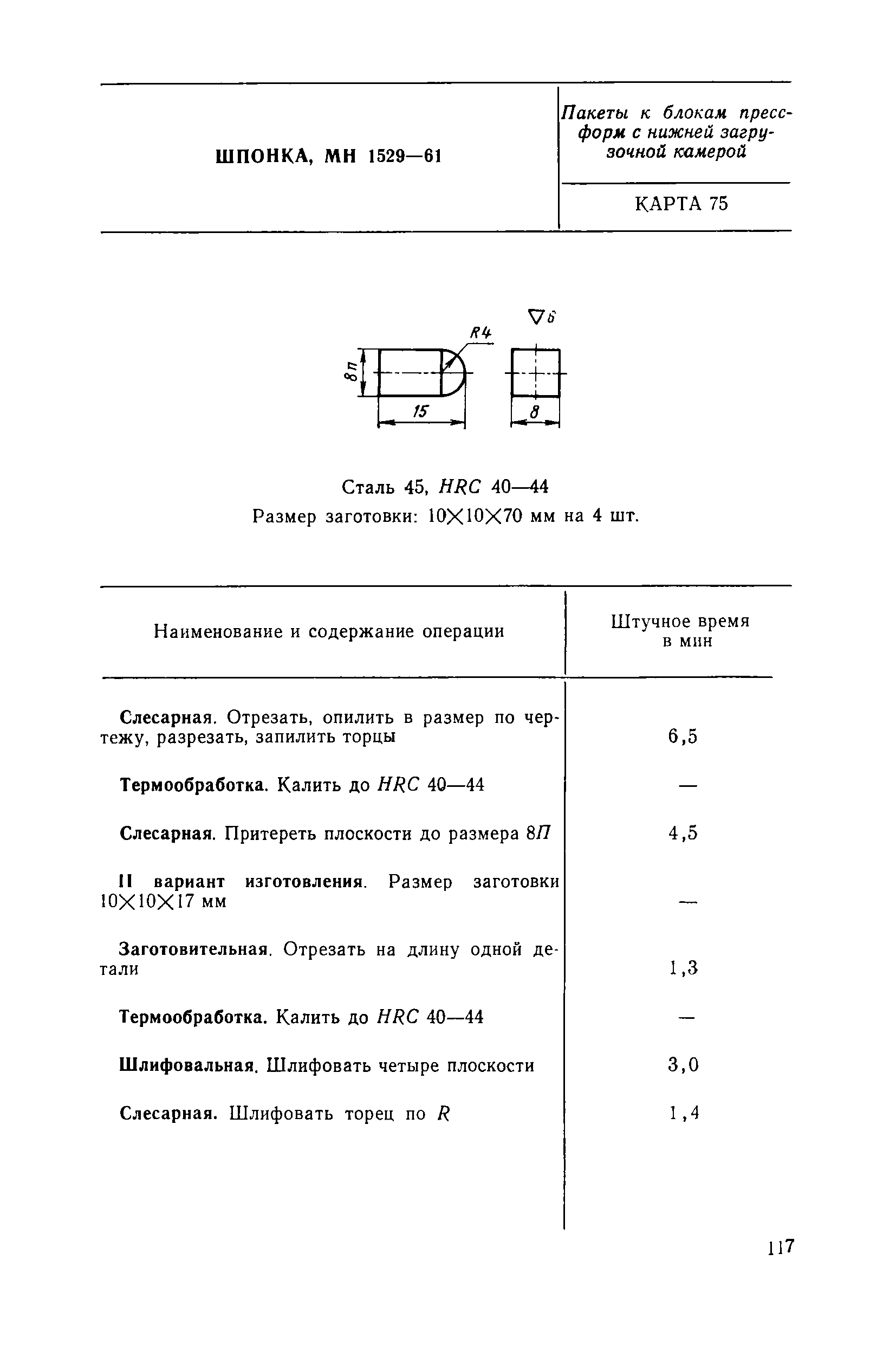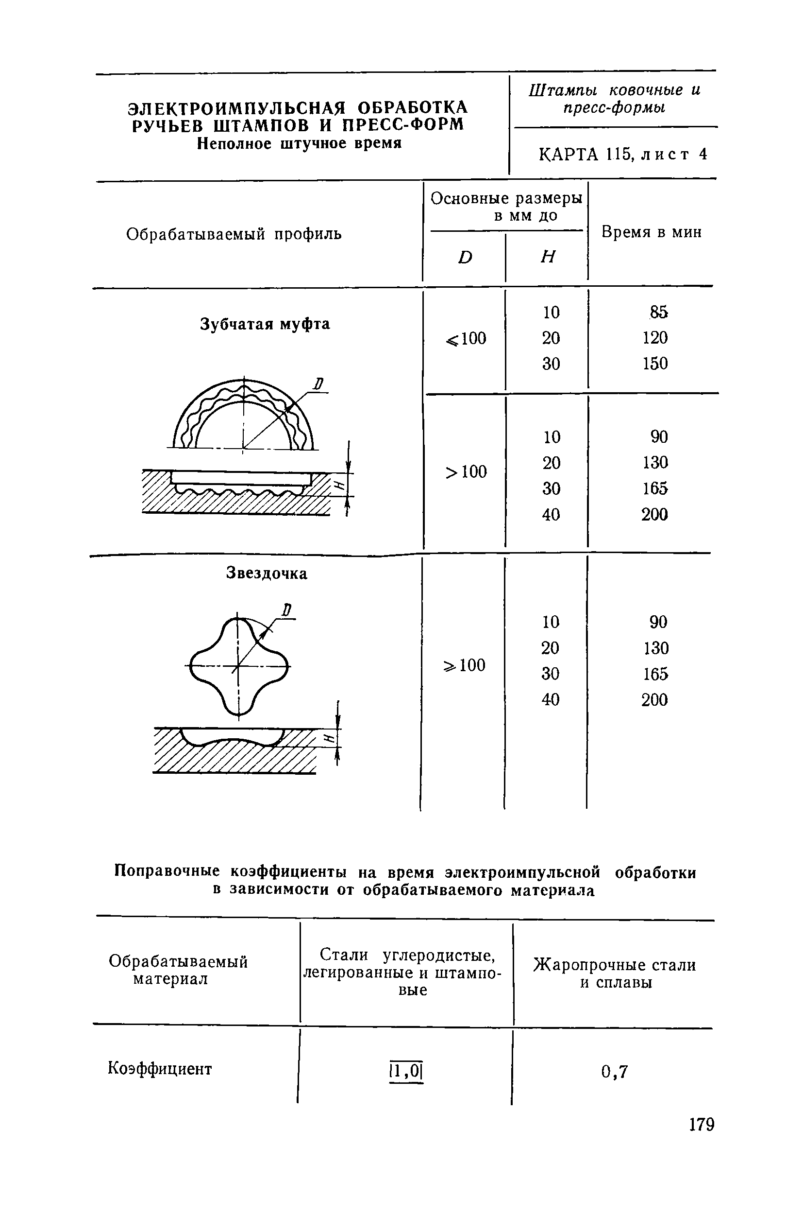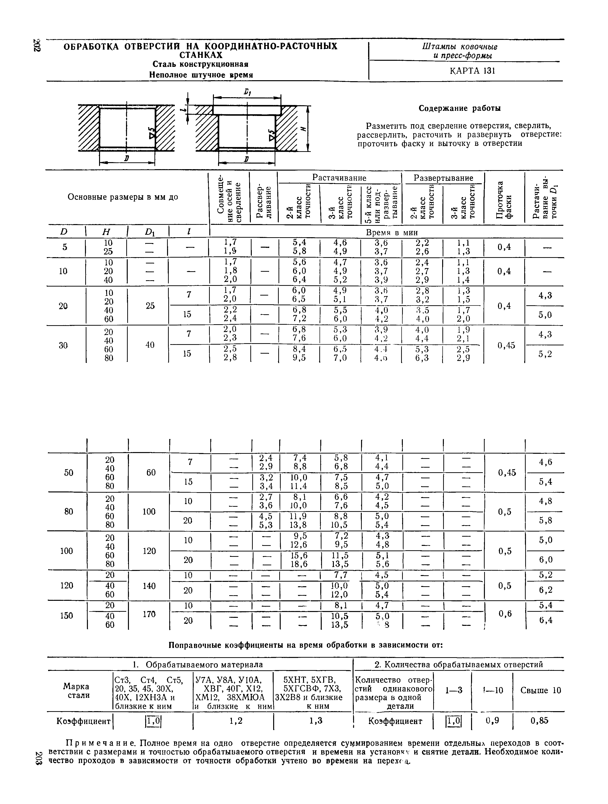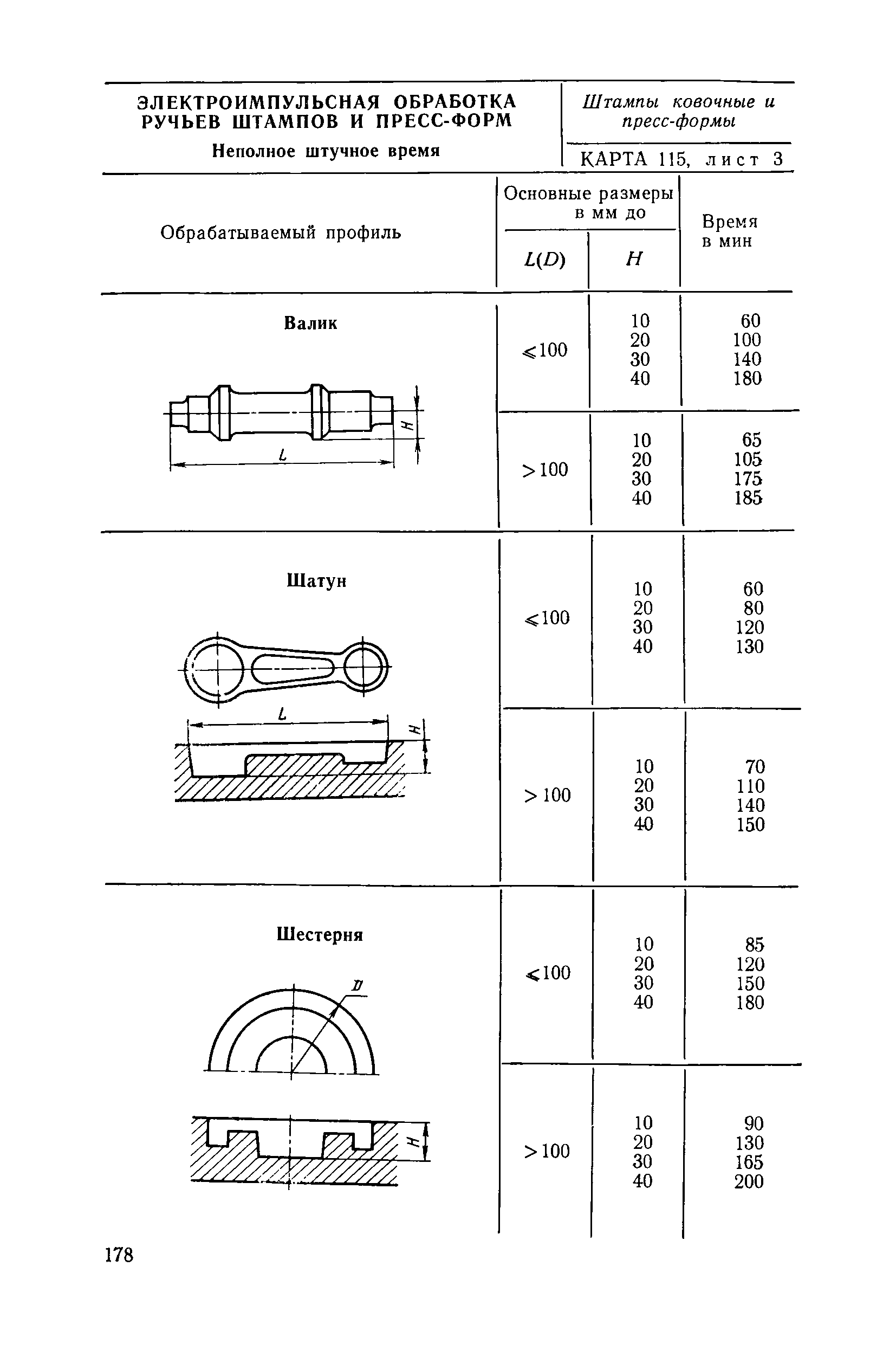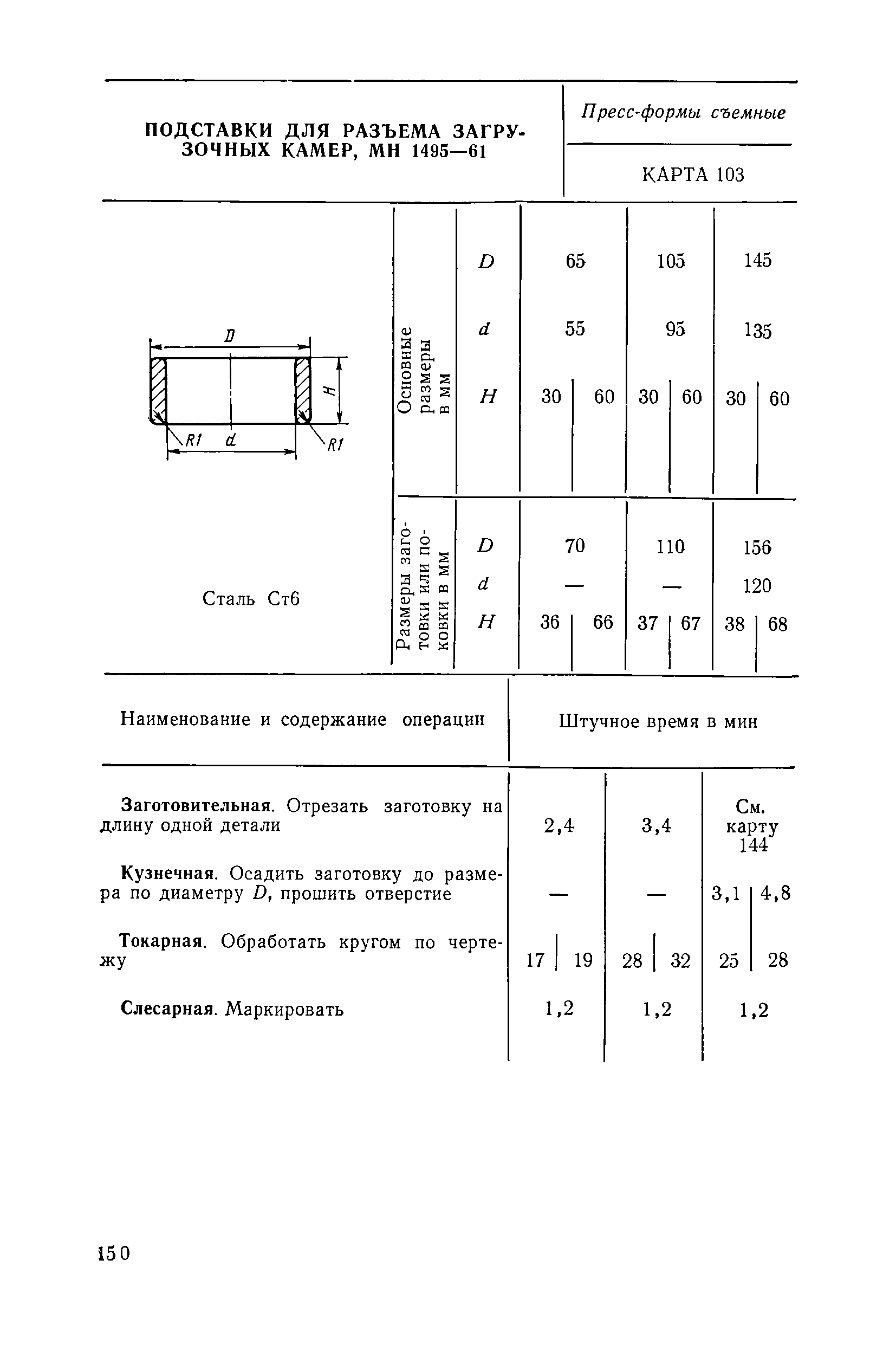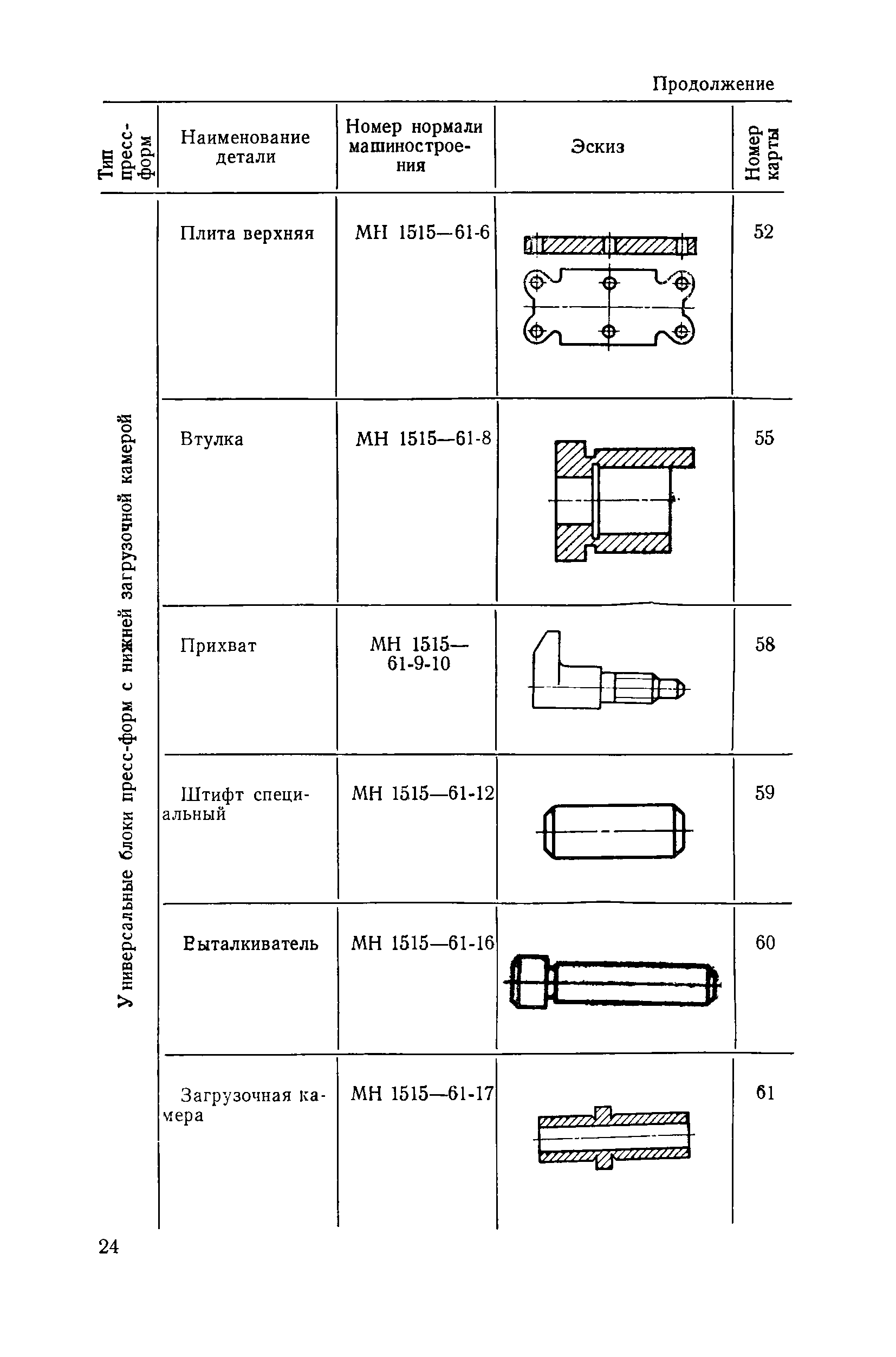 | Оглавление: | I. Типовые нормы времени на изготовление штампов II. Типовые нормы времени на изготовление пресс-форм Универсальные блоки пресс-форм с нижней загрузочной камерой Пакеты к блокам пресс-форм с нижней загрузочной камерой Пресс-формы съемные III. Нормативы неполного штучного времени и нормы времени на операции, не охваченные типовыми нормами времени IV. Подготовительно-заключительное время на партию Приложение 1. Штамп комбинированный, Трудоемкость изготовления Приложение 2. Пресс-формы для прессования изделий из реактопластов. Универсальные блоки с нижней загрузочной камерой, МН 1515-61. Трудоемкость изготовления Приложение 3. Пакеты к блокам пресс-форм с нижней загрузочной камерой, МН 1516-61 Приложение 4. Пресс-формы съемные круглые прямого прессования с двумя плоскостями разъема, МН 1452-61. Трудоемкость изготовления Приложение 5. Пресс-формы съемные прямоугольные литьевого прессования с двумя плоскостями разъема и двумя пуансонодержателями, МН 1461-61. Трудоемкость изготовления Приложение 6. Режимы резания, принятые при изготовлении штампов и пресс-форм Приложение 7. Припуски на механическую обработку Приложение 8. Перечень типовых моделей оборудования инструментального цеха штампов и пресс-форм Приложение 9. Теоретический вес заготовк |