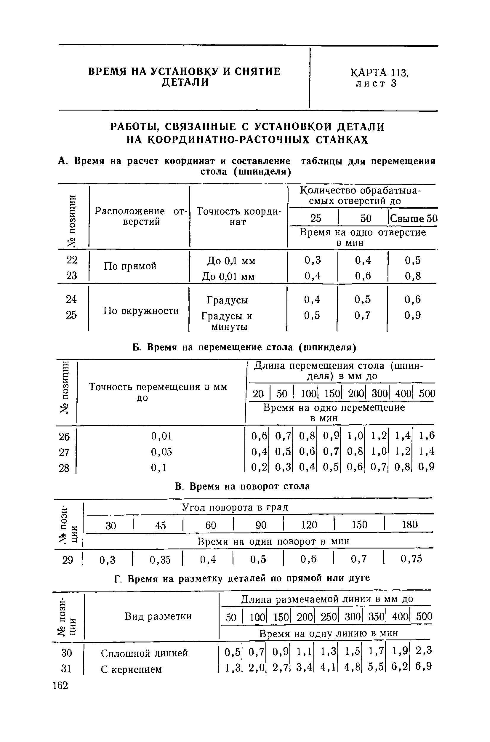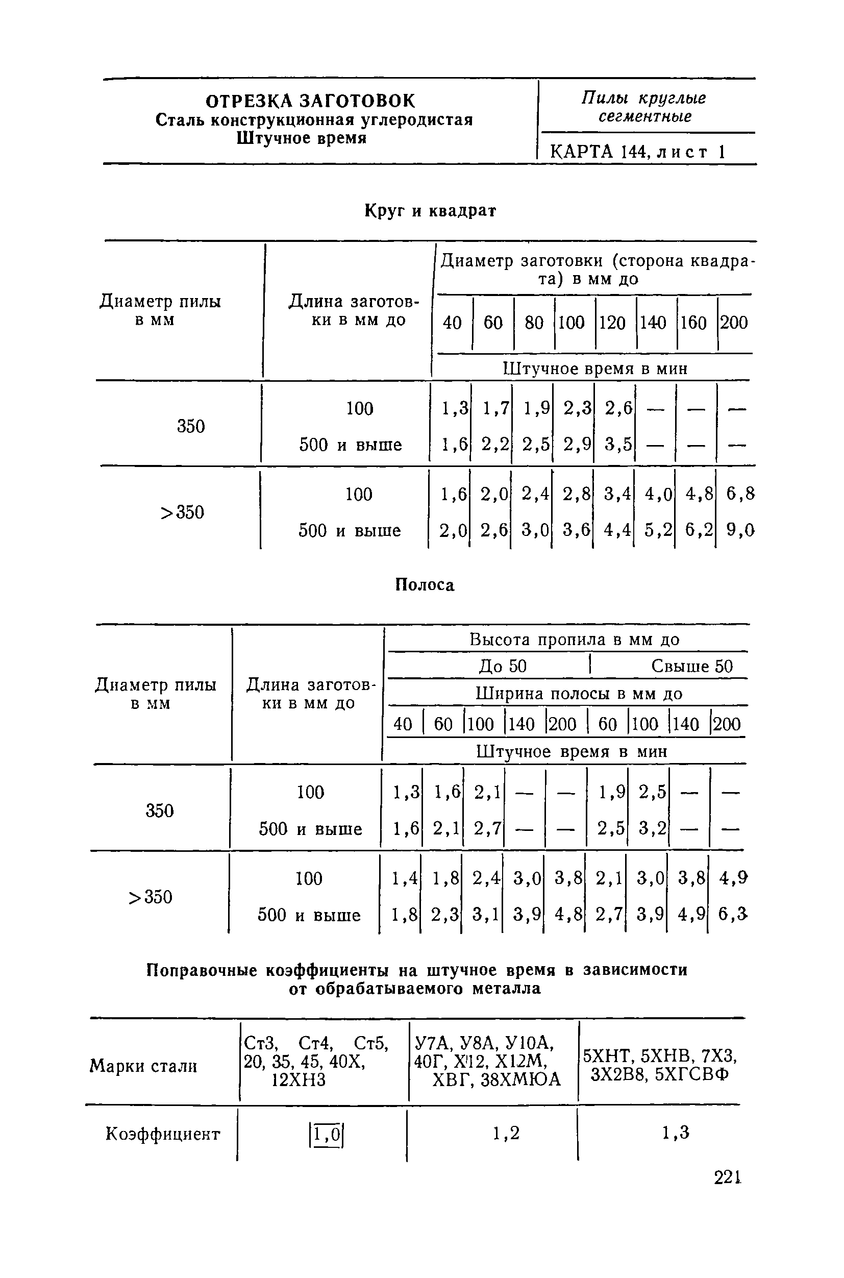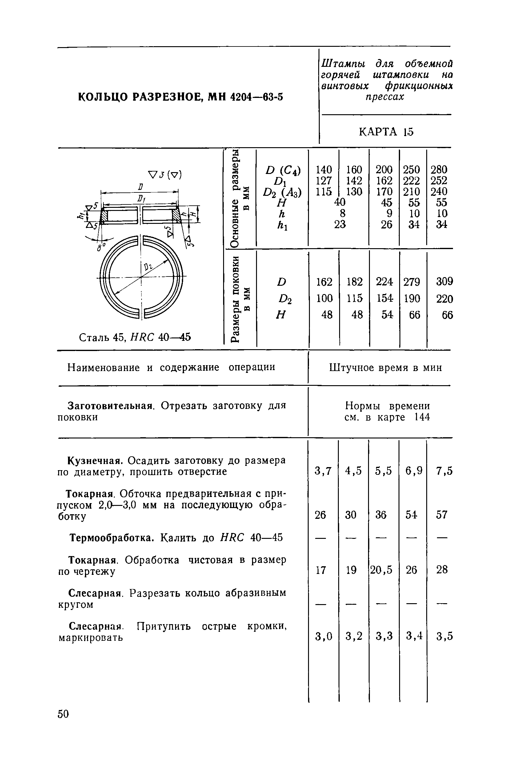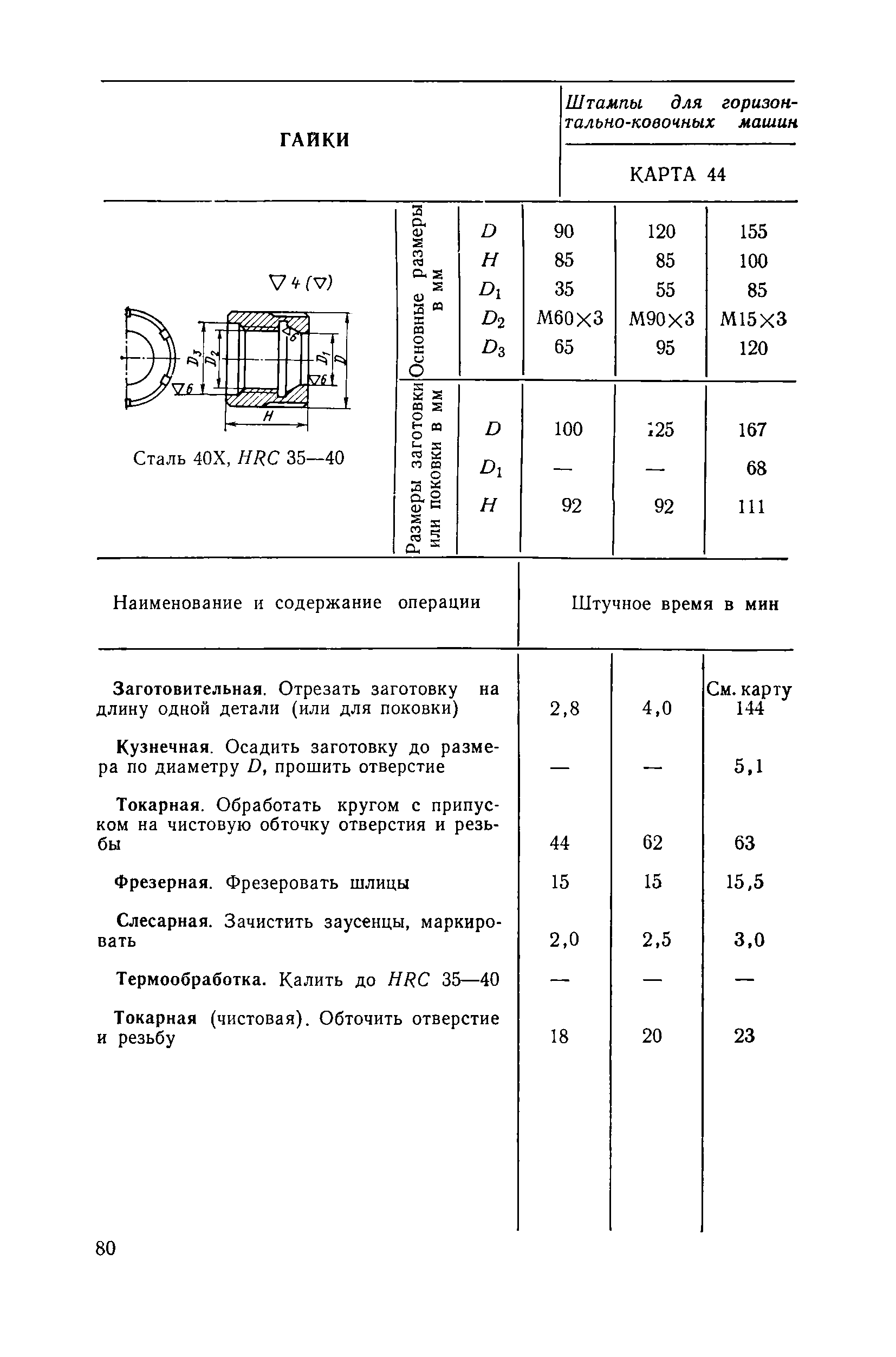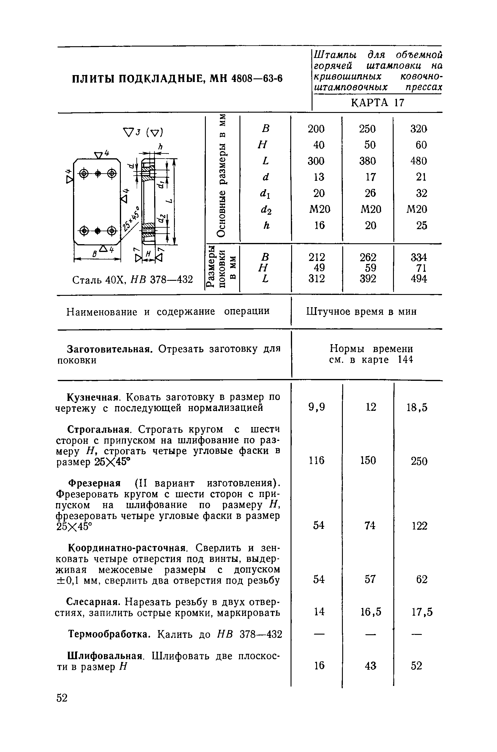 | Оглавление: | I. Типовые нормы времени на изготовление штампов II. Типовые нормы времени на изготовление пресс-форм Универсальные блоки пресс-форм с нижней загрузочной камерой Пакеты к блокам пресс-форм с нижней загрузочной камерой Пресс-формы съемные III. Нормативы неполного штучного времени и нормы времени на операции, не охваченные типовыми нормами времени IV. Подготовительно-заключительное время на партию Приложение 1. Штамп комбинированный, Трудоемкость изготовления Приложение 2. Пресс-формы для прессования изделий из реактопластов. Универсальные блоки с нижней загрузочной камерой, МН 1515-61. Трудоемкость изготовления Приложение 3. Пакеты к блокам пресс-форм с нижней загрузочной камерой, МН 1516-61 Приложение 4. Пресс-формы съемные круглые прямого прессования с двумя плоскостями разъема, МН 1452-61. Трудоемкость изготовления Приложение 5. Пресс-формы съемные прямоугольные литьевого прессования с двумя плоскостями разъема и двумя пуансонодержателями, МН 1461-61. Трудоемкость изготовления Приложение 6. Режимы резания, принятые при изготовлении штампов и пресс-форм Приложение 7. Припуски на механическую обработку Приложение 8. Перечень типовых моделей оборудования инструментального цеха штампов и пресс-форм Приложение 9. Теоретический вес заготовк |