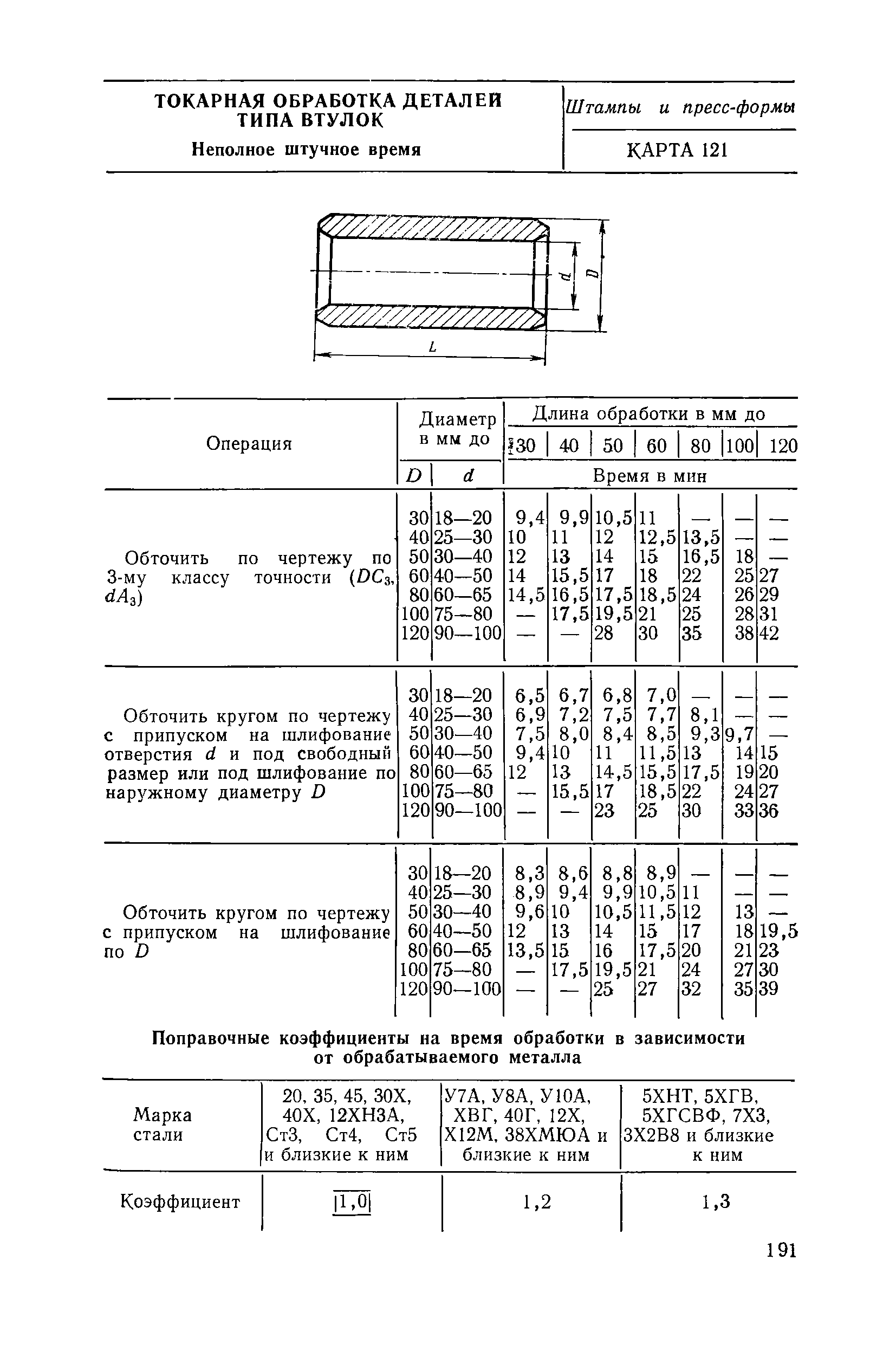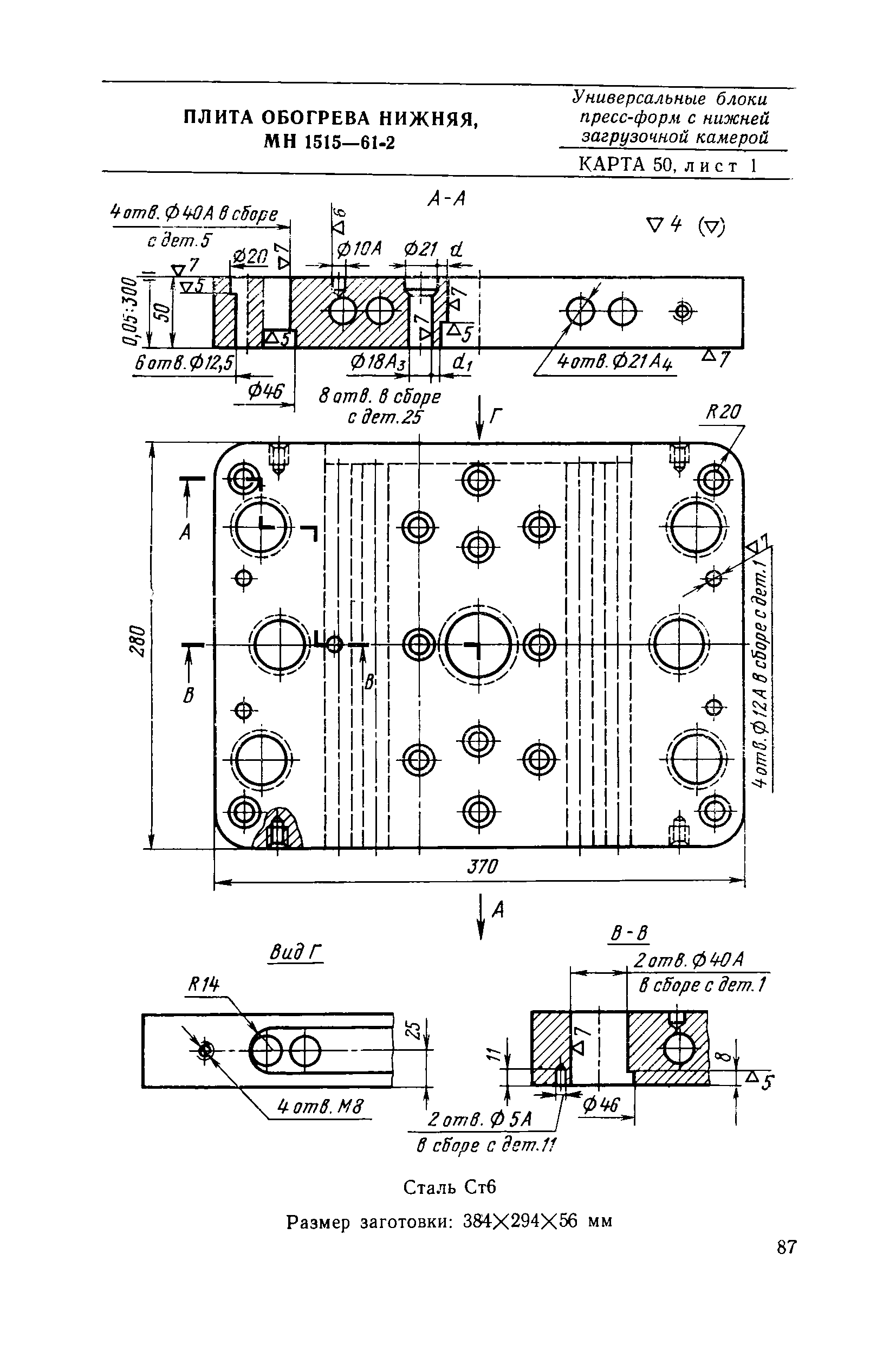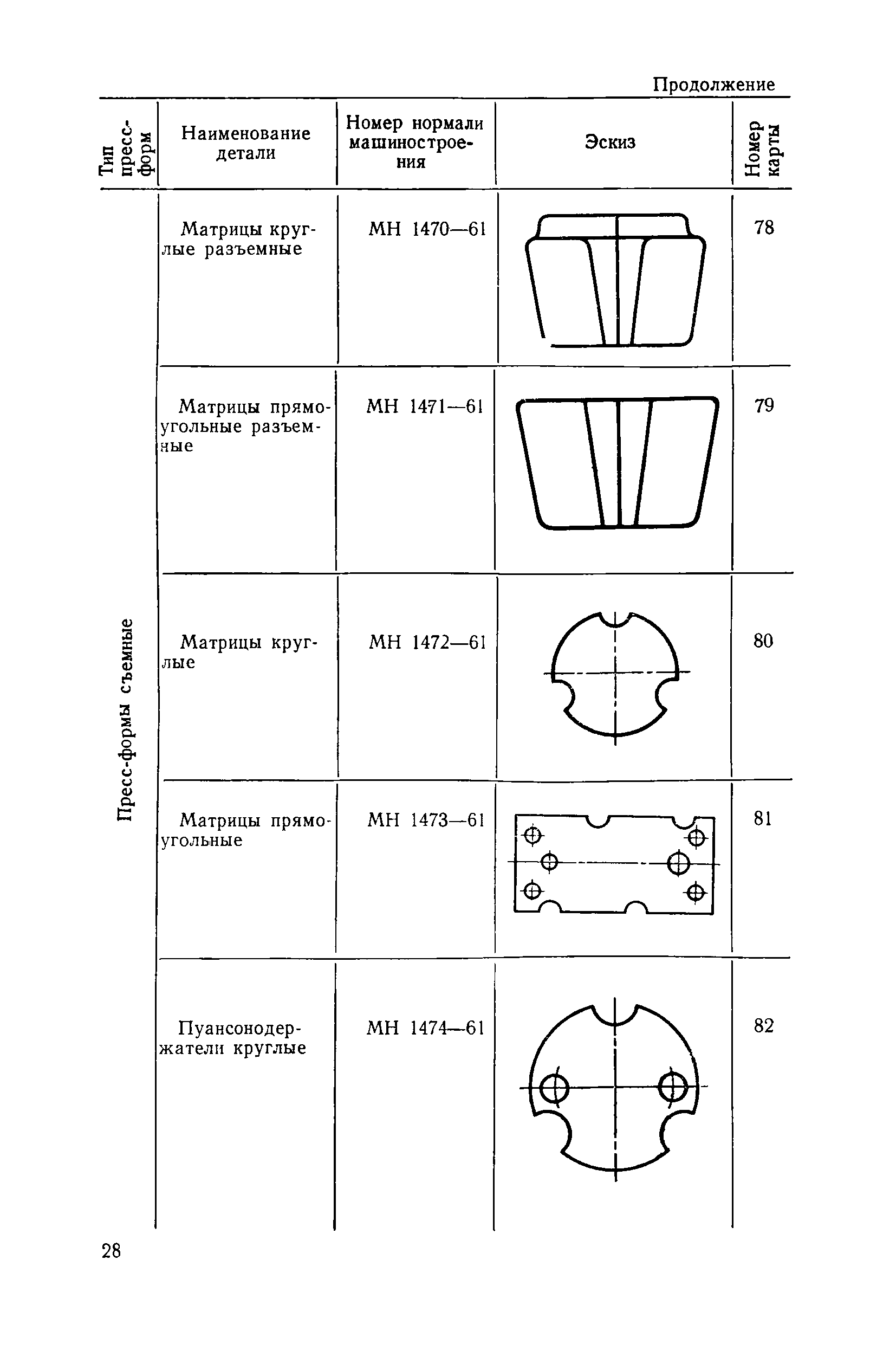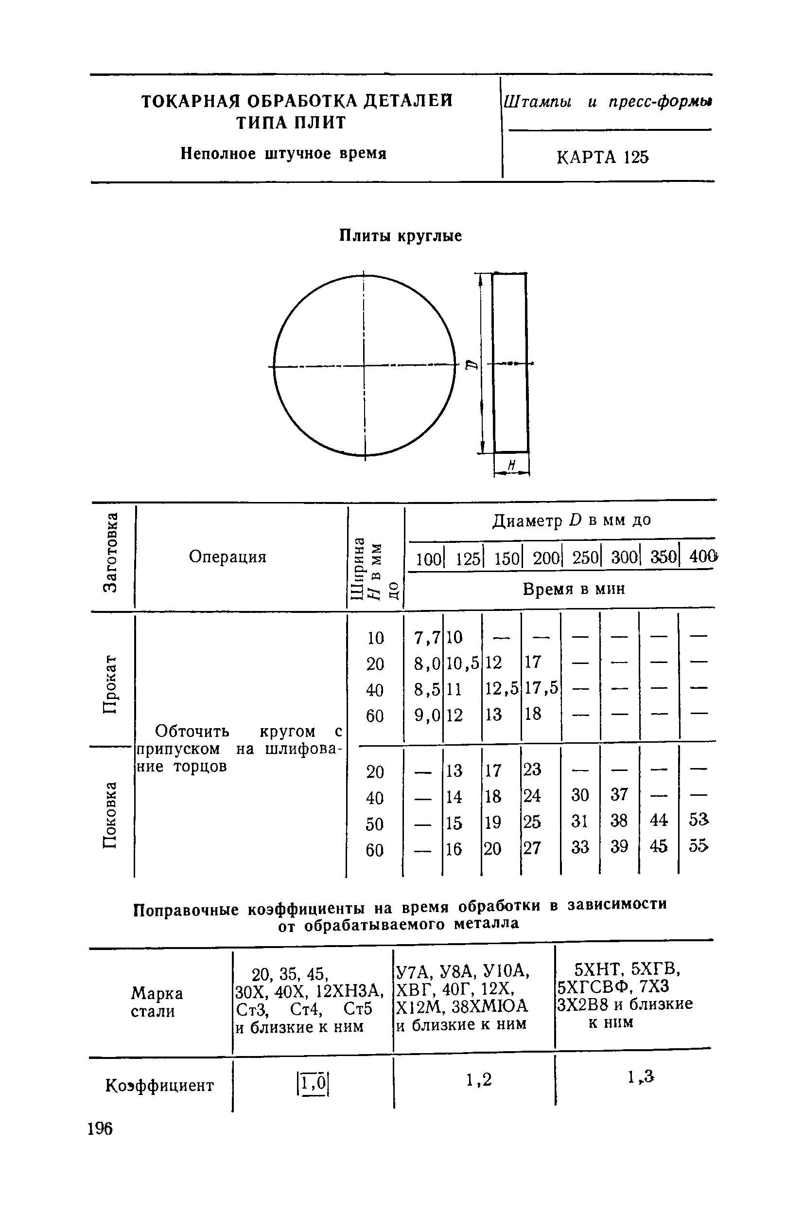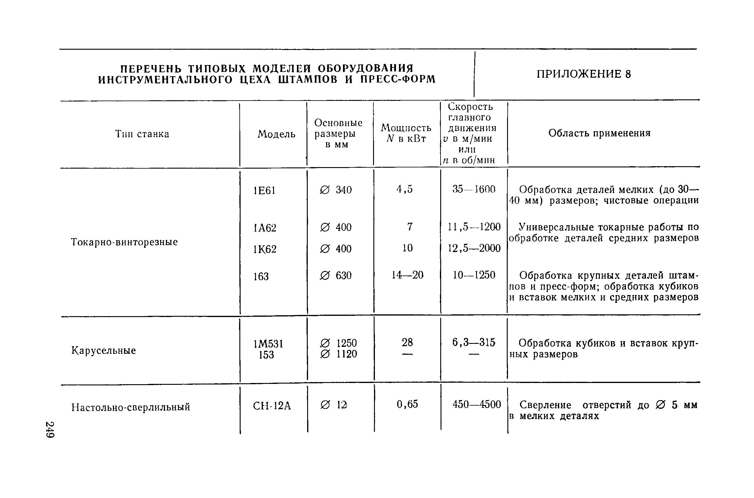 | Оглавление: | I. Типовые нормы времени на изготовление штампов II. Типовые нормы времени на изготовление пресс-форм Универсальные блоки пресс-форм с нижней загрузочной камерой Пакеты к блокам пресс-форм с нижней загрузочной камерой Пресс-формы съемные III. Нормативы неполного штучного времени и нормы времени на операции, не охваченные типовыми нормами времени IV. Подготовительно-заключительное время на партию Приложение 1. Штамп комбинированный, Трудоемкость изготовления Приложение 2. Пресс-формы для прессования изделий из реактопластов. Универсальные блоки с нижней загрузочной камерой, МН 1515-61. Трудоемкость изготовления Приложение 3. Пакеты к блокам пресс-форм с нижней загрузочной камерой, МН 1516-61 Приложение 4. Пресс-формы съемные круглые прямого прессования с двумя плоскостями разъема, МН 1452-61. Трудоемкость изготовления Приложение 5. Пресс-формы съемные прямоугольные литьевого прессования с двумя плоскостями разъема и двумя пуансонодержателями, МН 1461-61. Трудоемкость изготовления Приложение 6. Режимы резания, принятые при изготовлении штампов и пресс-форм Приложение 7. Припуски на механическую обработку Приложение 8. Перечень типовых моделей оборудования инструментального цеха штампов и пресс-форм Приложение 9. Теоретический вес заготовк |