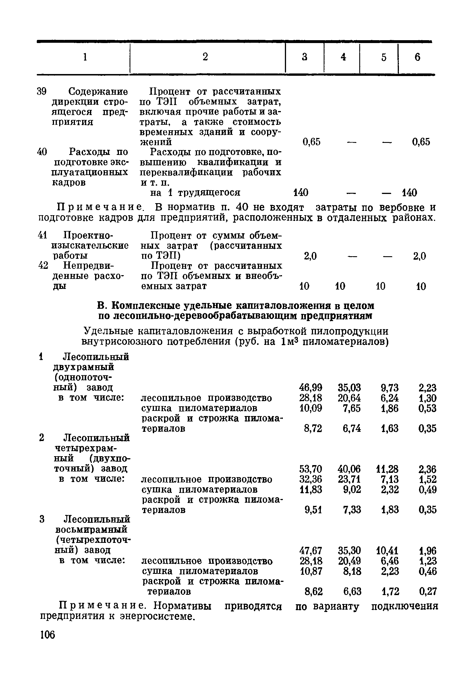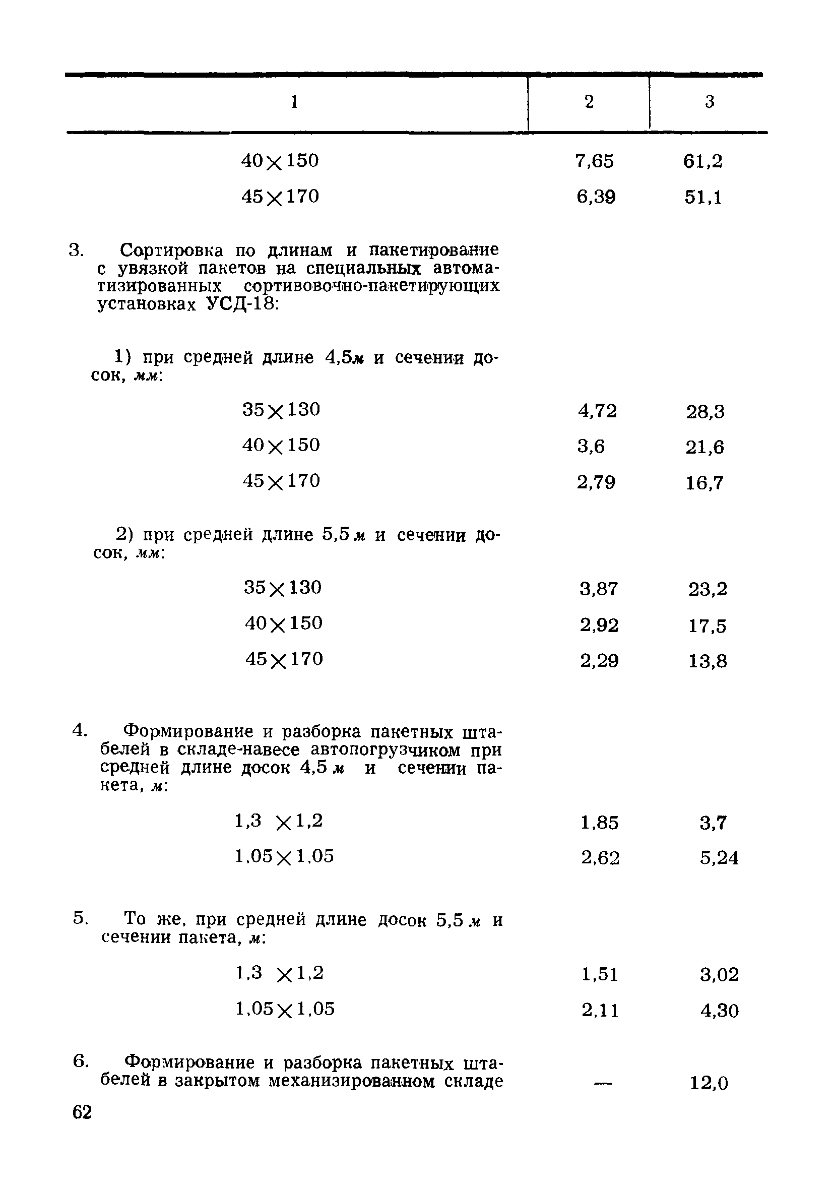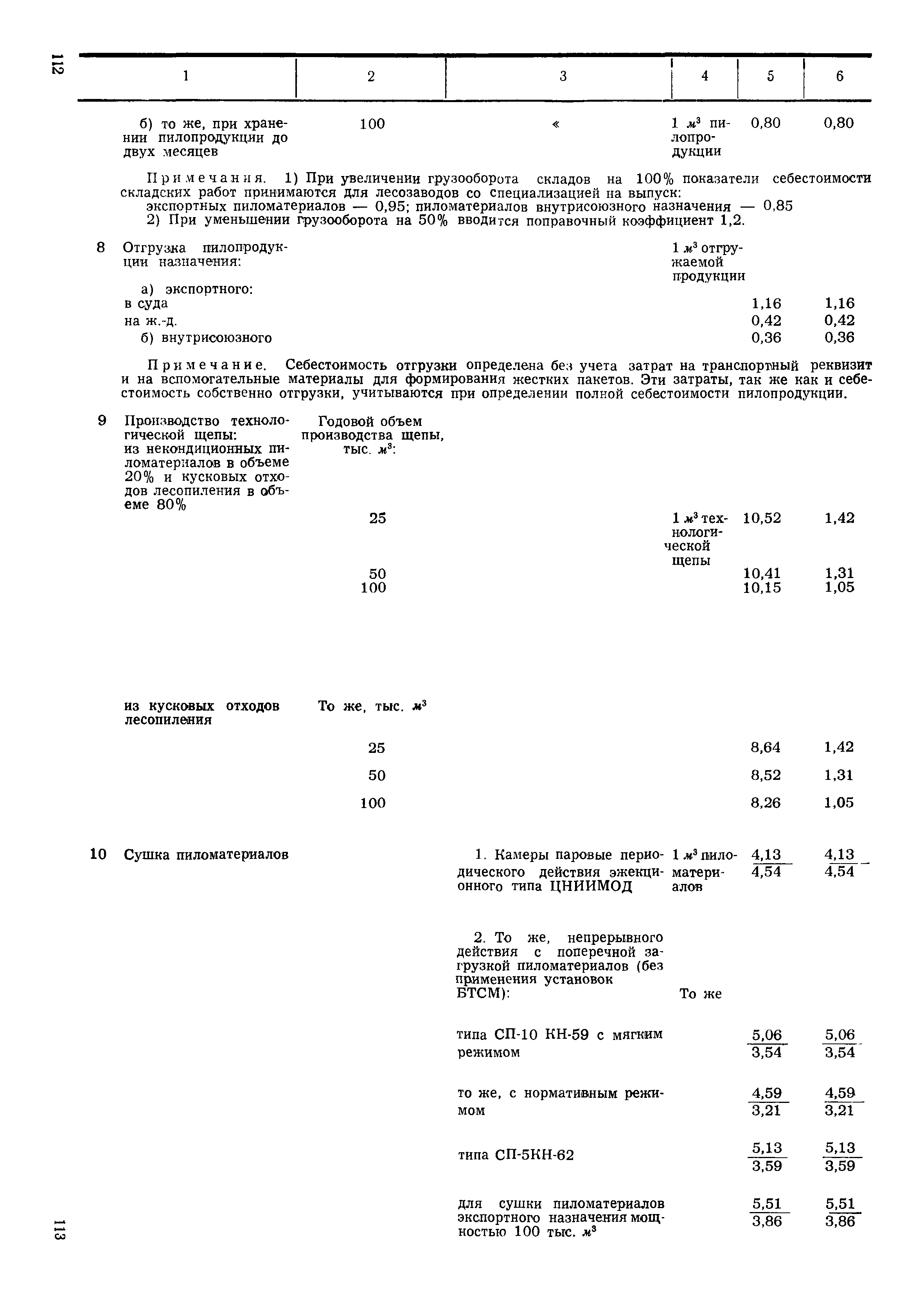 Нормы технологического проектирования, технико-экономические показатели по проектированию лесопильно-деревообрабатывающих предприятий| Статус: | справочные материалы, мп, тпр | | Название рус.: | Нормы технологического проектирования, технико-экономические показатели по проектированию лесопильно-деревообрабатывающих предприятий | | Дата добавления в базу: | 01.01.2021 | | Дата актуализации: | 01.01.2021 | | Область применения: | Приведенные в сборнике нормы предназначаются для использования при разработке технологической части проектов лесопильно-деревообрабатывающих предприятий и содержат данные о потребных площадях складов и производственных цехов, производительности и потребном количестве оборудования и трудовых затрат, расходах сырья, материалов, электроэнергии, тепла и т.п. | | Оглавление: | Нормы технологического проектирования Общая часть I. Склады хвойного пиловочника 1. Площадь склада, потребная для размещения 1000 м3 пиловочника 2. Потребное количество машиносмеси, трудозатрат й силовой электроэнергии на выгрузке, штабелевке, транспортировке и сортировке 1000 м3 бревен 3. Штат вспомогательных рабочих, ИГР, служащих и МОП II. Отепленные бассейны при окорочных и лесопильных цехах III. Окорочные цехи для пиловочных бревен хвойных пород IV. Лесопильные цехи с сортировочными площадками 1. Лесопильные цехи с двухэтажными рамами типа ДР и круглопильными станками для распиловки бревен 2. Лесопильные цехи с лесопильными рамами типа 2Р 3. Лесопильные цехи с одноэтажными рамами типа Р-63 и Р-ВО V. Склады пиломатериалов и отгрузка 1. Открытое хранение хвойных пиломатериалов . . 2. Механизированная подготовка пиломатериалов к погрузке 3. Погрузка пиломатериалов 4. Штат обслуживающего персонала на открытом складе пиломатериалов и погрузке VI. Транспортирование пиломатериалов VII. Сушильные камеры для пиломатериалов Приложение. Перечень районов (областей) по температурным зонам Технико-экономические показатели I. Общая часть II. Показатели удельных капитальных вложений по отдельным цехам и хозяйствам лесопильно-деревообрабатывающих предприятий А. Объекты основного производственного назначения лесопильно-деревообрабатывающих предприятий Б. Объекты подсобно-производственного и обслуживающего назначения и прочие затраты по промышленной площадке В. Комплексные удельные капиталовложения в целом по лесопильно-деревообрабатывающим предприятиям III. Показатели себестоимости отдельных видов работ и готовой продукция лесопильно-деревообрабатывающих предприятий Приложение 1. Порайонные поправочные коэффициенты для пересчета показателей удельных капитальных вложений Приложение 2. Поправочные коэффициенты к стоимости строительно-монтажных работ по климатическим районам Приложение 3. Удельные нормы расхода сырья, материалов, энергии, трудозатрат и пр., принятые в ТЭП при расчетах показателей себестоимости продукции лесопильно-деревообрабатывающих предприятий Приложение 4. Расчетные цены и нормы начислений, принятые при определении показателей себестоимости продукции по ТЭП | | Разработан: | Государственный проектный институт Гипродрев