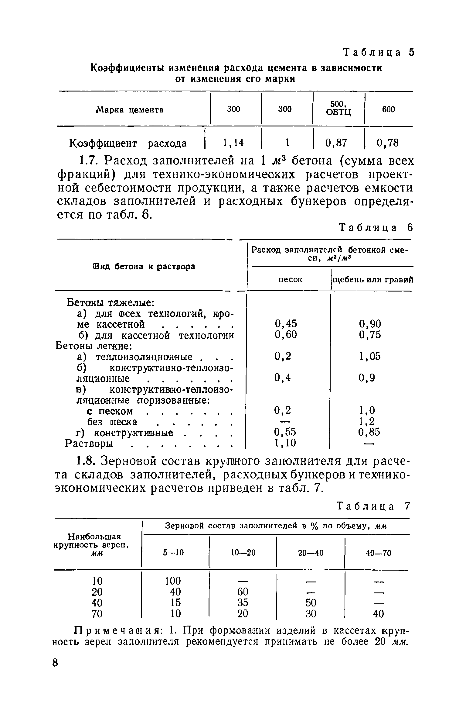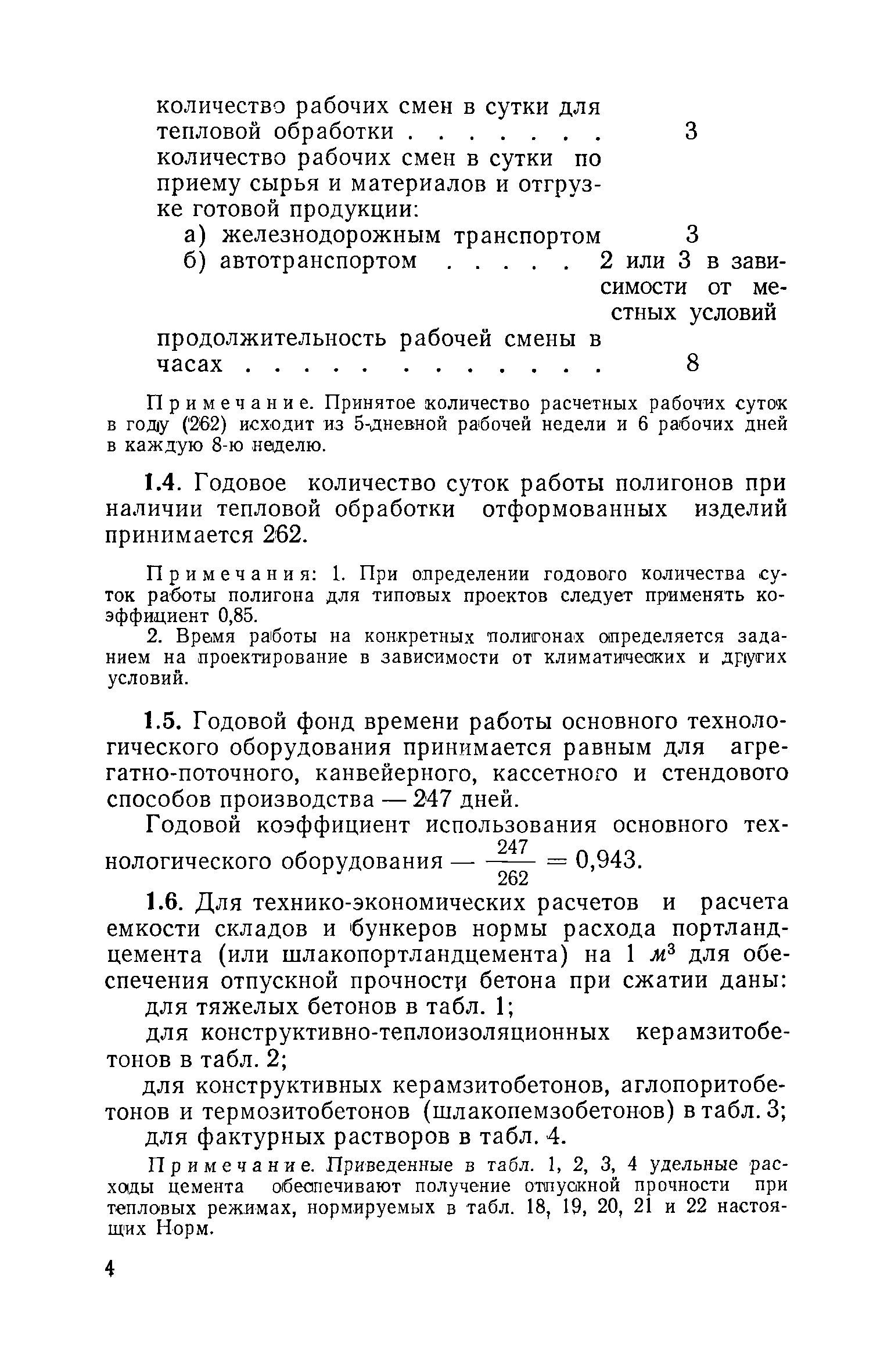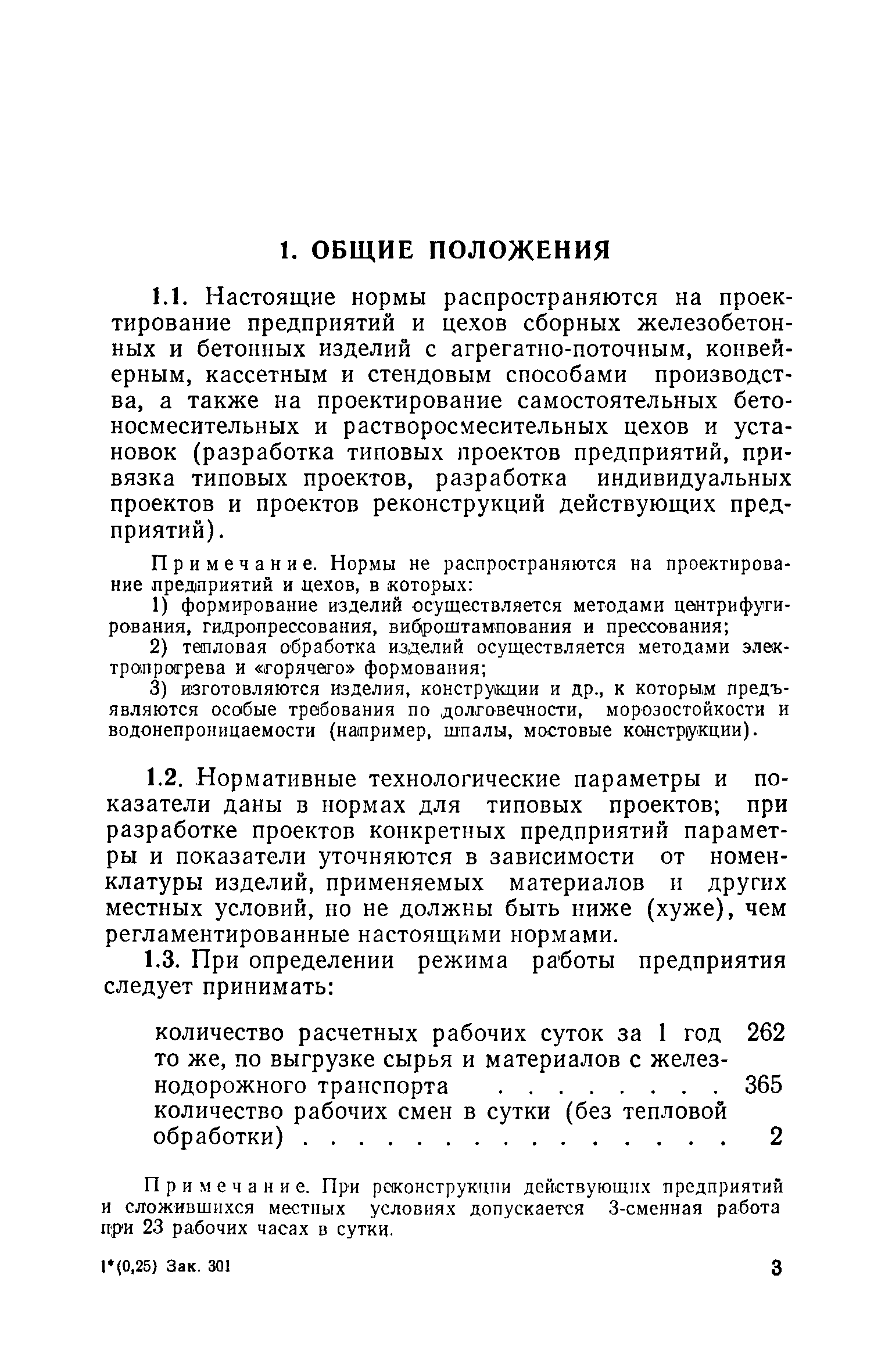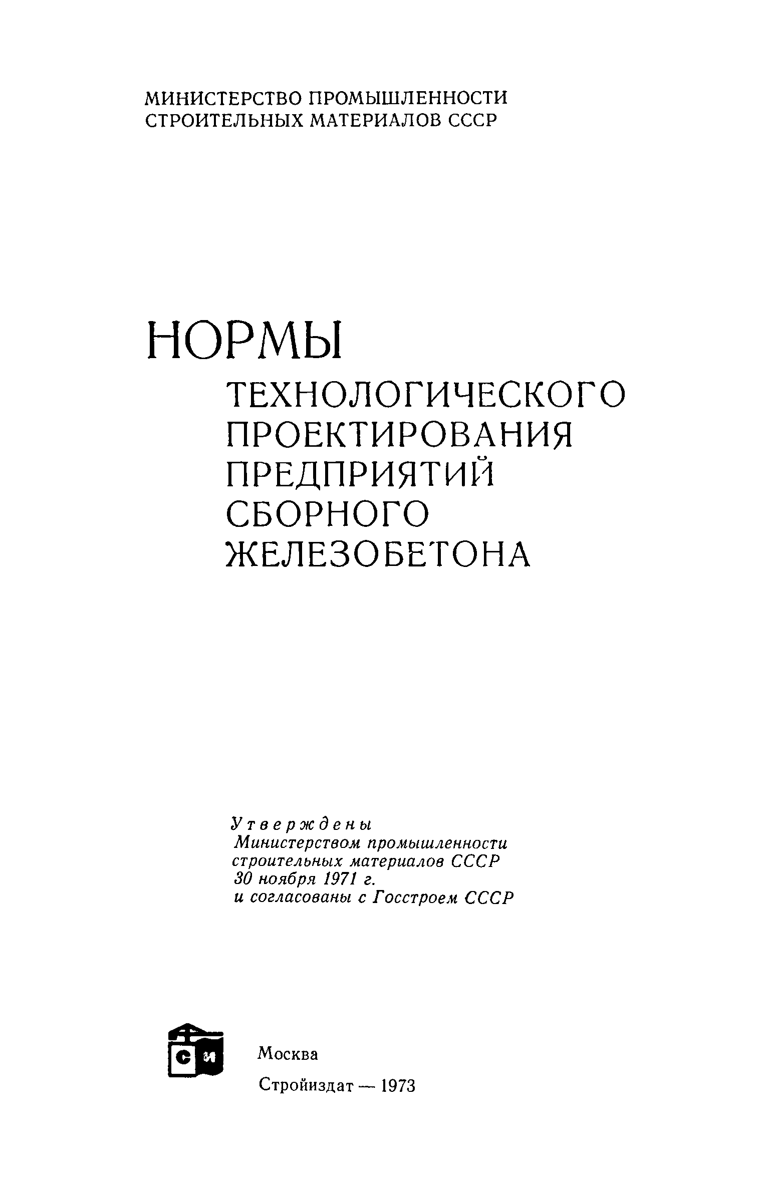 Нормы технологического проектирования предприятий сборного железобетона| Статус: | справочные материалы, мп, тпр | | Название рус.: | Нормы технологического проектирования предприятий сборного железобетона | | Дата добавления в базу: | 01.01.2021 | | Дата актуализации: | 01.01.2021 | | Область применения: | Нормы являются обязательными для всех организаций, осуществляющих разработку типовых или индивидуальных проектов, а также привязку проектов предприятий сборных железобетонных изделий и разработку проектов реконструкций действующих заводов. Приведенные в нормах показатели не предназначены для подбора бетонных смесей на предприятиях, а также для установления предприятиям планируемых норм расхода материалов.Нормы распространяются на проектирование предприятий и цехов сборных железобетонных и бетонных изделий с агрегатно-поточным, конвейерным, кассетным и стендовым способами производства, а также на проектирование самостоятельных бетоносмесительных и растворосмесительных цехов и установок (разработка типовых проектов предприятий, привязка типовых проектов, разработка индивидуальных проектов и проектов реконструкций действующих предприятий). Нормы не распространяются на проектирование предприятий и цехов, в которых: 1) формирование изделий осуществляется методами центрифугирования, гидропрессования, виброштампования и прессования; 2) тепловая обработка изделий осуществляется методами электрепрогрева и «горячего» формования; 3) изготовляются изделия, конструкции и др., к которым предъявляются особые требования по долговечности, морозостойкости и водонепроницаемости (например, шпалы, мостовые конструкции). | | Оглавление: | 1. Общие положения 2. Склады заполнителей 3. Склады цемента 4. Склады арматуры, арматурные цехи и отделения 5. Бетоносмесительные и растворосмесительные цехи (отделения, установки) 6. Формовочные цехи 7. Тепловая обработка бетонных и железобетонных изделий 8. Склады готовой продукции . 9. Нормы расчета крановых операций | | Утверждён: | 30.11.1971 Министерство промышленности строительных материалов СССР (USSR Ministry of the Building Materials Industry )