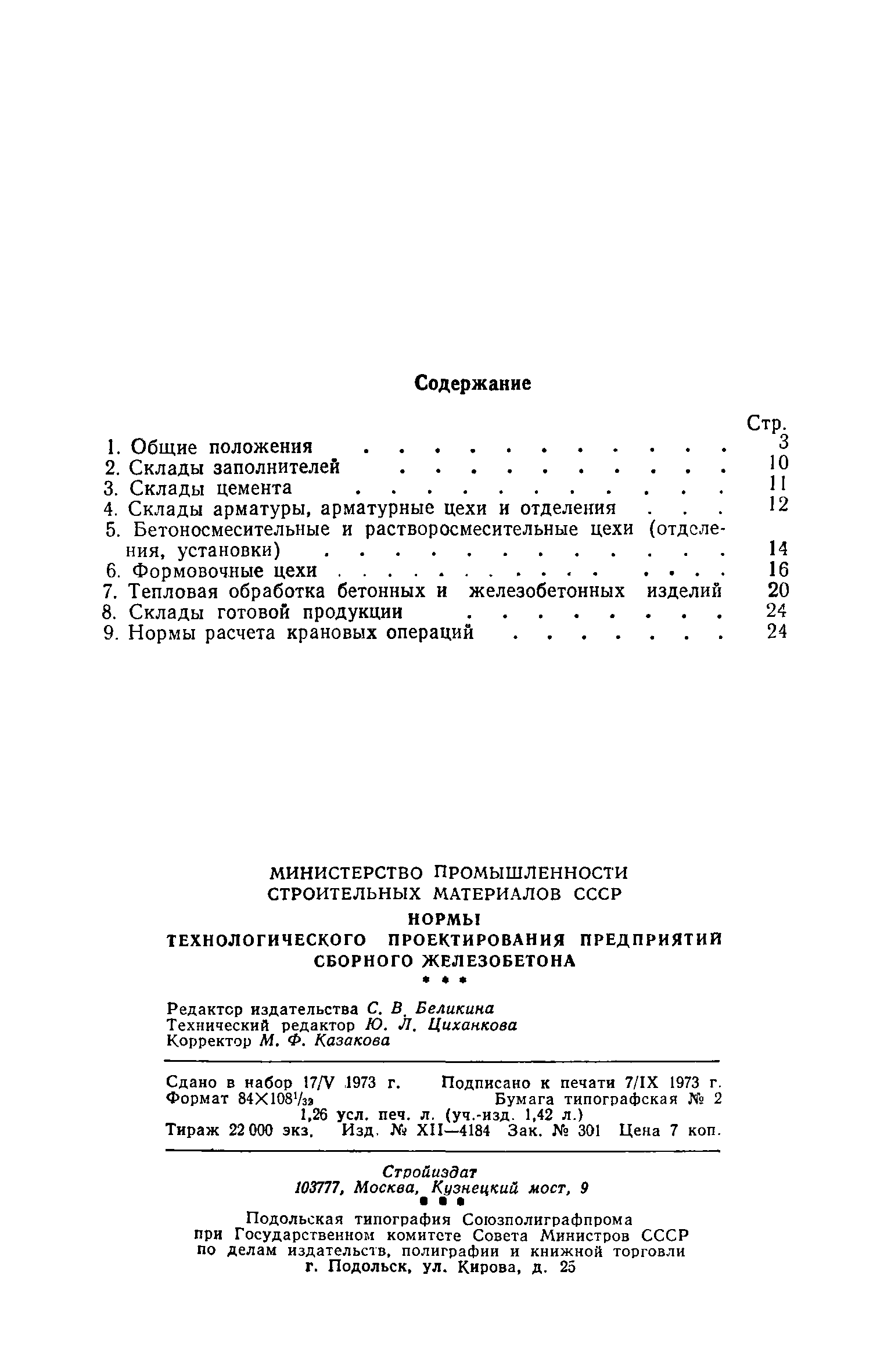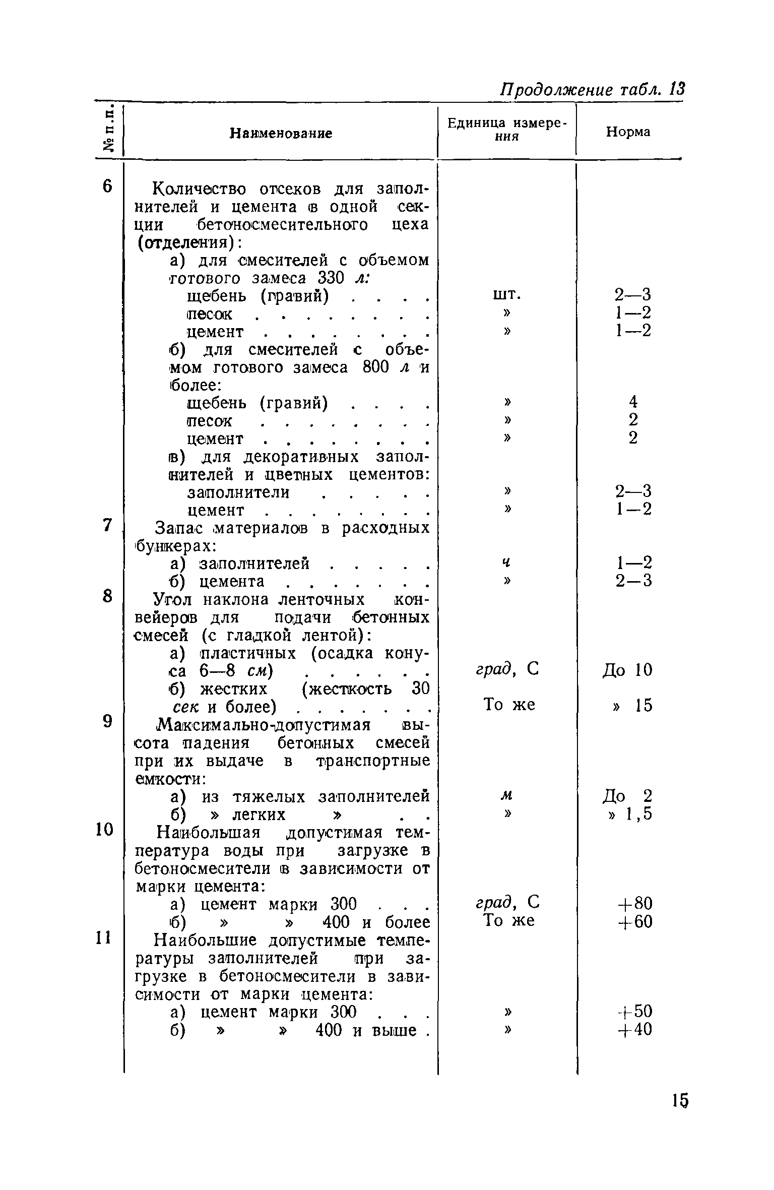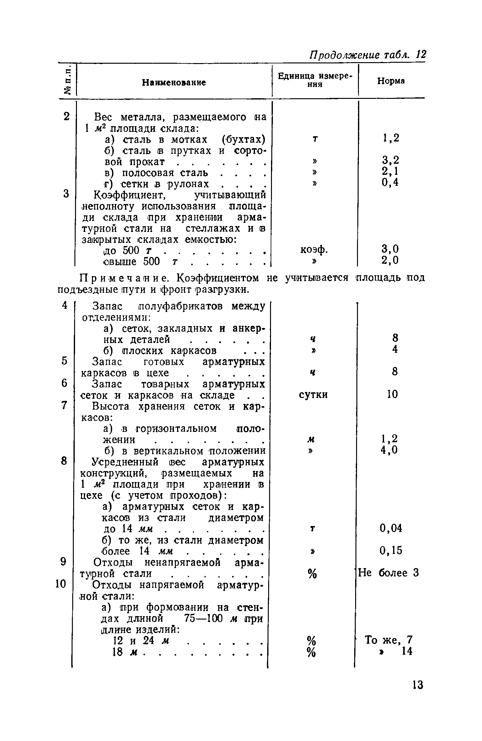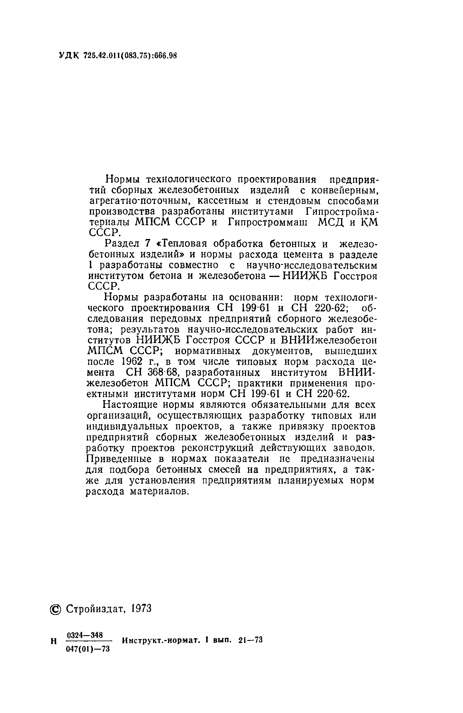 Нормы технологического проектирования предприятий сборного железобетона| Статус: | справочные материалы, мп, тпр | | Название рус.: | Нормы технологического проектирования предприятий сборного железобетона | | Дата добавления в базу: | 01.01.2021 | | Дата актуализации: | 01.01.2021 | | Область применения: | Нормы являются обязательными для всех организаций, осуществляющих разработку типовых или индивидуальных проектов, а также привязку проектов предприятий сборных железобетонных изделий и разработку проектов реконструкций действующих заводов. Приведенные в нормах показатели не предназначены для подбора бетонных смесей на предприятиях, а также для установления предприятиям планируемых норм расхода материалов.Нормы распространяются на проектирование предприятий и цехов сборных железобетонных и бетонных изделий с агрегатно-поточным, конвейерным, кассетным и стендовым способами производства, а также на проектирование самостоятельных бетоносмесительных и растворосмесительных цехов и установок (разработка типовых проектов предприятий, привязка типовых проектов, разработка индивидуальных проектов и проектов реконструкций действующих предприятий). Нормы не распространяются на проектирование предприятий и цехов, в которых: 1) формирование изделий осуществляется методами центрифугирования, гидропрессования, виброштампования и прессования; 2) тепловая обработка изделий осуществляется методами электрепрогрева и «горячего» формования; 3) изготовляются изделия, конструкции и др., к которым предъявляются особые требования по долговечности, морозостойкости и водонепроницаемости (например, шпалы, мостовые конструкции). | | Оглавление: | 1. Общие положения 2. Склады заполнителей 3. Склады цемента 4. Склады арматуры, арматурные цехи и отделения 5. Бетоносмесительные и растворосмесительные цехи (отделения, установки) 6. Формовочные цехи 7. Тепловая обработка бетонных и железобетонных изделий 8. Склады готовой продукции . 9. Нормы расчета крановых операций | | Утверждён: | 30.11.1971 Министерство промышленности строительных материалов СССР (USSR Ministry of the Building Materials Industry )