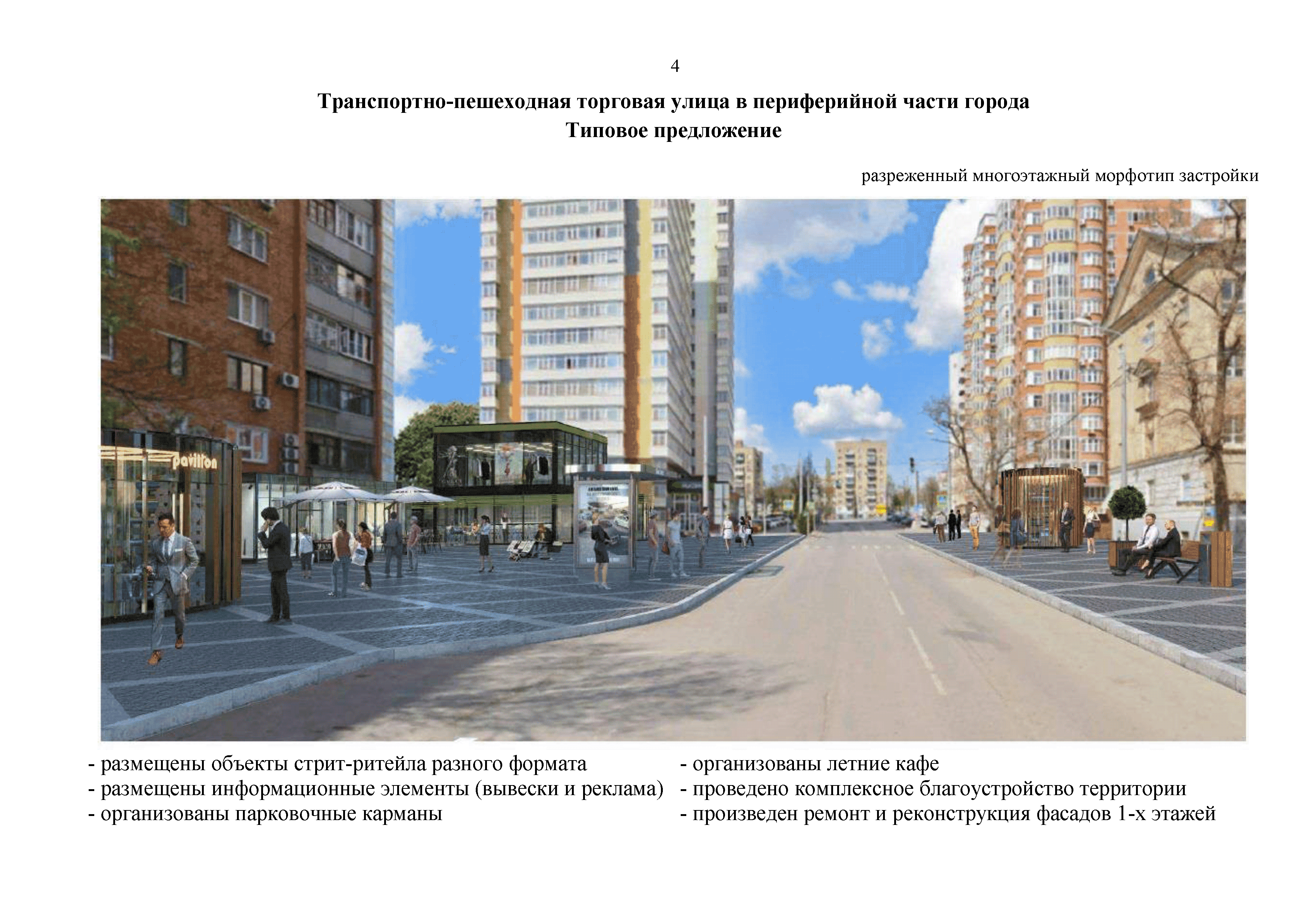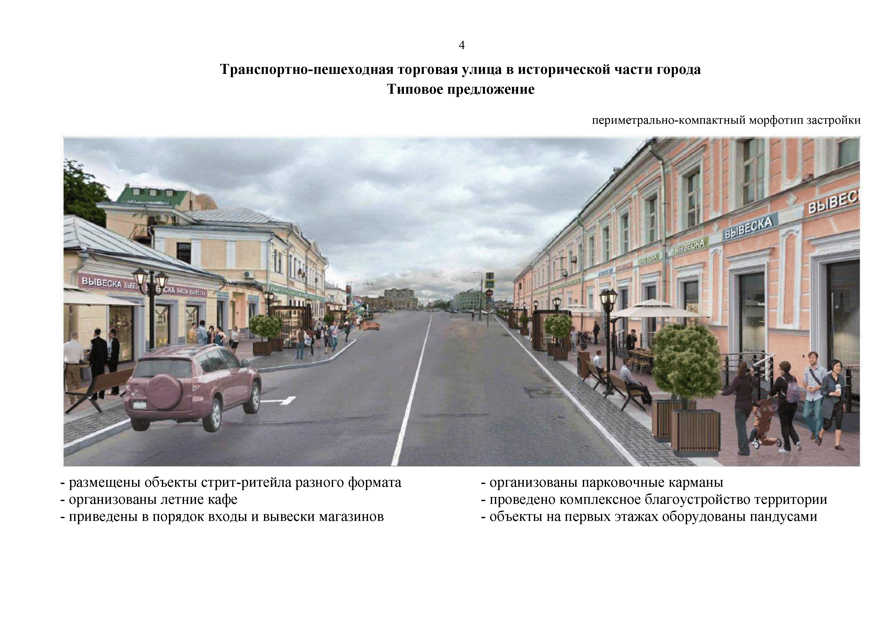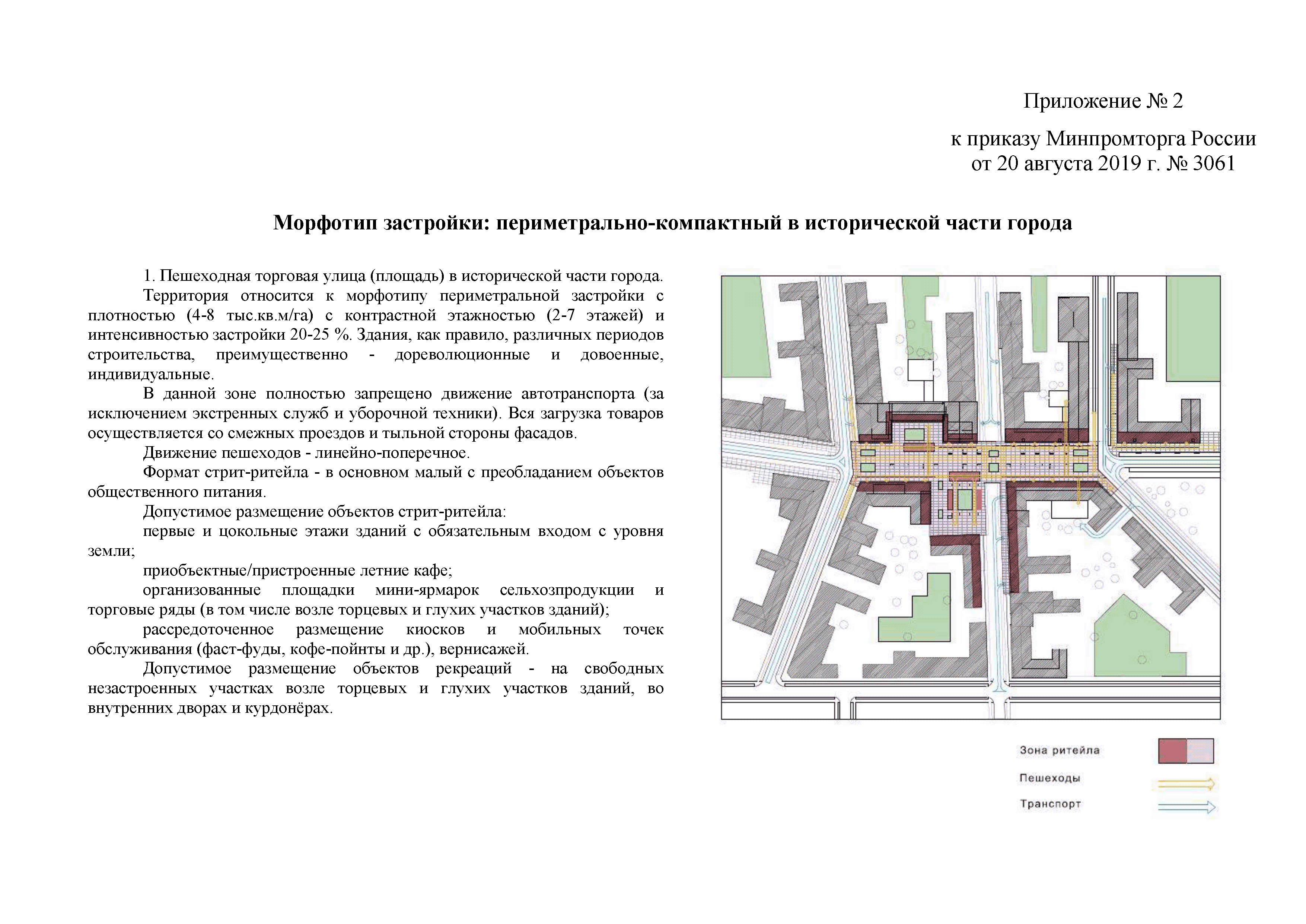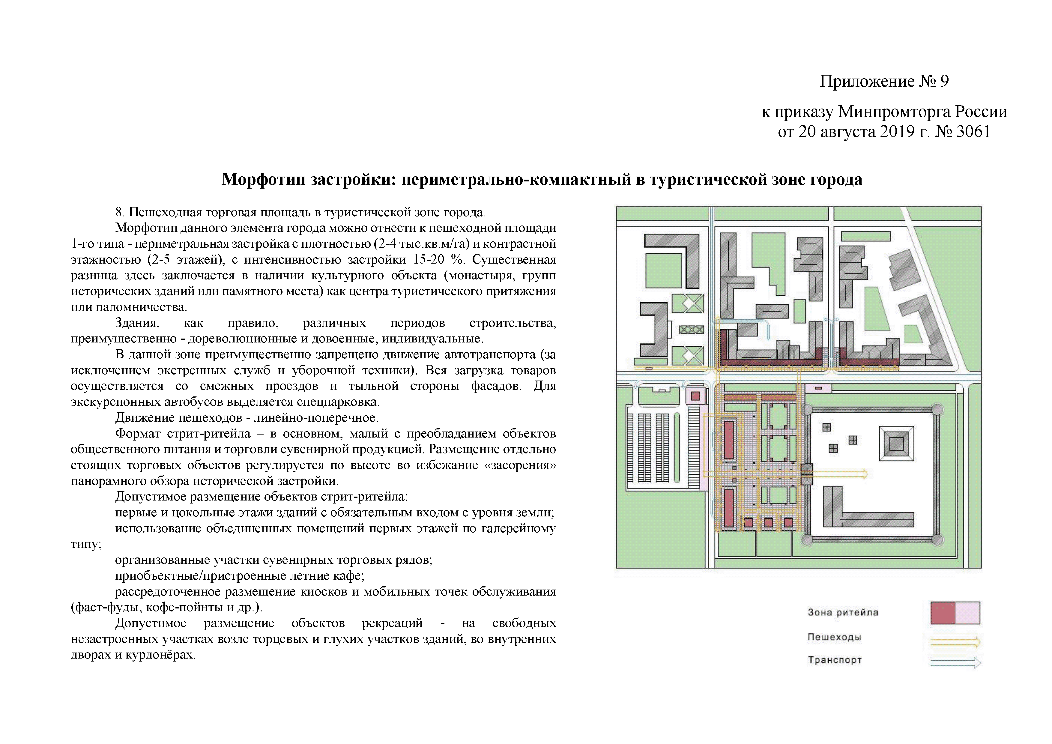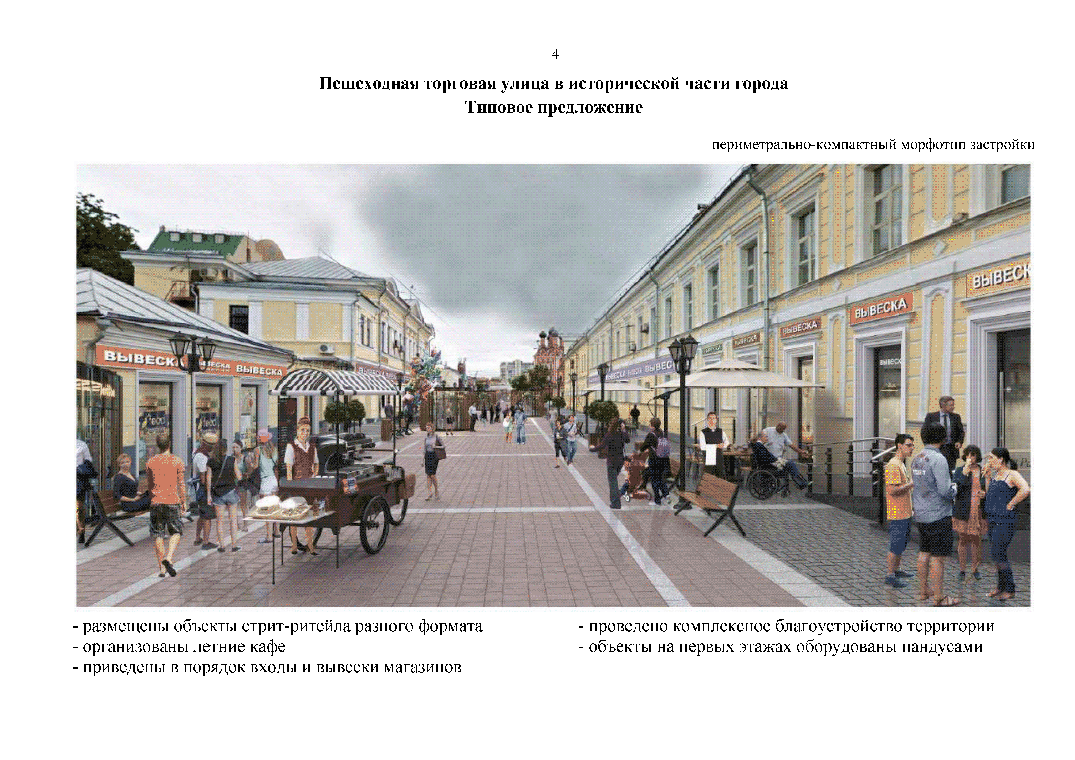 | Оглавление: | I. Общие положения II. Рекомендации при проведении анализа потенциала пространственной организации стрит-ритейла III. Рекомендуемые модели организации стрит-ритейла на общественных пространствах (торговых улицах) Приложение № 1. Группы городов по численности населения. Размещение объектов ритейла в городской застройке Приложение № 2. Рекомендуемый образец организации пешеходной торговой улицы в исторической части города при периметрально-компактном морфотипе застройки Приложение № 3. Рекомендуемый образец организации транспортно-пешеходной торговой улицы в исторической части города при периметрально-компактном морфотипе застройки Приложение № 4. Рекомендуемый образец организации транспортно-пешеходной торговой улицы в срединной части города при разреженном среднеэтажном морфотипе застройки Приложение № 5. Рекомендуемый образец организации транспортно-пешеходной торговой площади в срединной части города при разреженном среднеэтажном морфотипе застройки Приложение № 6. Рекомендуемый образец организации транспортно-пешеходной торговой улицы в периферийной части города при разреженном многоэтажном морфотипе застройки Приложение № 7. Рекомендуемый образец организации транспортно-пешеходной торговой площади в периферийный части города при разреженном многоэтажном морфотипе застройки Приложение № 8. Рекомендуемый образец организации транспортно-пешеходной торговой улицы в курортной зоне города при смешанном среднеэтажном морфотипе застройки Приложение № 9. Рекомендуемый образец организации пешеходной торговой площади в туристической зоне города при периметрально-компактном морфотипе застройки Приложение № 10. Рекомендуемый образец организации регулярной ярмарки для малых городов при разреженном разноэтажном морфотипе застройки Приложение № 11. Рекомендуемый образец организации общественных территорий городской рекреации на незастроенных территориях |