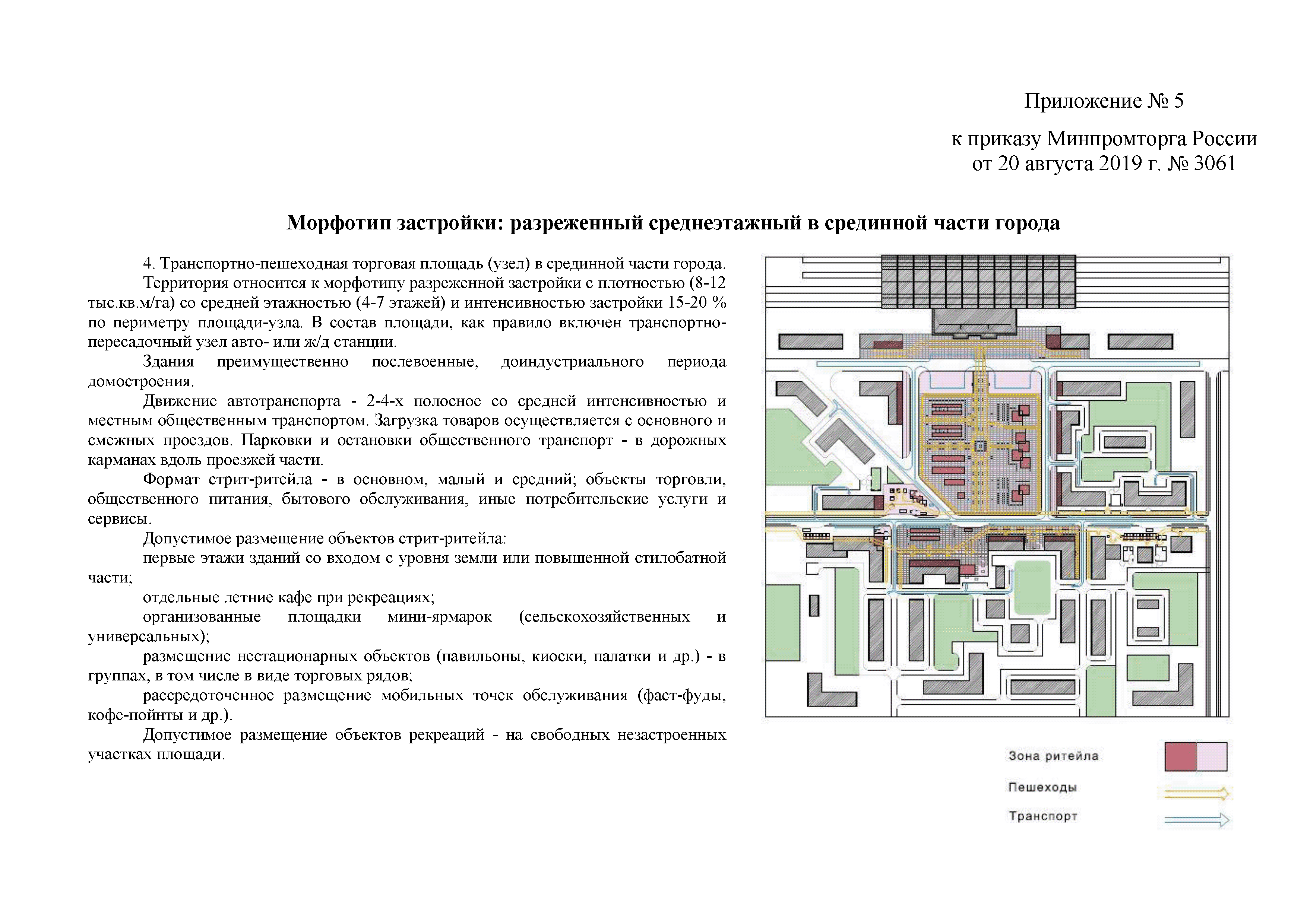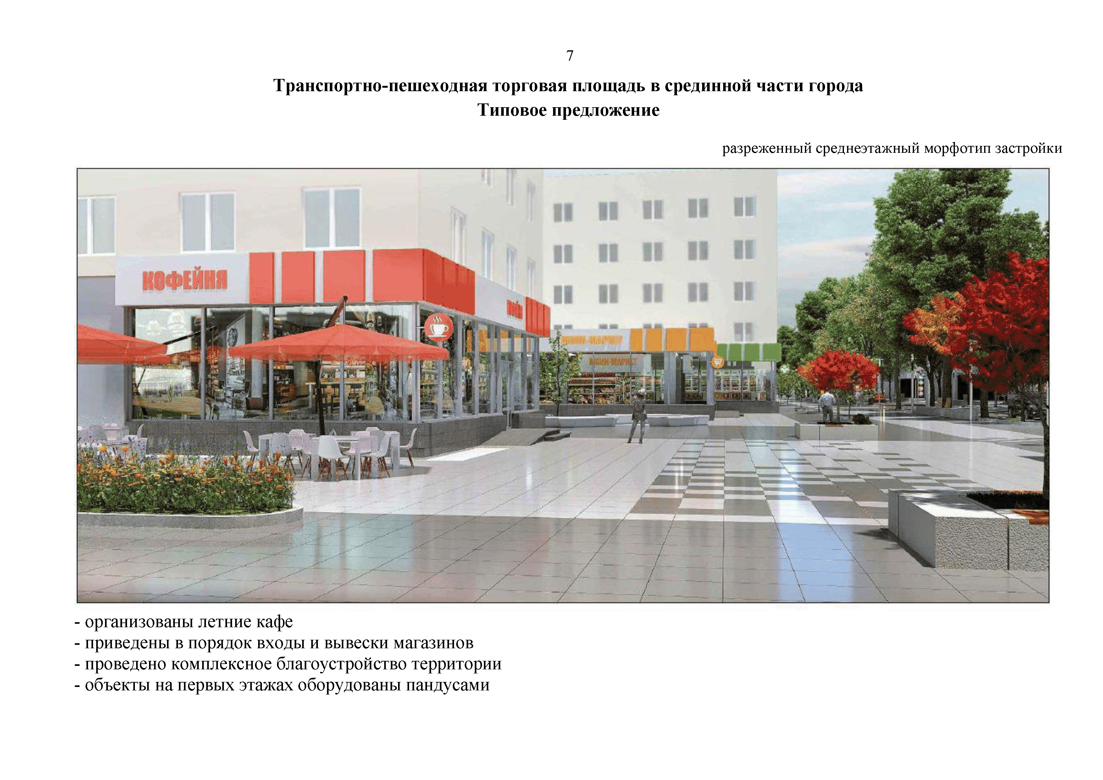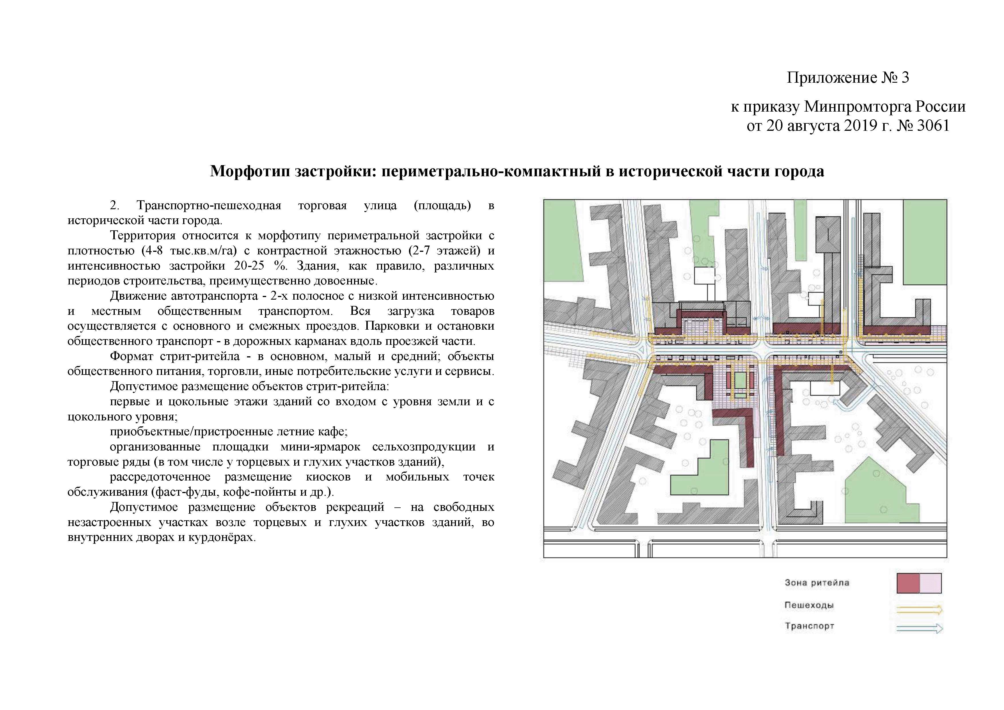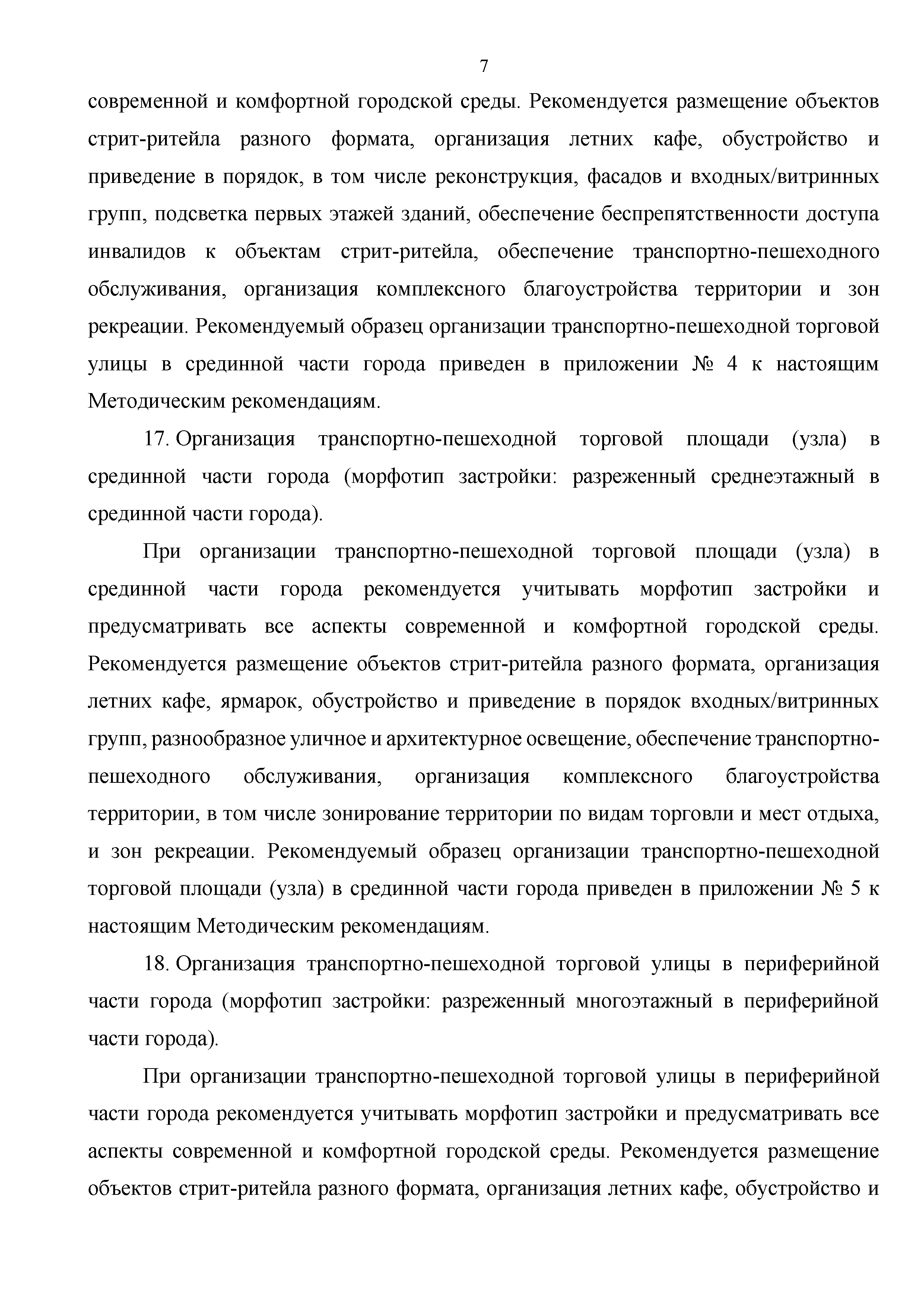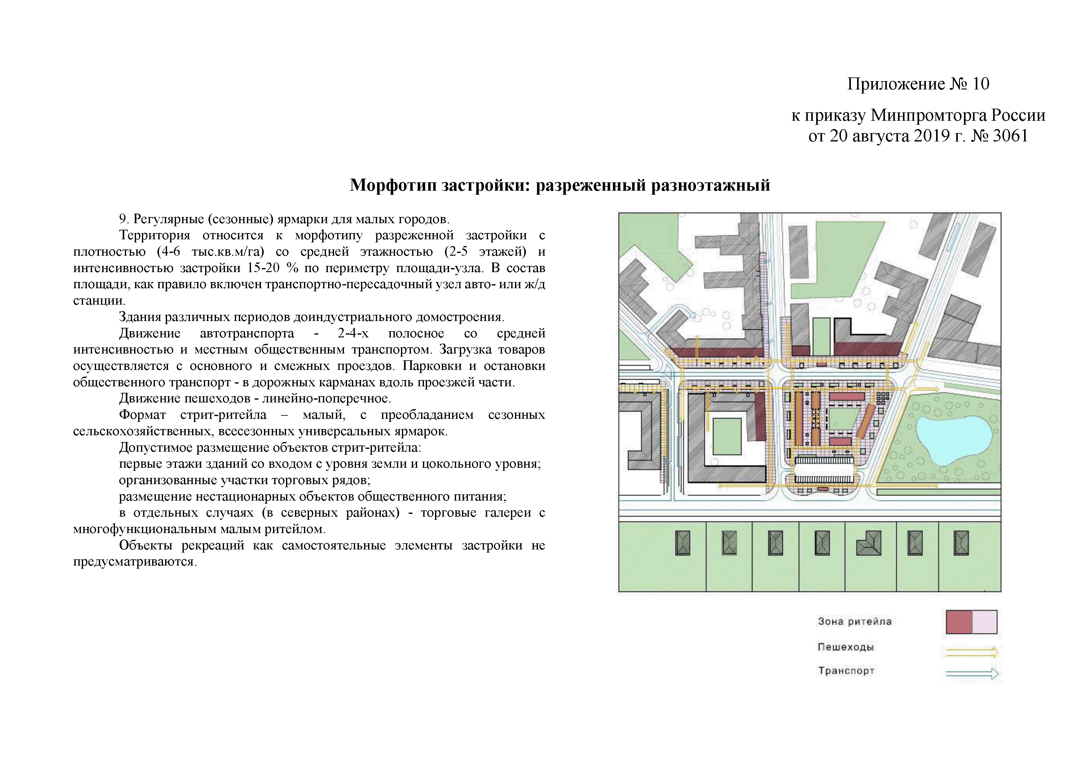 | Оглавление: | I. Общие положения II. Рекомендации при проведении анализа потенциала пространственной организации стрит-ритейла III. Рекомендуемые модели организации стрит-ритейла на общественных пространствах (торговых улицах) Приложение № 1. Группы городов по численности населения. Размещение объектов ритейла в городской застройке Приложение № 2. Рекомендуемый образец организации пешеходной торговой улицы в исторической части города при периметрально-компактном морфотипе застройки Приложение № 3. Рекомендуемый образец организации транспортно-пешеходной торговой улицы в исторической части города при периметрально-компактном морфотипе застройки Приложение № 4. Рекомендуемый образец организации транспортно-пешеходной торговой улицы в срединной части города при разреженном среднеэтажном морфотипе застройки Приложение № 5. Рекомендуемый образец организации транспортно-пешеходной торговой площади в срединной части города при разреженном среднеэтажном морфотипе застройки Приложение № 6. Рекомендуемый образец организации транспортно-пешеходной торговой улицы в периферийной части города при разреженном многоэтажном морфотипе застройки Приложение № 7. Рекомендуемый образец организации транспортно-пешеходной торговой площади в периферийный части города при разреженном многоэтажном морфотипе застройки Приложение № 8. Рекомендуемый образец организации транспортно-пешеходной торговой улицы в курортной зоне города при смешанном среднеэтажном морфотипе застройки Приложение № 9. Рекомендуемый образец организации пешеходной торговой площади в туристической зоне города при периметрально-компактном морфотипе застройки Приложение № 10. Рекомендуемый образец организации регулярной ярмарки для малых городов при разреженном разноэтажном морфотипе застройки Приложение № 11. Рекомендуемый образец организации общественных территорий городской рекреации на незастроенных территориях |