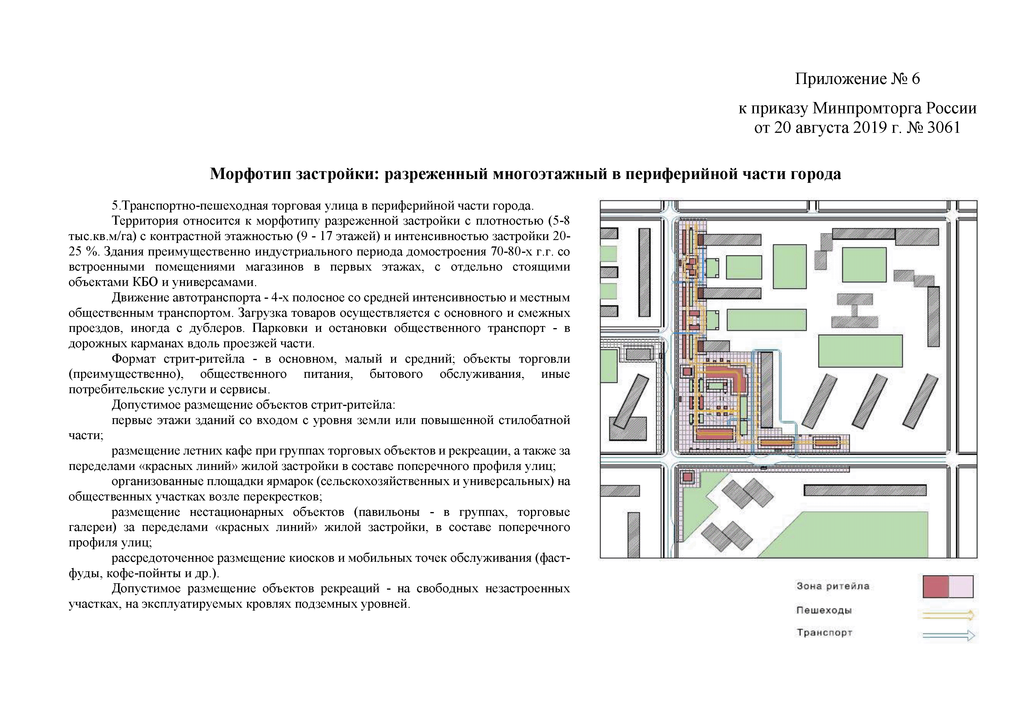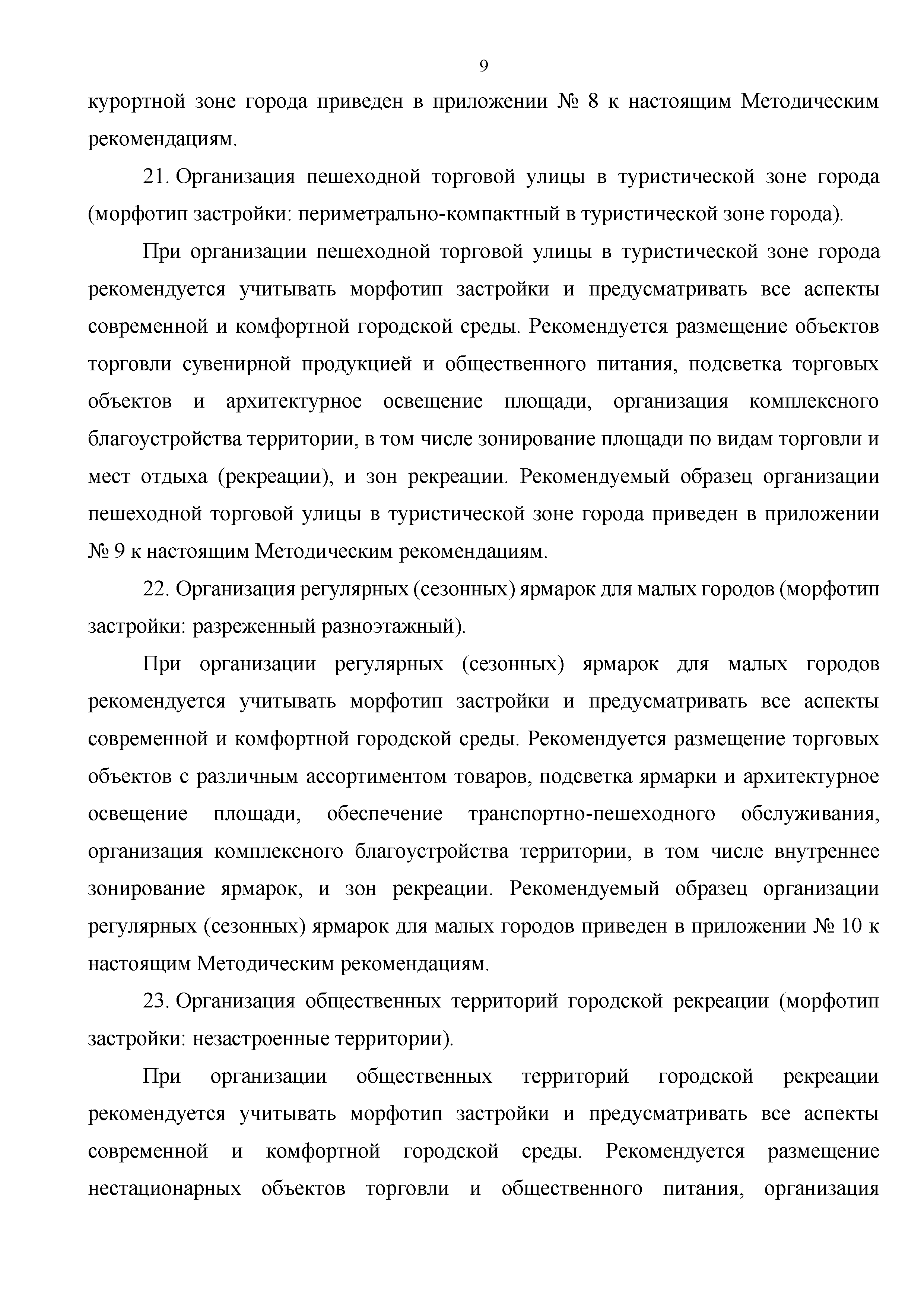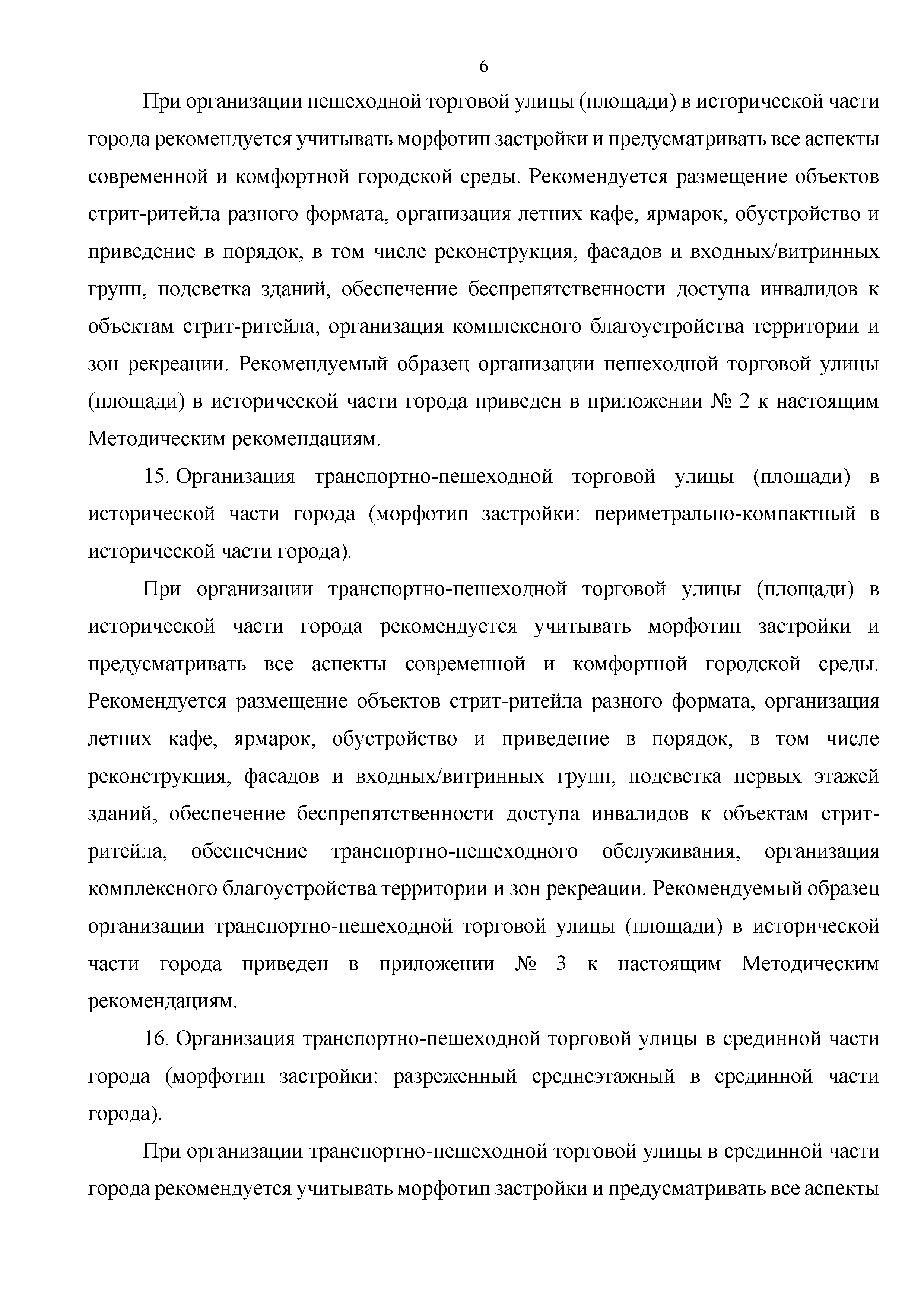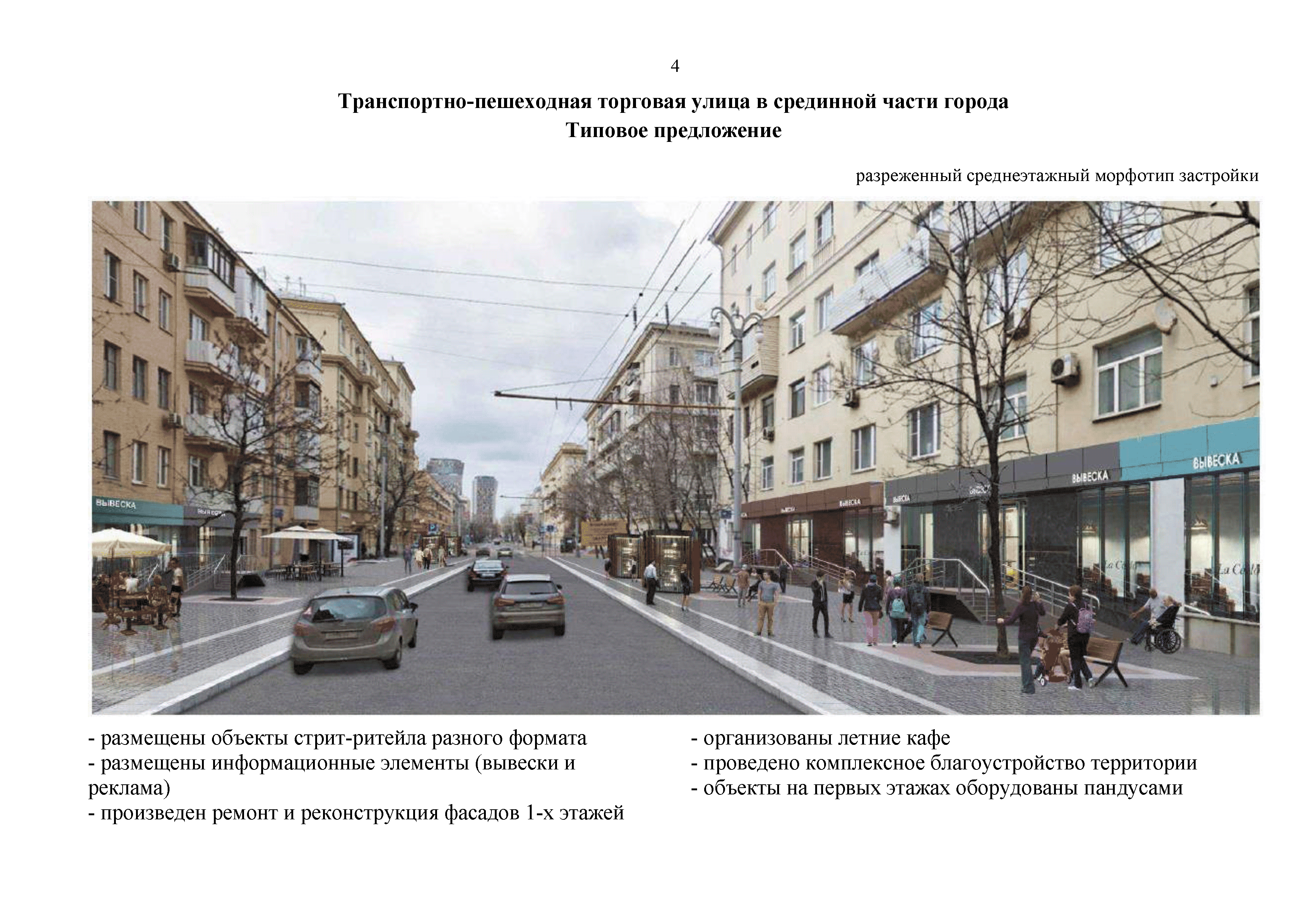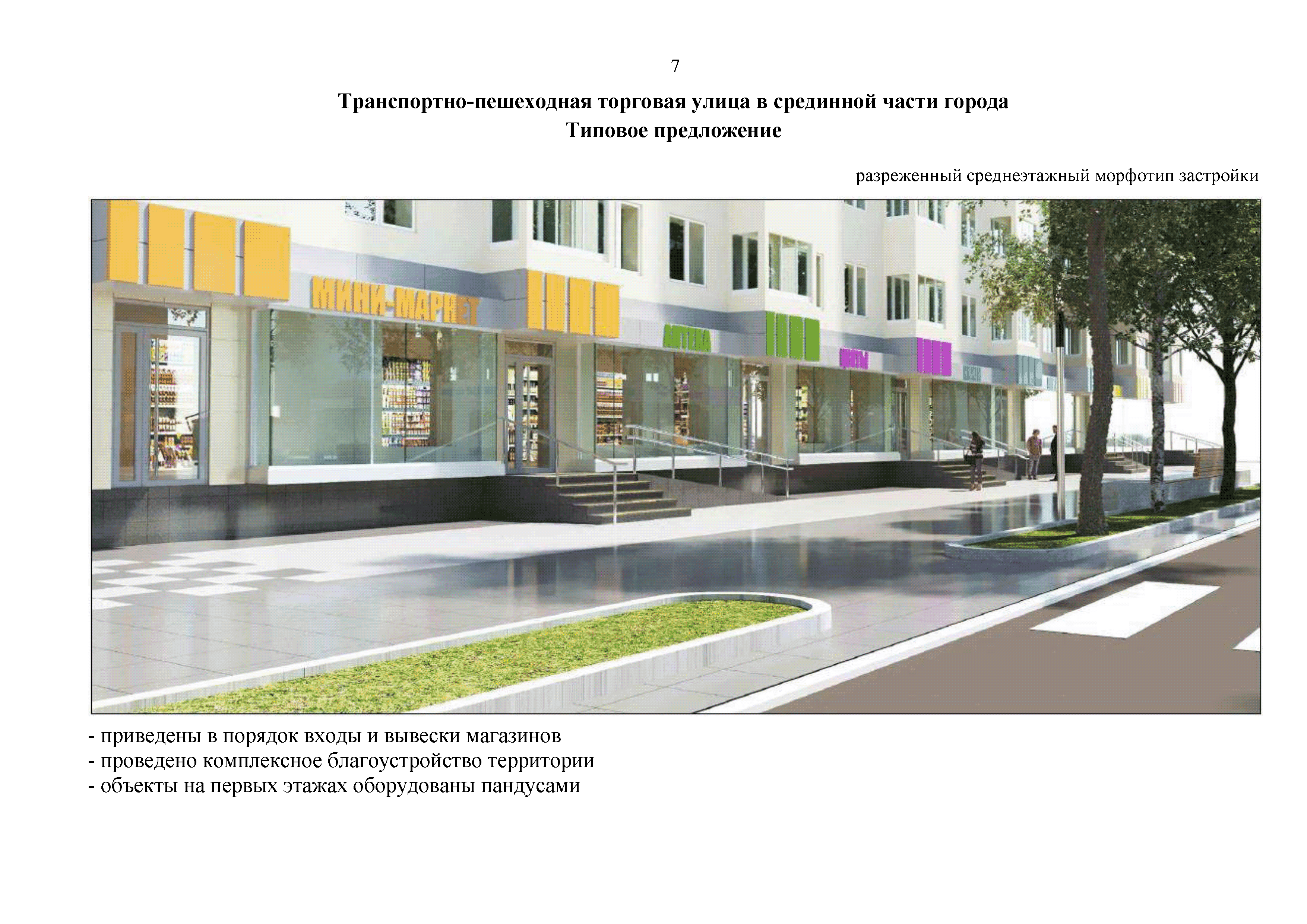 | Оглавление: | I. Общие положения II. Рекомендации при проведении анализа потенциала пространственной организации стрит-ритейла III. Рекомендуемые модели организации стрит-ритейла на общественных пространствах (торговых улицах) Приложение № 1. Группы городов по численности населения. Размещение объектов ритейла в городской застройке Приложение № 2. Рекомендуемый образец организации пешеходной торговой улицы в исторической части города при периметрально-компактном морфотипе застройки Приложение № 3. Рекомендуемый образец организации транспортно-пешеходной торговой улицы в исторической части города при периметрально-компактном морфотипе застройки Приложение № 4. Рекомендуемый образец организации транспортно-пешеходной торговой улицы в срединной части города при разреженном среднеэтажном морфотипе застройки Приложение № 5. Рекомендуемый образец организации транспортно-пешеходной торговой площади в срединной части города при разреженном среднеэтажном морфотипе застройки Приложение № 6. Рекомендуемый образец организации транспортно-пешеходной торговой улицы в периферийной части города при разреженном многоэтажном морфотипе застройки Приложение № 7. Рекомендуемый образец организации транспортно-пешеходной торговой площади в периферийный части города при разреженном многоэтажном морфотипе застройки Приложение № 8. Рекомендуемый образец организации транспортно-пешеходной торговой улицы в курортной зоне города при смешанном среднеэтажном морфотипе застройки Приложение № 9. Рекомендуемый образец организации пешеходной торговой площади в туристической зоне города при периметрально-компактном морфотипе застройки Приложение № 10. Рекомендуемый образец организации регулярной ярмарки для малых городов при разреженном разноэтажном морфотипе застройки Приложение № 11. Рекомендуемый образец организации общественных территорий городской рекреации на незастроенных территориях |