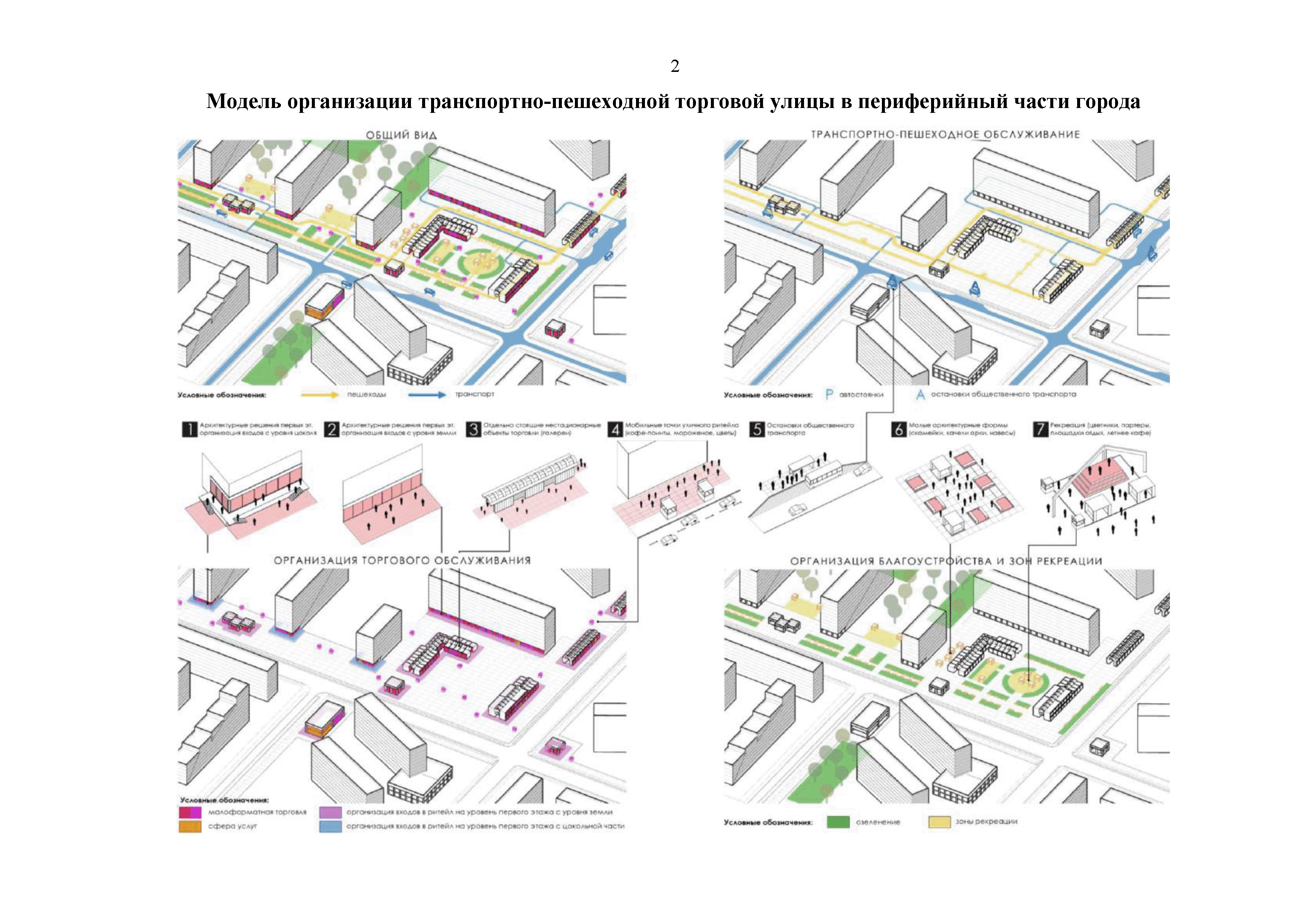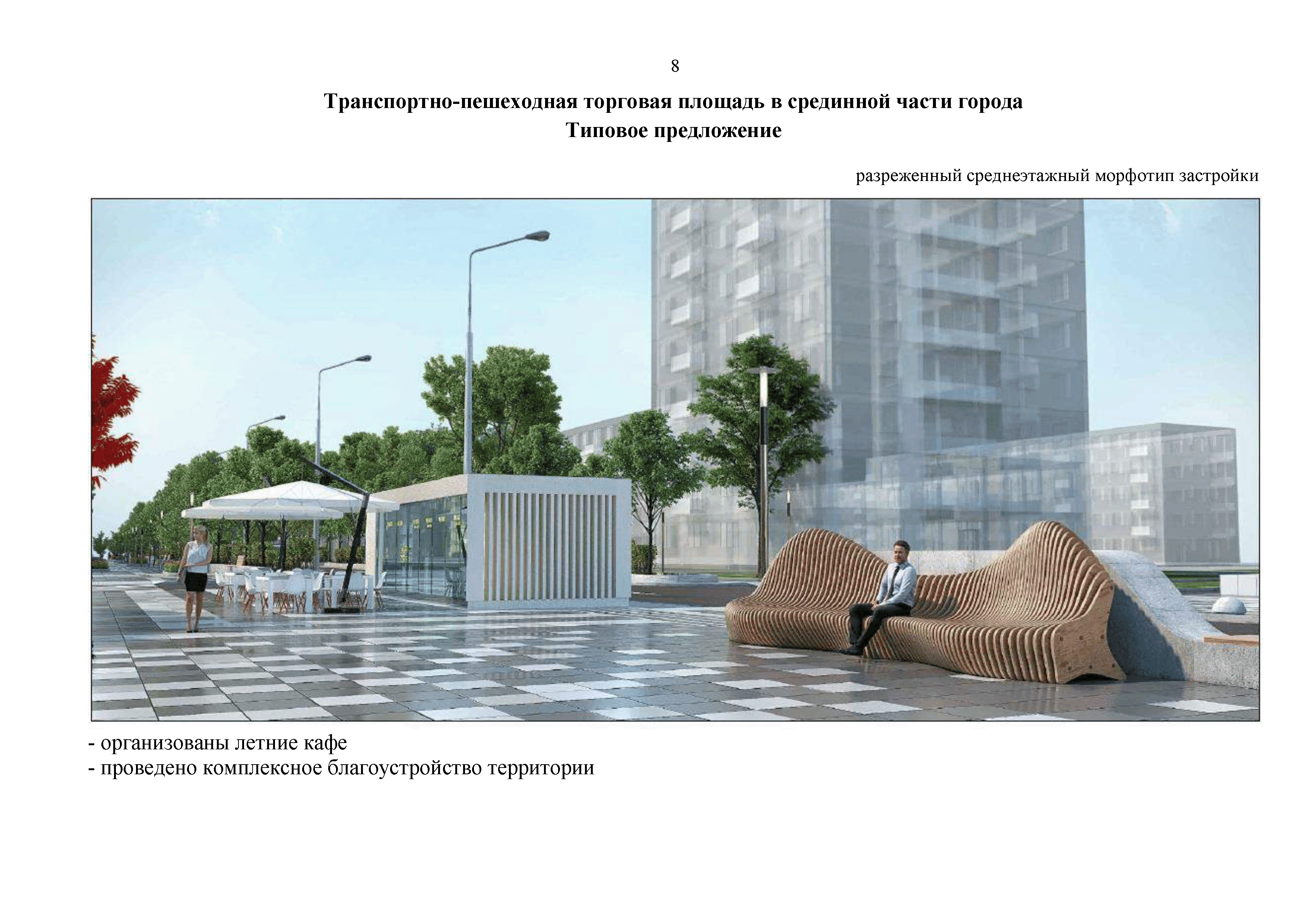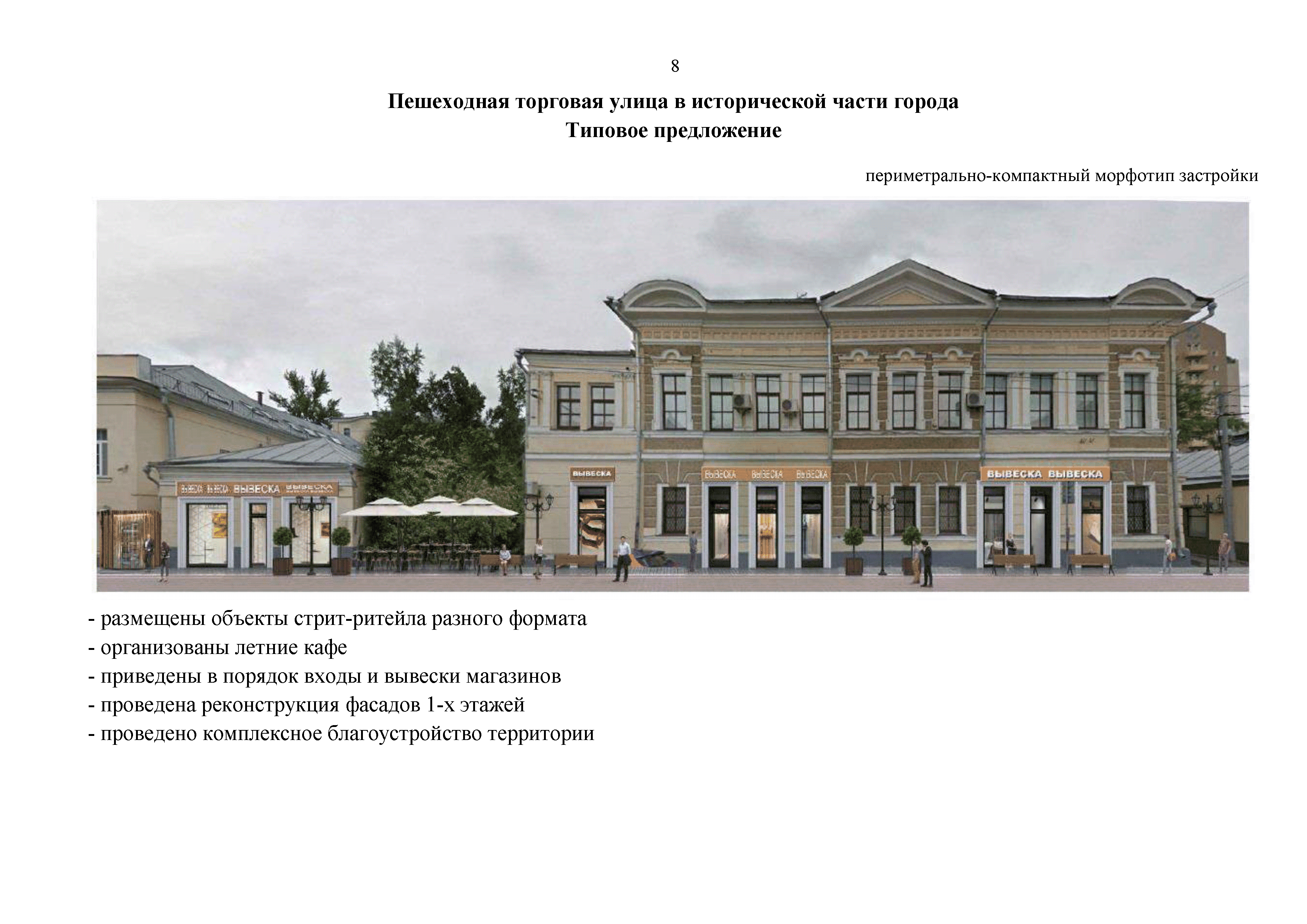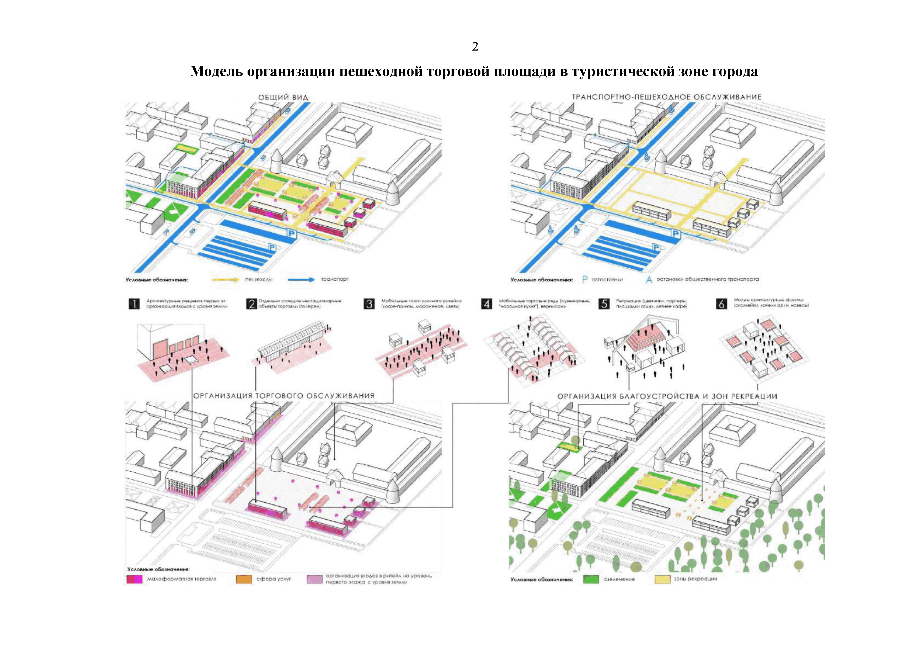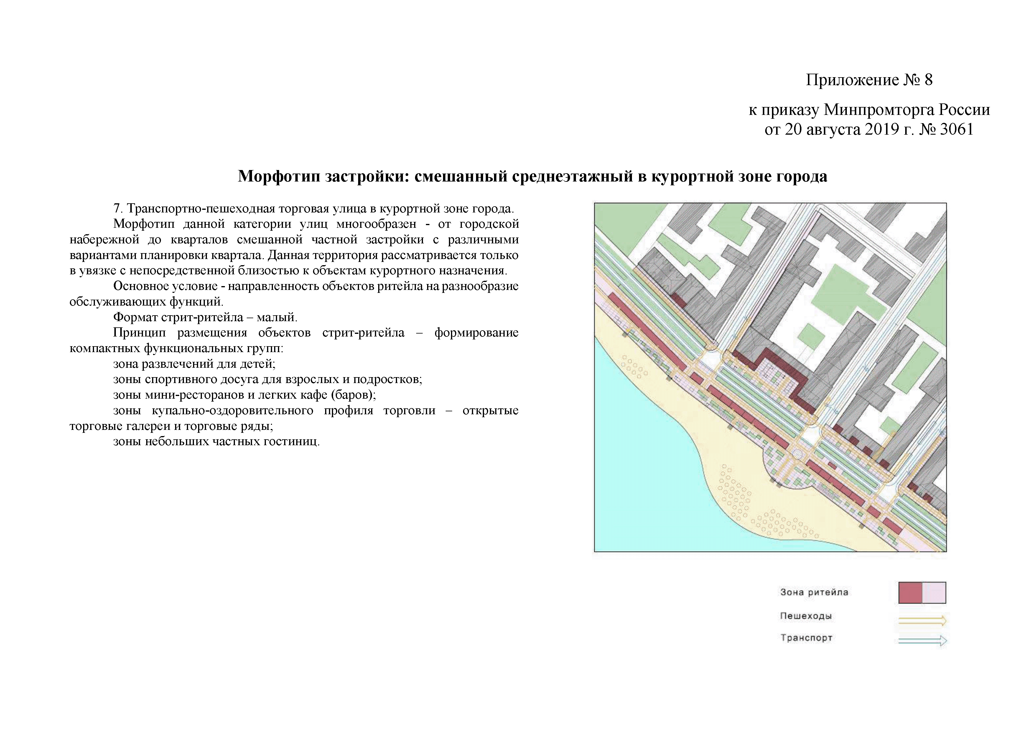 | Оглавление: | I. Общие положения II. Рекомендации при проведении анализа потенциала пространственной организации стрит-ритейла III. Рекомендуемые модели организации стрит-ритейла на общественных пространствах (торговых улицах) Приложение № 1. Группы городов по численности населения. Размещение объектов ритейла в городской застройке Приложение № 2. Рекомендуемый образец организации пешеходной торговой улицы в исторической части города при периметрально-компактном морфотипе застройки Приложение № 3. Рекомендуемый образец организации транспортно-пешеходной торговой улицы в исторической части города при периметрально-компактном морфотипе застройки Приложение № 4. Рекомендуемый образец организации транспортно-пешеходной торговой улицы в срединной части города при разреженном среднеэтажном морфотипе застройки Приложение № 5. Рекомендуемый образец организации транспортно-пешеходной торговой площади в срединной части города при разреженном среднеэтажном морфотипе застройки Приложение № 6. Рекомендуемый образец организации транспортно-пешеходной торговой улицы в периферийной части города при разреженном многоэтажном морфотипе застройки Приложение № 7. Рекомендуемый образец организации транспортно-пешеходной торговой площади в периферийный части города при разреженном многоэтажном морфотипе застройки Приложение № 8. Рекомендуемый образец организации транспортно-пешеходной торговой улицы в курортной зоне города при смешанном среднеэтажном морфотипе застройки Приложение № 9. Рекомендуемый образец организации пешеходной торговой площади в туристической зоне города при периметрально-компактном морфотипе застройки Приложение № 10. Рекомендуемый образец организации регулярной ярмарки для малых городов при разреженном разноэтажном морфотипе застройки Приложение № 11. Рекомендуемый образец организации общественных территорий городской рекреации на незастроенных территориях |