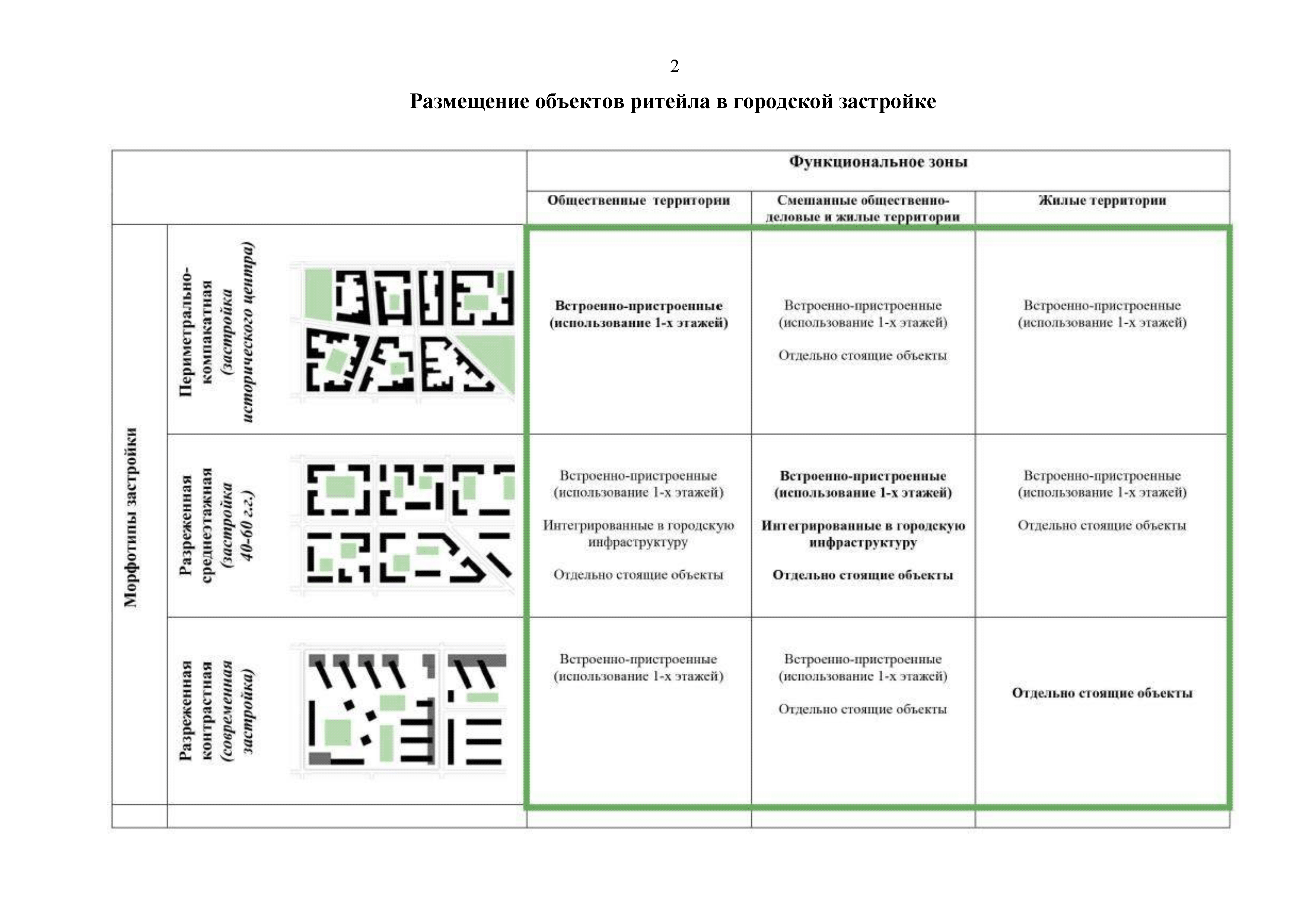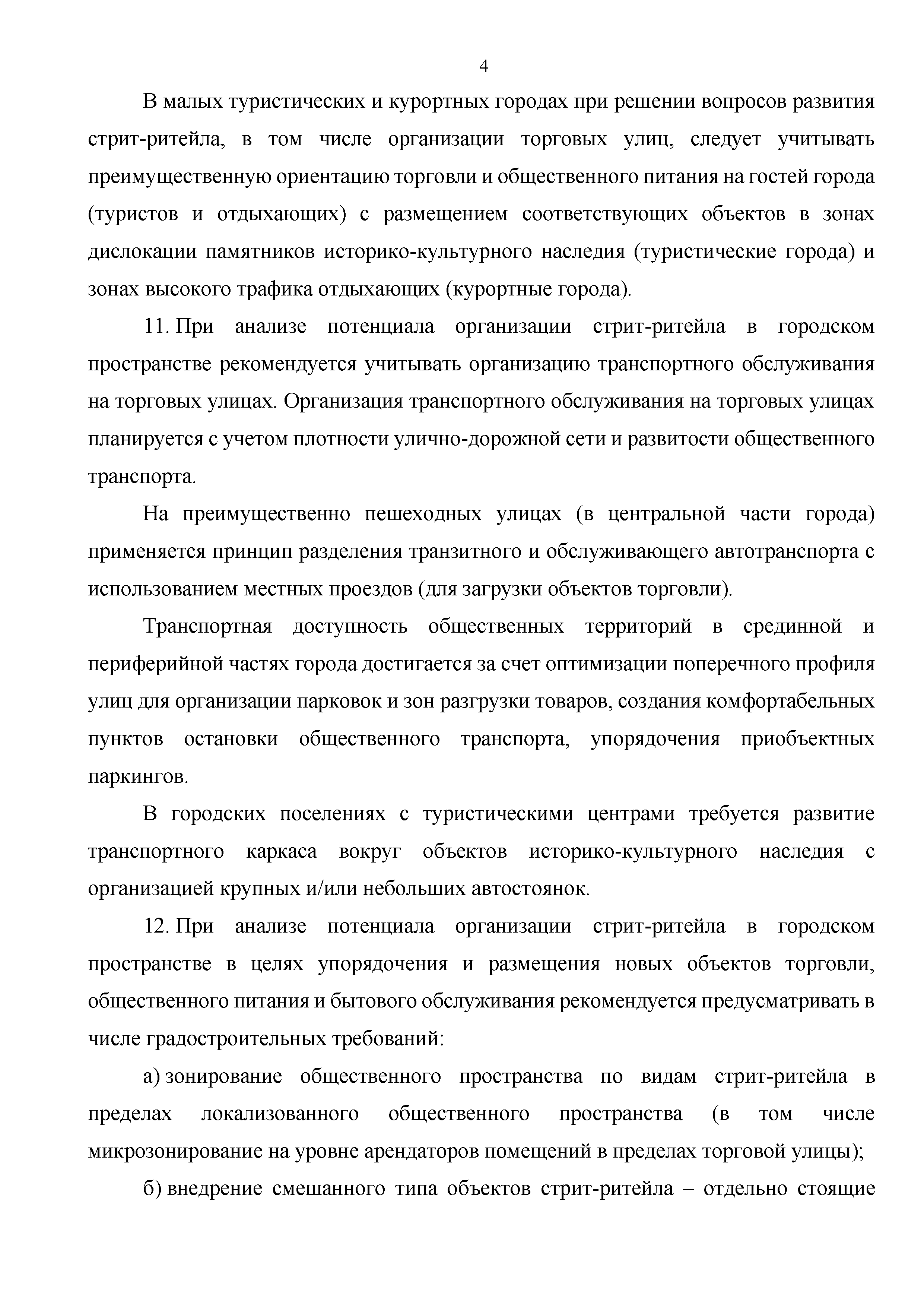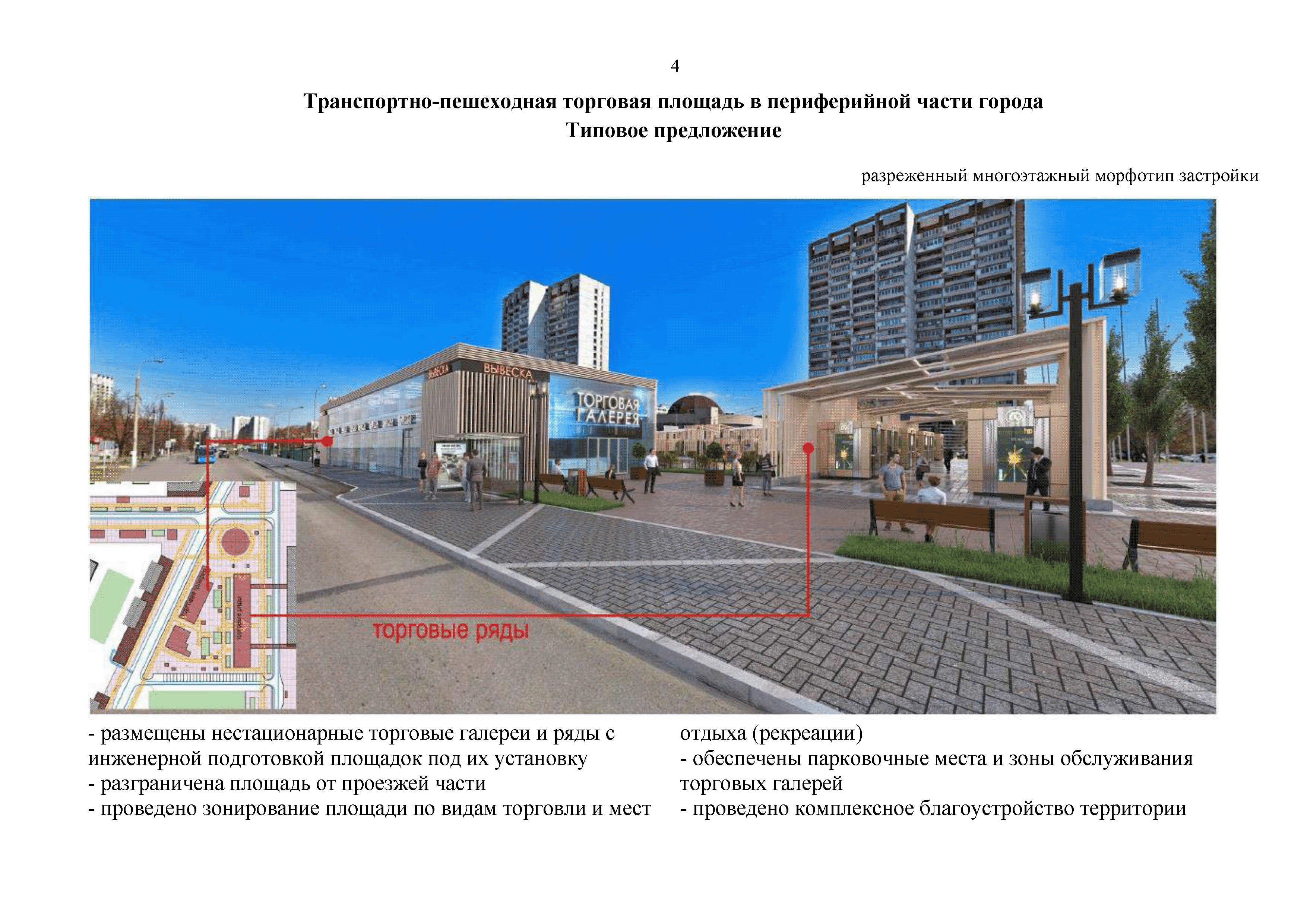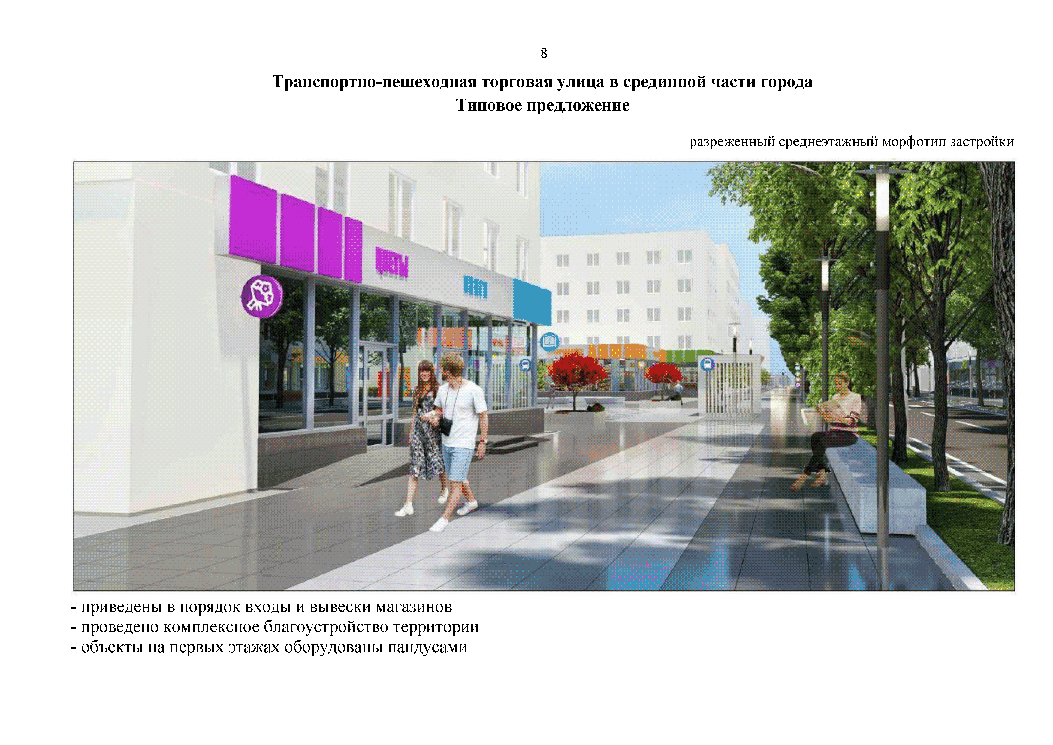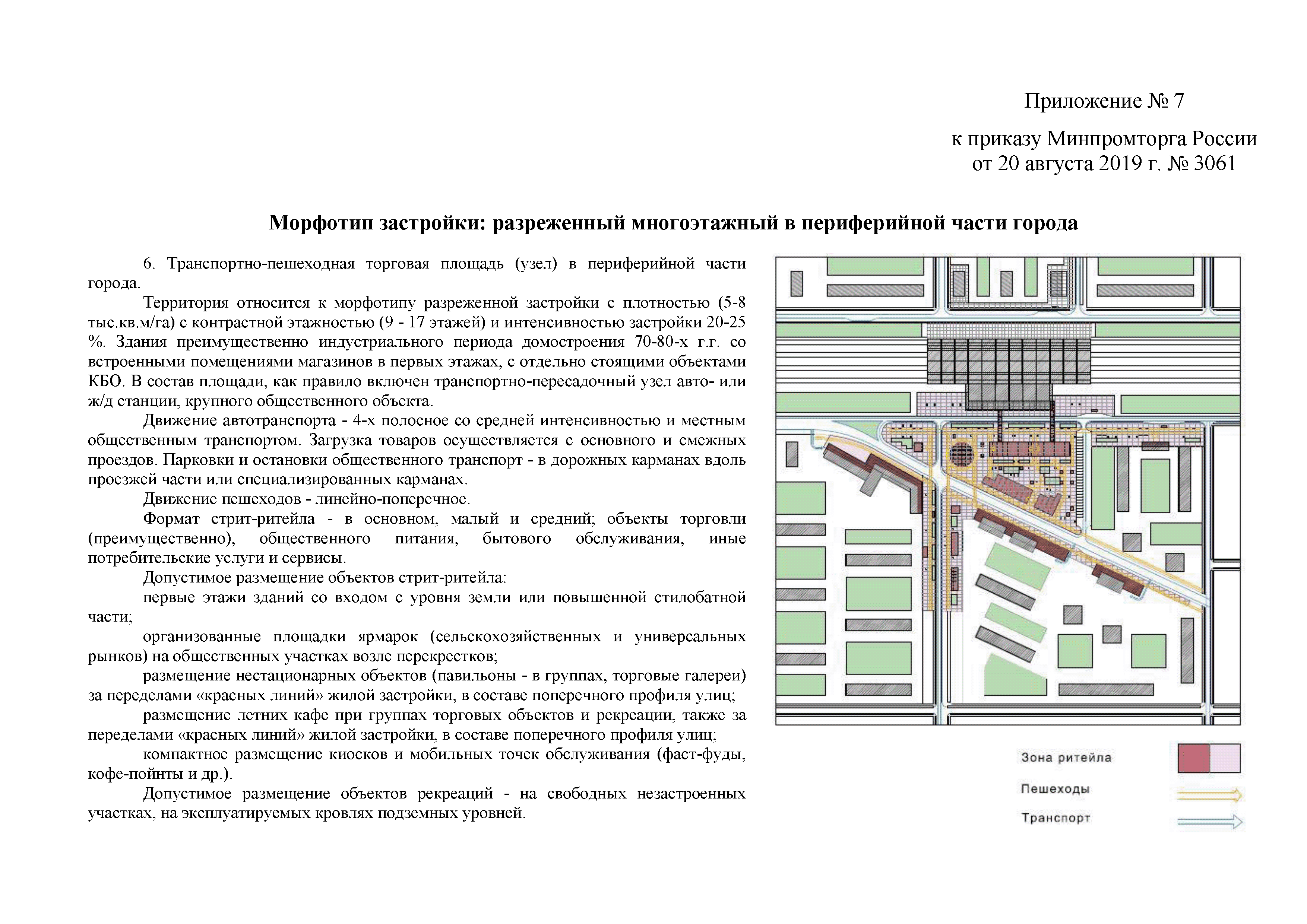 | Оглавление: | I. Общие положения II. Рекомендации при проведении анализа потенциала пространственной организации стрит-ритейла III. Рекомендуемые модели организации стрит-ритейла на общественных пространствах (торговых улицах) Приложение № 1. Группы городов по численности населения. Размещение объектов ритейла в городской застройке Приложение № 2. Рекомендуемый образец организации пешеходной торговой улицы в исторической части города при периметрально-компактном морфотипе застройки Приложение № 3. Рекомендуемый образец организации транспортно-пешеходной торговой улицы в исторической части города при периметрально-компактном морфотипе застройки Приложение № 4. Рекомендуемый образец организации транспортно-пешеходной торговой улицы в срединной части города при разреженном среднеэтажном морфотипе застройки Приложение № 5. Рекомендуемый образец организации транспортно-пешеходной торговой площади в срединной части города при разреженном среднеэтажном морфотипе застройки Приложение № 6. Рекомендуемый образец организации транспортно-пешеходной торговой улицы в периферийной части города при разреженном многоэтажном морфотипе застройки Приложение № 7. Рекомендуемый образец организации транспортно-пешеходной торговой площади в периферийный части города при разреженном многоэтажном морфотипе застройки Приложение № 8. Рекомендуемый образец организации транспортно-пешеходной торговой улицы в курортной зоне города при смешанном среднеэтажном морфотипе застройки Приложение № 9. Рекомендуемый образец организации пешеходной торговой площади в туристической зоне города при периметрально-компактном морфотипе застройки Приложение № 10. Рекомендуемый образец организации регулярной ярмарки для малых городов при разреженном разноэтажном морфотипе застройки Приложение № 11. Рекомендуемый образец организации общественных территорий городской рекреации на незастроенных территориях |