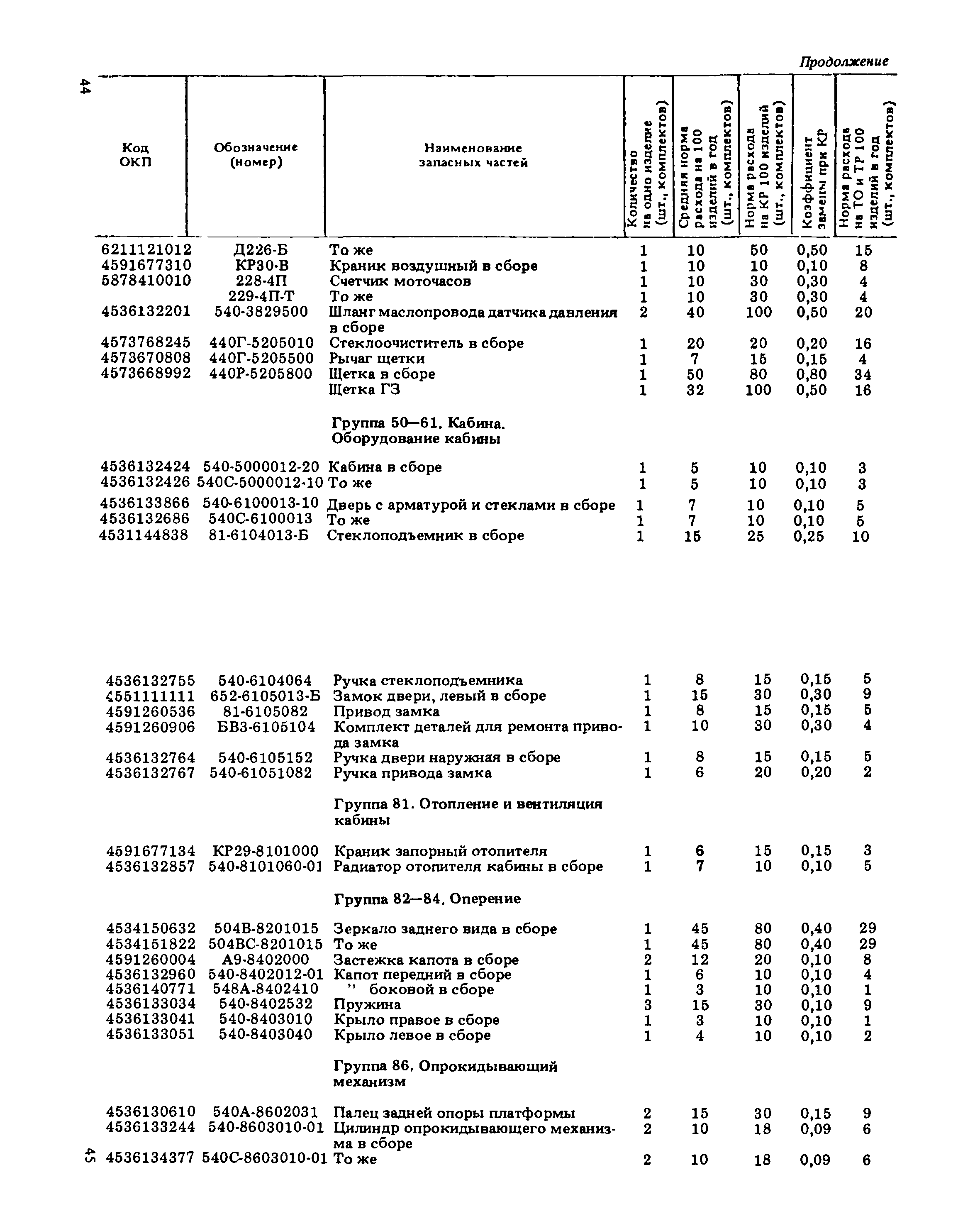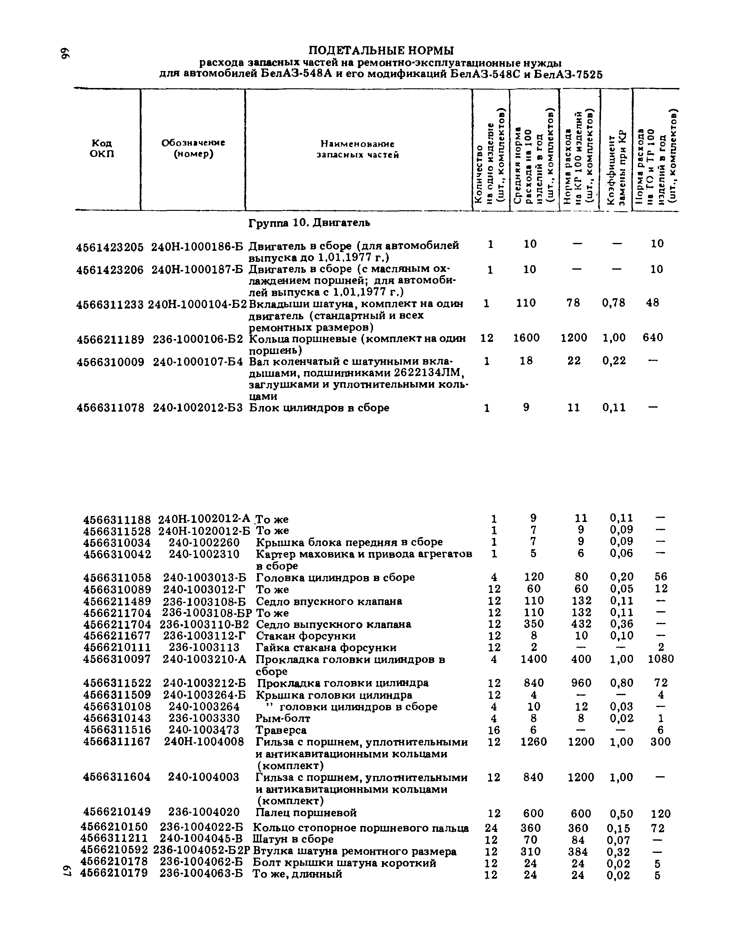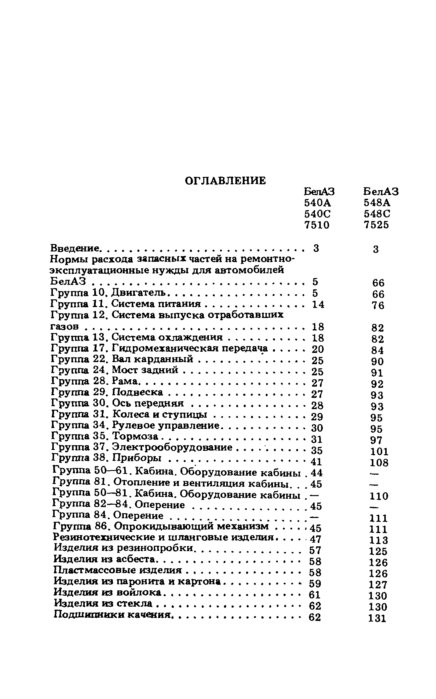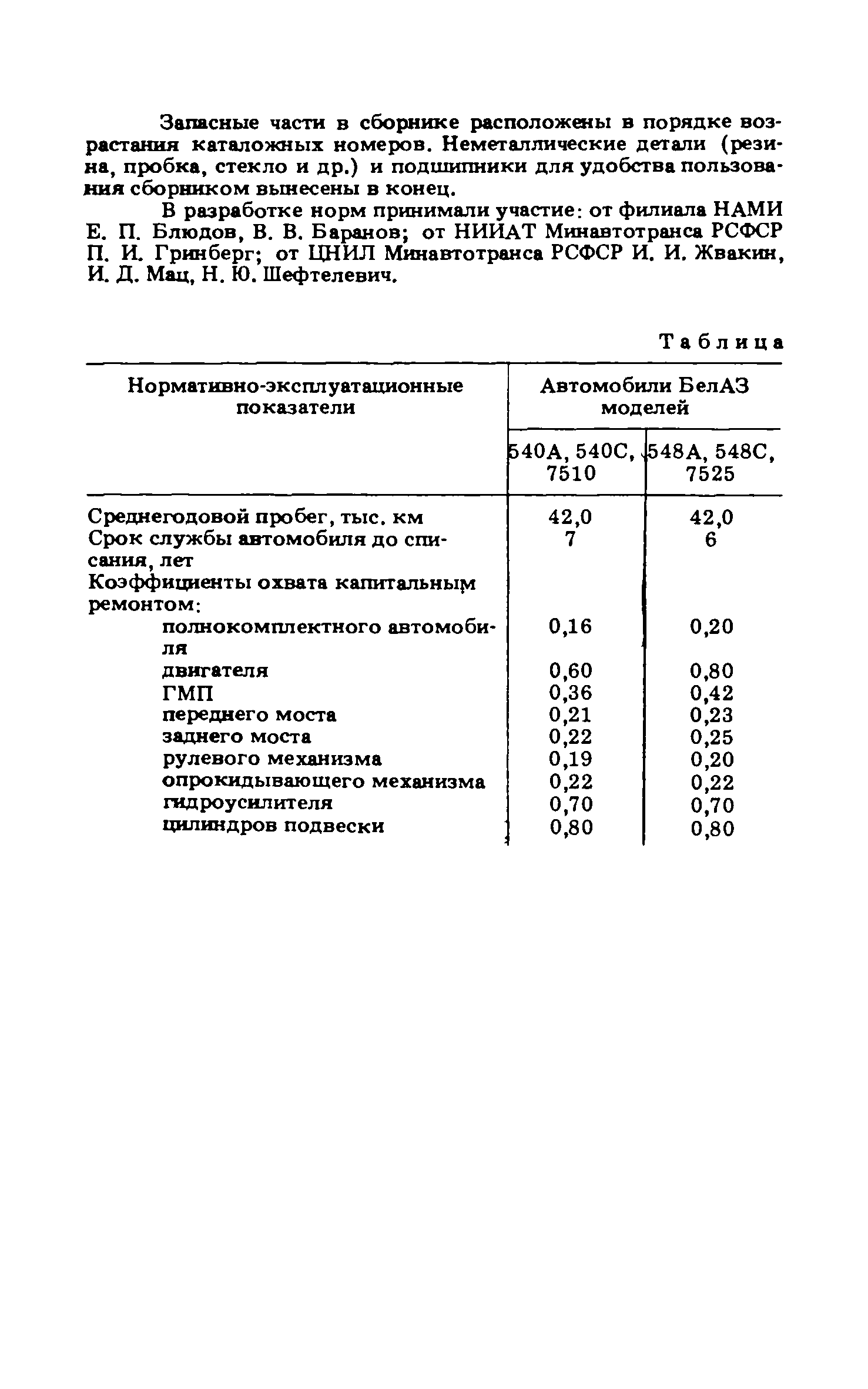 Подетальные нормы расхода запасных частей на ремонтно-эксплуатационные нужды автомобилей БелАЗ-540 А, БелАЗ-540 С, БелАЗ-548 А, БелАЗ-548 С, БелАЗ-7510, БелАЗ-7525| Статус: | справочные материалы, мп, тпр | | Название рус.: | Подетальные нормы расхода запасных частей на ремонтно-эксплуатационные нужды автомобилей БелАЗ-540 А, БелАЗ-540 С, БелАЗ-548 А, БелАЗ-548 С, БелАЗ-7510, БелАЗ-7525 | | Дата добавления в базу: | 01.01.2021 | | Дата актуализации: | 01.01.2021 | | Область применения: | Нормы предназначены для инженерно-технических работников авторемонтных, автотранспортных и снабженческих организаций Минавтотранса РСФСР. | | Оглавление: | Нормы расхода запасных частей на ремонтно-эксплуатационные нужды для автомобилей БелАЗ Группа 10. Двигатель Группа 11. Система питания Группа 12. Система выпуска отработавших газов Группа 13. Система охлаждения Группа 17. Гидромеханическая передача Группа 22. Вал карданный Группа 24. Мост задний Группа 28. Рама Группа 29. Подвеска Группа 30. Ось передняя Группа 31. Колеса и ступицы Группа 34. Рулевое управление Группа 35. Тормоза Группа 37. Электрооборудование Группа 38. Приборы Группа 50 - 61. Кабина. Оборудование кабины Группа 81. Отопление и вентиляция кабины. . Группа 50 - 81. Кабина. Оборудование кабины Группа 82 - 84. Оперение Группа 84. Оперение Группа 86. Опрокидывающий механизм | | Разработан: | НИИАТ НАМИ ЦНИЛ