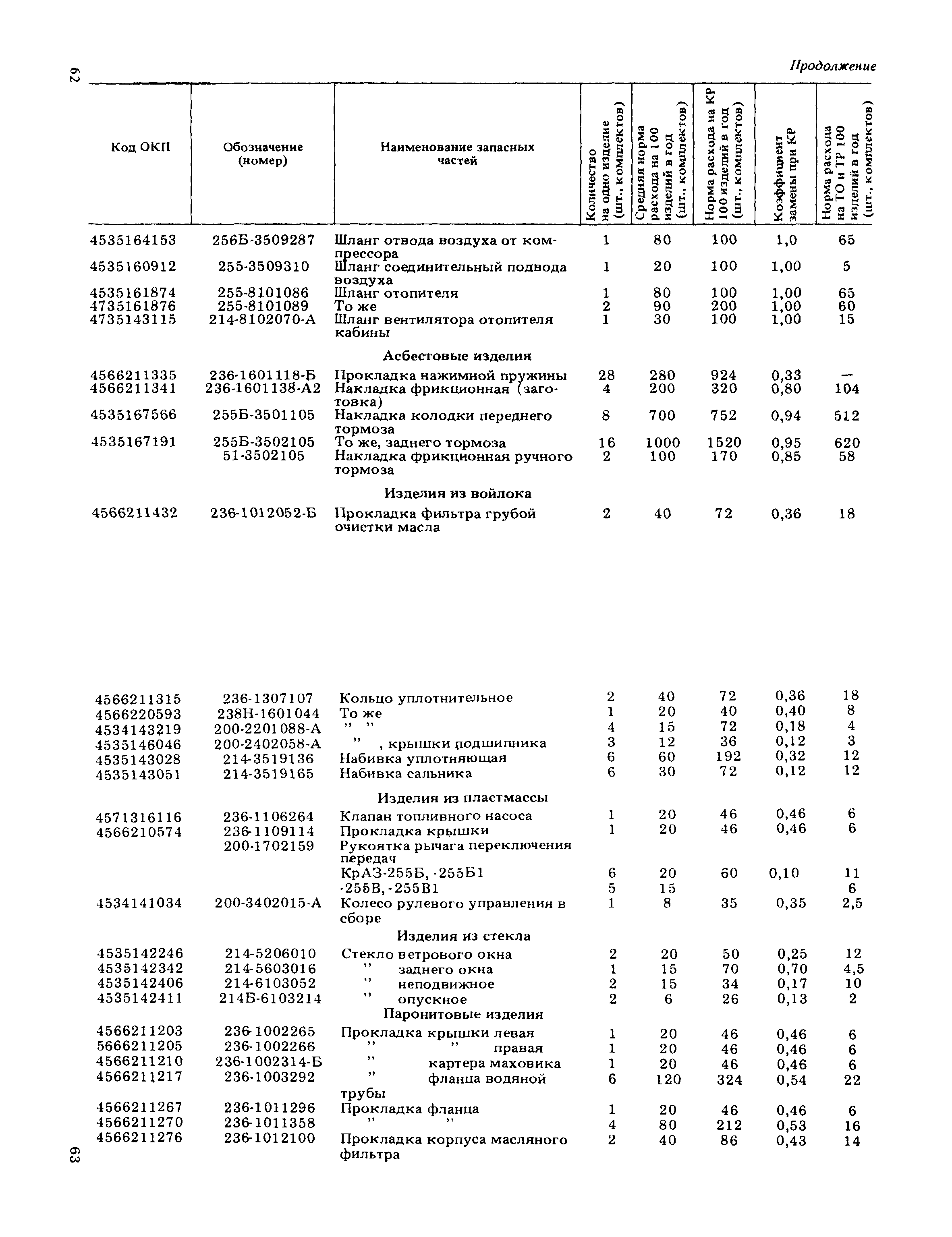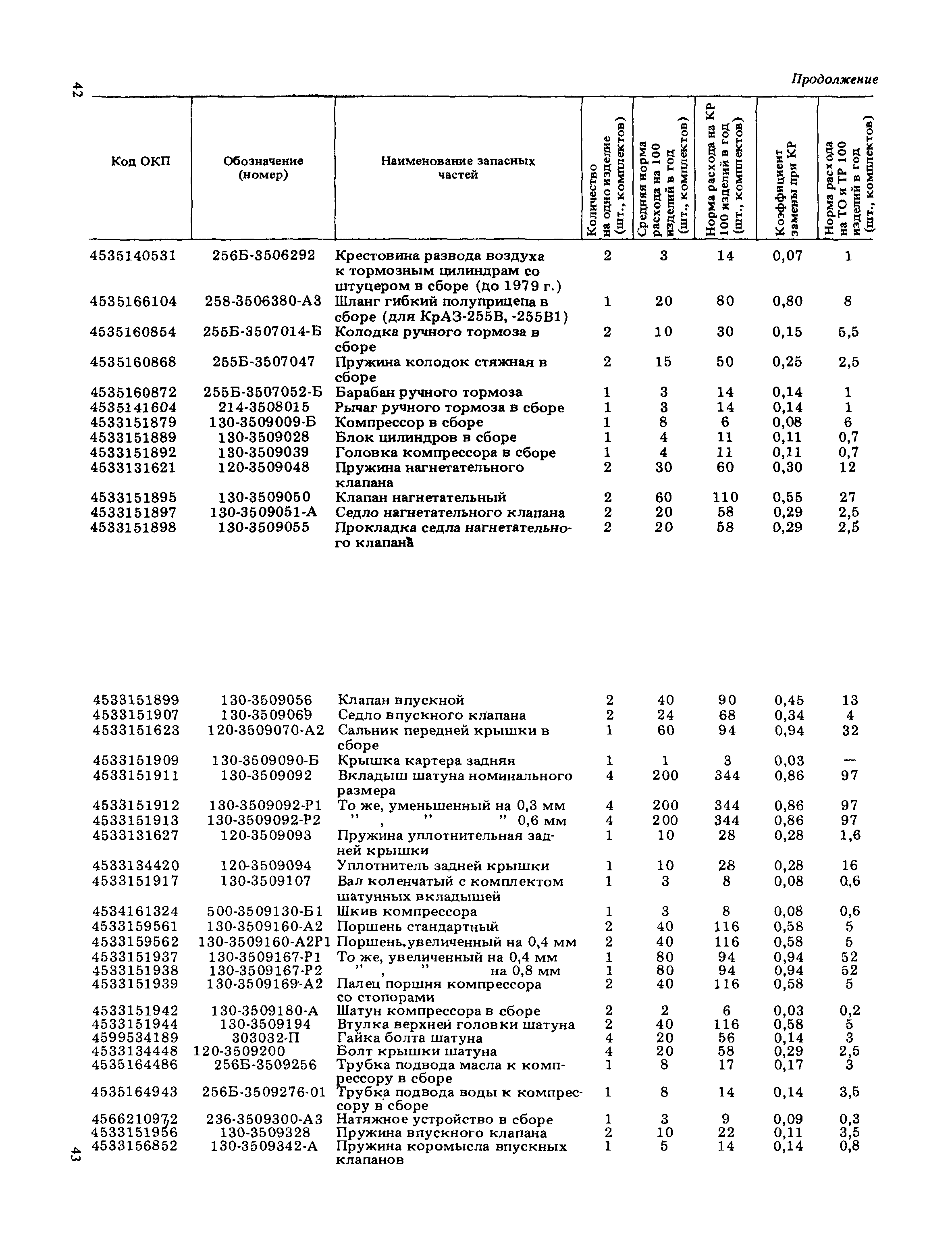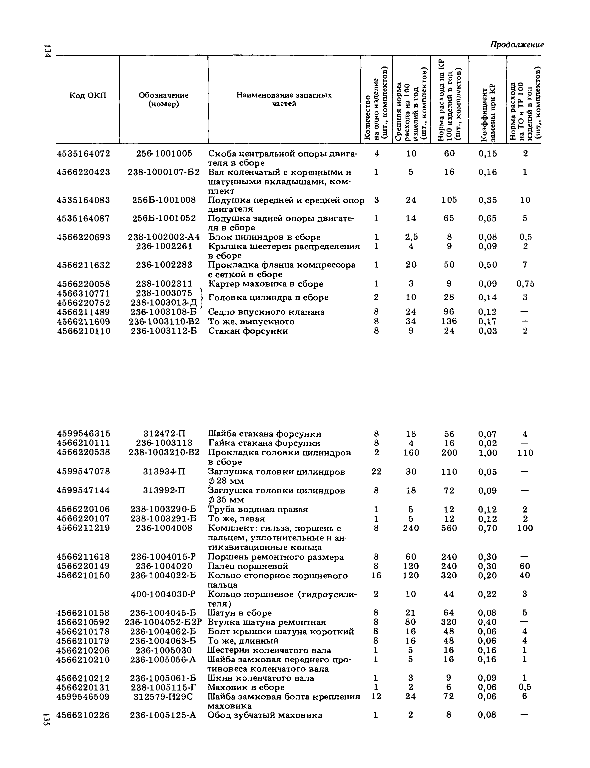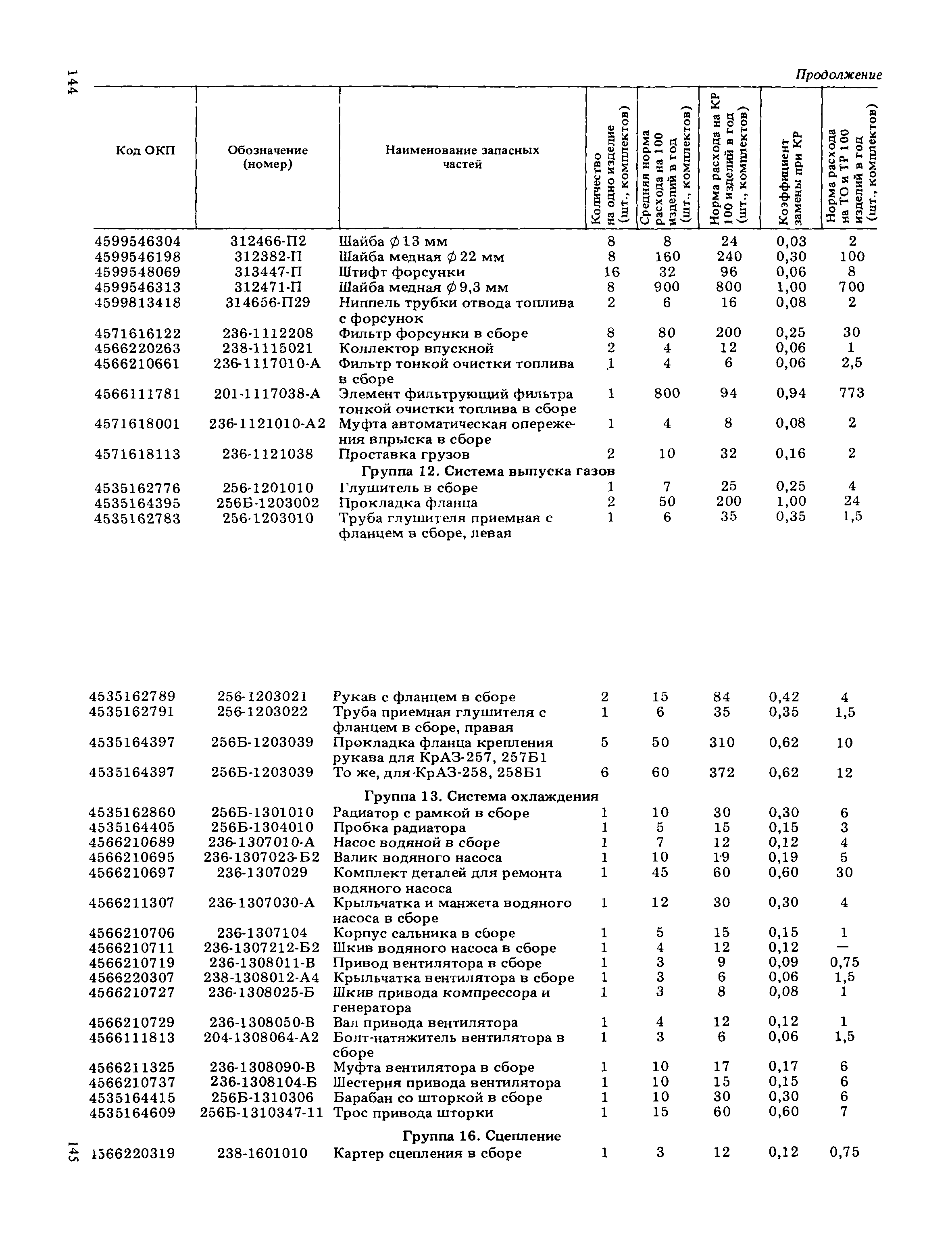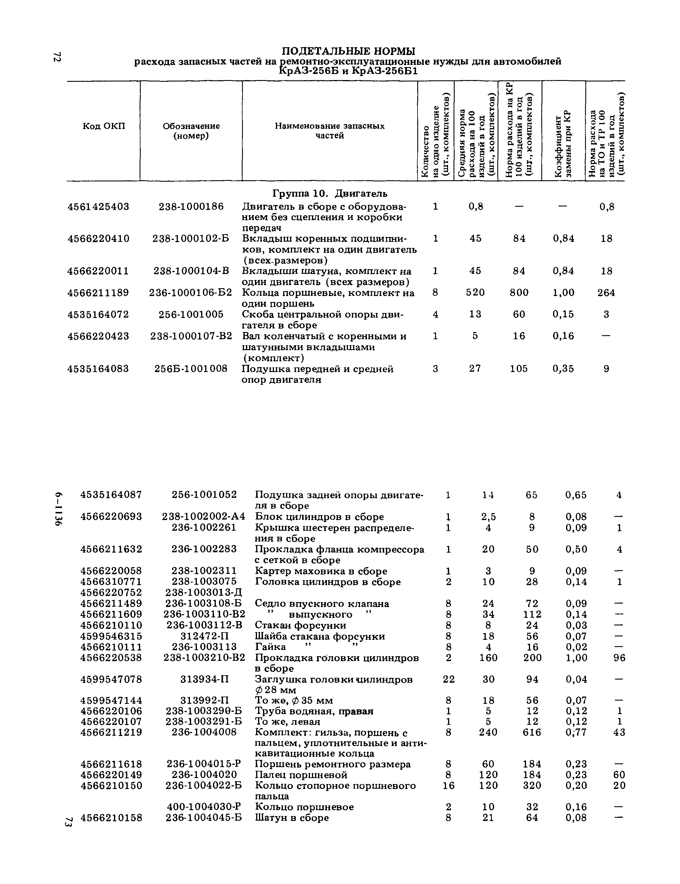 нормы расхода запасных частей на ремонтно-эксплуатационные нужды для автомобилей КрАЗ-256Б,