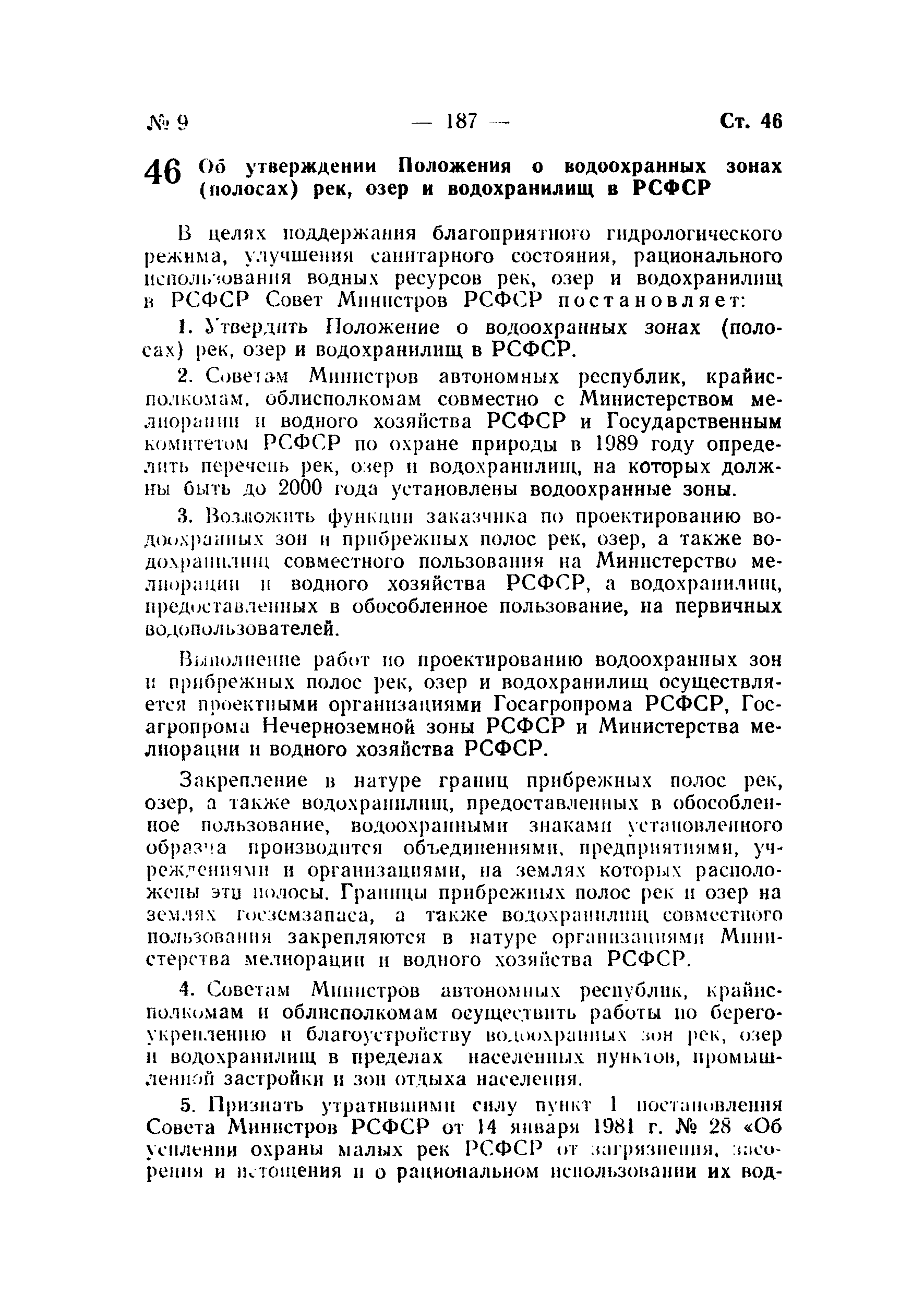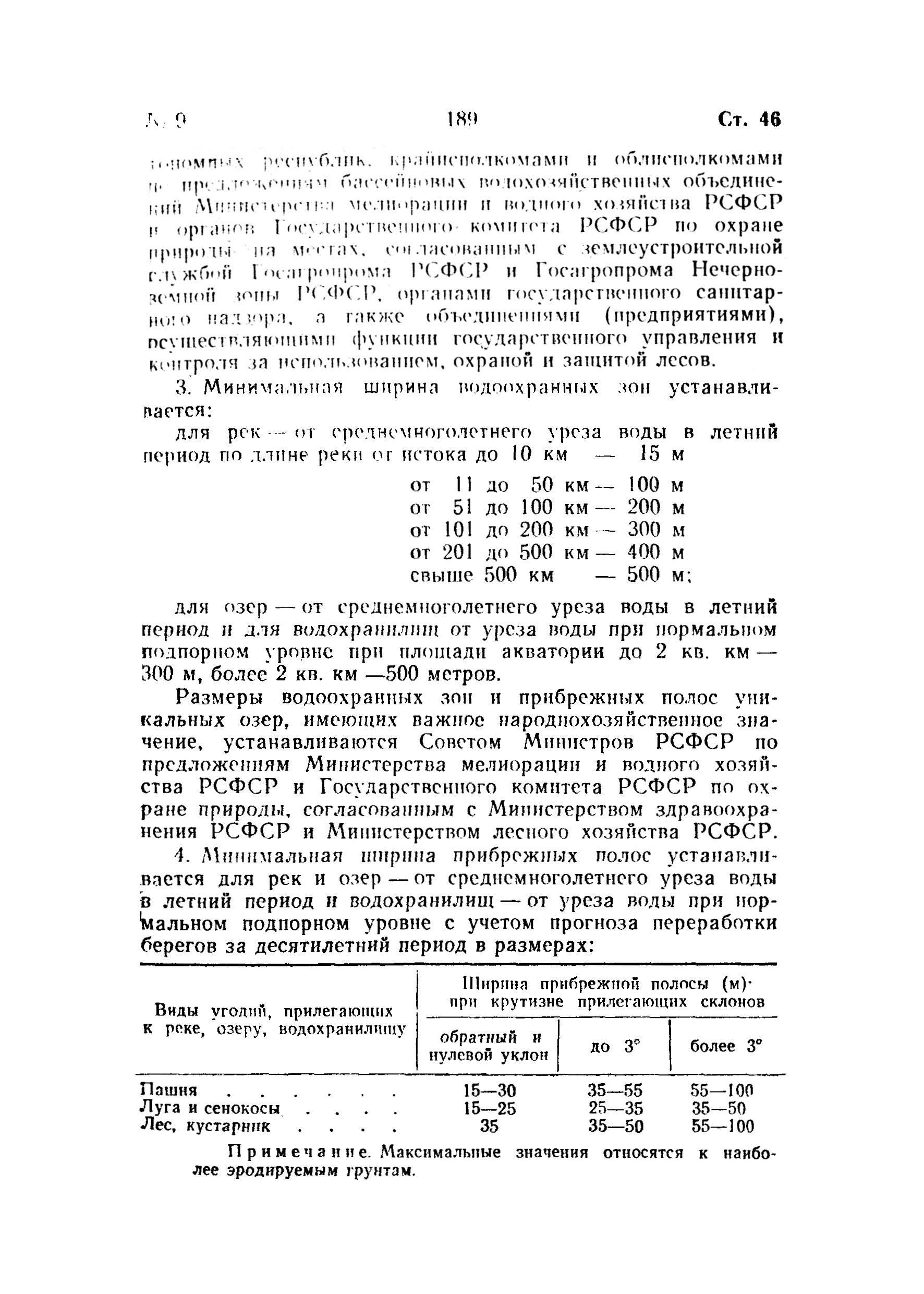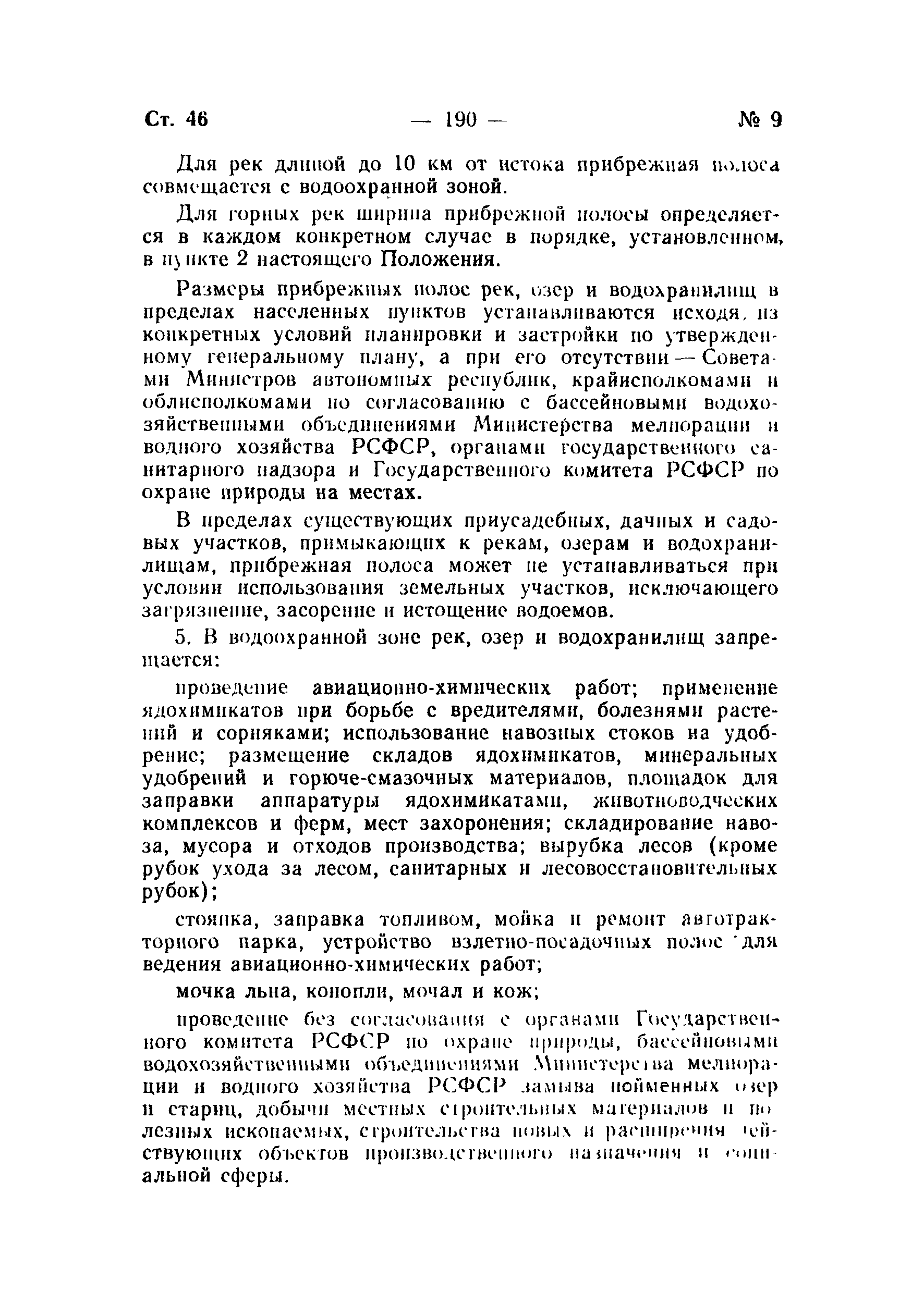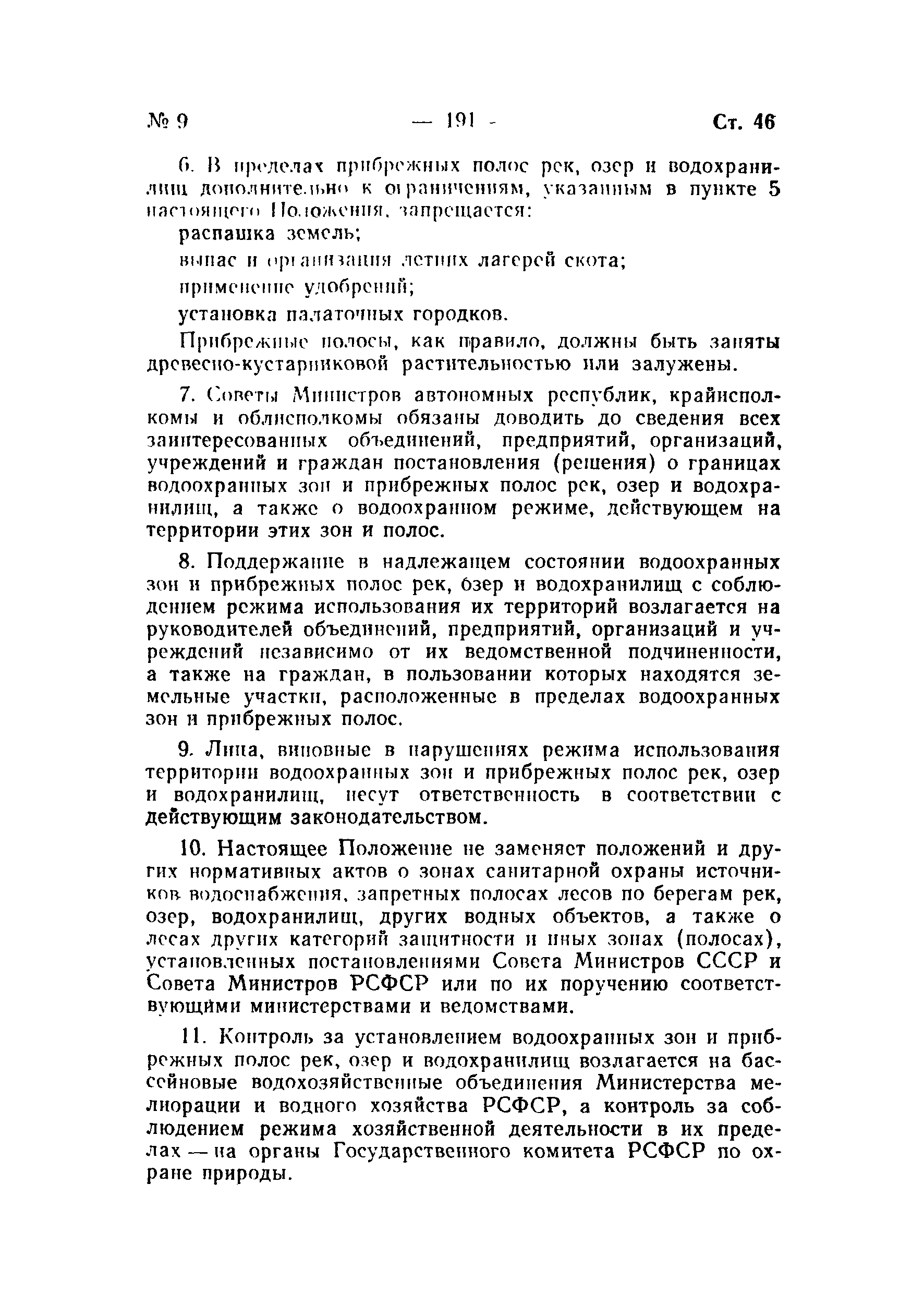 Положение о водоохранных зонах (полосах) рек, озер и водохранилищ в РСФСР| Статус: | заменен | | Название рус.: | Положение о водоохранных зонах (полосах) рек, озер и водохранилищ в РСФСР | | Дата добавления в базу: | 01.02.2020 | | Дата актуализации: | 01.01.2021 | | Дата введения: | 23.11.1996 | | Область применения: | Документ используется в целях поддержания благоприятного гидрологического режима, улучшения санитарного состояния, рационального использования водных ресурсов рек, озер и водохранилищ | | Утверждён: | 17.03.1989 Совет Министров СССР (USSR Cabinet of Ministers 91)