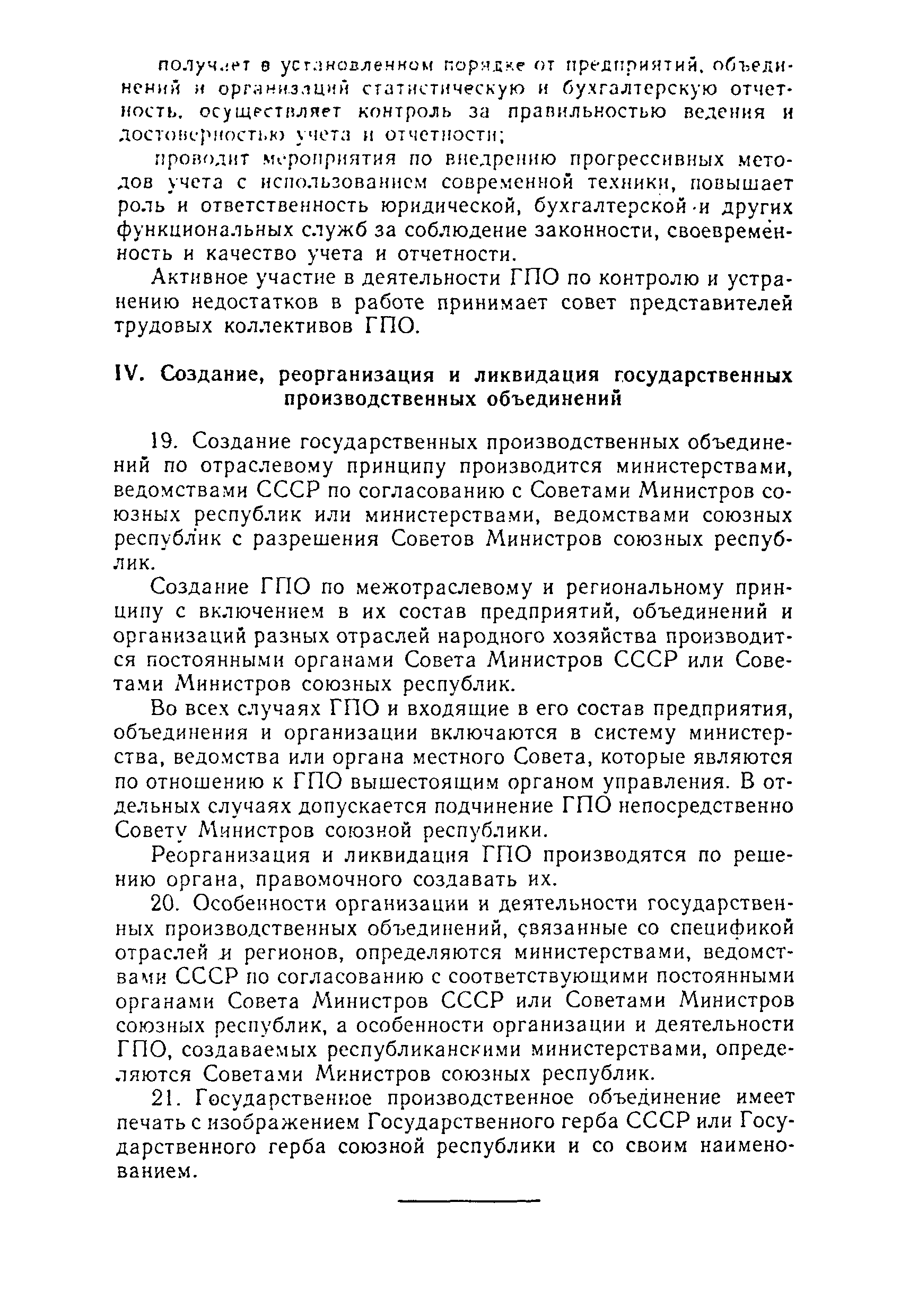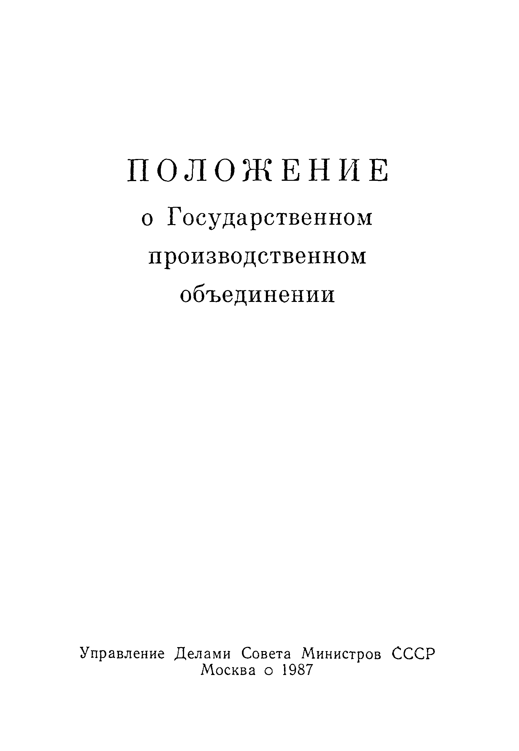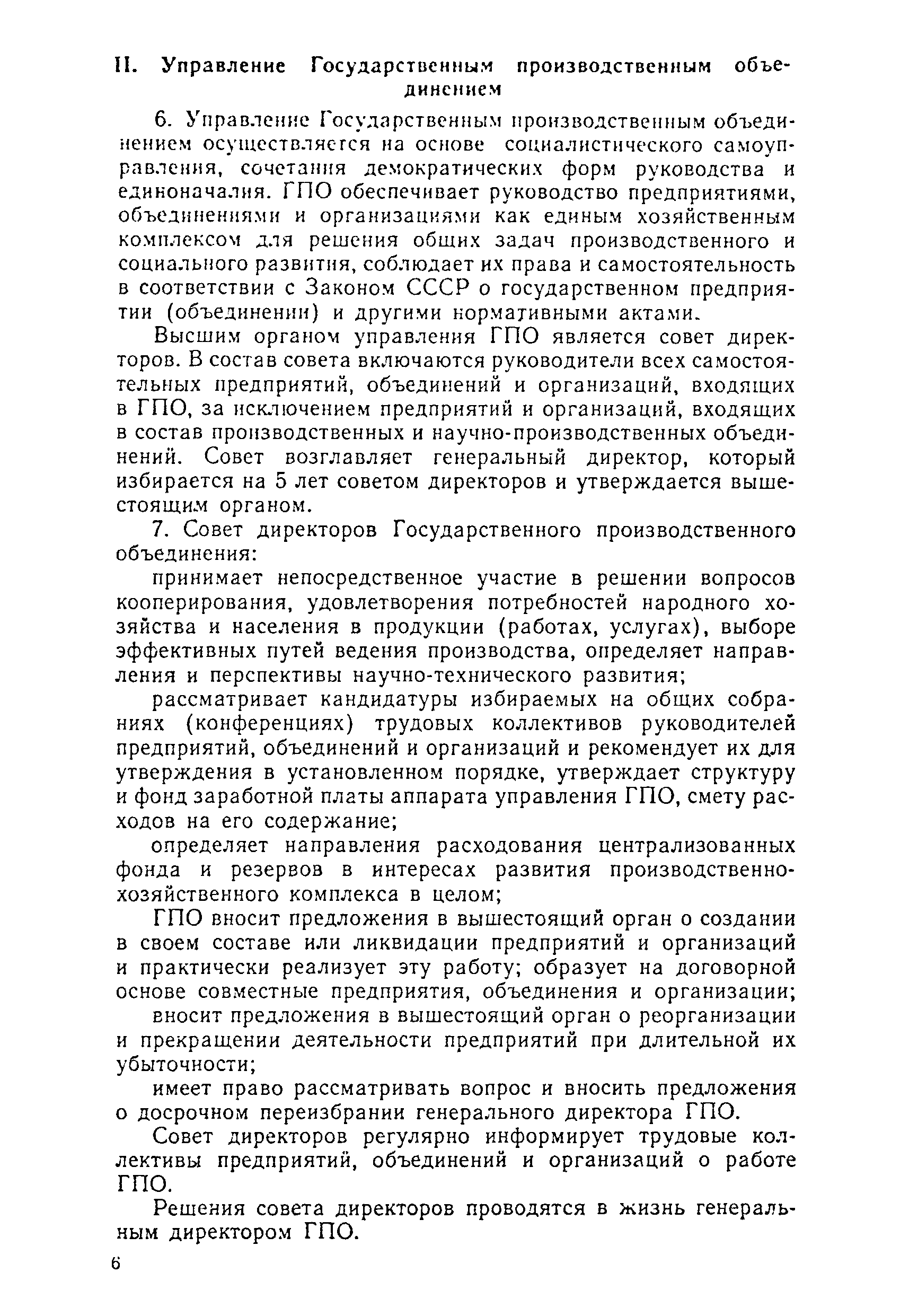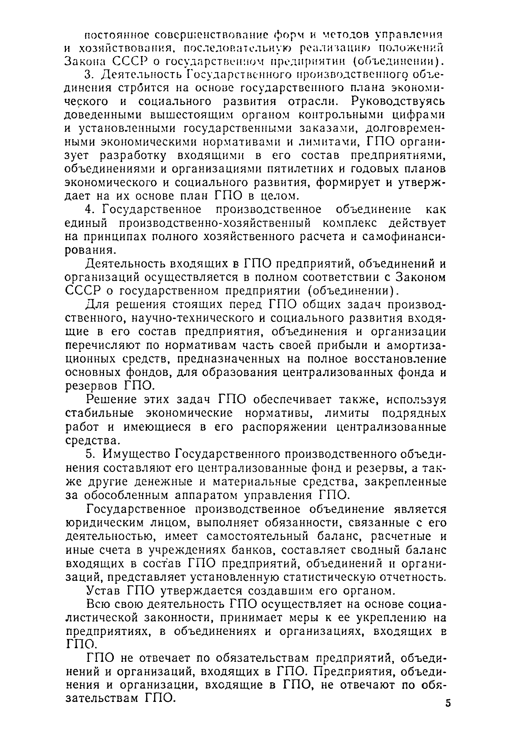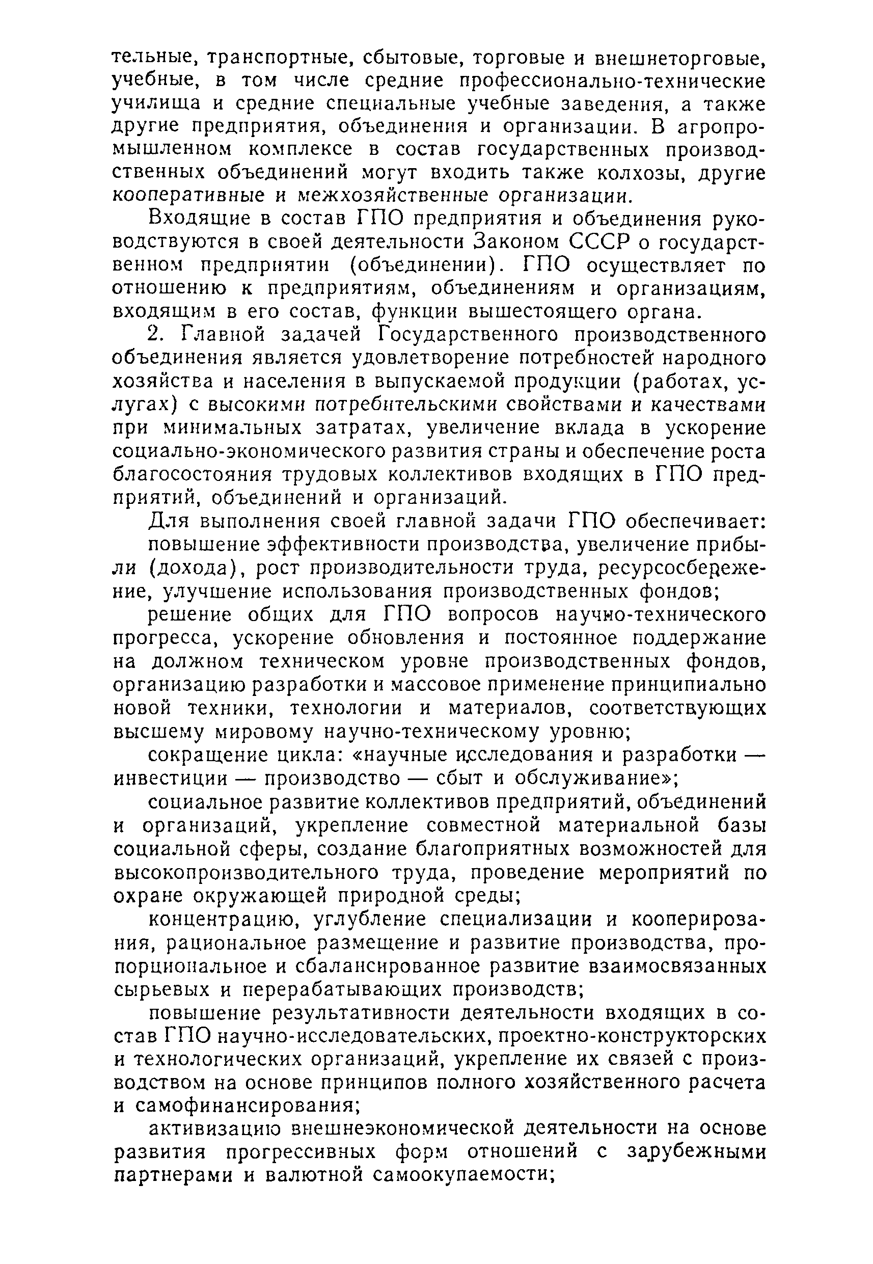 | Оглавление: | I. Государственное производственное объедение, его задачи и принципы деятельности II. Управление Государственным производственным объединением III. Функции, права и обязанности Государственного производственного объединения IV. Создание, реорганизация и ликвидация государственных производственных объединени |