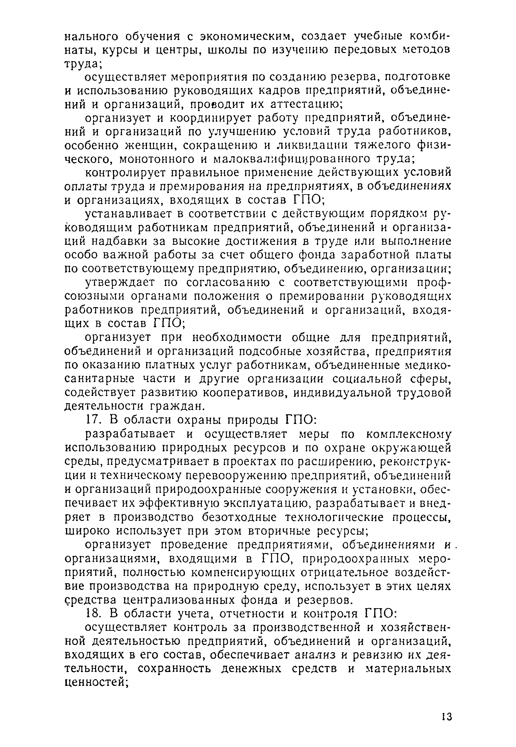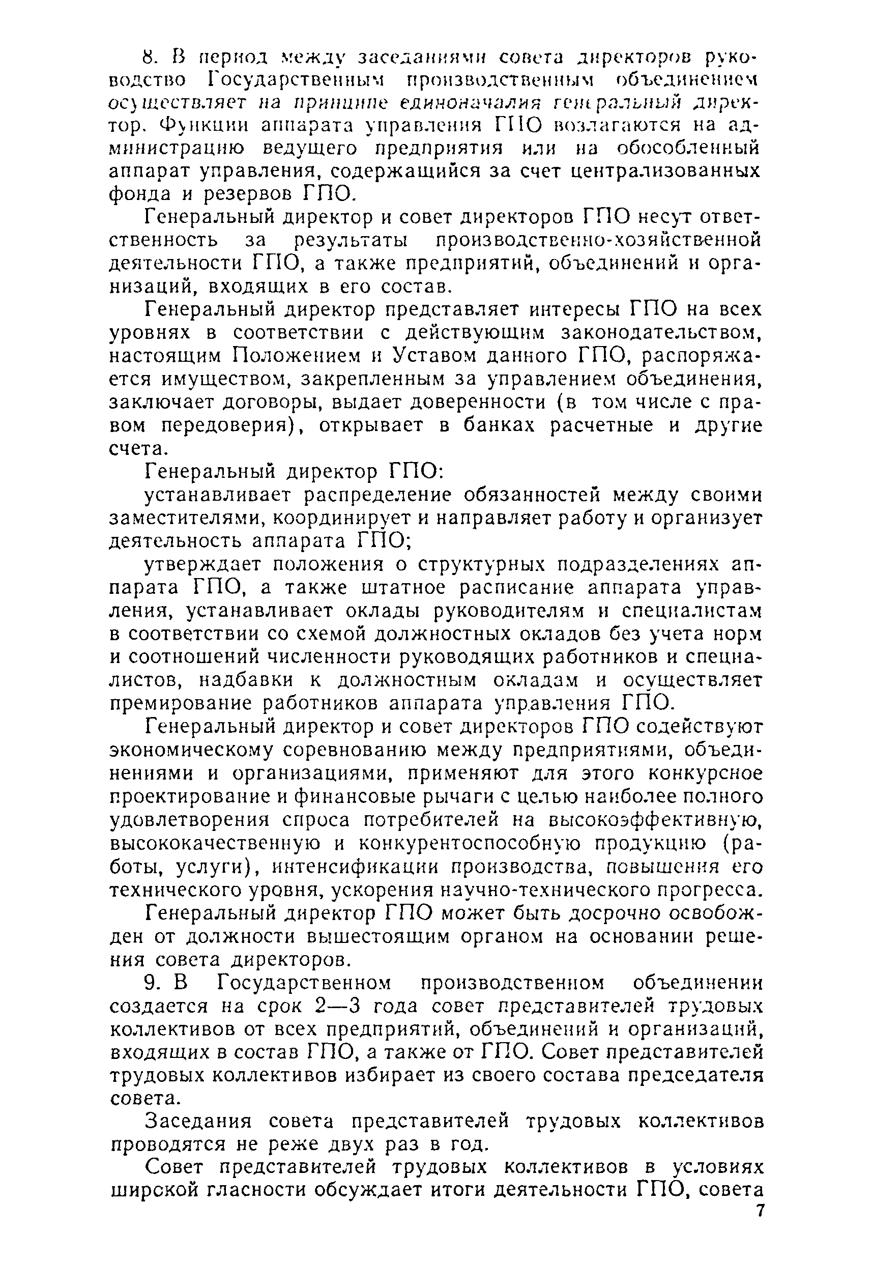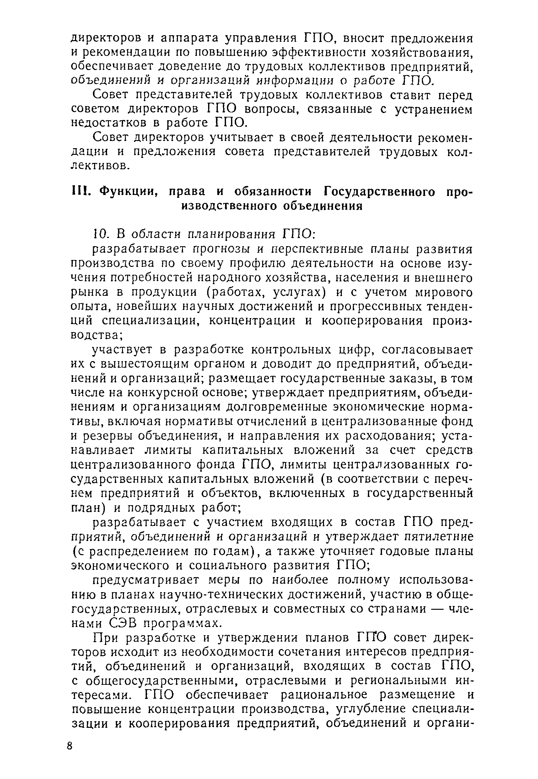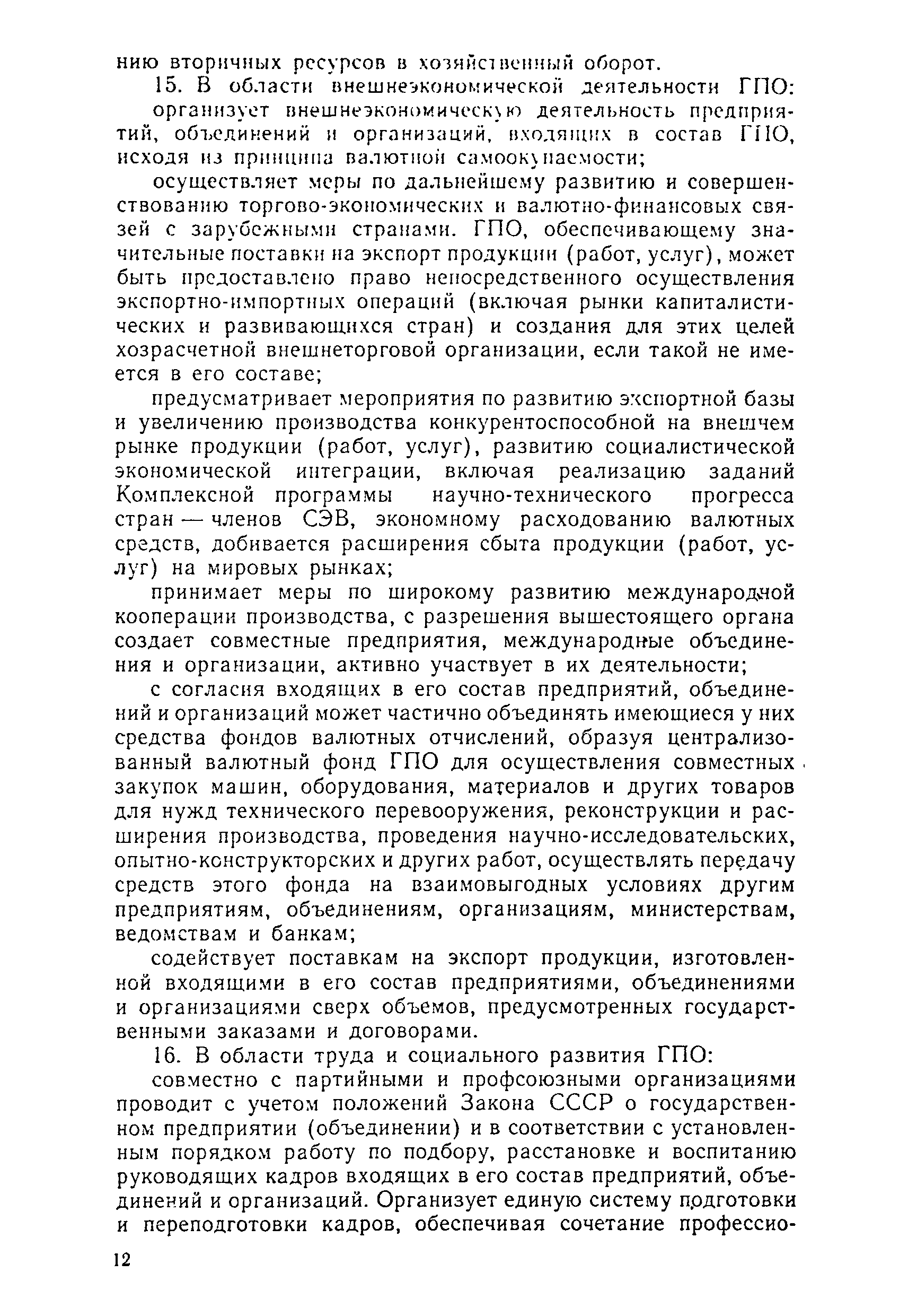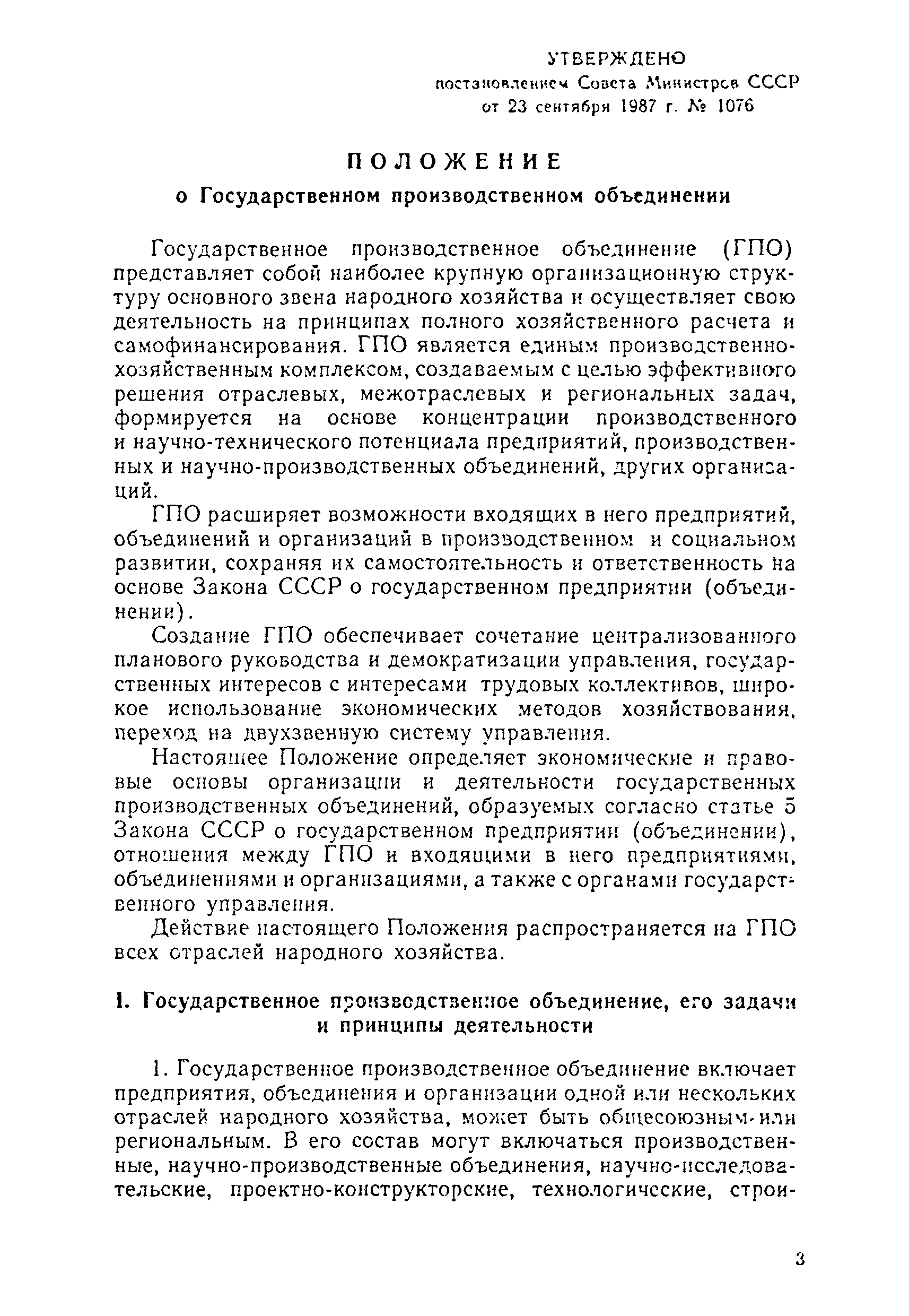 | Оглавление: | I. Государственное производственное объедение, его задачи и принципы деятельности II. Управление Государственным производственным объединением III. Функции, права и обязанности Государственного производственного объединения IV. Создание, реорганизация и ликвидация государственных производственных объединени |
