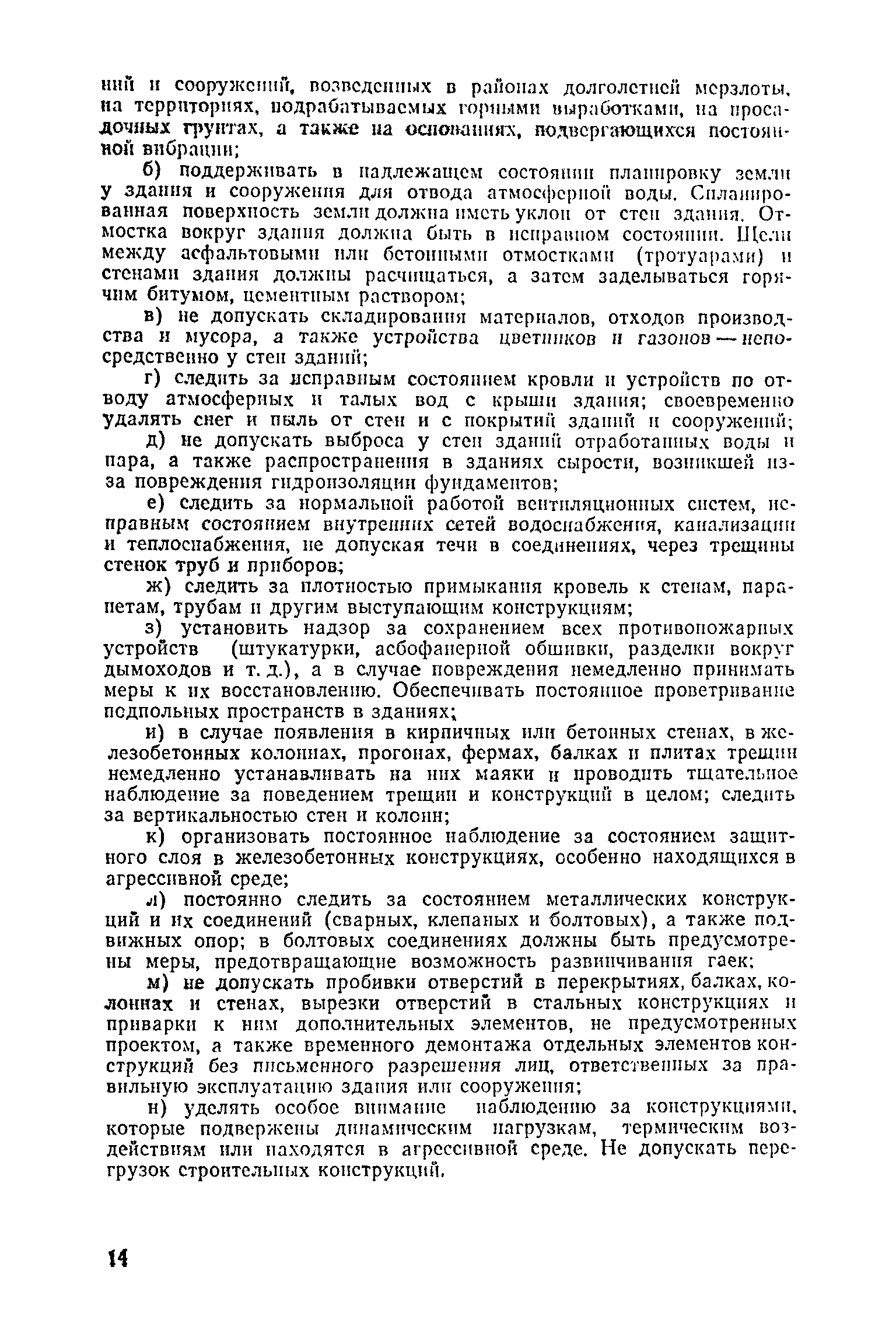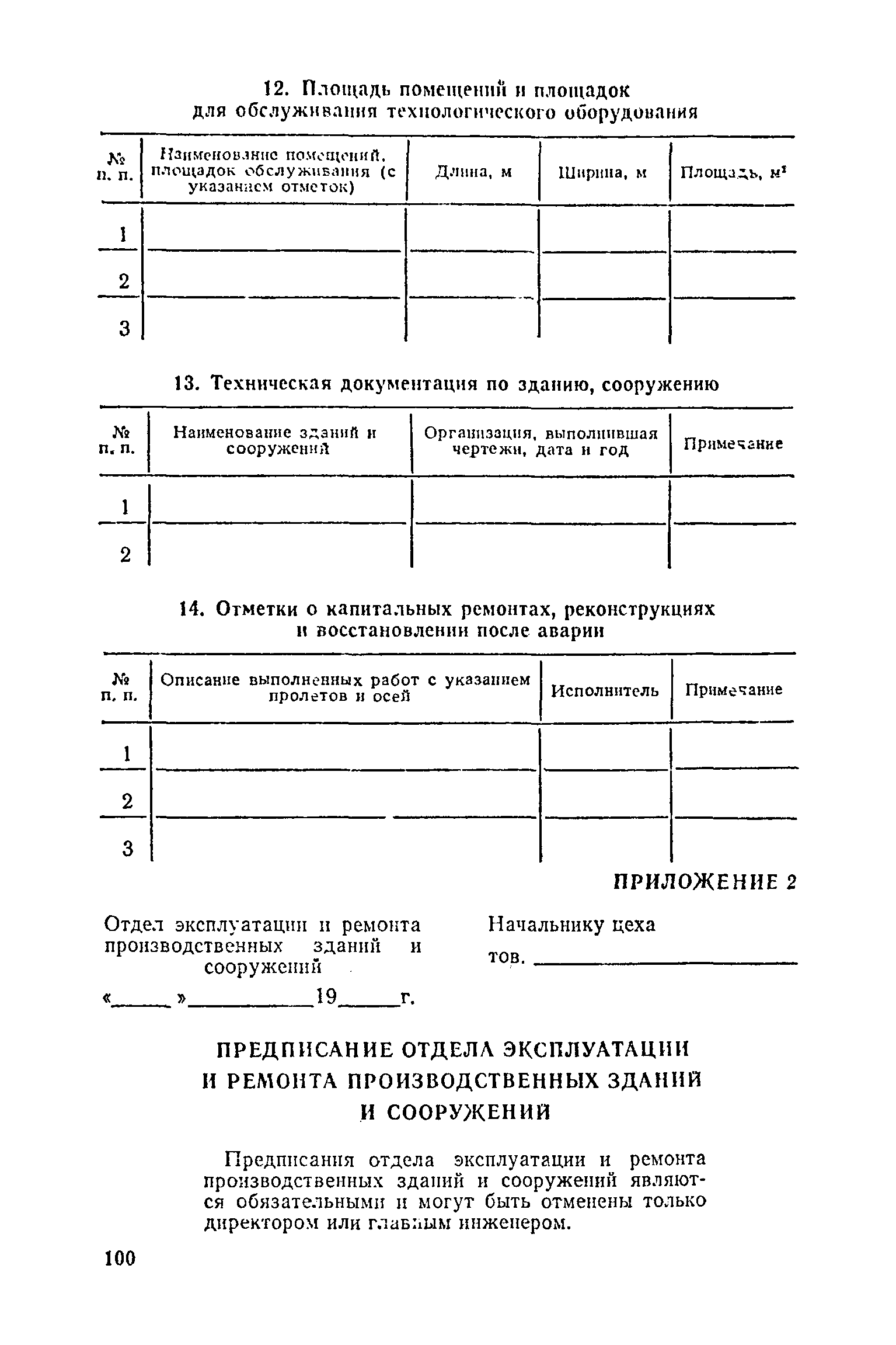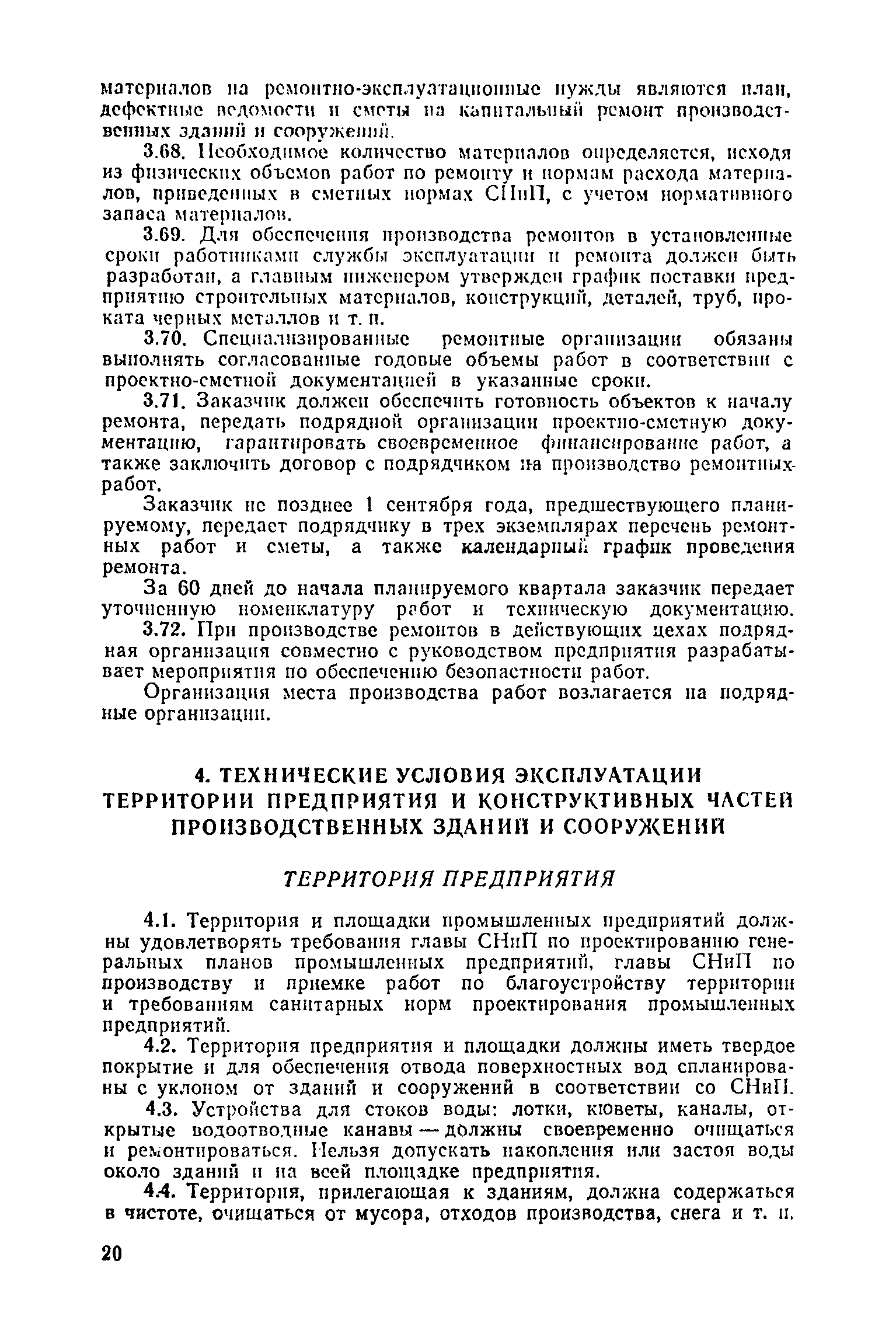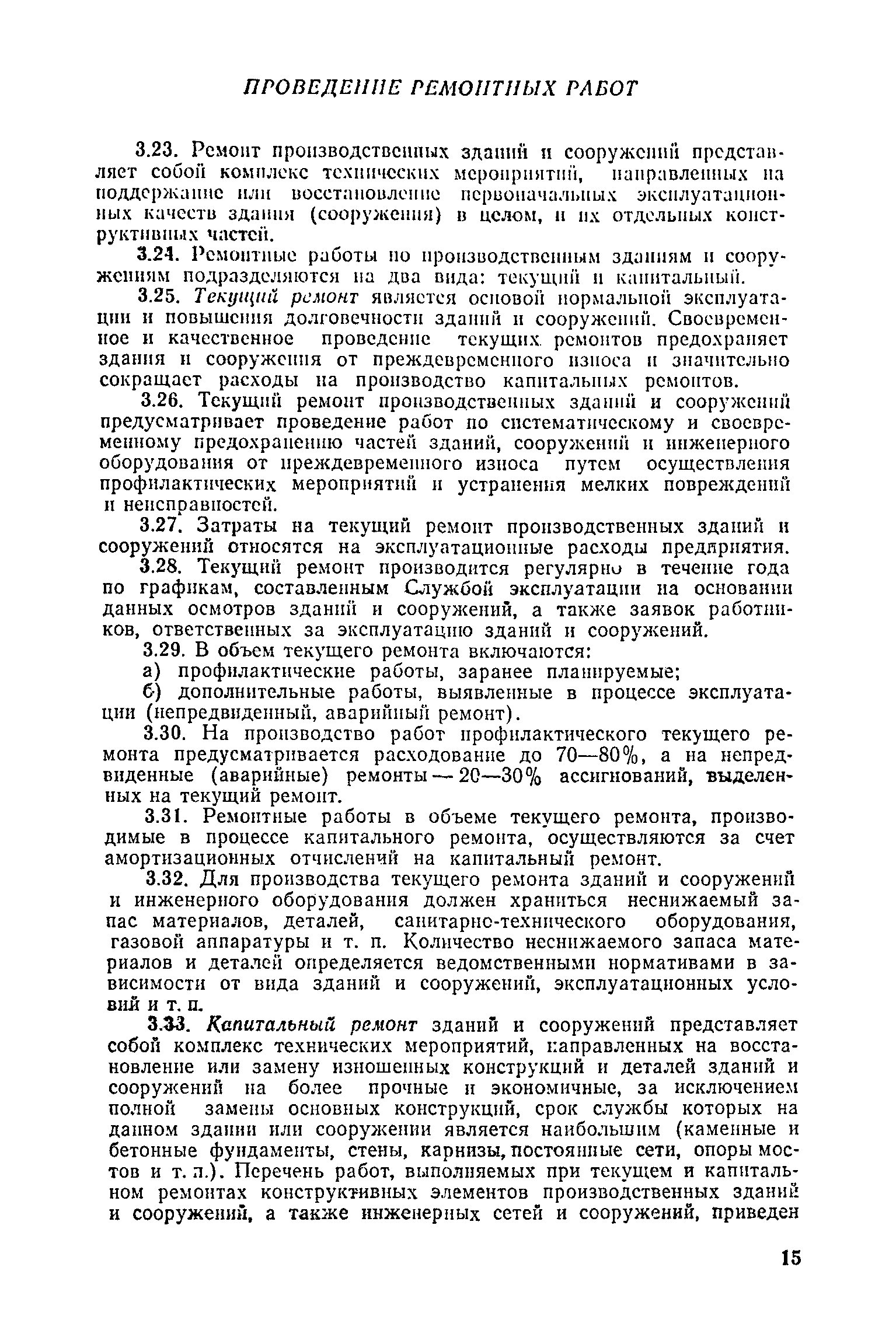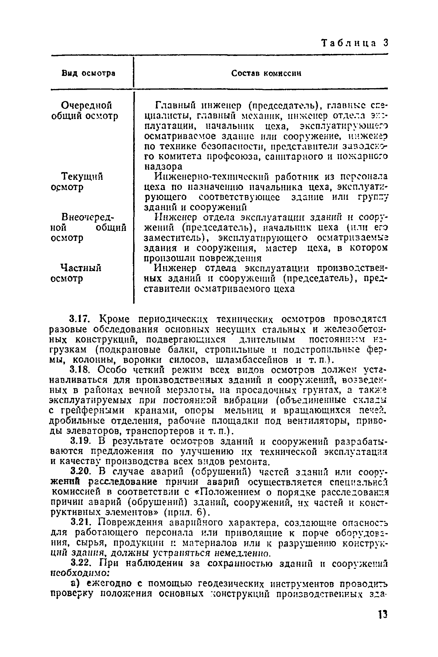 Положение о проведении планово-предупредительного ремонта и технической эксплуатации производственных зданий и сооружений предприятий промышленности строительных материалов| Статус: | справочные материалы, мп, тпр | | Название рус.: | Положение о проведении планово-предупредительного ремонта и технической эксплуатации производственных зданий и сооружений предприятий промышленности строительных материалов | | Дата добавления в базу: | 01.01.2021 | | Дата актуализации: | 01.01.2021 | | Область применения: | Положение дополнено новыми разделами, содержащими правила технической эксплуатации производственных зданий н сооружений в условиях влияния агрессивной среды, высоких и низких температур, повышенной вибрации конструкций, запыленности и влажности, а также эксплуатации н ремонта основных промышленных инженерных сооружений, инженерных сетей, вспомогательных производственных сооружений, складских помещений, конструктивных частей зданий п т.п.; требования к эксплуатации н ремонту сооружений автомобильно-железнодорожного транспорта; порядок обследования стальных и железобетонных конструкций. | | Оглавление: | 1. Общая часть 2. Организация надзора за эксплуатацией производственных зданий и сооружений на предприятиях промышленности строительных материалов 3. Проведение планово-предупредительного ремонта зданий и сооружений на предприятиях 4. Технические условия эксплуатации территории предприятия и конструктивных частей производственных зданий и сооружений 5. Дополнительные требования к эксплуатации строительных конструкций в особых условиях 6. Обследование и освидетельствование стальных конструкций зданий и сооружений промышленных предприятий 7. Осмотр строительных конструкций 8. Эксплуатация основных промышленных зданий и сооружений 9. Эксплуатация инженерных сетей и сооружений на них 10. Эксплуатация сооружений автомобильного и внутризаводского железнодорожного транспорта 11. Порядок приемки в эксплуатацию законченных строительством и капитальным ремонтом производственных зданий и сооружений Приложение 1 Технические паспорт на производственное здание (сооружение) Приложение 2 Предписание отдела эксплуатации и ремонта производственных зданий и сооружений Приложение 3 Технический журнал на эксплуатацию здания (сооружения) Приложение 4 Ориентировочные сроки устранения неисправностей при непредвиденном или аварийном ремонте отдельных частей производственных зданий, сооружений и инженерного оборудования Приложение 5 Акт очередного технического осмотра здания (сооружения) Приложение 6 Положение о порядке расследования причин аварии (обрушений) зданий, сооружений, их частей и конструктивных элементов Приложение 7 Перечень работ, выполняемых при текущем и капитальном ремонтах конструктивных элементов производственных зданий и сооружений, а также инженерных сетей и сооружений на них Приложение 8 Периодичность проведения работ по капитальному ремонту Приложение 9 План-заявка на проведение капитального ремонта производственных зданий и сооружений Приложение 10 Перечень работ по капитальному ремонту промышленных зданий и сооружений, турбин, котельных агрегатов, линий электропередач, промышленных печей, промышленной вентиляции, кип и автоматики и пусконаладочные работы, подлежащие выполнению подрядными о