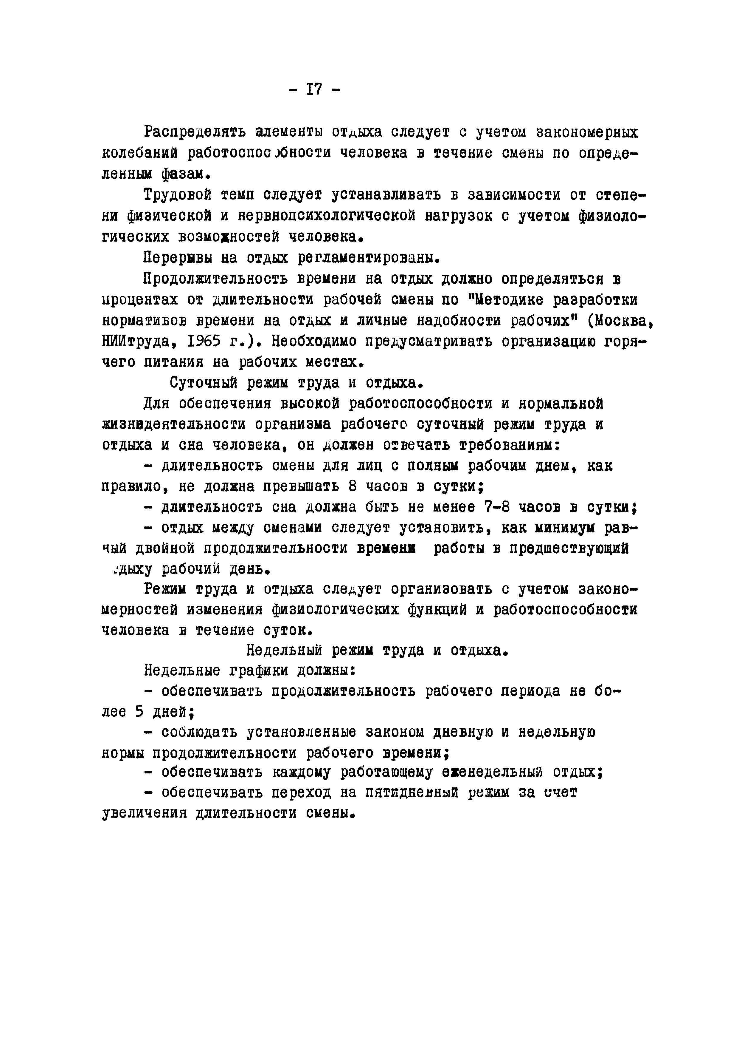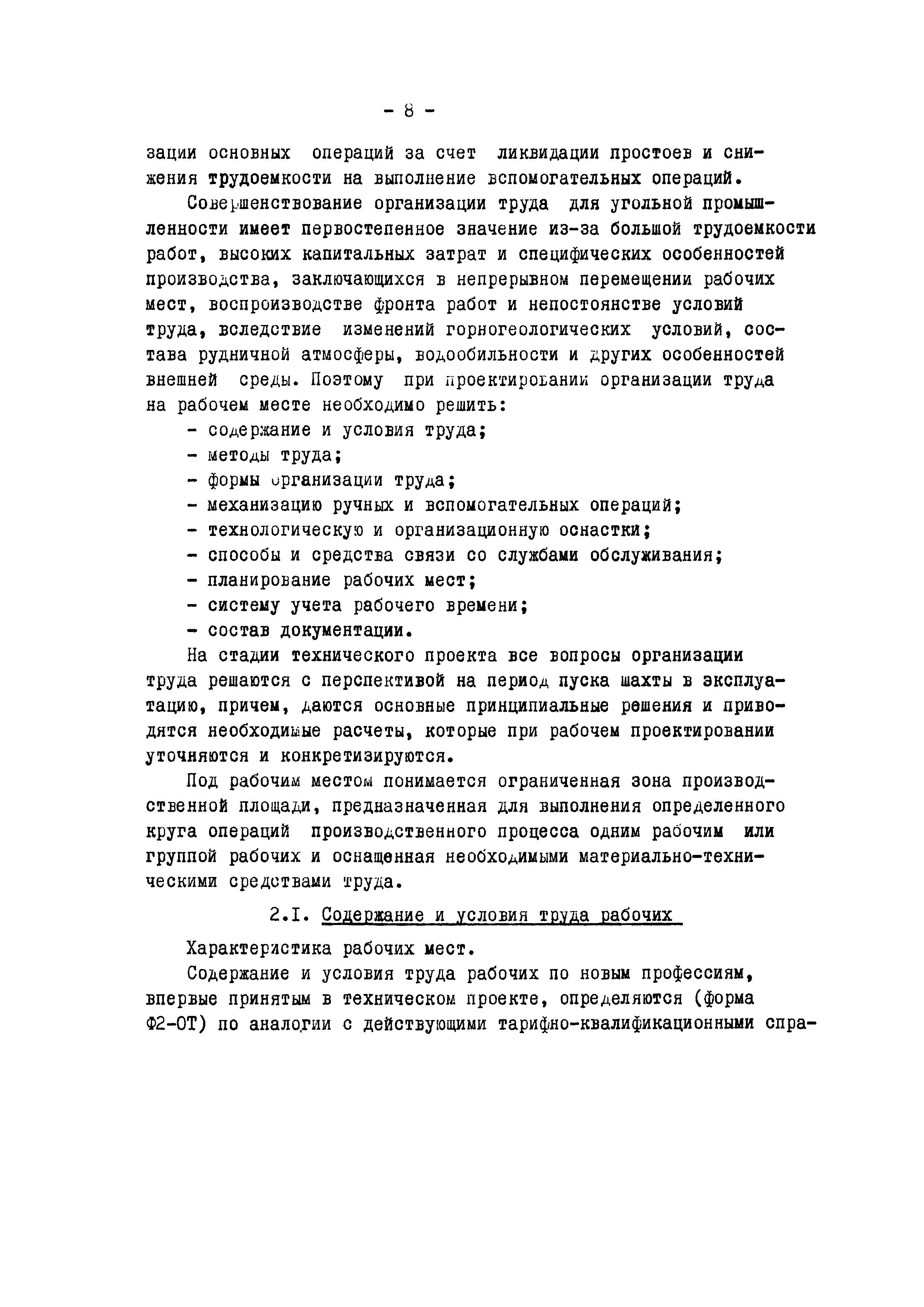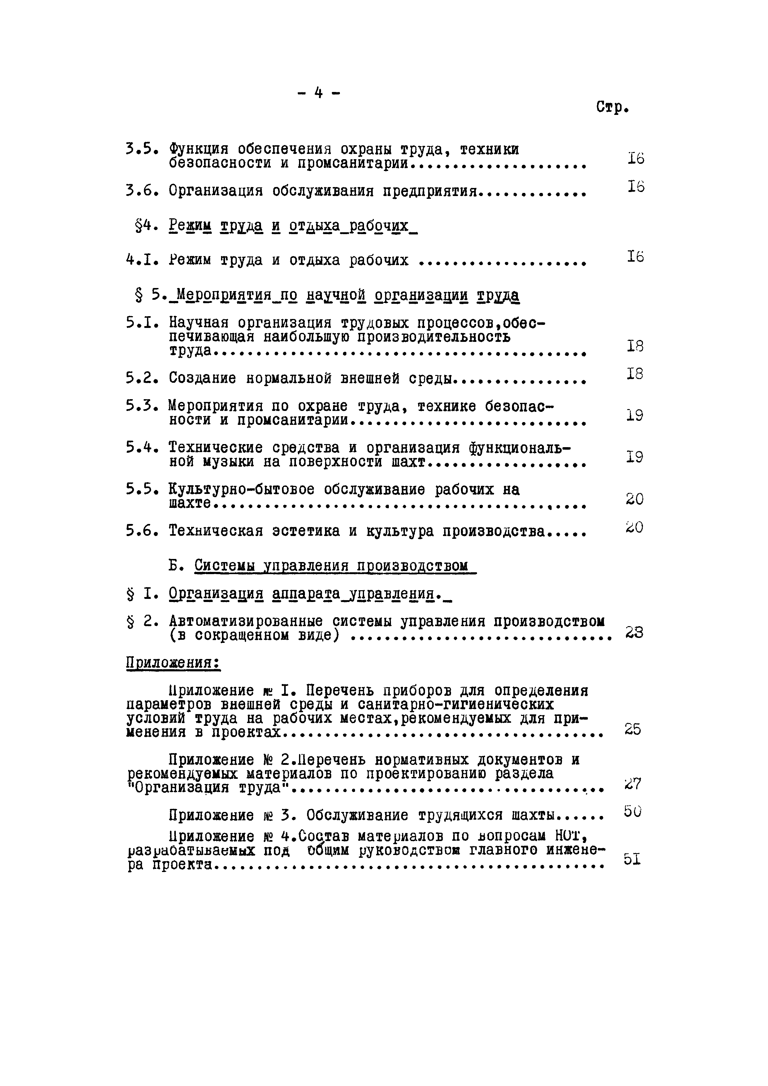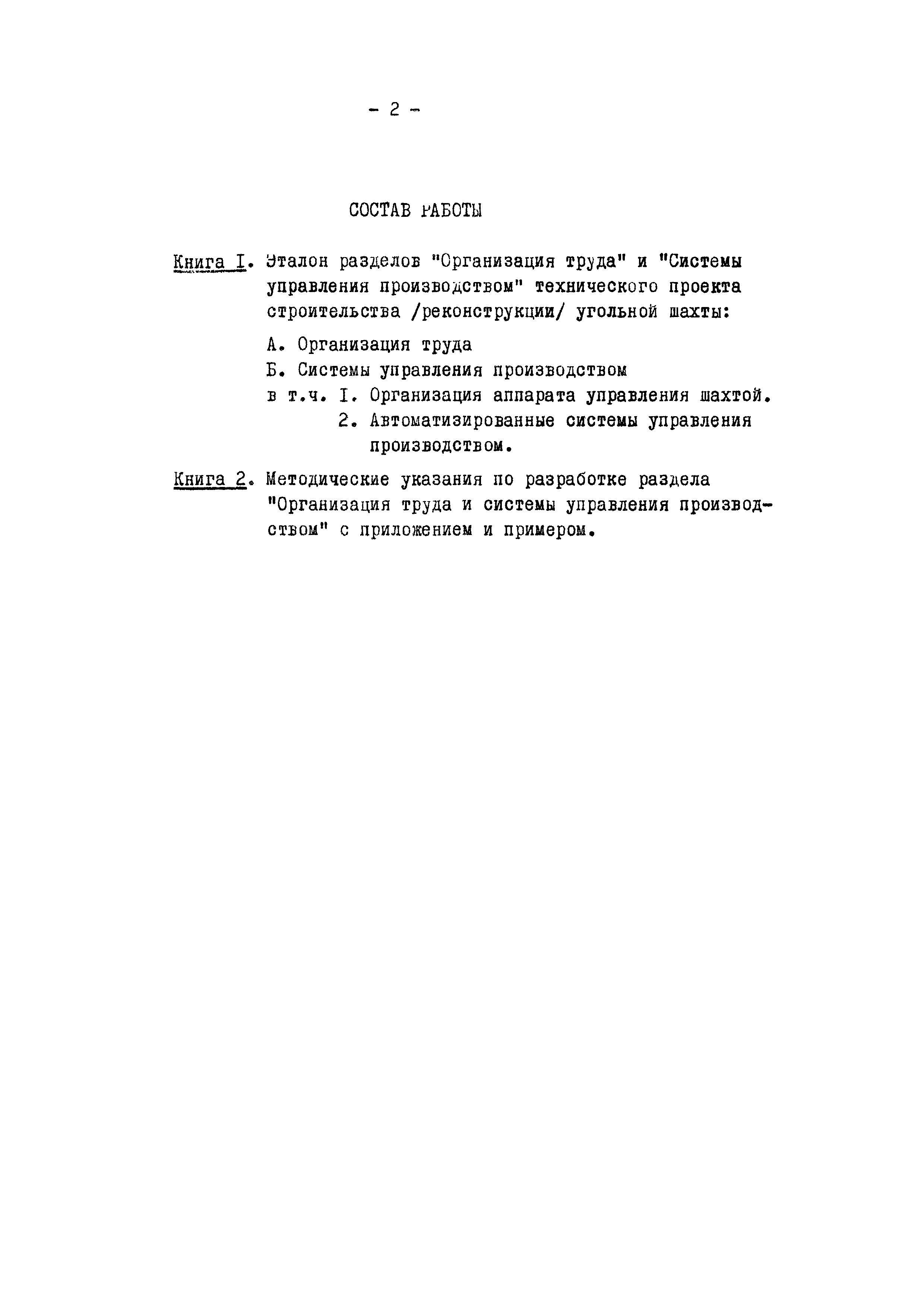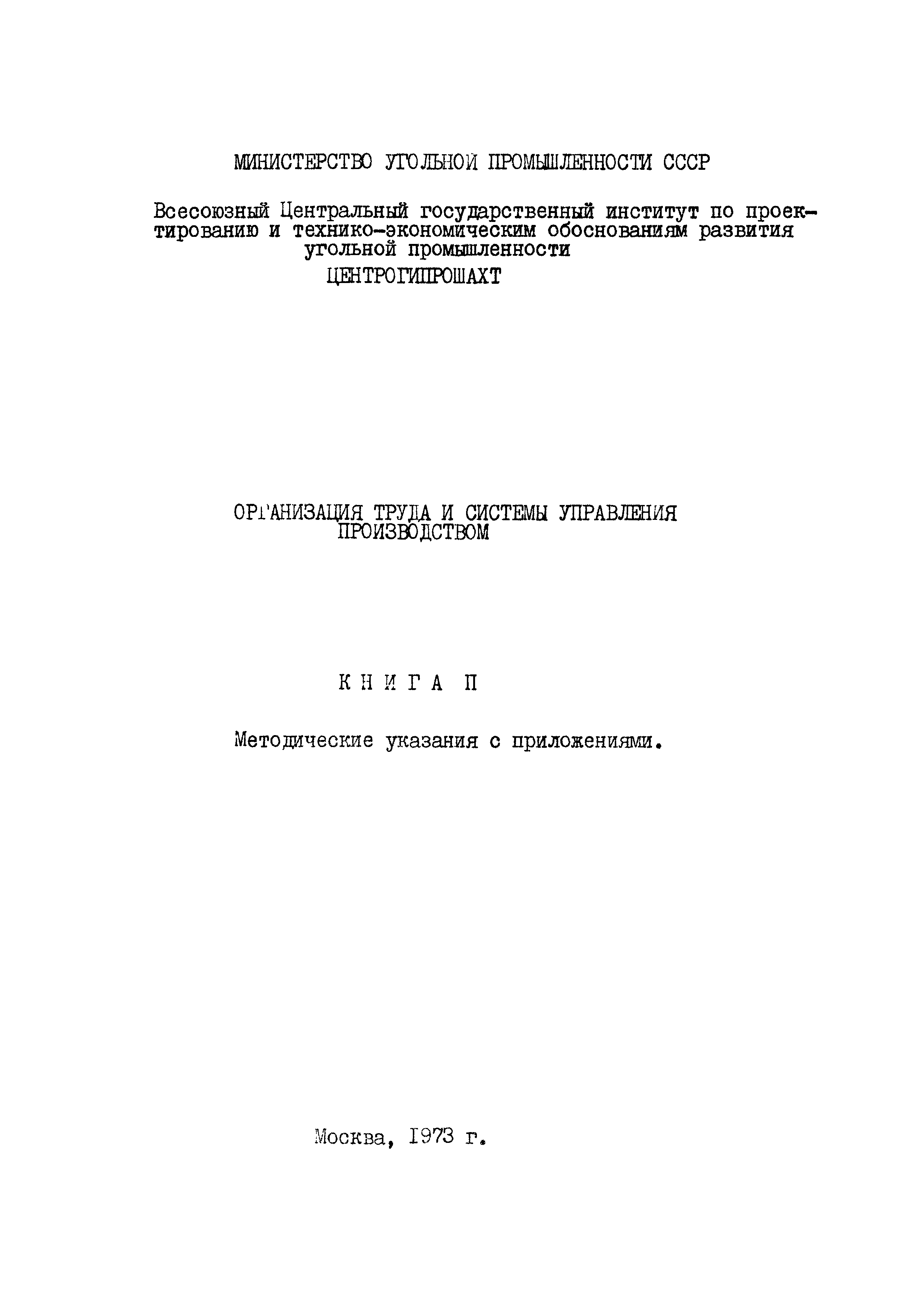 Организация труда и системы управления производством. Книга II. Методические указания| Статус: | справочные материалы, мп, тпр | | Название рус.: | Организация труда и системы управления производством. Книга II. Методические указания | | Дата добавления в базу: | 01.01.2021 | | Дата актуализации: | 01.01.2021 | | Оглавление: | А. Организация труда 1. Определение численного профессионально-квалификационного состава и источников обеспечения рабочей силой предприятия 2. Организация труда на рабочих местах 3. Организация обслуживания рабочих мест 4. Режим труда и отдыха рабочих 5. Мероприятия по научной организации труда Б. Системы управления производством 1. Организация аппарата управления 2. Автоматизированные системы управления производством Приложение 1. Перечень приборов для определения параметров внешней среды и санитарно-гигиенических условий труда на рабочих местах, рекомендуемых для применения в проектах Приложение 2 Перечень нормативных документов и рекомендуемых материалов по проектированию раздела Организация труда Приложение 3. Обслуживание трудящихся шахты Приложение 4. Состав материалов по вопросам НОТ, разрабатываемых под общим руководством главного инженера проекта Приложение 5. Состав материалов по вопросам НОТ разрабатываемых отделом ТЭО совместно с технологическими отделами Приложение 6. Состав материалов по вопросам НОТ, разрабатываемых технологическими отделами Приложение 7. Состав материалов по вопросам НОТ, разрабатываемых электромеханическим отделом Приложение 8. Состав материалов по вопросам НОТ, разрабатываемых сантехническим отделом Приложение 9. Состав материалов по вопросам НОТ, разрабатываемых отделом Генплана и Транспорта Приложение 10. Состав материалов по вопросам НОТ, разрабатываемых строительными отделами Приложение 11. Примерный перечень функций управления Приложение 12. Перечень основных технических средств, используемых для механизации и автоматизации инженерно-управленческих работ Приложение 13. Нормативы на проектирование условий труда персонала аппарата управления Приложение 14. Рекомендуемые цветовые сочетания для окраски оборудования и служебных помещений Приложение 15. Рабочее место (кабинет) главного бухгалтера Приложение 16. Рабочее место бухгалтера (старшего бухгалтера) Приложение 17. Рабочее место бухгалтера (старшего бухгалтера) Приложение 18. Рабочее место экономиста по финансовой работе Приложение ‚9. Рабочее место инженера по труду Приложение 20. Рабочее место инженера по нормированию Приложение 21. Рабочее место начальника ОТЗ Приложение 22. Пример | | Разработан: | Центргипрошахт Минуглепрома СССР