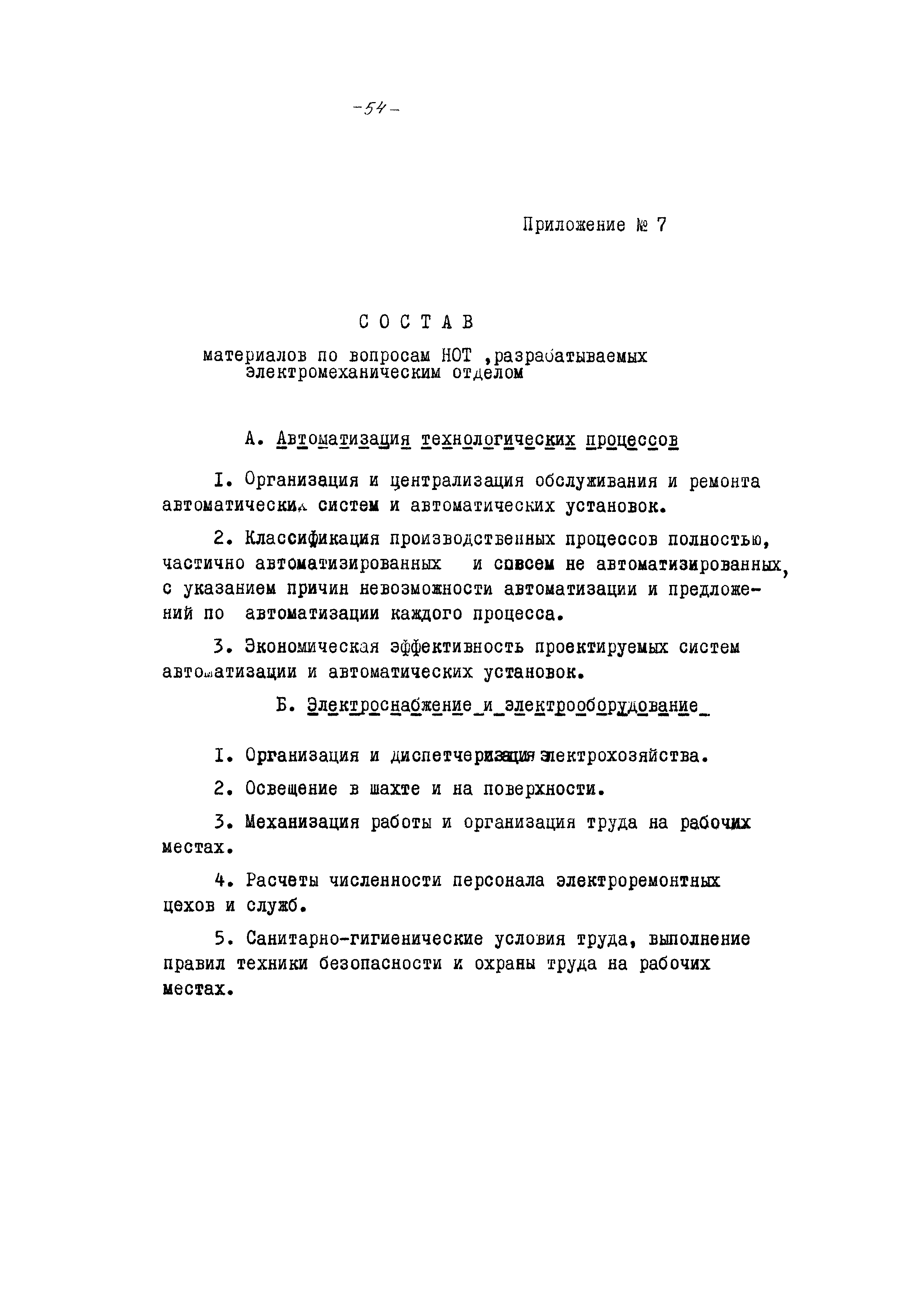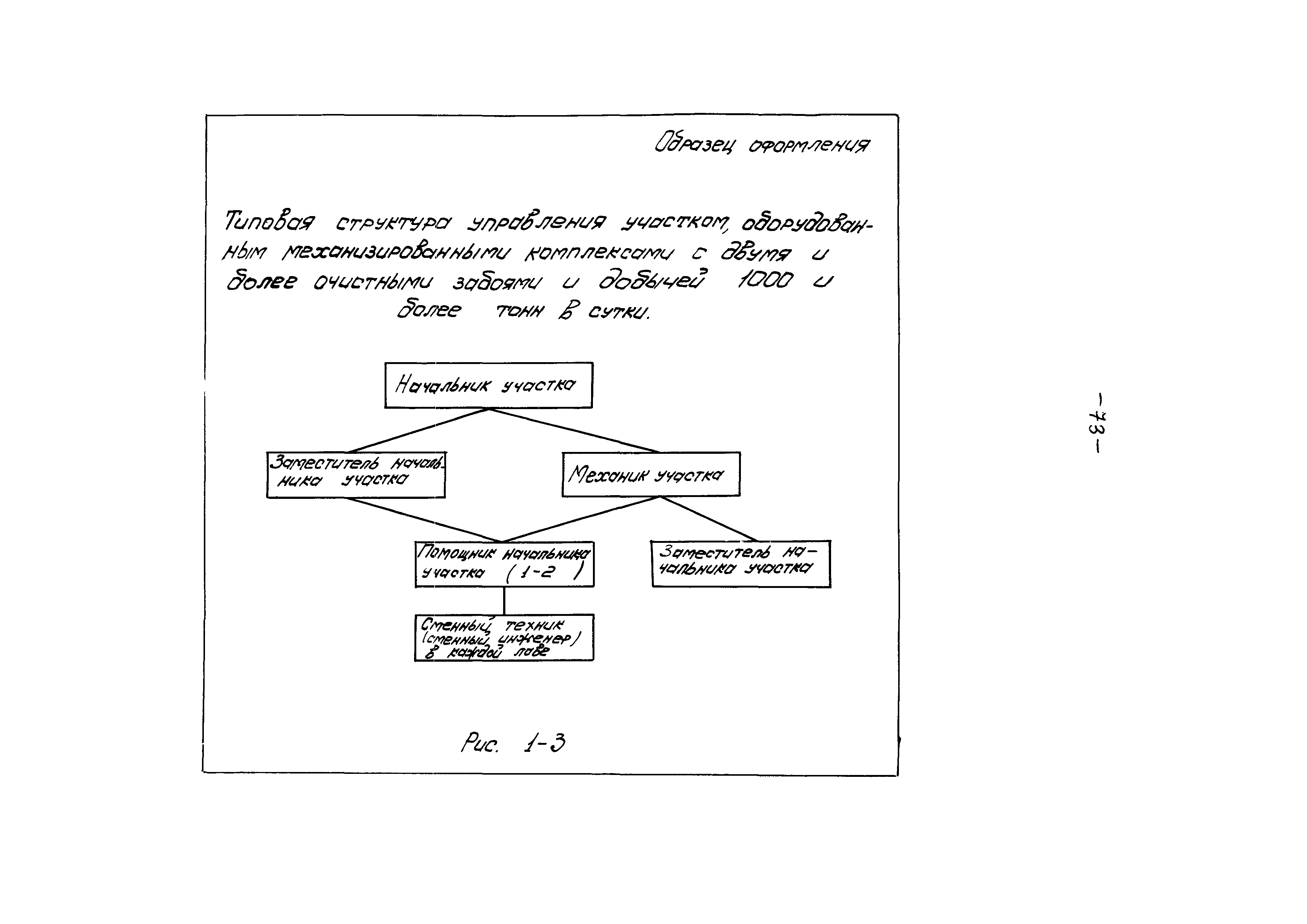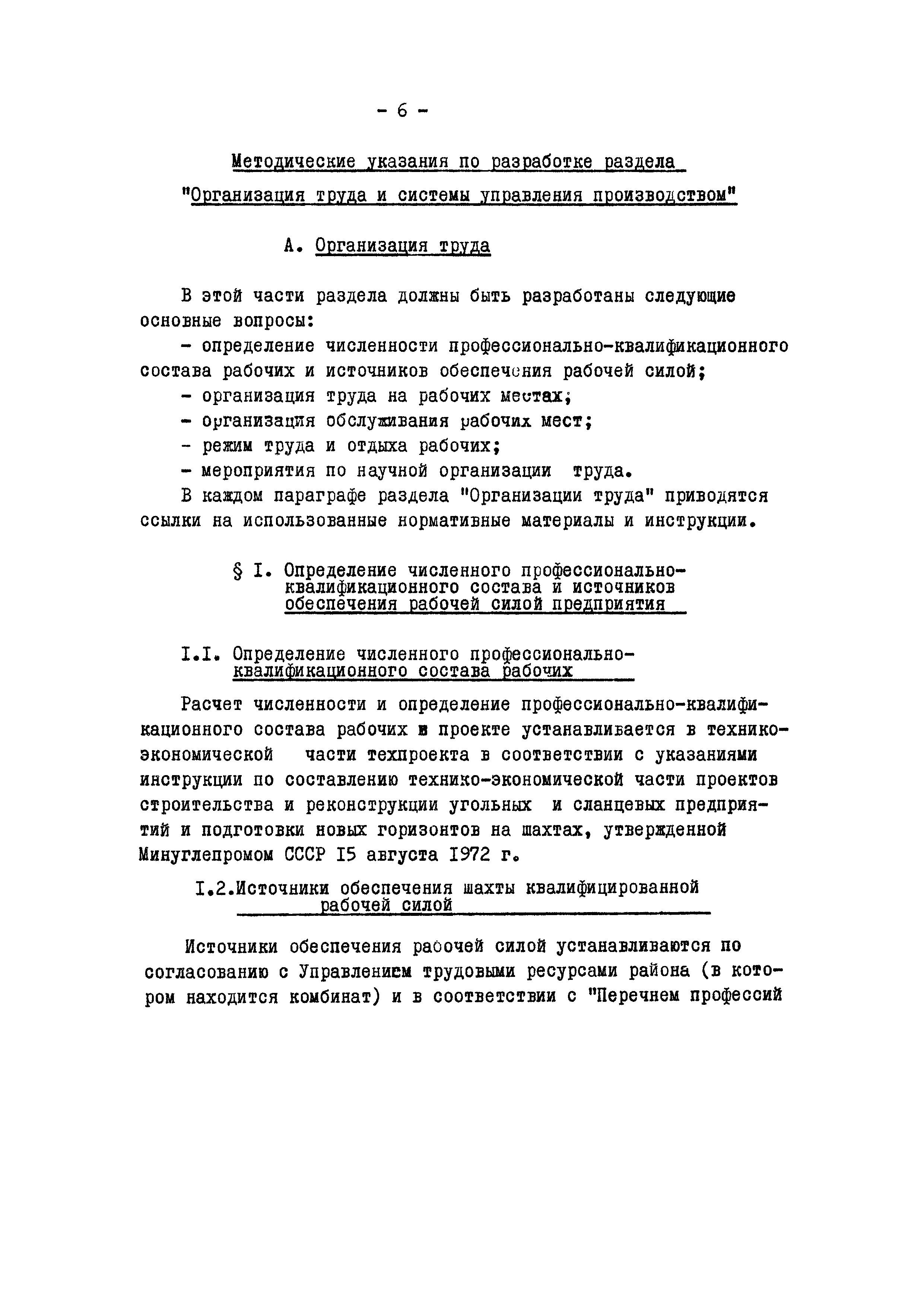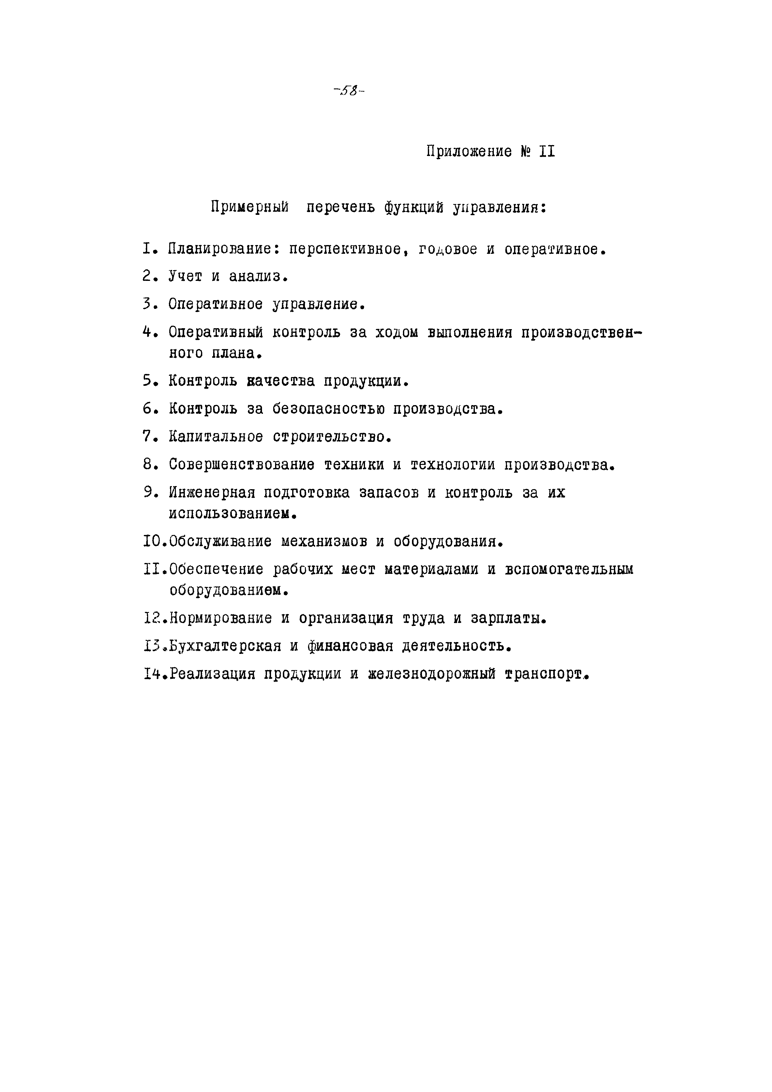 Организация труда и системы управления производством. Книга II. Методические указания| Статус: | справочные материалы, мп, тпр | | Название рус.: | Организация труда и системы управления производством. Книга II. Методические указания | | Дата добавления в базу: | 01.01.2021 | | Дата актуализации: | 01.01.2021 | | Оглавление: | А. Организация труда 1. Определение численного профессионально-квалификационного состава и источников обеспечения рабочей силой предприятия 2. Организация труда на рабочих местах 3. Организация обслуживания рабочих мест 4. Режим труда и отдыха рабочих 5. Мероприятия по научной организации труда Б. Системы управления производством 1. Организация аппарата управления 2. Автоматизированные системы управления производством Приложение 1. Перечень приборов для определения параметров внешней среды и санитарно-гигиенических условий труда на рабочих местах, рекомендуемых для применения в проектах Приложение 2 Перечень нормативных документов и рекомендуемых материалов по проектированию раздела Организация труда Приложение 3. Обслуживание трудящихся шахты Приложение 4. Состав материалов по вопросам НОТ, разрабатываемых под общим руководством главного инженера проекта Приложение 5. Состав материалов по вопросам НОТ разрабатываемых отделом ТЭО совместно с технологическими отделами Приложение 6. Состав материалов по вопросам НОТ, разрабатываемых технологическими отделами Приложение 7. Состав материалов по вопросам НОТ, разрабатываемых электромеханическим отделом Приложение 8. Состав материалов по вопросам НОТ, разрабатываемых сантехническим отделом Приложение 9. Состав материалов по вопросам НОТ, разрабатываемых отделом Генплана и Транспорта Приложение 10. Состав материалов по вопросам НОТ, разрабатываемых строительными отделами Приложение 11. Примерный перечень функций управления Приложение 12. Перечень основных технических средств, используемых для механизации и автоматизации инженерно-управленческих работ Приложение 13. Нормативы на проектирование условий труда персонала аппарата управления Приложение 14. Рекомендуемые цветовые сочетания для окраски оборудования и служебных помещений Приложение 15. Рабочее место (кабинет) главного бухгалтера Приложение 16. Рабочее место бухгалтера (старшего бухгалтера) Приложение 17. Рабочее место бухгалтера (старшего бухгалтера) Приложение 18. Рабочее место экономиста по финансовой работе Приложение ‚9. Рабочее место инженера по труду Приложение 20. Рабочее место инженера по нормированию Приложение 21. Рабочее место начальника ОТЗ Приложение 22. Пример | | Разработан: | Центргипрошахт Минуглепрома СССР