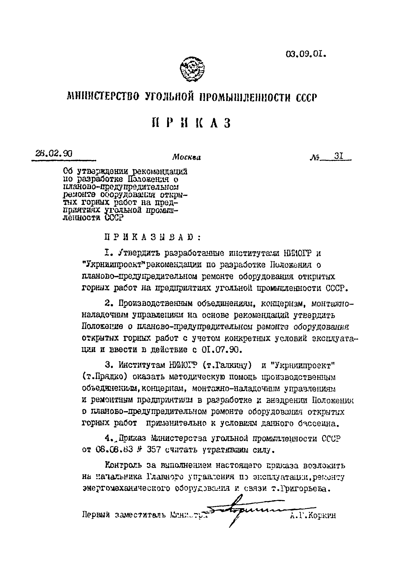 | | Утверждён: | 28.02.1990 Министерство угольной промышленности СССР (USSR Ministry of the Coal Industry 31)