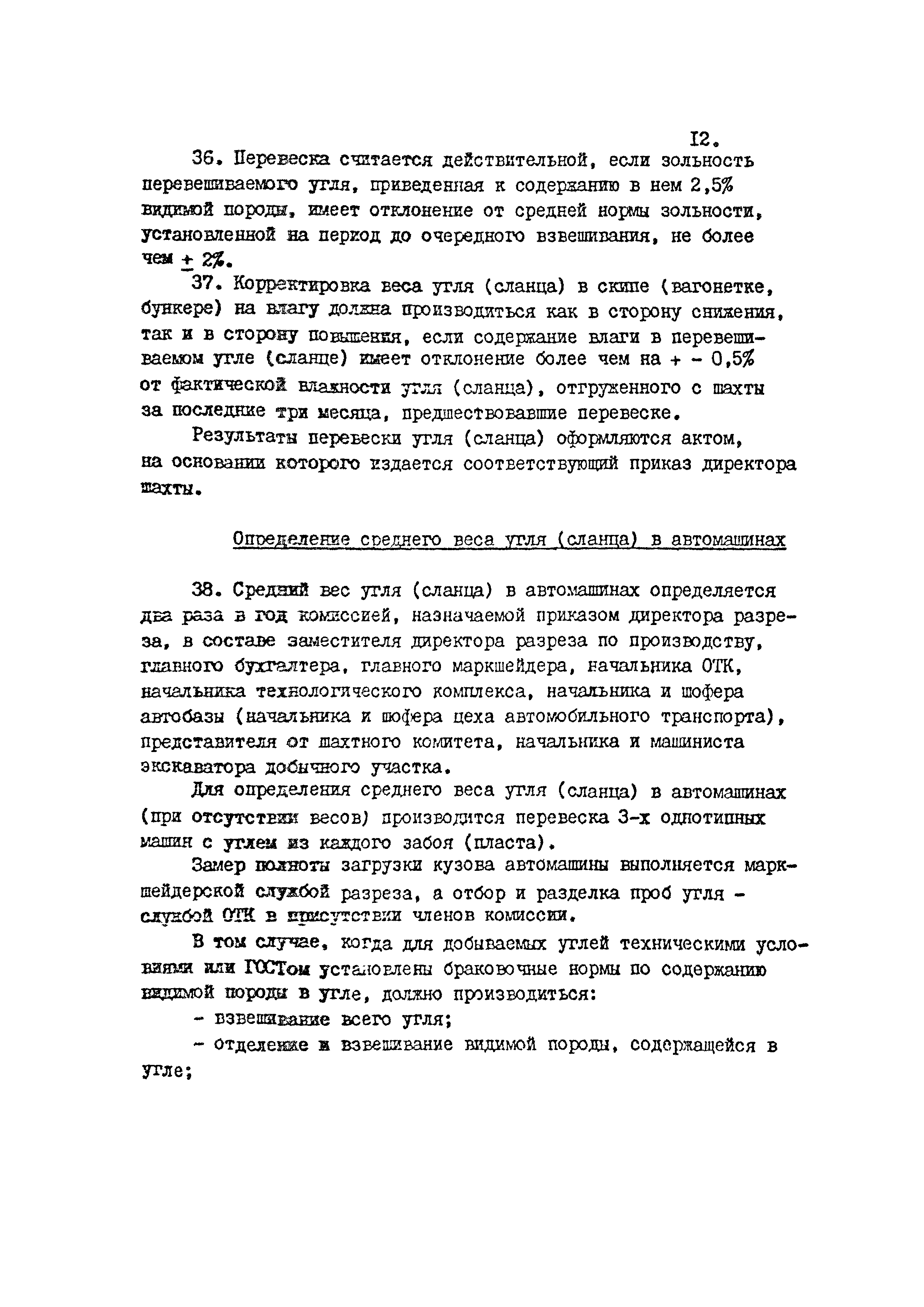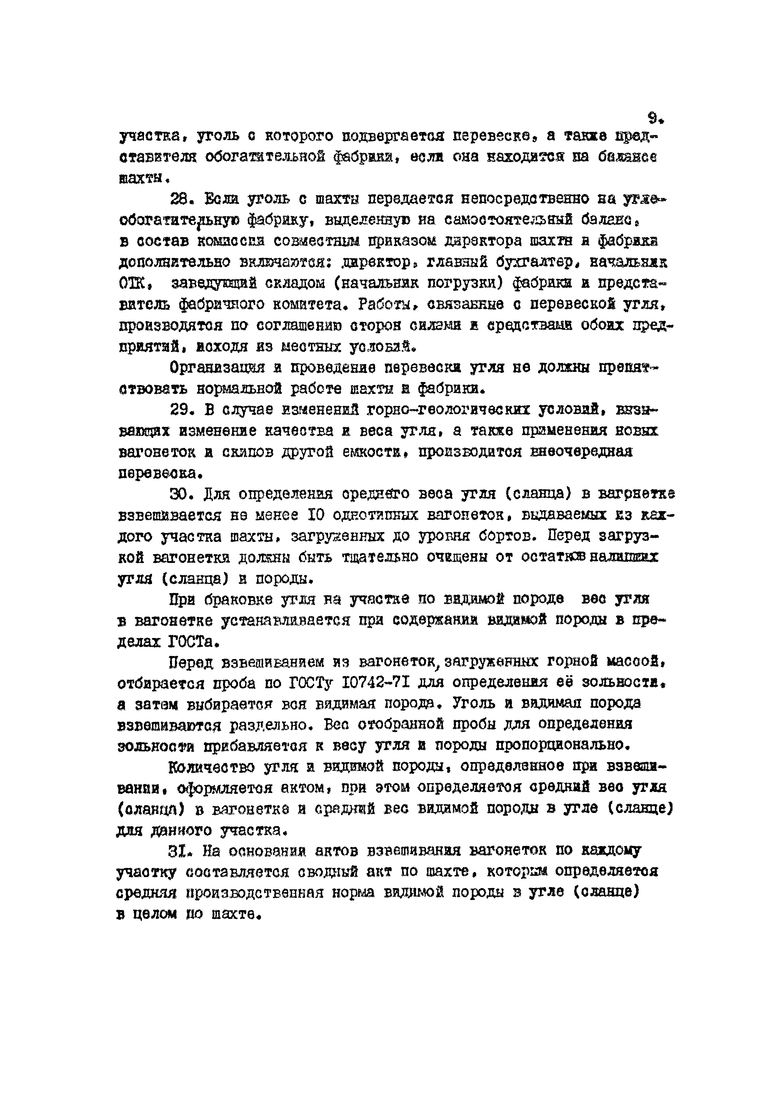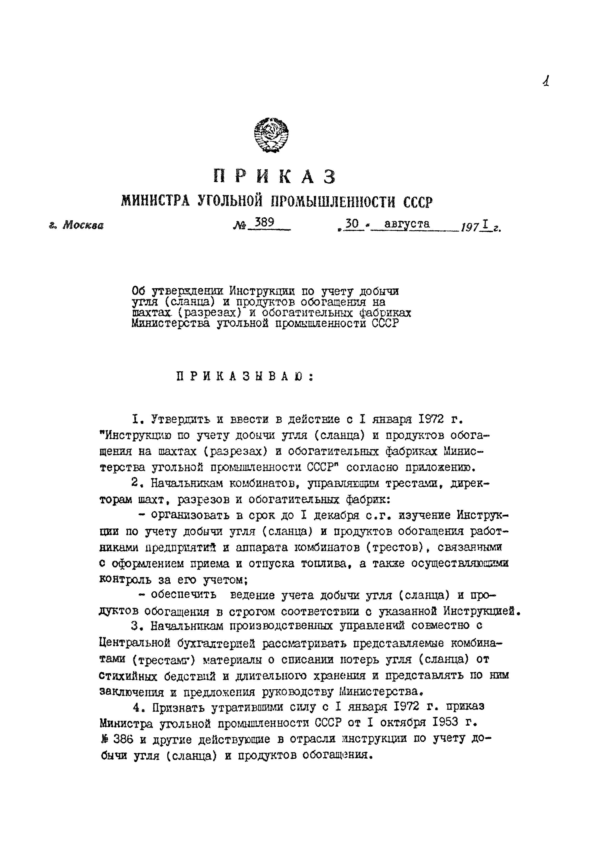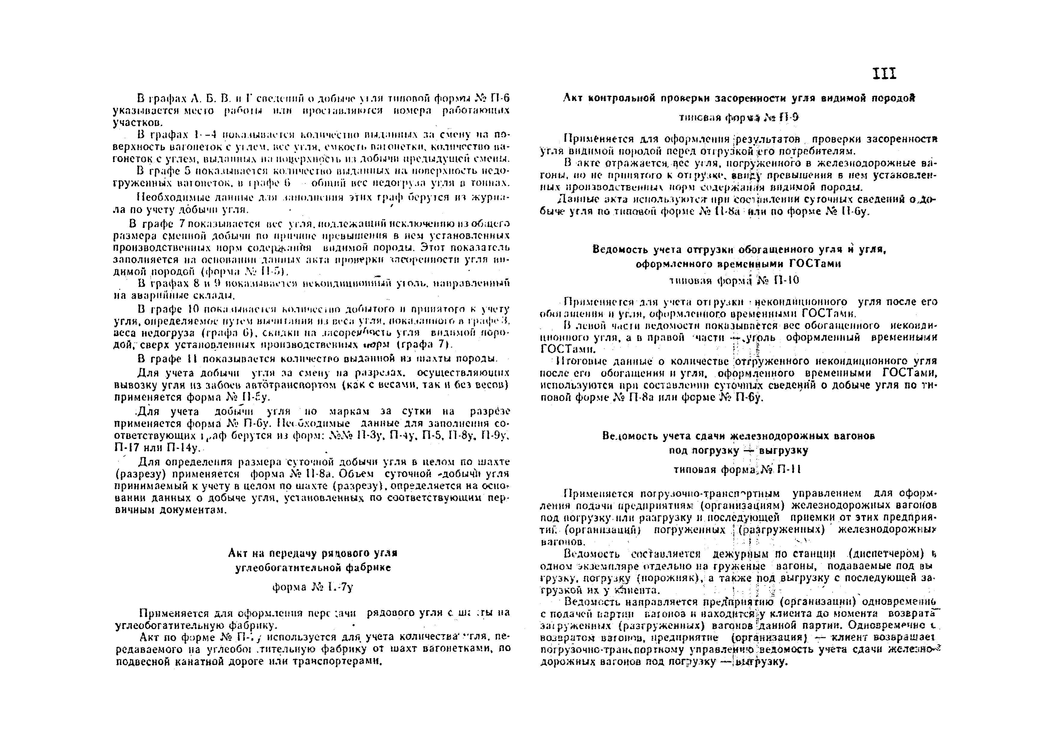 Инструкция по учету добычи угля (сланца) и продуктов обогащения на шахтах (разрезах) обогатительных фабриках Министерства угольной промышленности СССР| Статус: | действует | | Название рус.: | Инструкция по учету добычи угля (сланца) и продуктов обогащения на шахтах (разрезах) обогатительных фабриках Министерства угольной промышленности СССР | | Дата добавления в базу: | 01.01.2021 | | Дата актуализации: | 01.01.2021 | | Дата введения: | 01.01.1972 | | Область применения: | Инструкция определяет порядок учета добычи, переработки угля (сланца) и выпуска продуктов обогащения на предприятиях Министерства угольной промышленности СССР. | | Оглавление: | Общие положения Учет добычи угля (сланца) Порядок приемки угля на шахтах Порядок приемки угля (сланца) на разрезах Определение среднего веса угля в вагонетках, скипах, бункерах и автомашинах Определение среднего веса угля (сланца) в скипе (бункера) Определение среднего веса угля (сланца) в автомашинах Учет добычи угля за смену Учет добычи угля (сланца) на разрезах Учет добычи угля (сланца) по шахте и разрезу за сутки Учет добычи угля (сланца) за отчетный месяц Учет добычи угля на гидрошахтах Порядок приемки и учета рядового угля, передаваемого шахтами (разрезами) углеобогатительных фабрикам, и учета продуктов обогащения Приемка рядового угля обогатительными фабриками по количеству Приемка рядового угля обогатительными фабриками по качеству и порядок расчетов за принятый уголь Порядок учета рядового угля и продуктов обогащения Учет переработки угля и выпуска продуктов обогащения за смену Учет переработки угля и выпуска продуктов обогащения за сутки Учет переработки угля и выпуска продуктов обогащения за месяц Учет добычи угля в товарном исчислении по шахтам (разрезам), имеющим на своем балансе обогатительные фабрики Учет и замер угля (сланца) и продуктов обогащения на складах и в местах взвешивания вагонов и других емкостей Порядок списания потерь угля (сланца) и продуктов обогащения Ответственность за правильность учета добычи угля (сланца) и продуктов обогащения Образцы форм по учету добычи угля (сланца) и продуктов обогащения Краткие указания по применению и заполнению форм по учету добычи угля (сланца) и продуктов обогащения | | Утверждён: | 30.08.1971 Министерство угольной промышленности СССР (USSR Ministry of the Coal Industry 389)