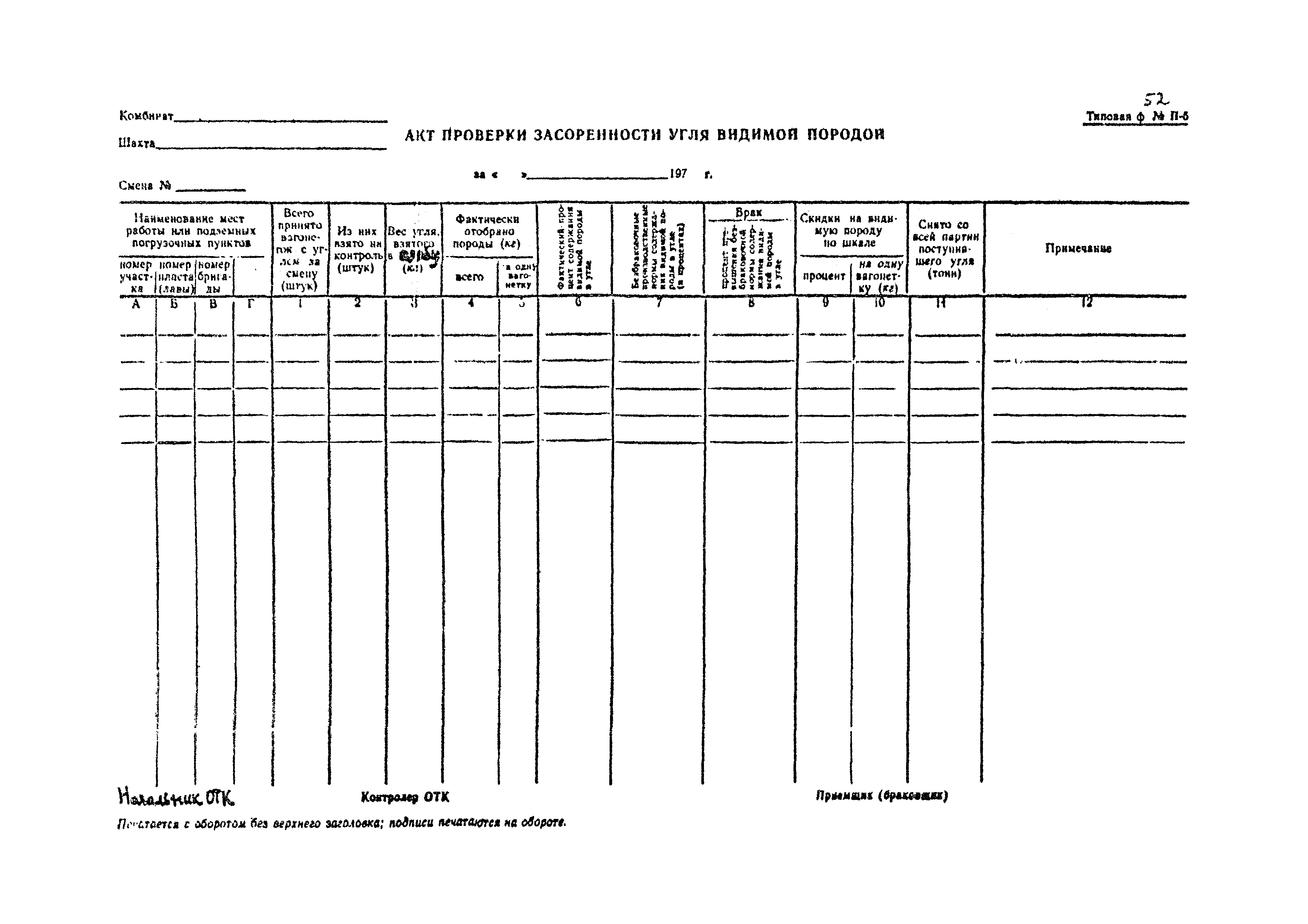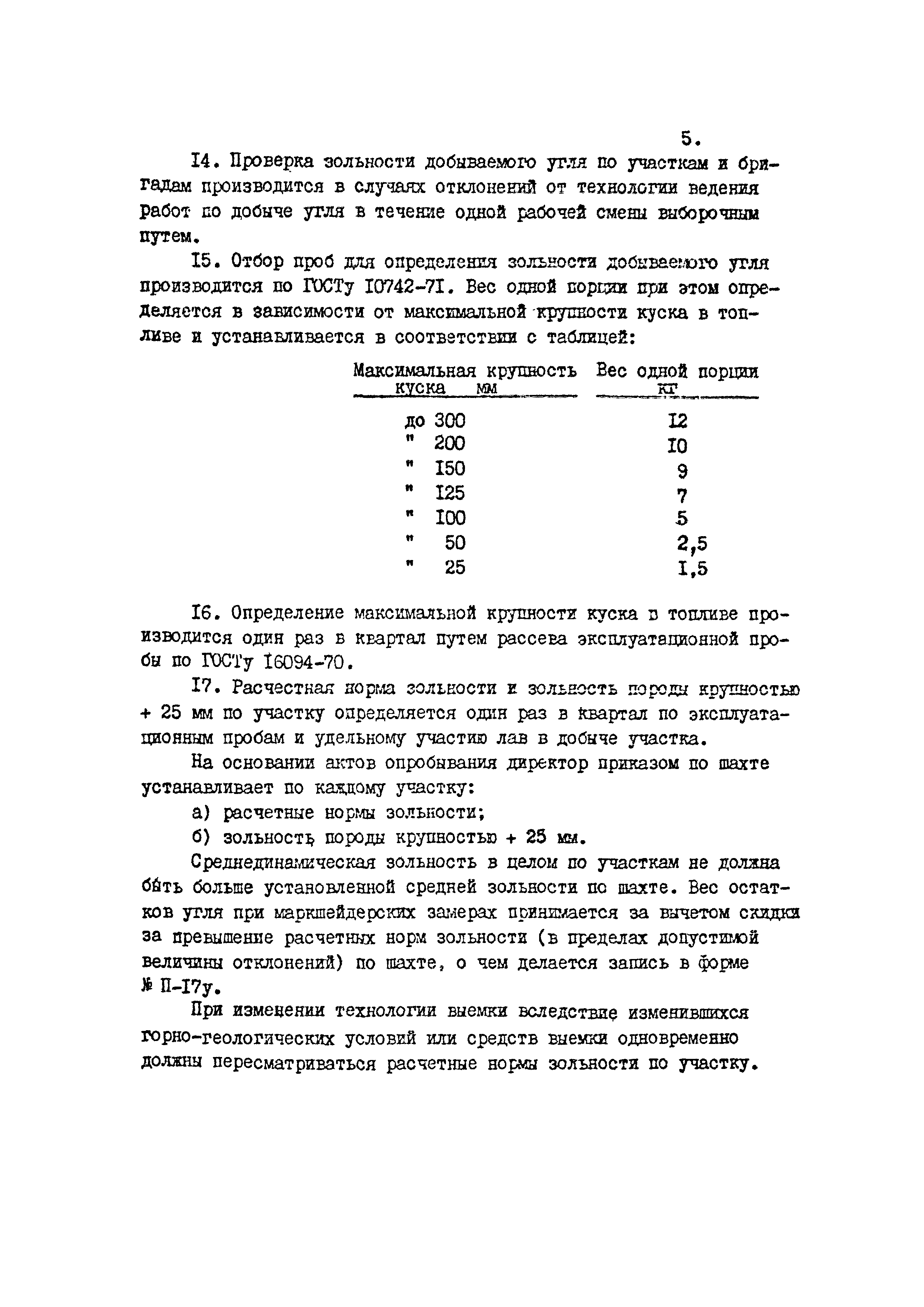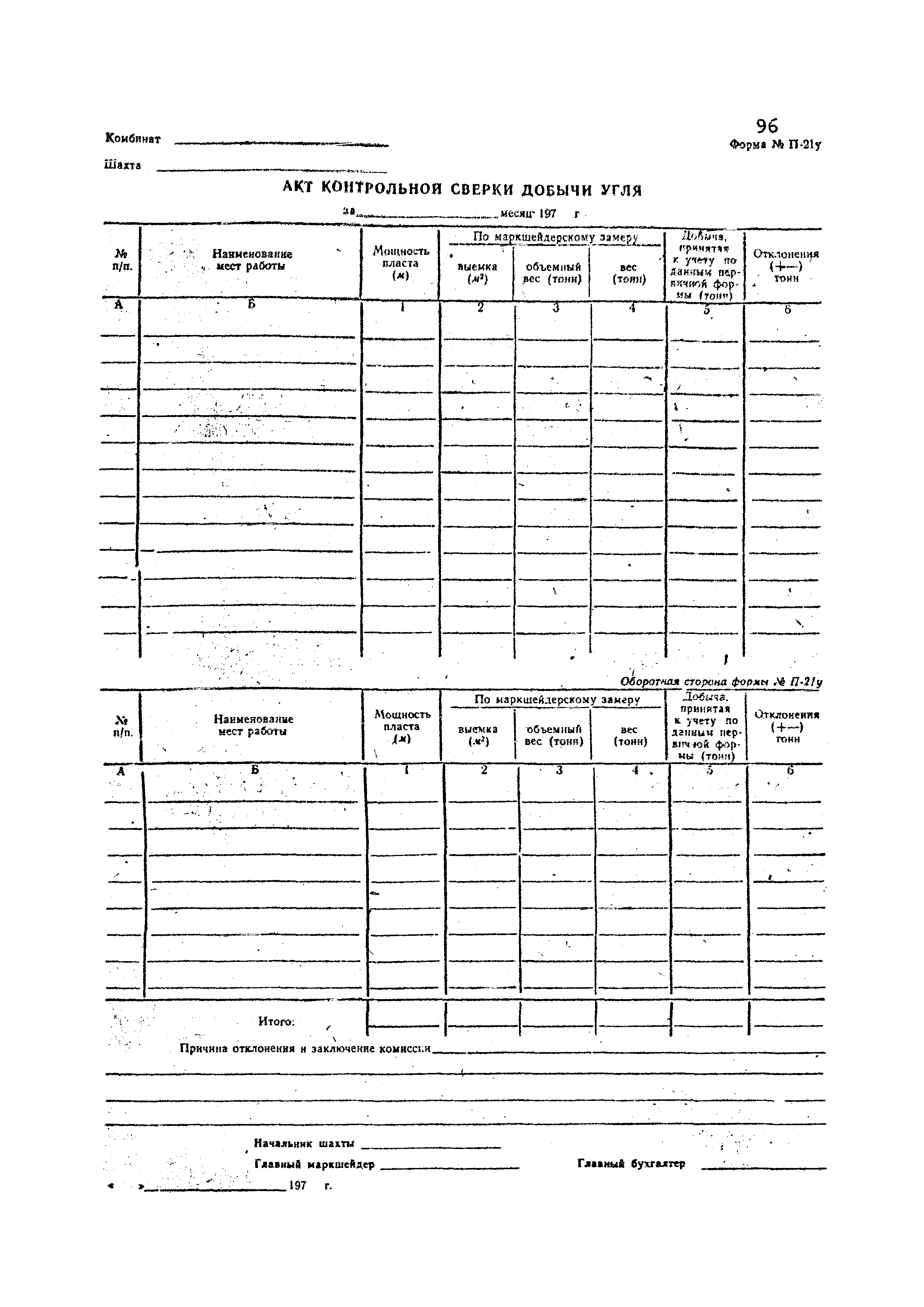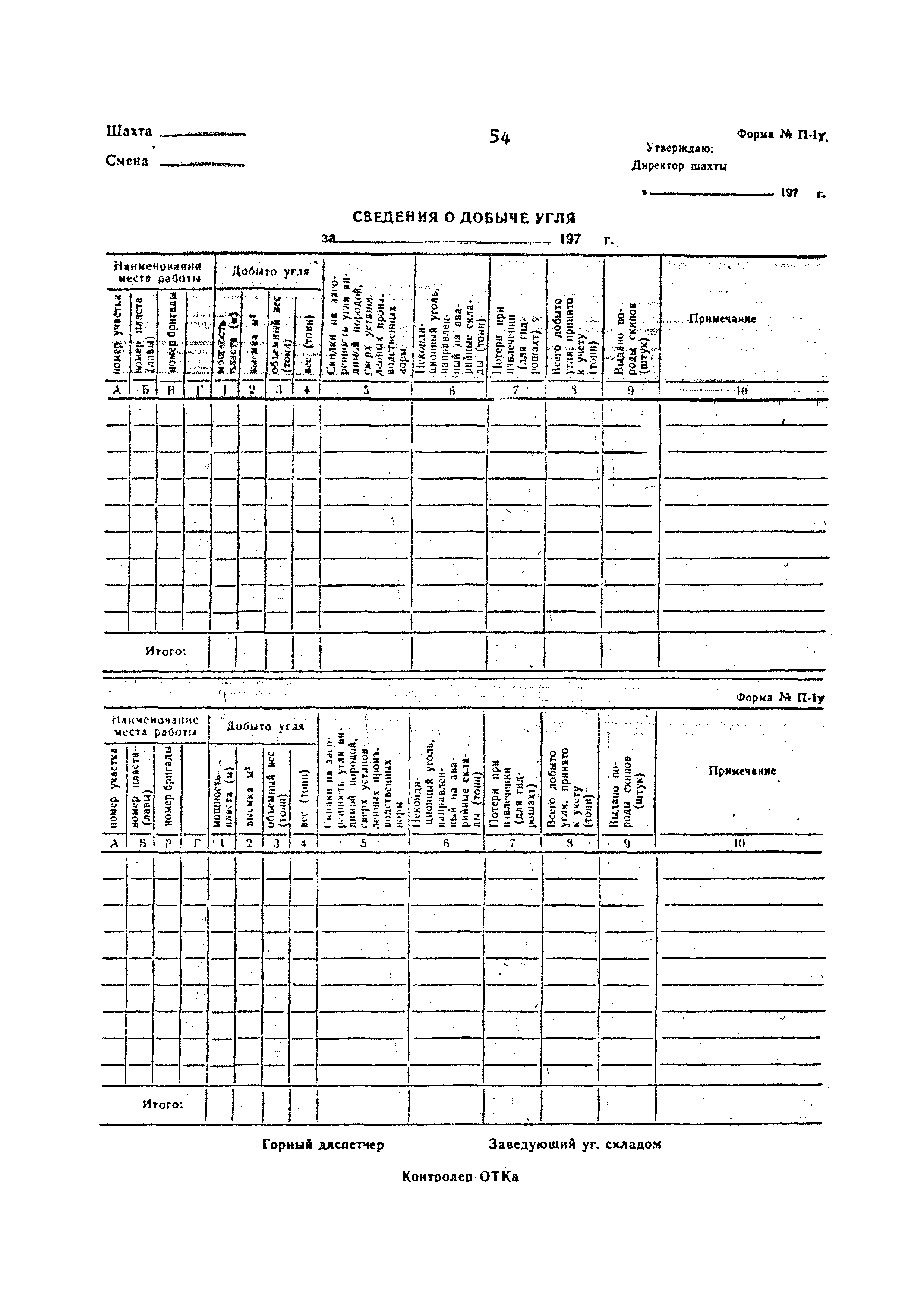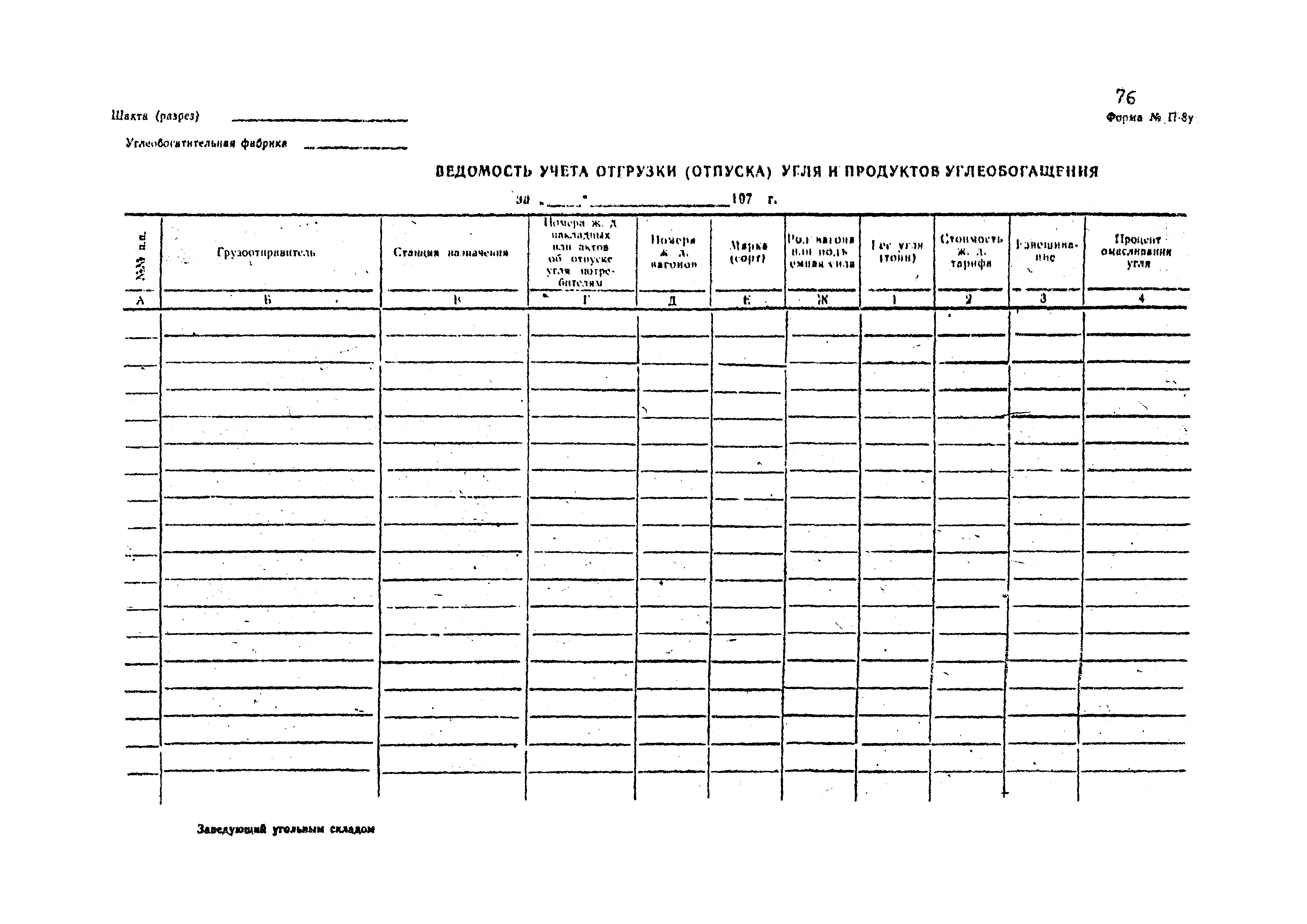 Инструкция по учету добычи угля (сланца) и продуктов обогащения на шахтах (разрезах) обогатительных фабриках Министерства угольной промышленности СССР| Статус: | действует | | Название рус.: | Инструкция по учету добычи угля (сланца) и продуктов обогащения на шахтах (разрезах) обогатительных фабриках Министерства угольной промышленности СССР | | Дата добавления в базу: | 01.01.2021 | | Дата актуализации: | 01.01.2021 | | Дата введения: | 01.01.1972 | | Область применения: | Инструкция определяет порядок учета добычи, переработки угля (сланца) и выпуска продуктов обогащения на предприятиях Министерства угольной промышленности СССР. | | Оглавление: | Общие положения Учет добычи угля (сланца) Порядок приемки угля на шахтах Порядок приемки угля (сланца) на разрезах Определение среднего веса угля в вагонетках, скипах, бункерах и автомашинах Определение среднего веса угля (сланца) в скипе (бункера) Определение среднего веса угля (сланца) в автомашинах Учет добычи угля за смену Учет добычи угля (сланца) на разрезах Учет добычи угля (сланца) по шахте и разрезу за сутки Учет добычи угля (сланца) за отчетный месяц Учет добычи угля на гидрошахтах Порядок приемки и учета рядового угля, передаваемого шахтами (разрезами) углеобогатительных фабрикам, и учета продуктов обогащения Приемка рядового угля обогатительными фабриками по количеству Приемка рядового угля обогатительными фабриками по качеству и порядок расчетов за принятый уголь Порядок учета рядового угля и продуктов обогащения Учет переработки угля и выпуска продуктов обогащения за смену Учет переработки угля и выпуска продуктов обогащения за сутки Учет переработки угля и выпуска продуктов обогащения за месяц Учет добычи угля в товарном исчислении по шахтам (разрезам), имеющим на своем балансе обогатительные фабрики Учет и замер угля (сланца) и продуктов обогащения на складах и в местах взвешивания вагонов и других емкостей Порядок списания потерь угля (сланца) и продуктов обогащения Ответственность за правильность учета добычи угля (сланца) и продуктов обогащения Образцы форм по учету добычи угля (сланца) и продуктов обогащения Краткие указания по применению и заполнению форм по учету добычи угля (сланца) и продуктов обогащения | | Утверждён: | 30.08.1971 Министерство угольной промышленности СССР (USSR Ministry of the Coal Industry 389)