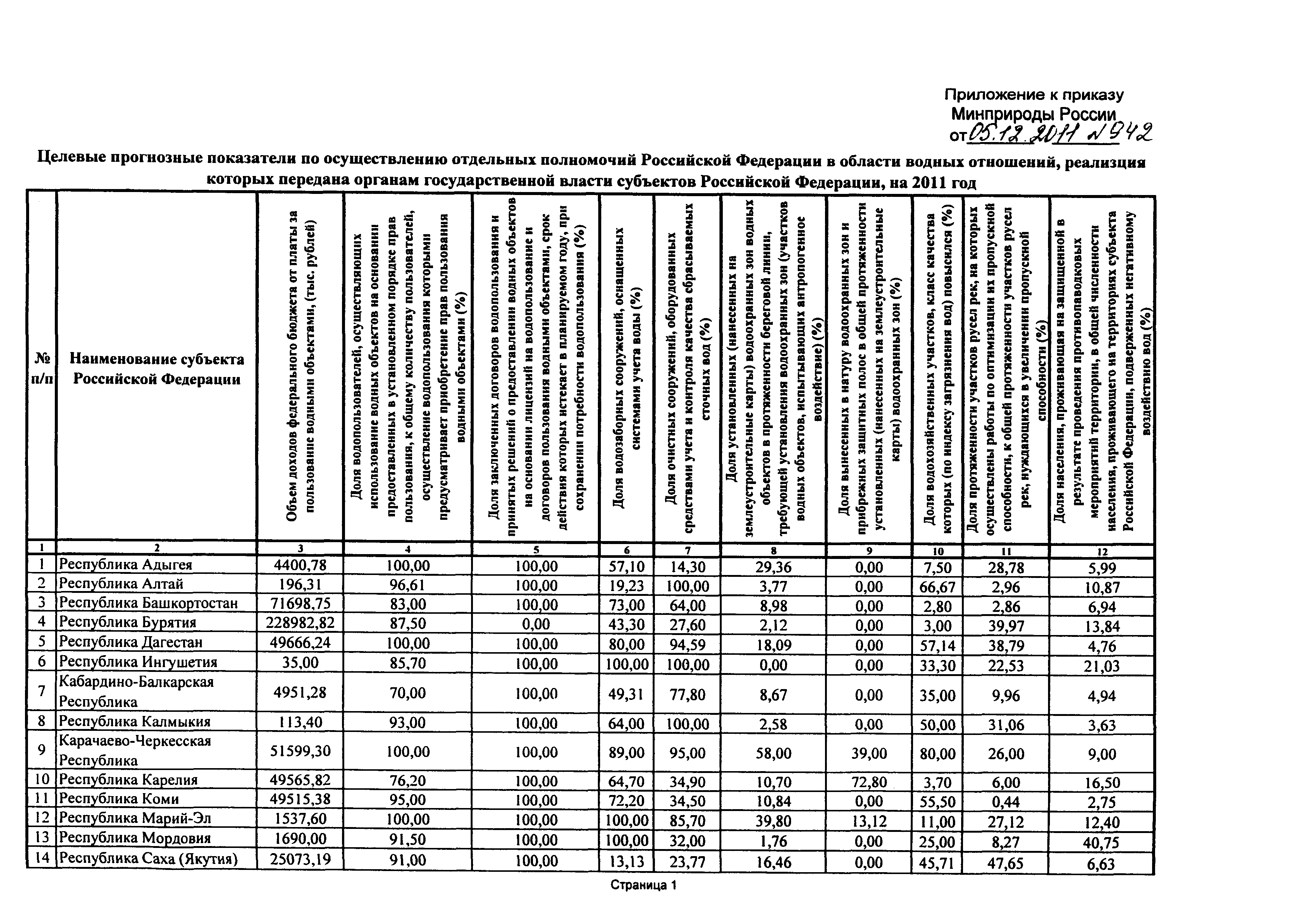 Целевые прогнозные показатели по осуществлению отдельных полномочий Российской Федерации в области водных отношений, реализация которых передана органам государственной власти субъектов Российской Федерации, на 2011 год| Статус: | действует | | Название рус.: | Целевые прогнозные показатели по осуществлению отдельных полномочий Российской Федерации в области водных отношений, реализация которых передана органам государственной власти субъектов Российской Федерации, на 2011 год | | Дата добавления в базу: | 01.02.2020 | | Дата актуализации: | 01.01.2021 | | Дата введения: | 23.03.2012 | | Утверждён: | 05.12.2011 Минприроды России (Russian Federation Minprirody 942)