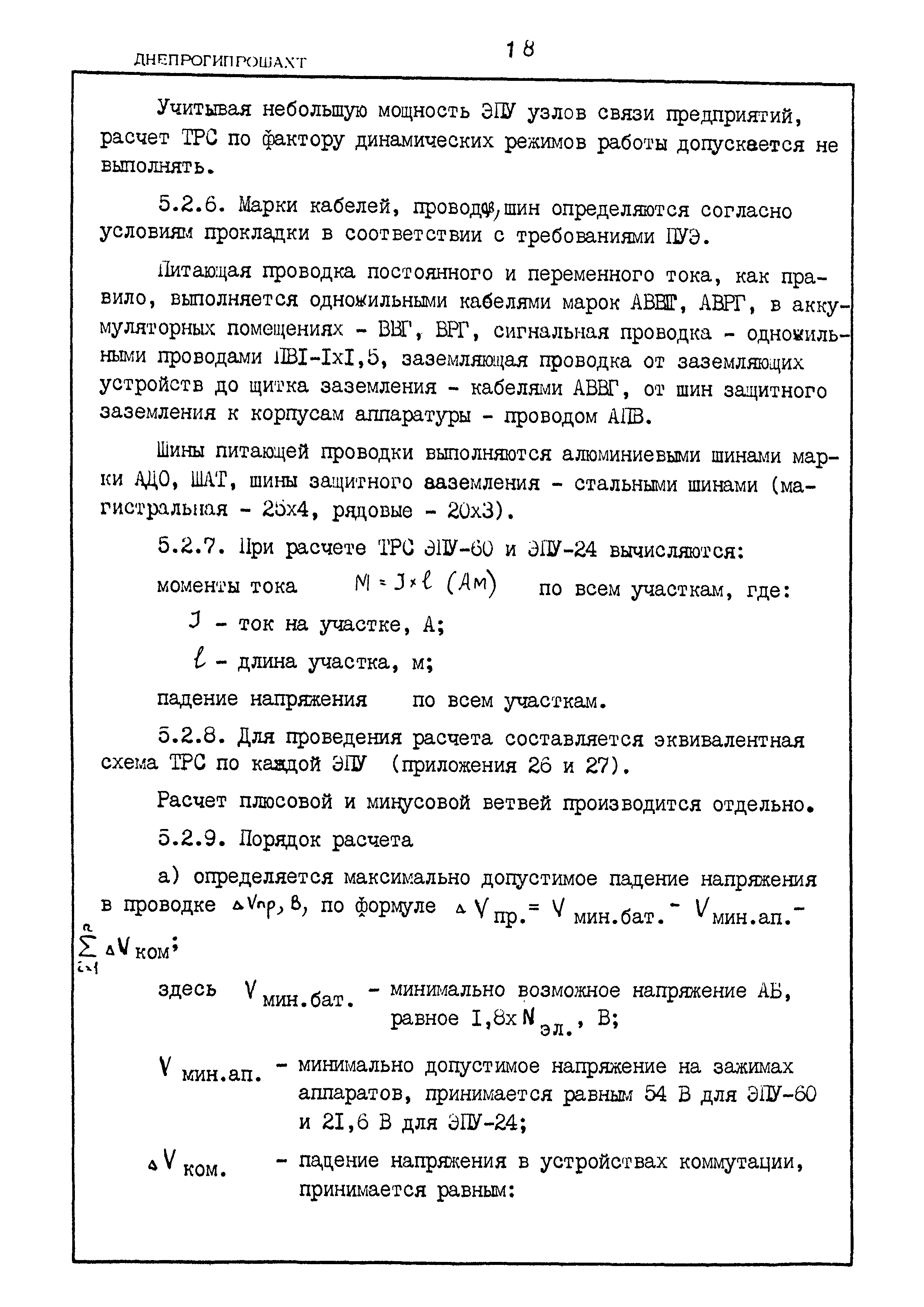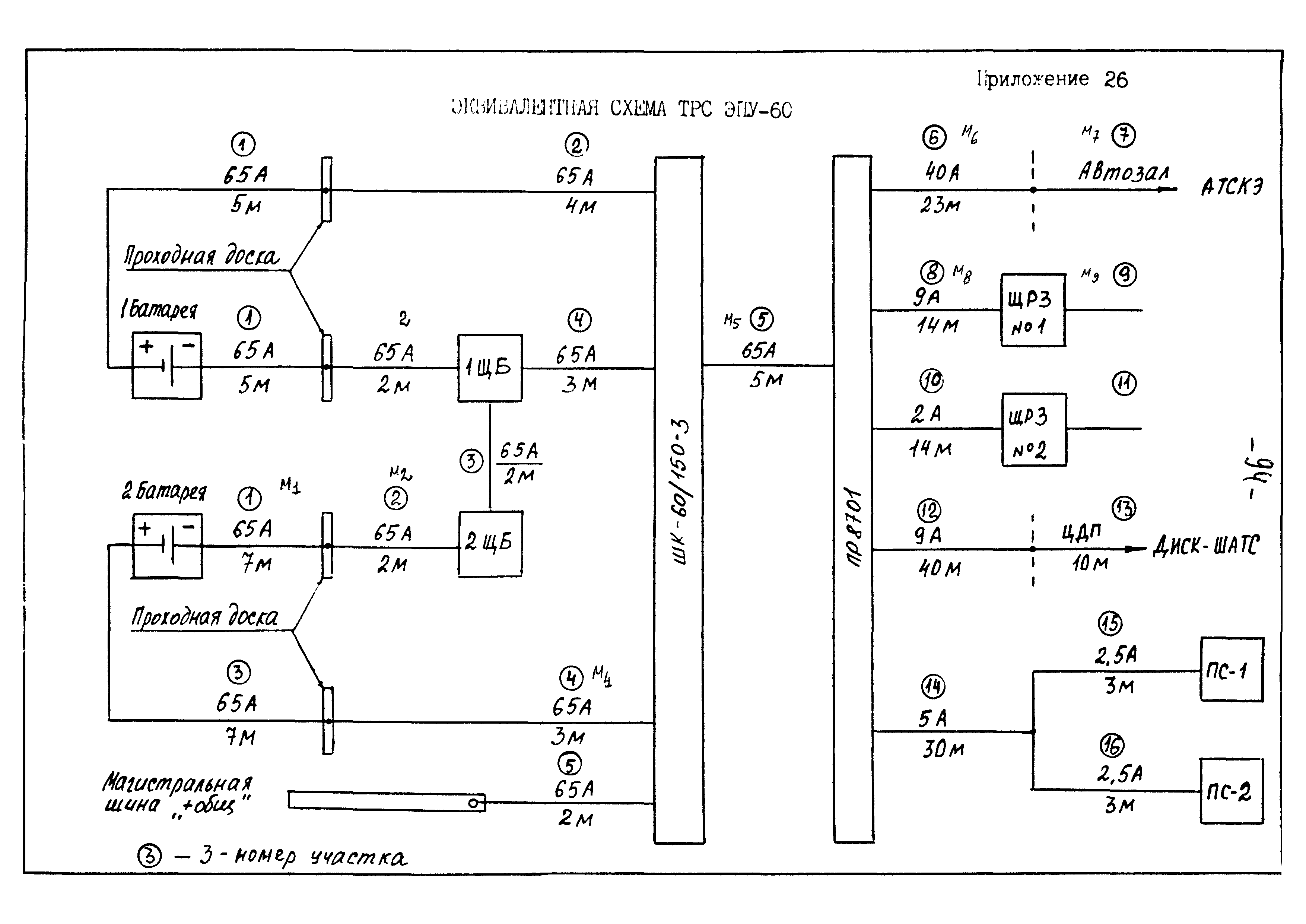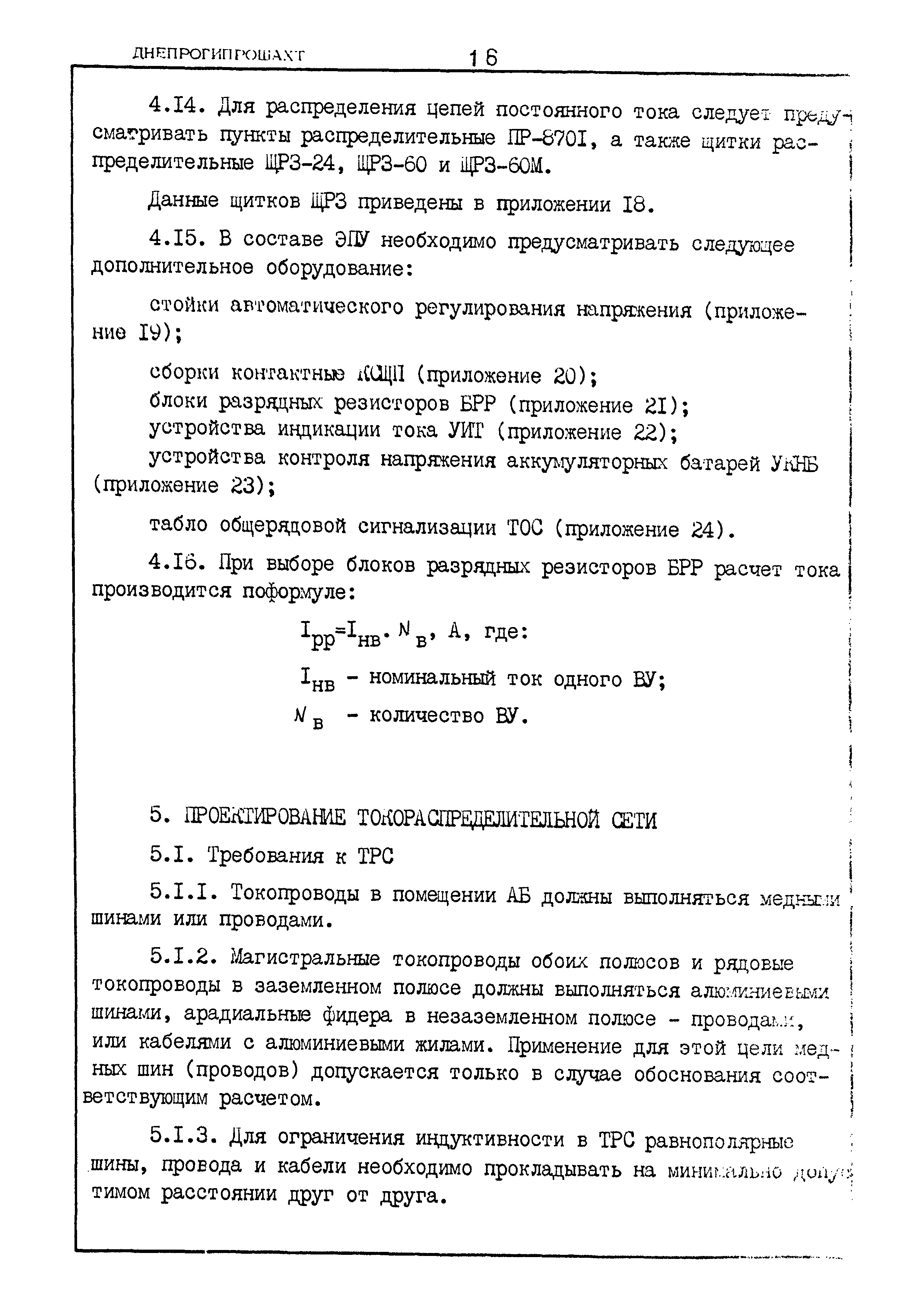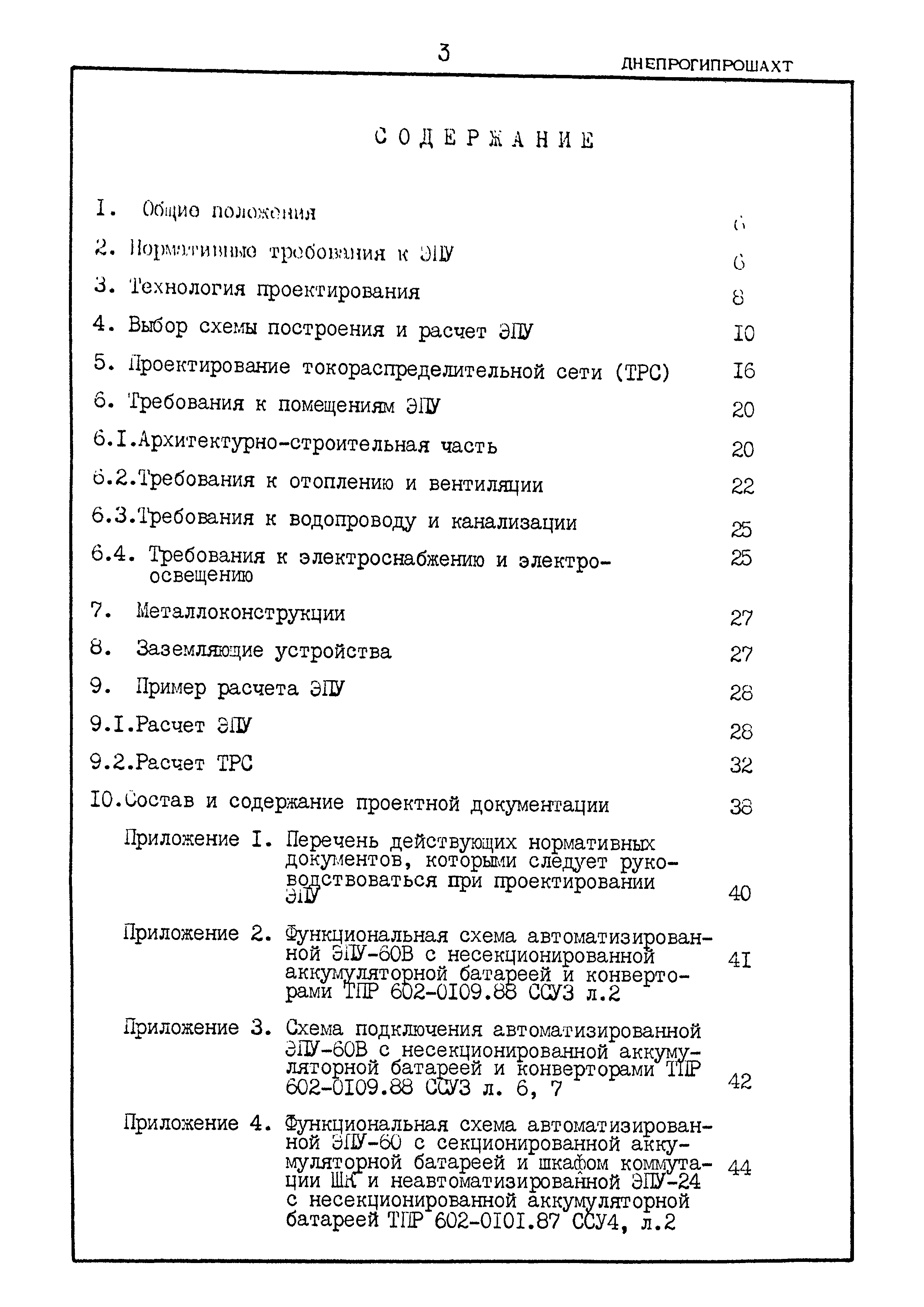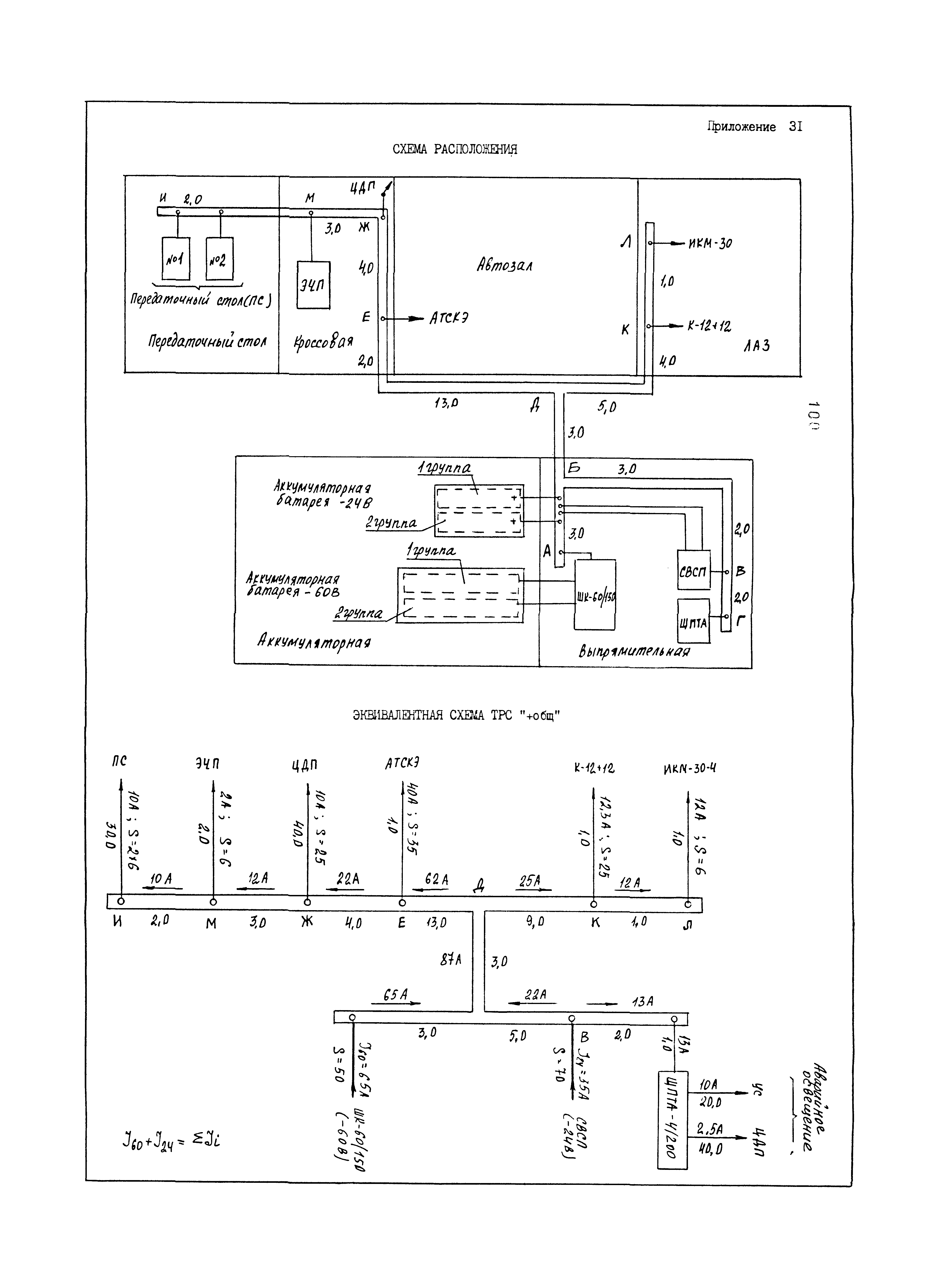 | Оглавление: | 1. Общие положения 2. Нормативные требования к ЭПУ 3. Технология проектирования 4. Выбор схемы построения и расчет ЭПУ 5. Проектирование токораспределительной сети (ТРС) 6. Требования к помещениям ЭПУ 6.1. Архитектурно-строительная часть 6.2. Требования к отоплению и вентиляции 6.3. Требования к водопроводу и канализации 6.4. Требования к электроснабжению и электроосвещению 7. Металлоконструкции 8. Заземляющие устройства 9. Пример расчета ЭПУ 9.1 Расчет ЭПУ 9.2. Расчет ТРС 10. Состав и содержание проектной документации Приложение 1 Перечень действующих нормативных документов, которым следует руководствоваться при проектировании ЭПУ Приложение 2 Функциональная схема автоматизированной ЭПУ-60В с несекционированной аккумуляторной батареей и конверторами Приложение 3 Схема подключения автоматизированной ЭПУ-60В с несекционированной аккумуляторной батареей и конверторами Приложение 4 Функциональная схема автоматизированной ЭПУ-60В с секционированной аккумуляторной батареей и шкафом коммутации ШК и неавтоматизированной ЭПУ-24 с несекционированной аккумуляторной батареей Приложение 5 Схема подключения автоматизированной ЭПУ-60В с секционированной аккумуляторной батареей и шкафом коммутации Приложение 6 Функциональная схема автоматизированных ЭПУ-60В с несекционированной аккумуляторной батареей и нелинейными сопротивлениями для регулирования напряжения на выходе ЭПУ-24 с секционированной аккумуляторной батареей, выпрямительными устройствами ВСП и коммутирующими устройствами Приложение 7 Схема подключения автоматизированной ЭПУ-60В с несекционированной аккумуляторной батареей и нелинейными сопротивлениями для регулирования напряжения на выходе ЭПУ Приложение 8 Функциональная схема неавтоматизированной ЭПУ-24В с секционированной аккумуляторной батареей, выпрямительными устройствами ВСП и коммутирующими устройствами Приложение 9 Схема подключение неавтоматизированной ЭПУ-24В с несекционированными аккумуляторными батареями Приложение 10 Технические данные конвекторов Приложение 11 Технические данные потребителей Приложение 12 Технические характеристики аккумуляторов типа СК ГОСТ 825-73 Приложение 13 Электрические характеристики аккумуляторов Приложение 14 Выпрямительные устройства Приложение 15 Технические данные шкафов управления с АВР Приложение 16 Техническая характеристика батарейных щитов щБ2 Приложение 17 Техническая характеристика щита переменного тока ЩПТА-4/200-2 Приложение 18 Техническая характеристика щитов ЩРЗ Приложение 19 Техническая характеристика стоек САРН Приложение 20 Техническая характеристика контактных сборок КСЩП Приложение 21 Блоки резисторов типа БРР Приложение 22 Устройства индикации тока УИТ Приложение 23 Техническая характеристика УКНБ Приложение 24 Техническая характеристика табло сигнализации ТОС-4 Приложение 25 Типовые чертежи шкафов для диодов Приложение 26 Эквивалентная схема ТРС ЭПУ-60 Приложение 27 Эквивалентная схема ТРС ЭПУ-24 Приложение 28 Таблица моментов тока для алюминиевой и медной проводки Приложение 29 Таблица моментов тока для алюминиевых шин Приложение 30 Схем расположения заземляющих устройств Приложение 31 Схема расположения и эквивалентная схема ТРС |