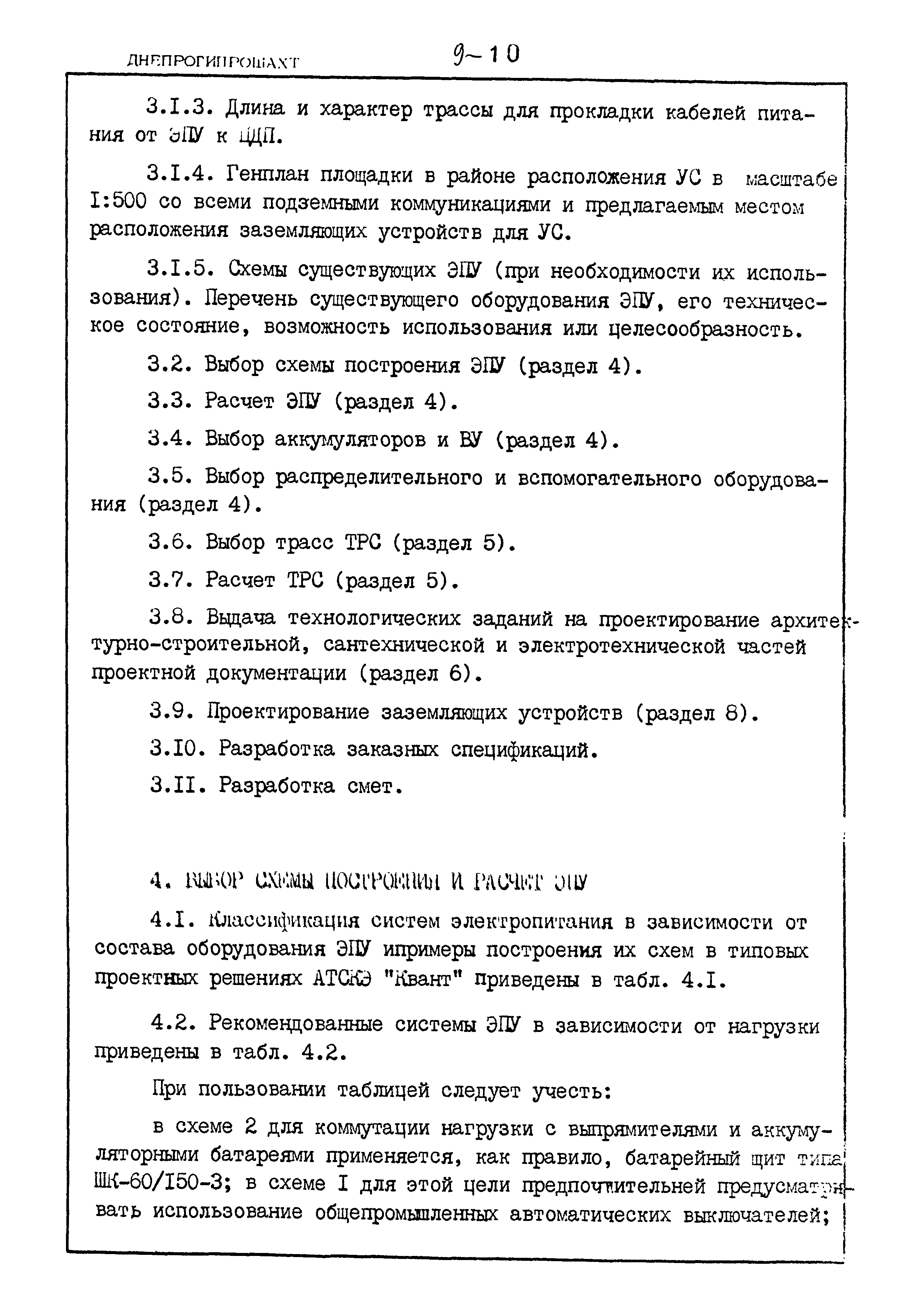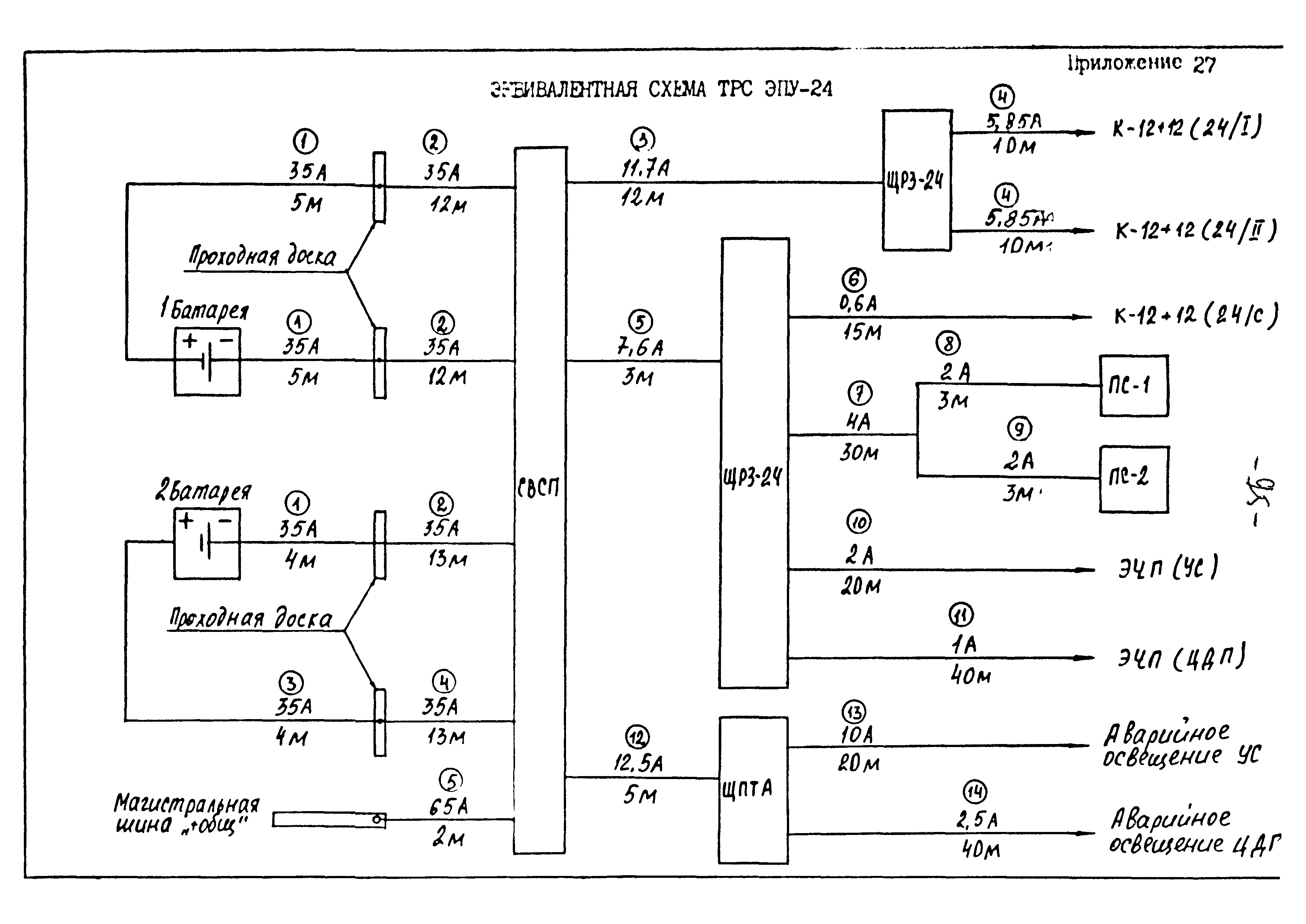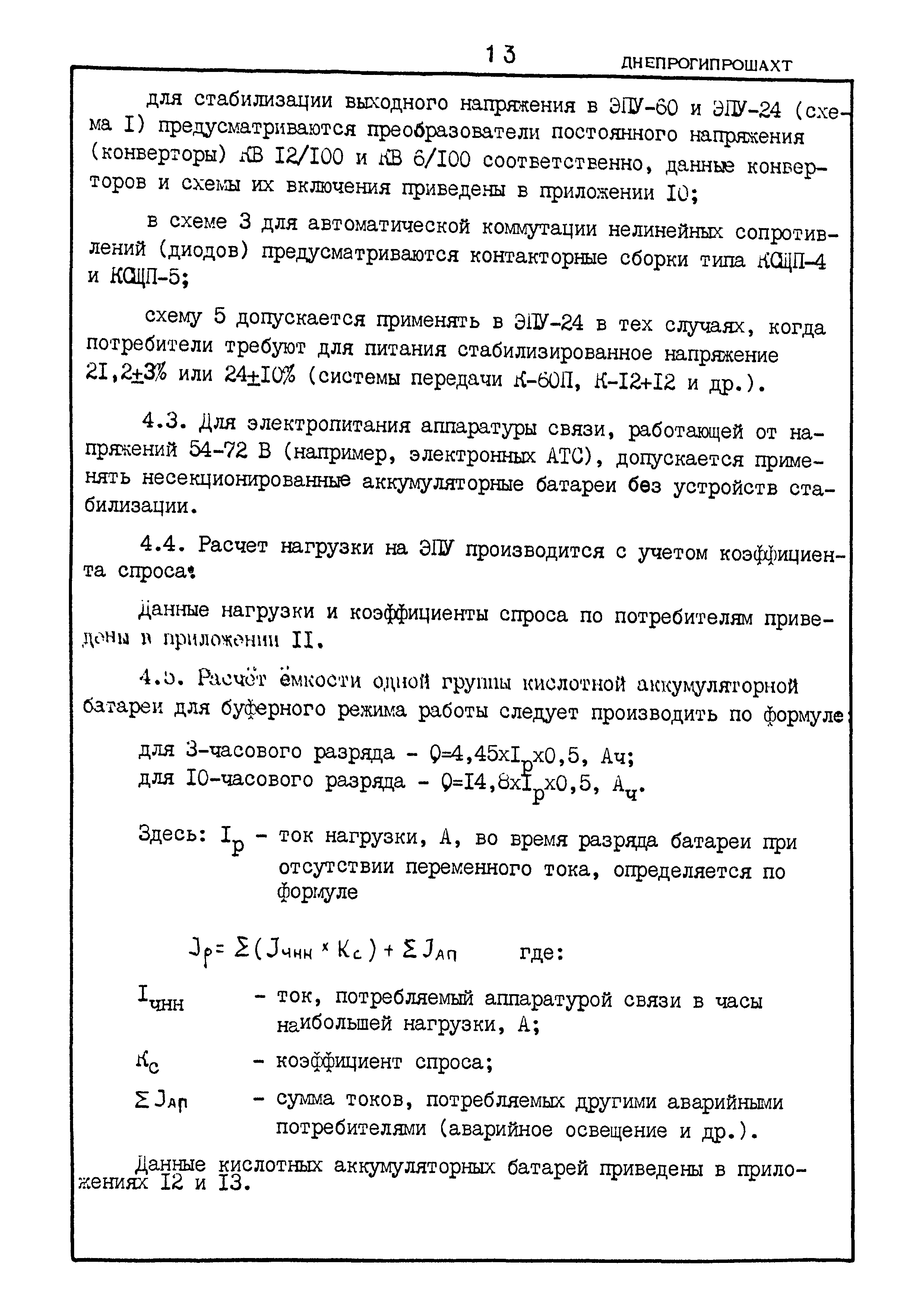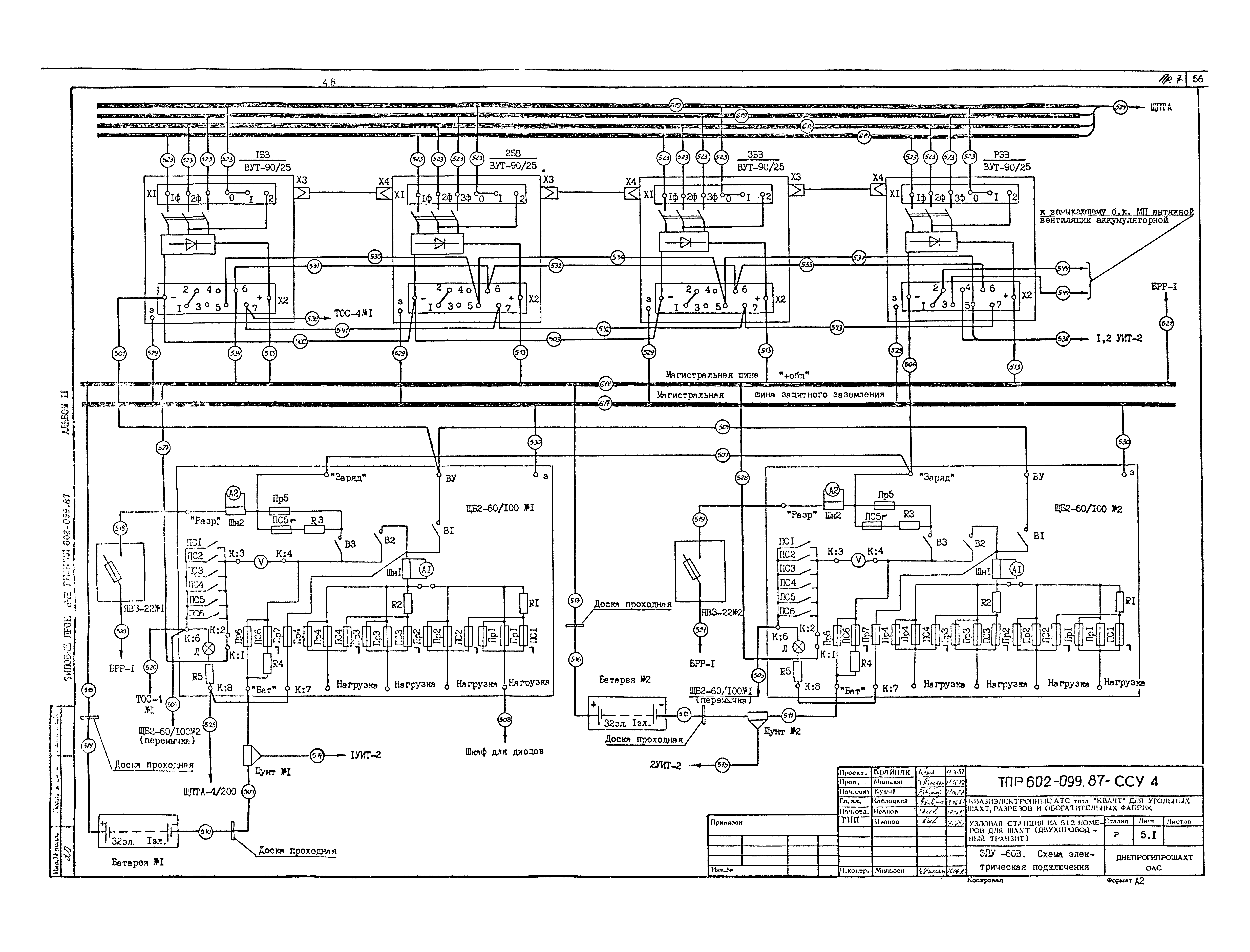 | Оглавление: | 1. Общие положения 2. Нормативные требования к ЭПУ 3. Технология проектирования 4. Выбор схемы построения и расчет ЭПУ 5. Проектирование токораспределительной сети (ТРС) 6. Требования к помещениям ЭПУ 6.1. Архитектурно-строительная часть 6.2. Требования к отоплению и вентиляции 6.3. Требования к водопроводу и канализации 6.4. Требования к электроснабжению и электроосвещению 7. Металлоконструкции 8. Заземляющие устройства 9. Пример расчета ЭПУ 9.1 Расчет ЭПУ 9.2. Расчет ТРС 10. Состав и содержание проектной документации Приложение 1 Перечень действующих нормативных документов, которым следует руководствоваться при проектировании ЭПУ Приложение 2 Функциональная схема автоматизированной ЭПУ-60В с несекционированной аккумуляторной батареей и конверторами Приложение 3 Схема подключения автоматизированной ЭПУ-60В с несекционированной аккумуляторной батареей и конверторами Приложение 4 Функциональная схема автоматизированной ЭПУ-60В с секционированной аккумуляторной батареей и шкафом коммутации ШК и неавтоматизированной ЭПУ-24 с несекционированной аккумуляторной батареей Приложение 5 Схема подключения автоматизированной ЭПУ-60В с секционированной аккумуляторной батареей и шкафом коммутации Приложение 6 Функциональная схема автоматизированных ЭПУ-60В с несекционированной аккумуляторной батареей и нелинейными сопротивлениями для регулирования напряжения на выходе ЭПУ-24 с секционированной аккумуляторной батареей, выпрямительными устройствами ВСП и коммутирующими устройствами Приложение 7 Схема подключения автоматизированной ЭПУ-60В с несекционированной аккумуляторной батареей и нелинейными сопротивлениями для регулирования напряжения на выходе ЭПУ Приложение 8 Функциональная схема неавтоматизированной ЭПУ-24В с секционированной аккумуляторной батареей, выпрямительными устройствами ВСП и коммутирующими устройствами Приложение 9 Схема подключение неавтоматизированной ЭПУ-24В с несекционированными аккумуляторными батареями Приложение 10 Технические данные конвекторов Приложение 11 Технические данные потребителей Приложение 12 Технические характеристики аккумуляторов типа СК ГОСТ 825-73 Приложение 13 Электрические характеристики аккумуляторов Приложение 14 Выпрямительные устройства Приложение 15 Технические данные шкафов управления с АВР Приложение 16 Техническая характеристика батарейных щитов щБ2 Приложение 17 Техническая характеристика щита переменного тока ЩПТА-4/200-2 Приложение 18 Техническая характеристика щитов ЩРЗ Приложение 19 Техническая характеристика стоек САРН Приложение 20 Техническая характеристика контактных сборок КСЩП Приложение 21 Блоки резисторов типа БРР Приложение 22 Устройства индикации тока УИТ Приложение 23 Техническая характеристика УКНБ Приложение 24 Техническая характеристика табло сигнализации ТОС-4 Приложение 25 Типовые чертежи шкафов для диодов Приложение 26 Эквивалентная схема ТРС ЭПУ-60 Приложение 27 Эквивалентная схема ТРС ЭПУ-24 Приложение 28 Таблица моментов тока для алюминиевой и медной проводки Приложение 29 Таблица моментов тока для алюминиевых шин Приложение 30 Схем расположения заземляющих устройств Приложение 31 Схема расположения и эквивалентная схема ТРС |