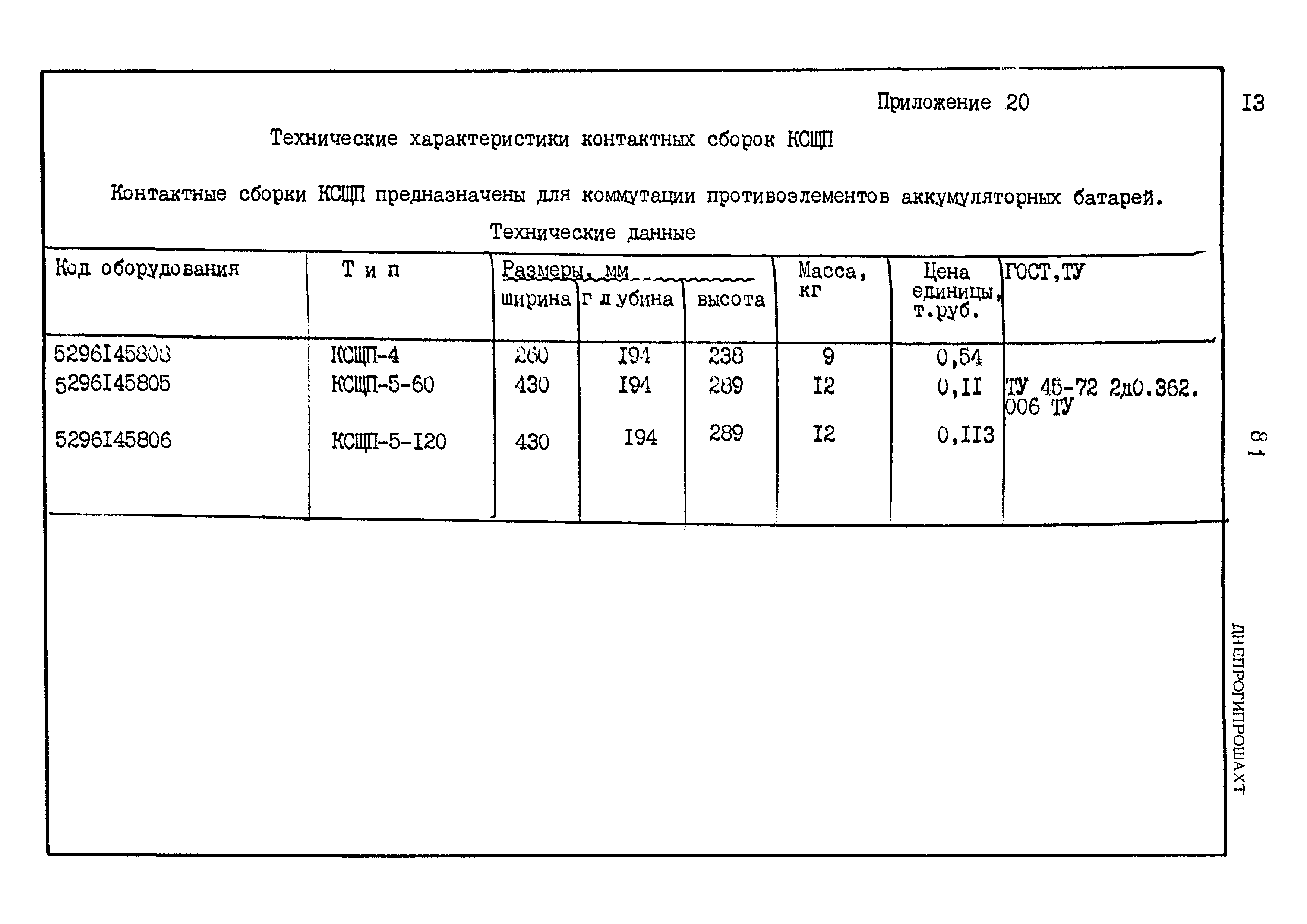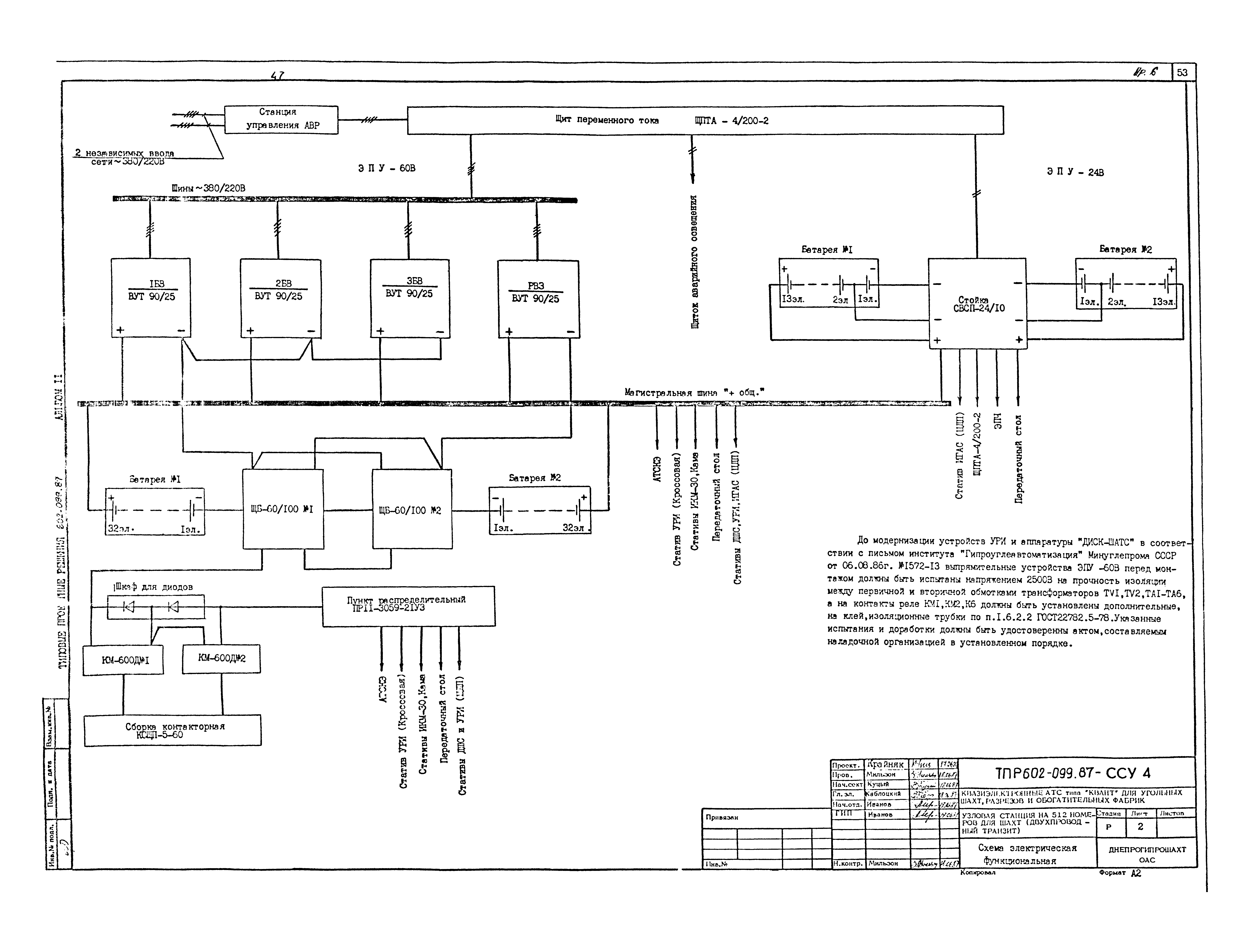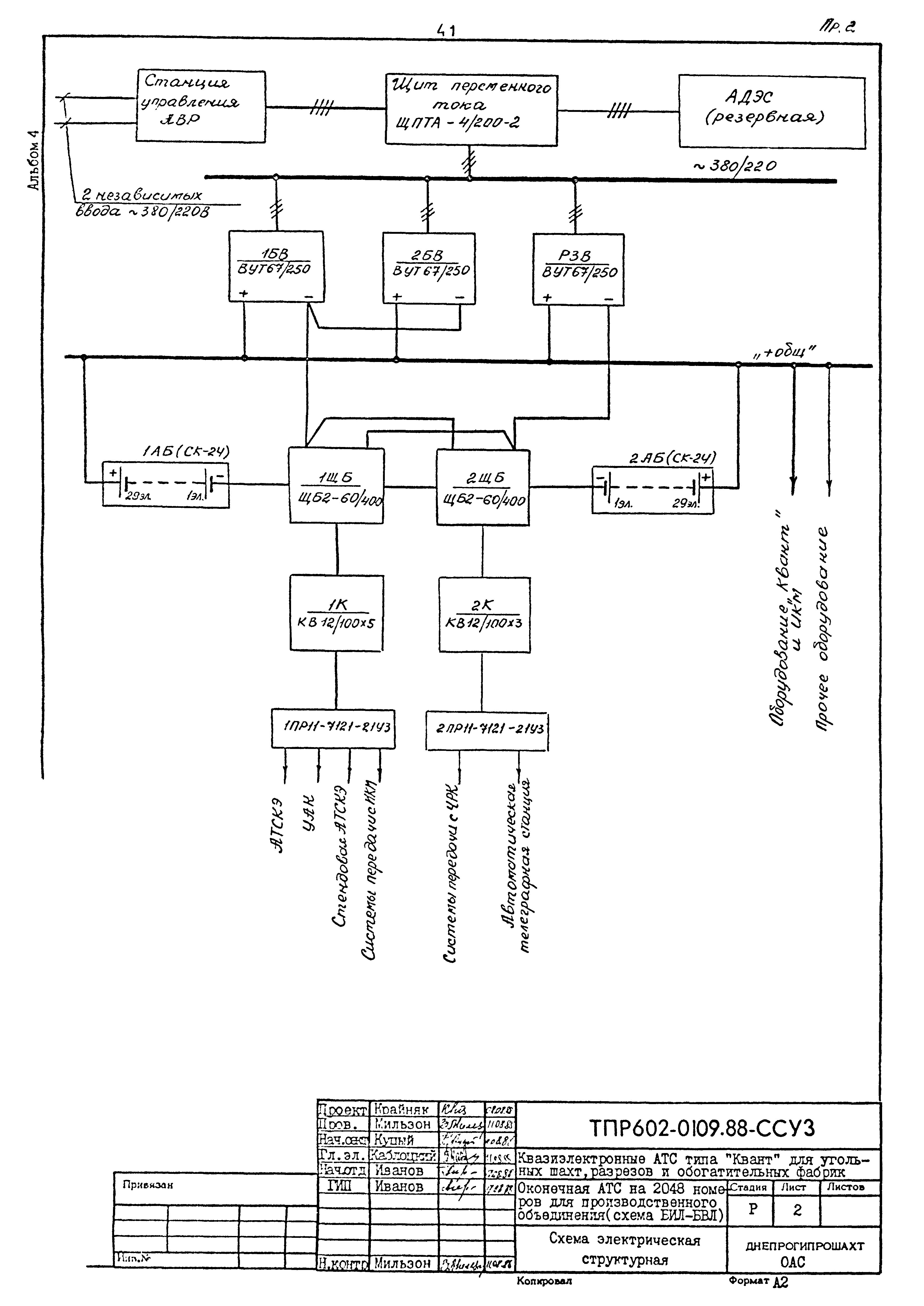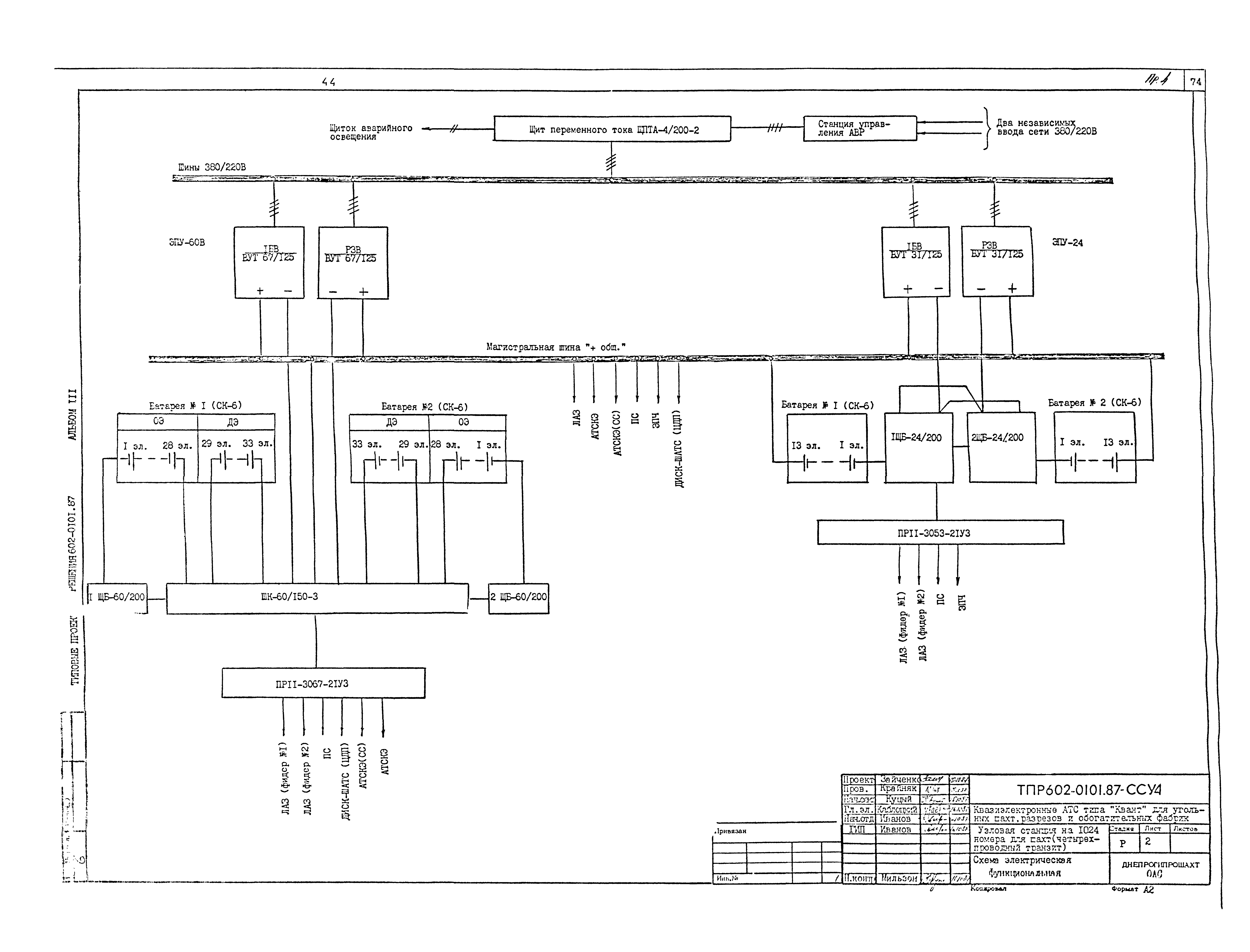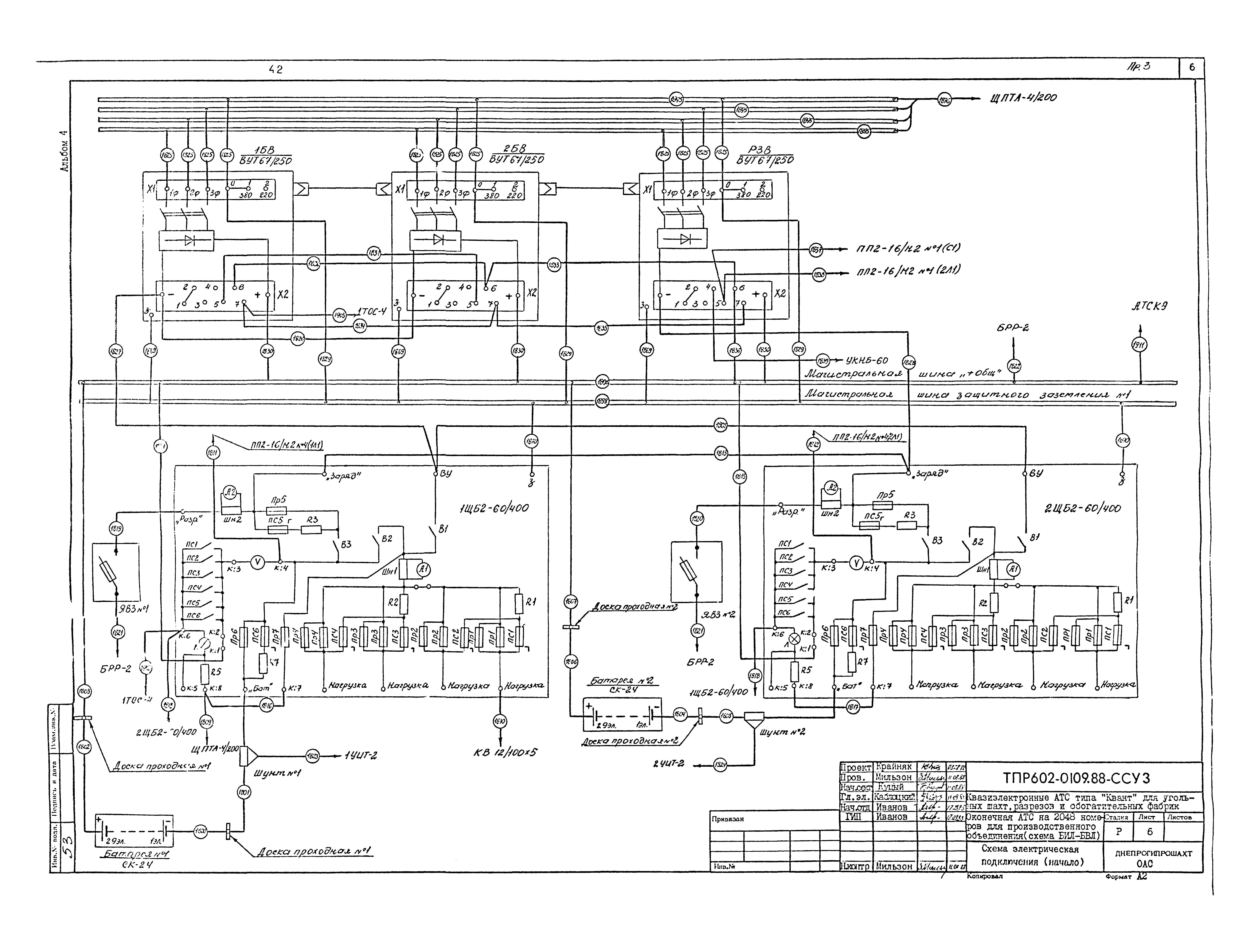 | Оглавление: | 1. Общие положения 2. Нормативные требования к ЭПУ 3. Технология проектирования 4. Выбор схемы построения и расчет ЭПУ 5. Проектирование токораспределительной сети (ТРС) 6. Требования к помещениям ЭПУ 6.1. Архитектурно-строительная часть 6.2. Требования к отоплению и вентиляции 6.3. Требования к водопроводу и канализации 6.4. Требования к электроснабжению и электроосвещению 7. Металлоконструкции 8. Заземляющие устройства 9. Пример расчета ЭПУ 9.1 Расчет ЭПУ 9.2. Расчет ТРС 10. Состав и содержание проектной документации Приложение 1 Перечень действующих нормативных документов, которым следует руководствоваться при проектировании ЭПУ Приложение 2 Функциональная схема автоматизированной ЭПУ-60В с несекционированной аккумуляторной батареей и конверторами Приложение 3 Схема подключения автоматизированной ЭПУ-60В с несекционированной аккумуляторной батареей и конверторами Приложение 4 Функциональная схема автоматизированной ЭПУ-60В с секционированной аккумуляторной батареей и шкафом коммутации ШК и неавтоматизированной ЭПУ-24 с несекционированной аккумуляторной батареей Приложение 5 Схема подключения автоматизированной ЭПУ-60В с секционированной аккумуляторной батареей и шкафом коммутации Приложение 6 Функциональная схема автоматизированных ЭПУ-60В с несекционированной аккумуляторной батареей и нелинейными сопротивлениями для регулирования напряжения на выходе ЭПУ-24 с секционированной аккумуляторной батареей, выпрямительными устройствами ВСП и коммутирующими устройствами Приложение 7 Схема подключения автоматизированной ЭПУ-60В с несекционированной аккумуляторной батареей и нелинейными сопротивлениями для регулирования напряжения на выходе ЭПУ Приложение 8 Функциональная схема неавтоматизированной ЭПУ-24В с секционированной аккумуляторной батареей, выпрямительными устройствами ВСП и коммутирующими устройствами Приложение 9 Схема подключение неавтоматизированной ЭПУ-24В с несекционированными аккумуляторными батареями Приложение 10 Технические данные конвекторов Приложение 11 Технические данные потребителей Приложение 12 Технические характеристики аккумуляторов типа СК ГОСТ 825-73 Приложение 13 Электрические характеристики аккумуляторов Приложение 14 Выпрямительные устройства Приложение 15 Технические данные шкафов управления с АВР Приложение 16 Техническая характеристика батарейных щитов щБ2 Приложение 17 Техническая характеристика щита переменного тока ЩПТА-4/200-2 Приложение 18 Техническая характеристика щитов ЩРЗ Приложение 19 Техническая характеристика стоек САРН Приложение 20 Техническая характеристика контактных сборок КСЩП Приложение 21 Блоки резисторов типа БРР Приложение 22 Устройства индикации тока УИТ Приложение 23 Техническая характеристика УКНБ Приложение 24 Техническая характеристика табло сигнализации ТОС-4 Приложение 25 Типовые чертежи шкафов для диодов Приложение 26 Эквивалентная схема ТРС ЭПУ-60 Приложение 27 Эквивалентная схема ТРС ЭПУ-24 Приложение 28 Таблица моментов тока для алюминиевой и медной проводки Приложение 29 Таблица моментов тока для алюминиевых шин Приложение 30 Схем расположения заземляющих устройств Приложение 31 Схема расположения и эквивалентная схема ТРС |