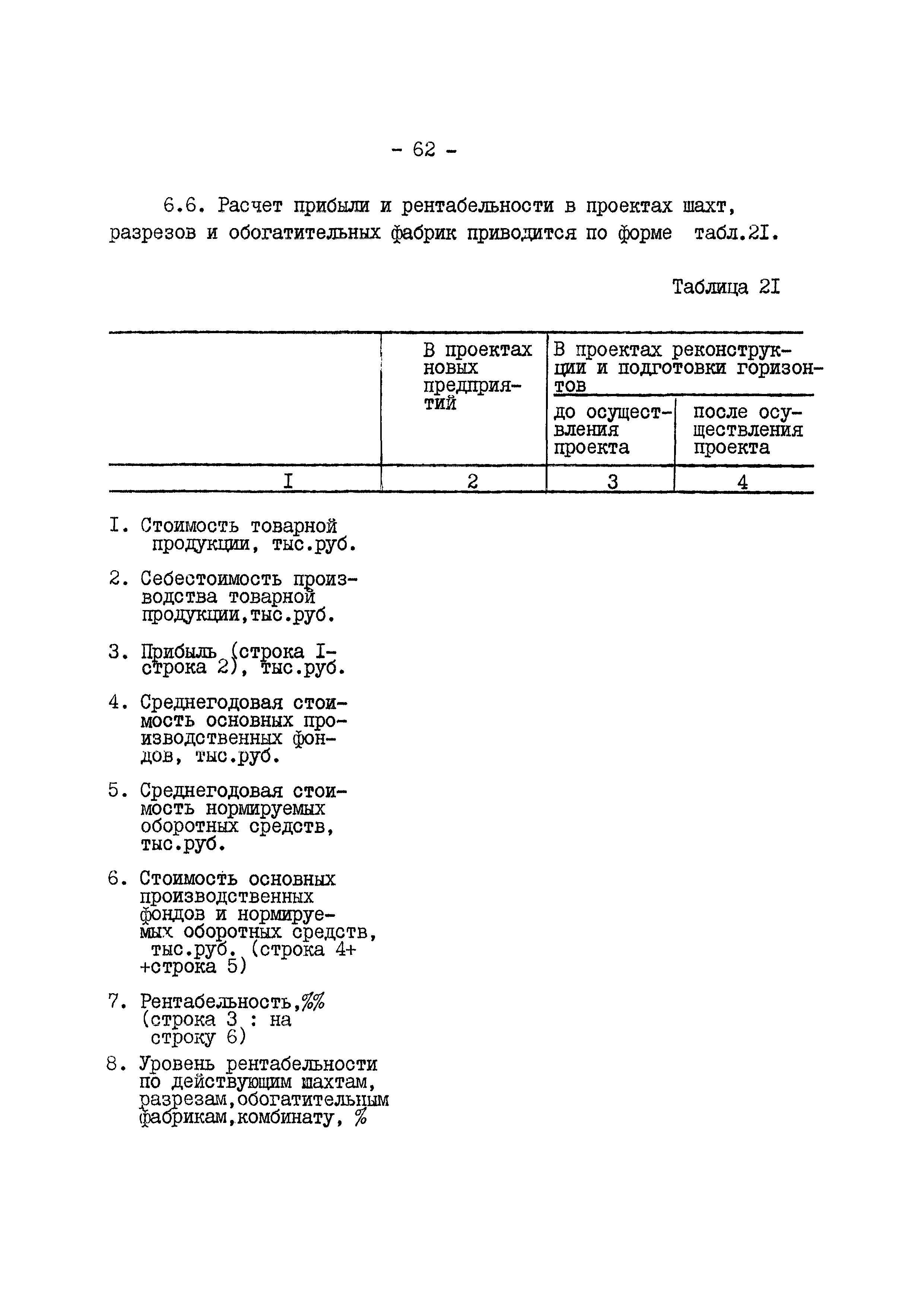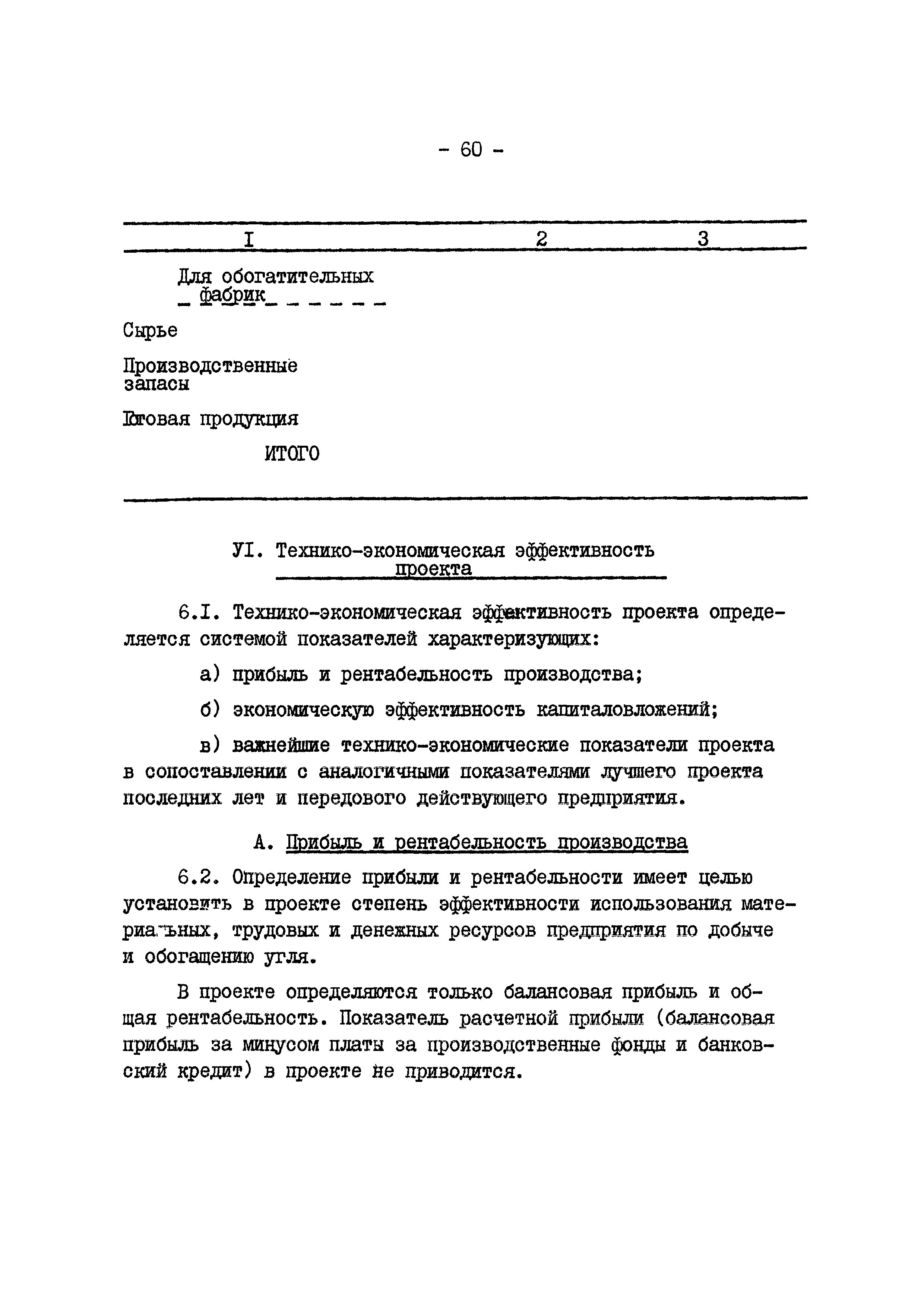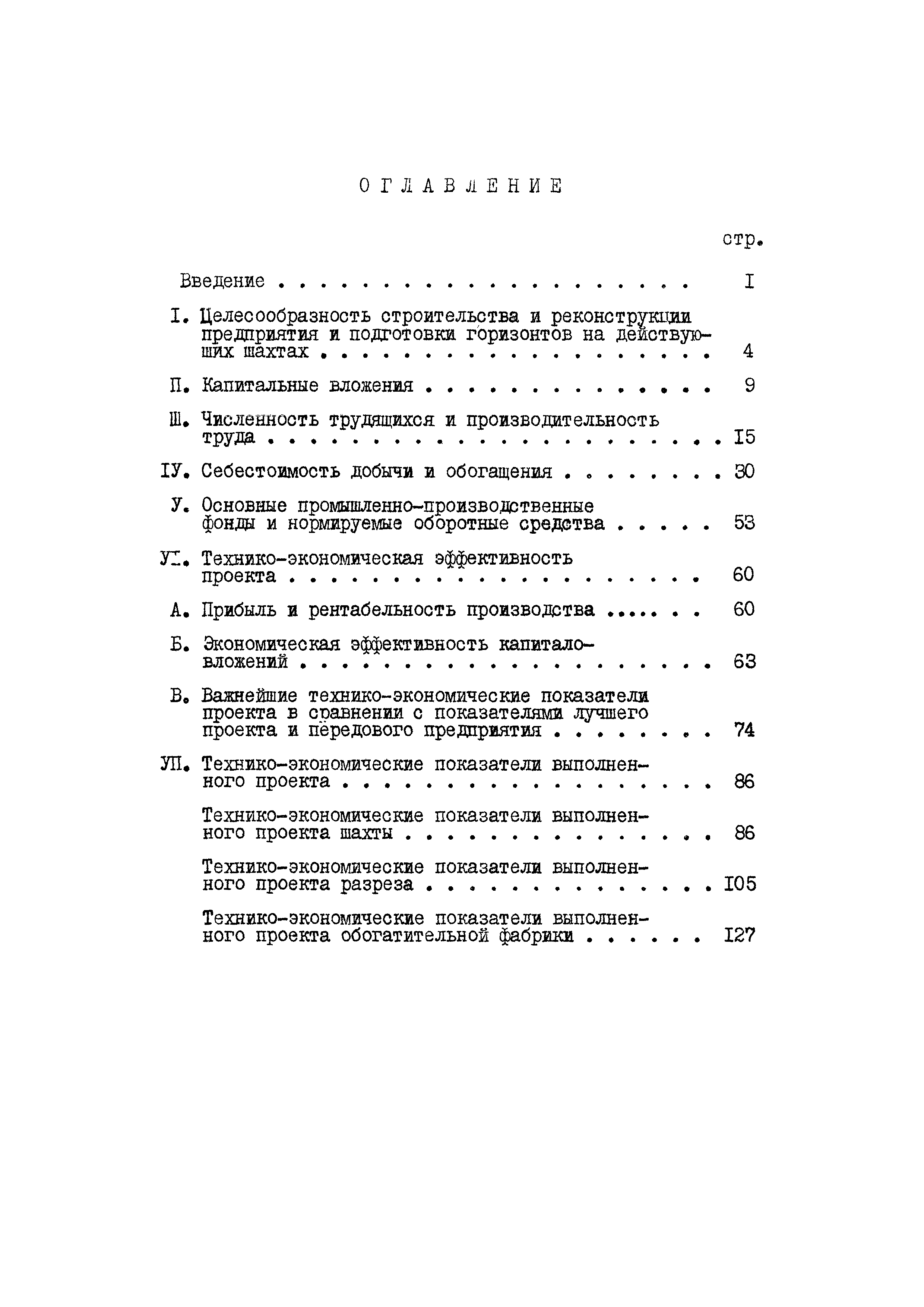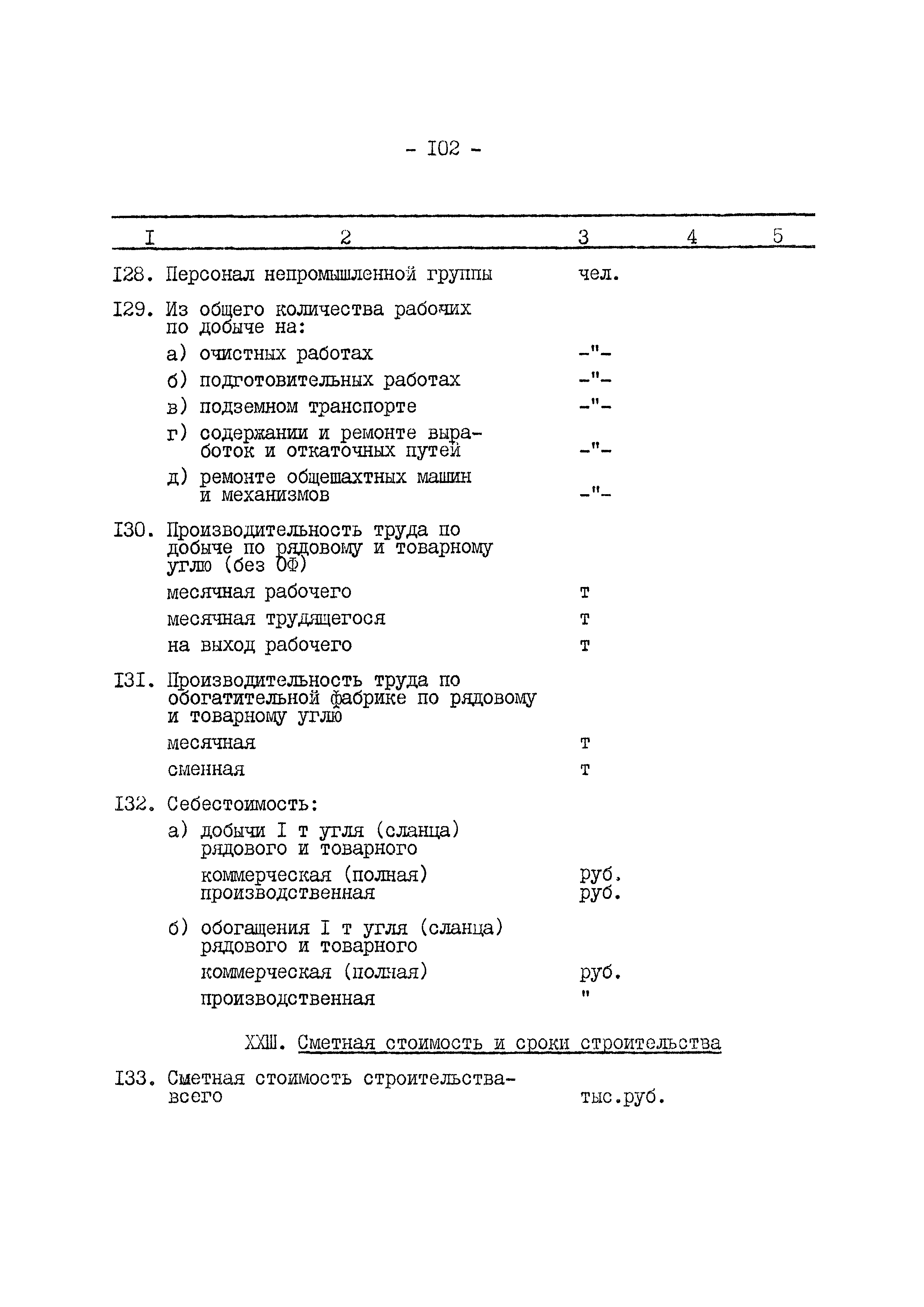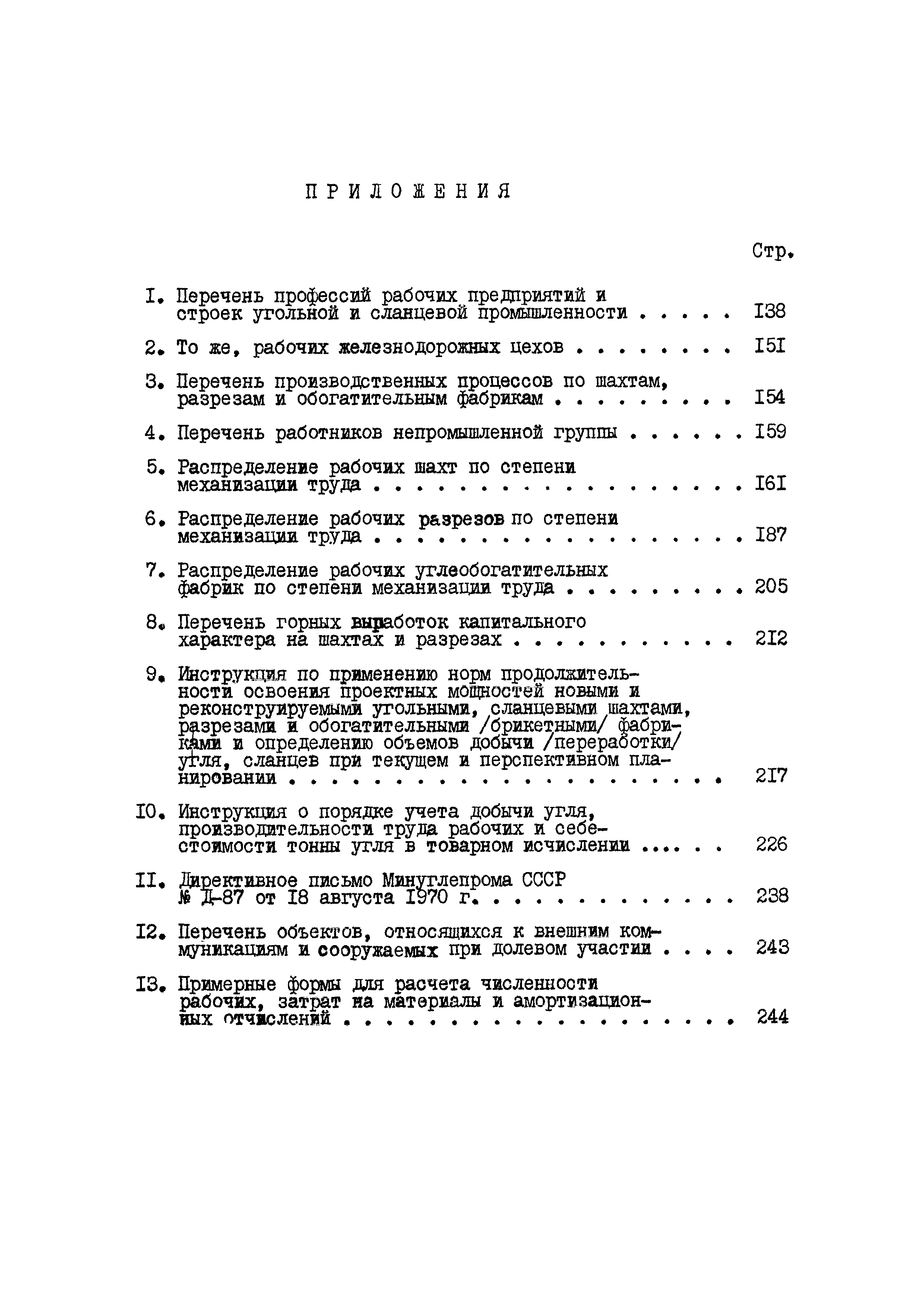 | Оглавление: | I. Целесообразность строительства и реконструкции предприятия и подготовки горизонтов на действующих шахтах II. Капитальные вложения III. Численность трудящихся и производительность труда IV. Себестоимость добычи и обогащения V. Основные промышленно-производственные фонды и нормируете оборотные средства VI. Технико-экономическая эффективность проекта А. Прибыль я рентабельность производства Б. Экономическая эффективность капиталовложении В. Важнейшие технико-экономические показатели проекта в сравнении с показателями лучшего проекта и передового предприятия VII. Технико-экономические показатели выполненного проекта Технико-экономические показатели выполненного проекта шахты Технико-экономические показателя выполненного проекта разреза Технико-экономические показатели выполненного проекта обогатительной фабрики Приложение 1. Перечень профессий рабочих предприятий и строек угольной и сланцевой промышленности Приложение 2. То же, рабочих железнодорожных цехов Приложение 3. Перечень производственных процессов по шахтам, разрезам и обогатительным фабрикам Приложение 4. Перечень работников непромышленной группы Приложение 5. Распределение рабочих шахт по степени механизации труда Приложение 6. Распределение рабочих разрезов по степени механизации труда Приложение 7. Распределение рабочих углеобогатительных фабрик по степени механизации труда Приложение 8. Перечень горных выработок капитального характера на шахтах и разрезах Приложение 9. Инструкция по применению норм продолжительности освоения проектных мощностей новыми и реконструируемыми угольными, сланцевыми шахтами, разрезами и обогатительными/брикетными/фабриками и определению объемов добычи/переработки/угля, сланцев при текущем и перспективном планировании Приложение 10. Инструкция о порядке учета добычи угля, производительности труда рабочих и себестоимости тонны угля в товарном исчислении Приложение 11. Директивное письмо Минуглепрома СССР № Д-87 от 18 августа 1970 г. Приложение 12. Перечень объектов, относящихся к внешним коммуникациям и сооружаемых при долевом участии Приложение 13. Примерные формы для расчета численности рабочих, затрат на материалы и амортизационных отчислений |
