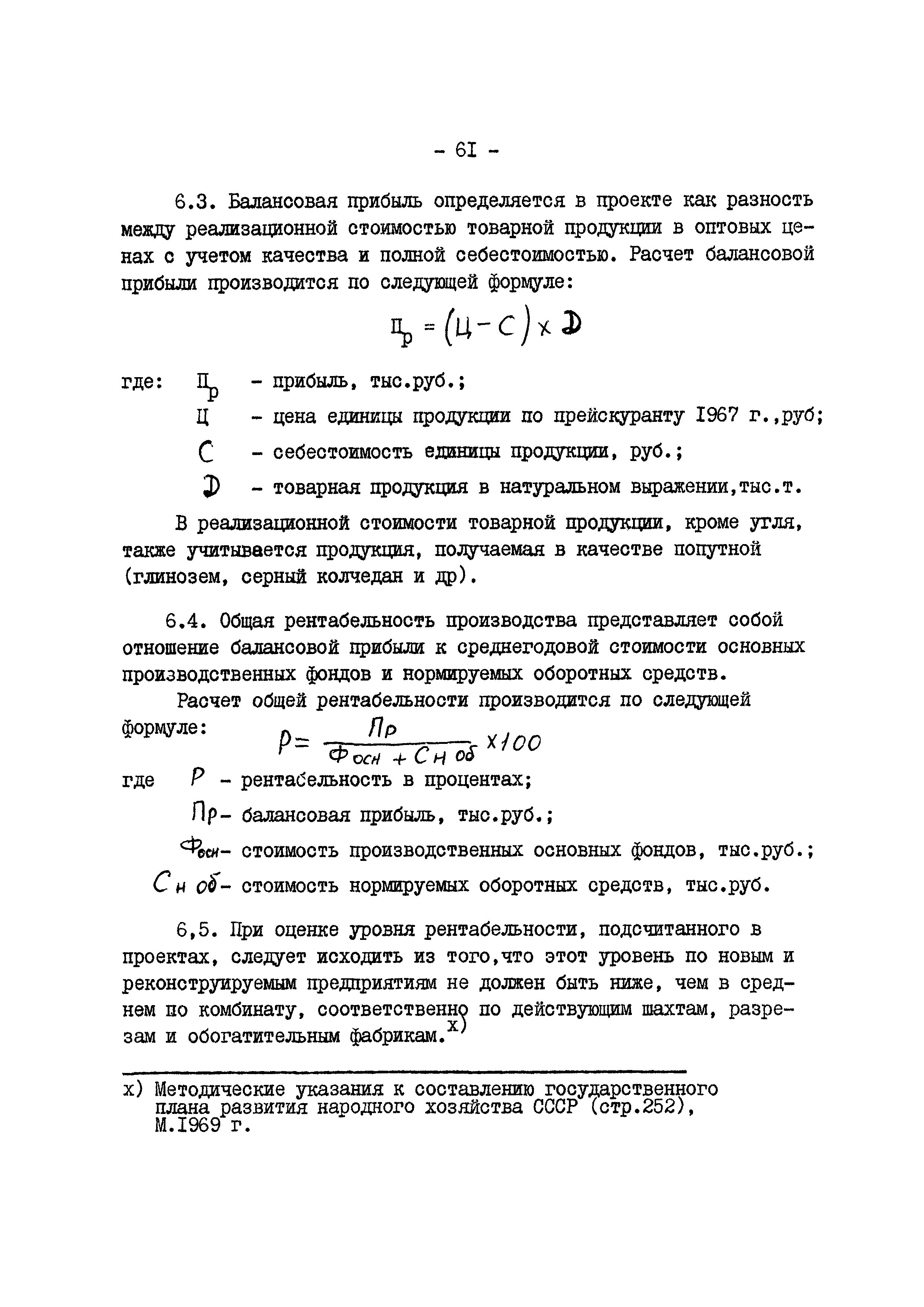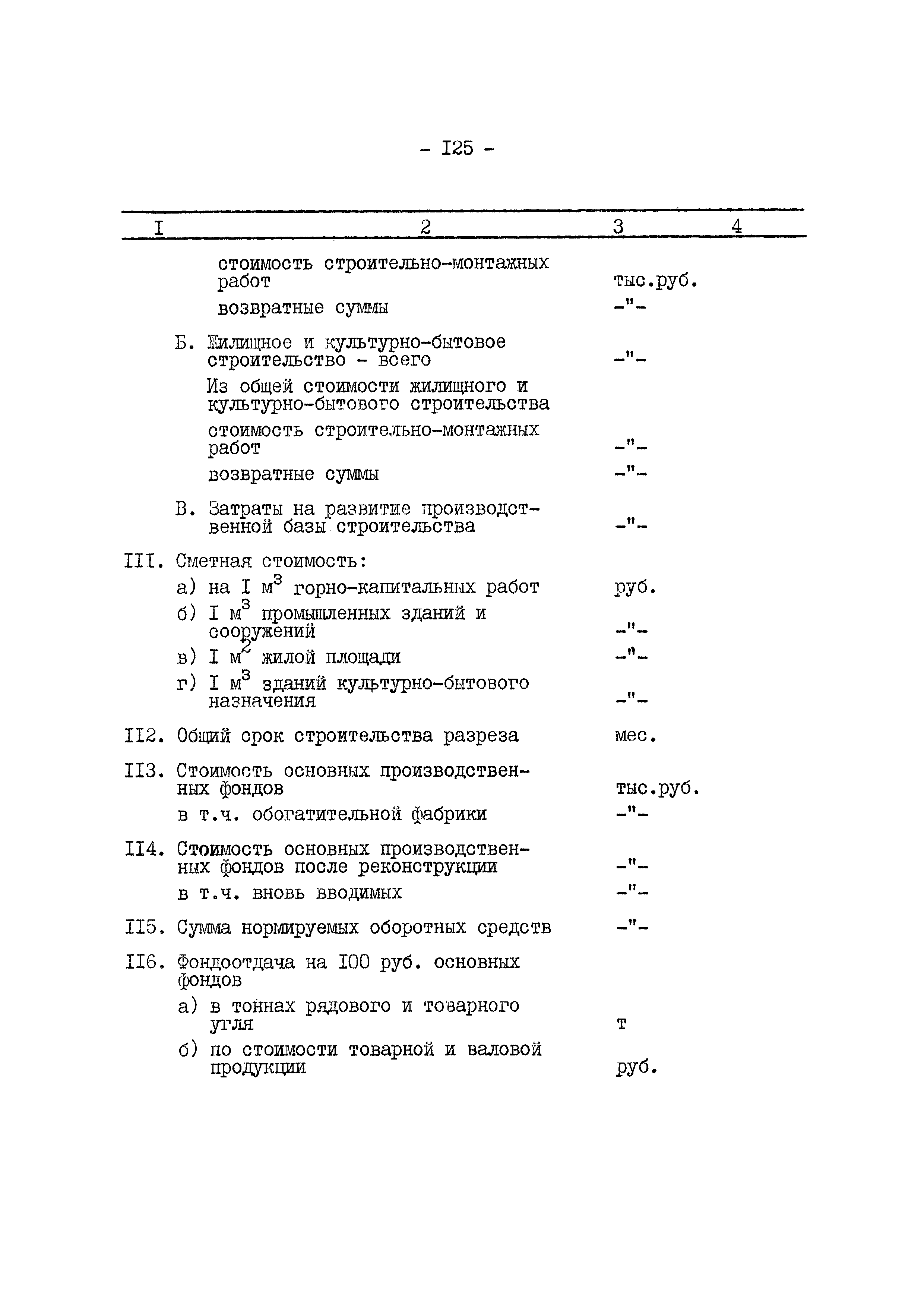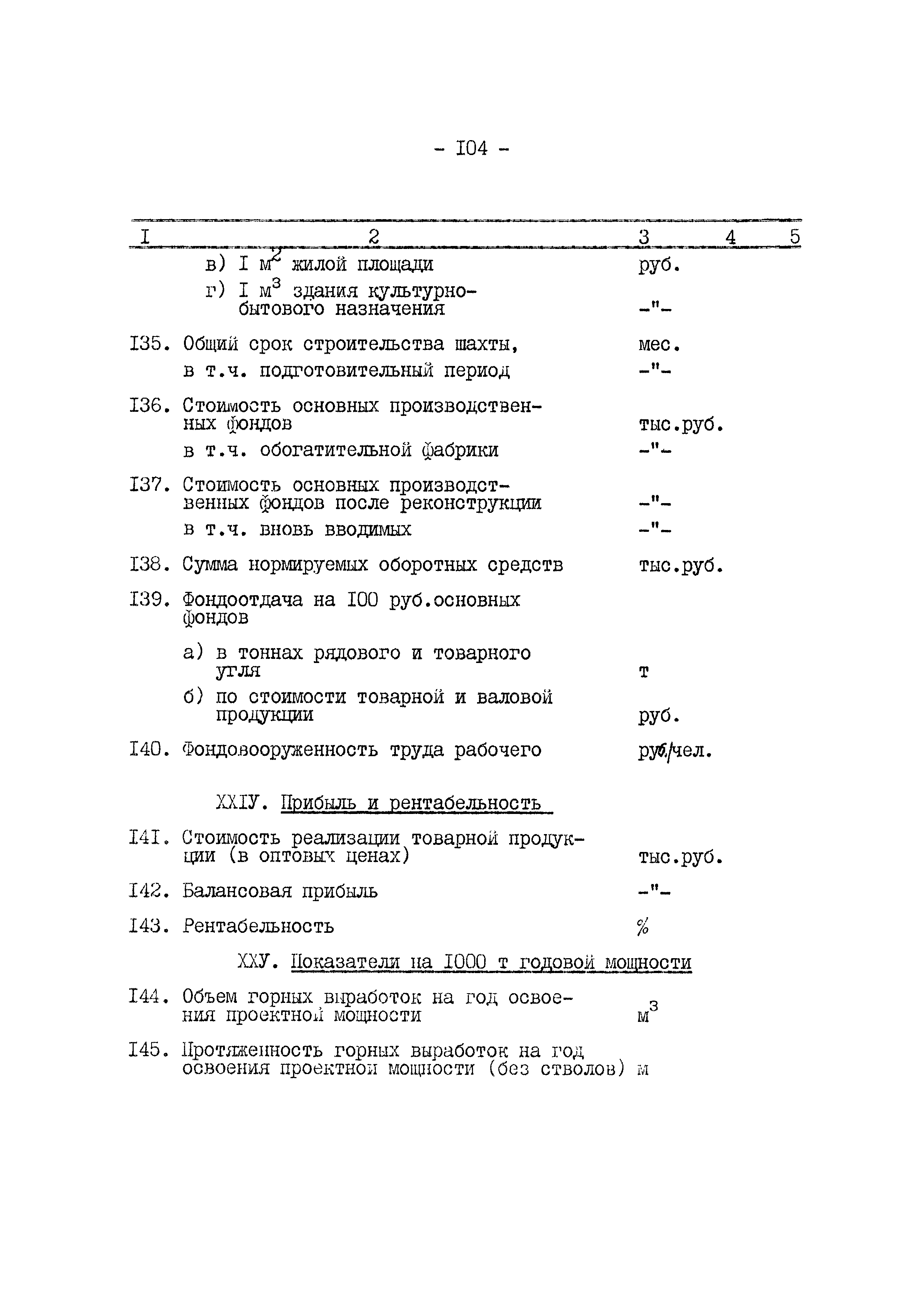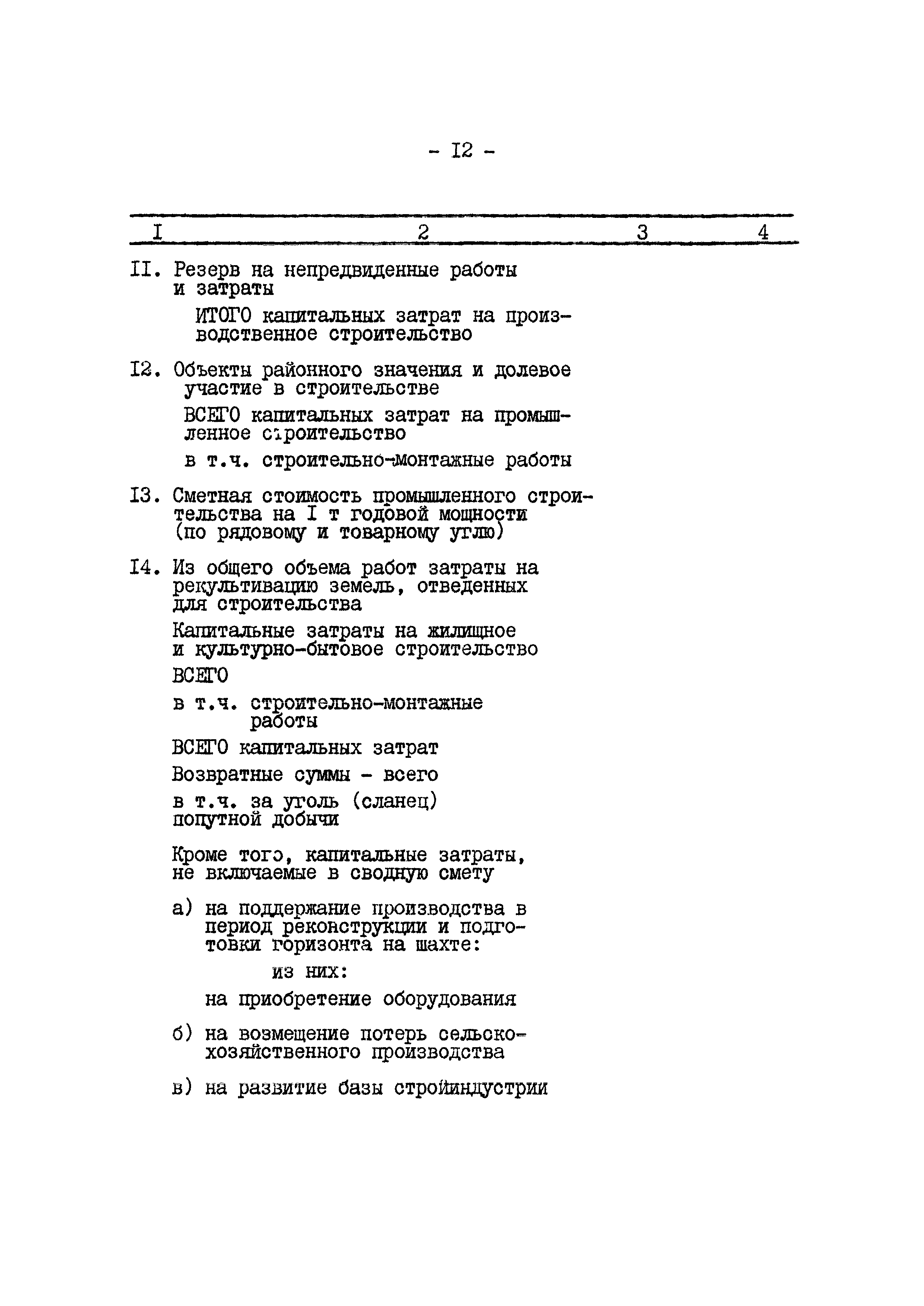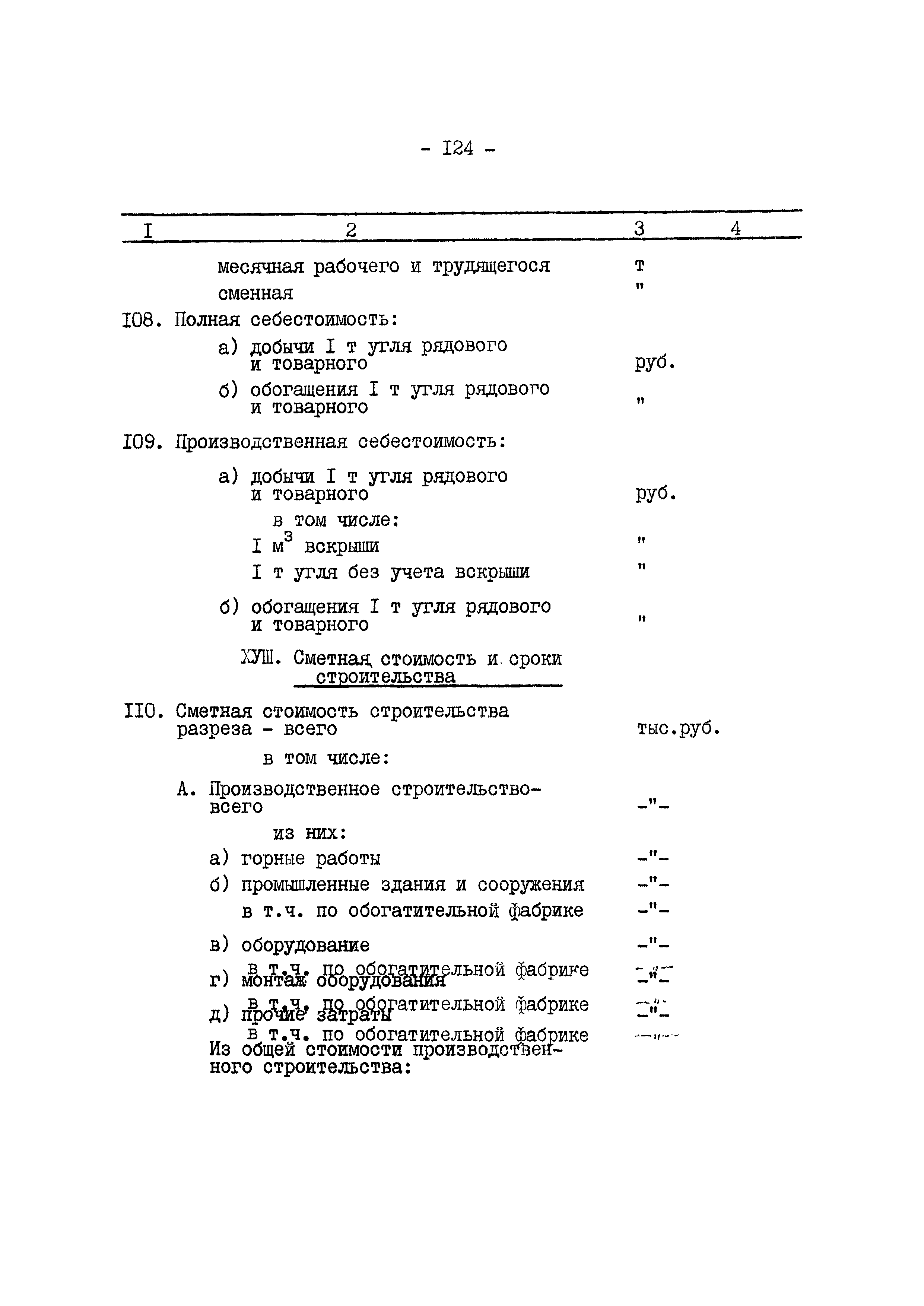 | Оглавление: | I. Целесообразность строительства и реконструкции предприятия и подготовки горизонтов на действующих шахтах II. Капитальные вложения III. Численность трудящихся и производительность труда IV. Себестоимость добычи и обогащения V. Основные промышленно-производственные фонды и нормируете оборотные средства VI. Технико-экономическая эффективность проекта А. Прибыль я рентабельность производства Б. Экономическая эффективность капиталовложении В. Важнейшие технико-экономические показатели проекта в сравнении с показателями лучшего проекта и передового предприятия VII. Технико-экономические показатели выполненного проекта Технико-экономические показатели выполненного проекта шахты Технико-экономические показателя выполненного проекта разреза Технико-экономические показатели выполненного проекта обогатительной фабрики Приложение 1. Перечень профессий рабочих предприятий и строек угольной и сланцевой промышленности Приложение 2. То же, рабочих железнодорожных цехов Приложение 3. Перечень производственных процессов по шахтам, разрезам и обогатительным фабрикам Приложение 4. Перечень работников непромышленной группы Приложение 5. Распределение рабочих шахт по степени механизации труда Приложение 6. Распределение рабочих разрезов по степени механизации труда Приложение 7. Распределение рабочих углеобогатительных фабрик по степени механизации труда Приложение 8. Перечень горных выработок капитального характера на шахтах и разрезах Приложение 9. Инструкция по применению норм продолжительности освоения проектных мощностей новыми и реконструируемыми угольными, сланцевыми шахтами, разрезами и обогатительными/брикетными/фабриками и определению объемов добычи/переработки/угля, сланцев при текущем и перспективном планировании Приложение 10. Инструкция о порядке учета добычи угля, производительности труда рабочих и себестоимости тонны угля в товарном исчислении Приложение 11. Директивное письмо Минуглепрома СССР № Д-87 от 18 августа 1970 г. Приложение 12. Перечень объектов, относящихся к внешним коммуникациям и сооружаемых при долевом участии Приложение 13. Примерные формы для расчета численности рабочих, затрат на материалы и амортизационных отчислений |