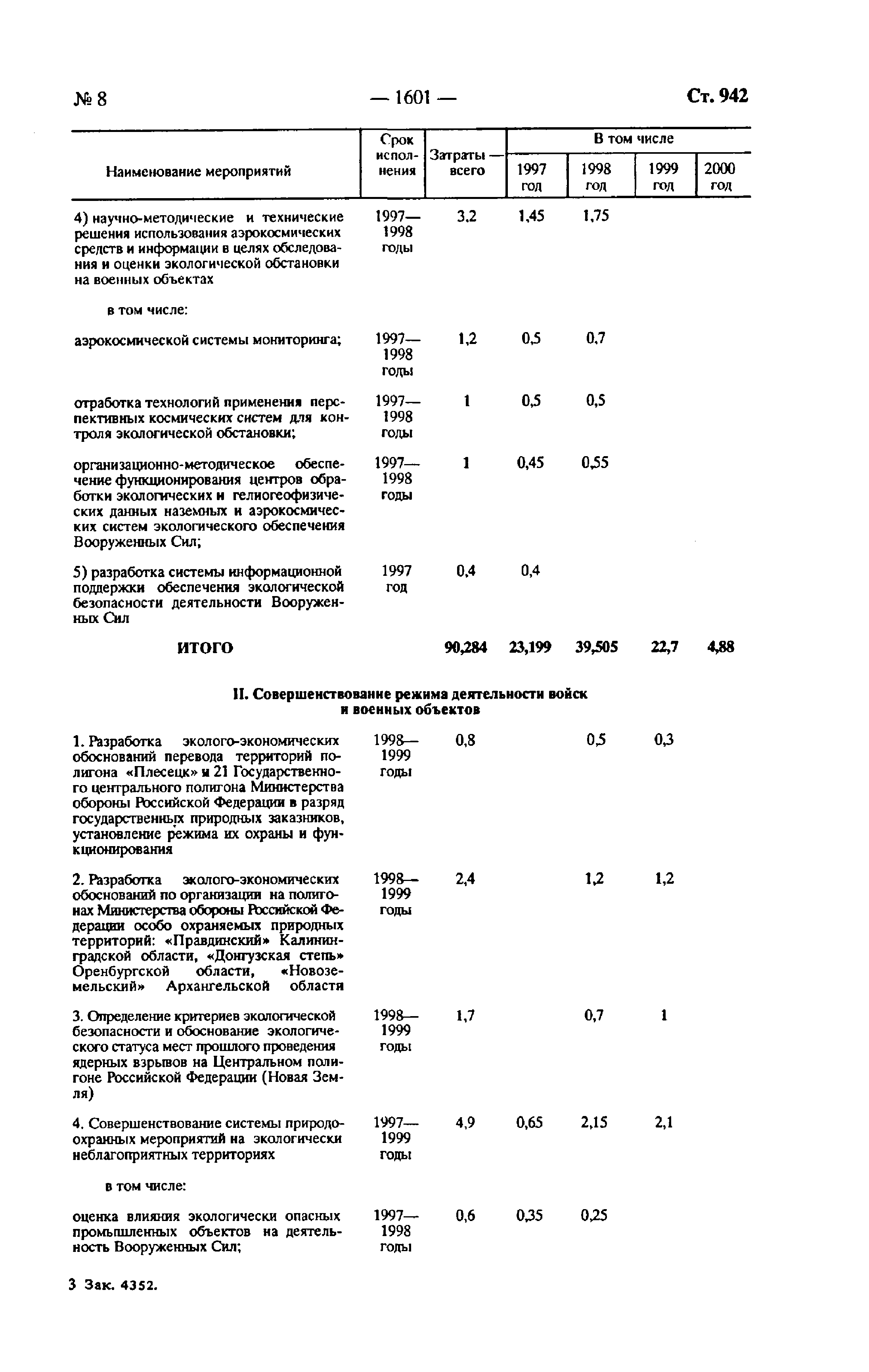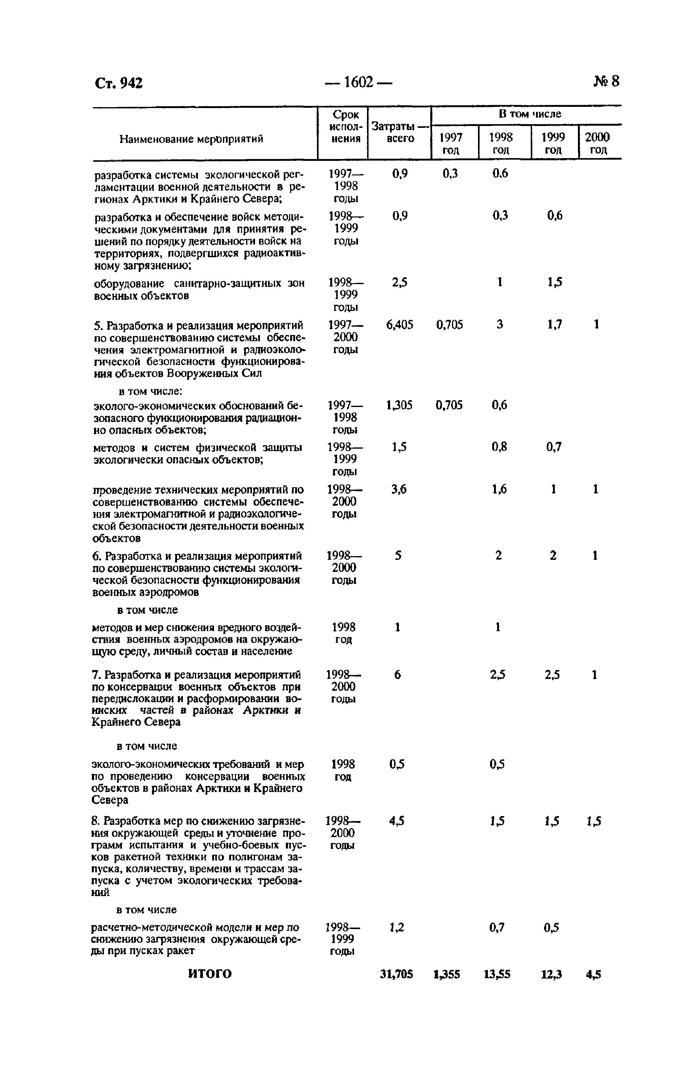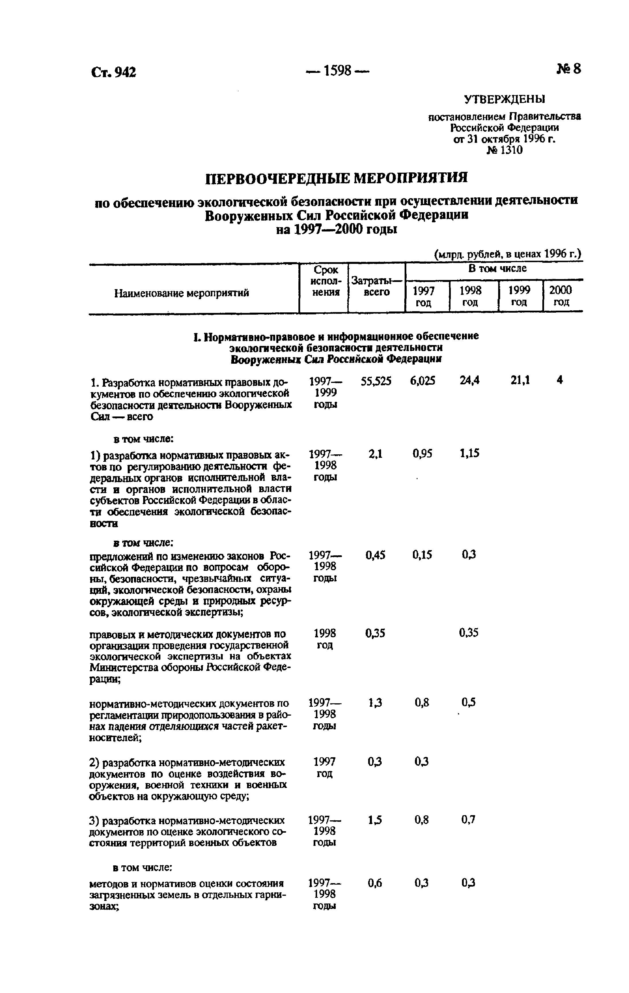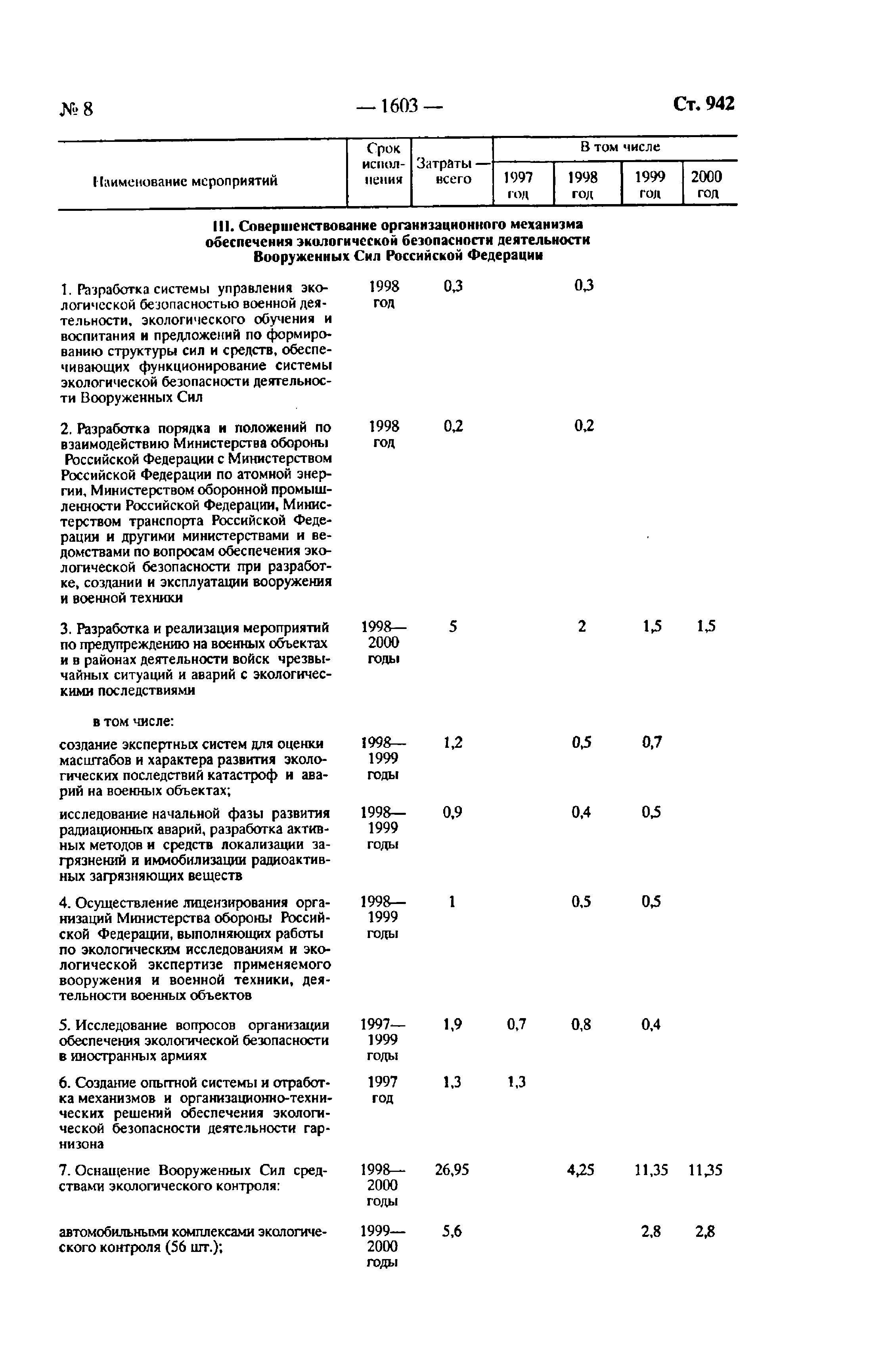Первоочередные мероприятия по обеспечению экологической безопасности при осуществлении деятельности Вооруженных Сил Российской Федерации на 1997 - 2000 годы| Статус: | действует | | Название рус.: | Первоочередные мероприятия по обеспечению экологической безопасности при осуществлении деятельности Вооруженных Сил Российской Федерации на 1997 - 2000 годы | | Дата добавления в базу: | 01.02.2020 | | Дата актуализации: | 01.01.2021 | | Дата введения: | 04.03.1997 | | Утверждён: | 31.10.1996 Правительство Российской Федерации (1310)