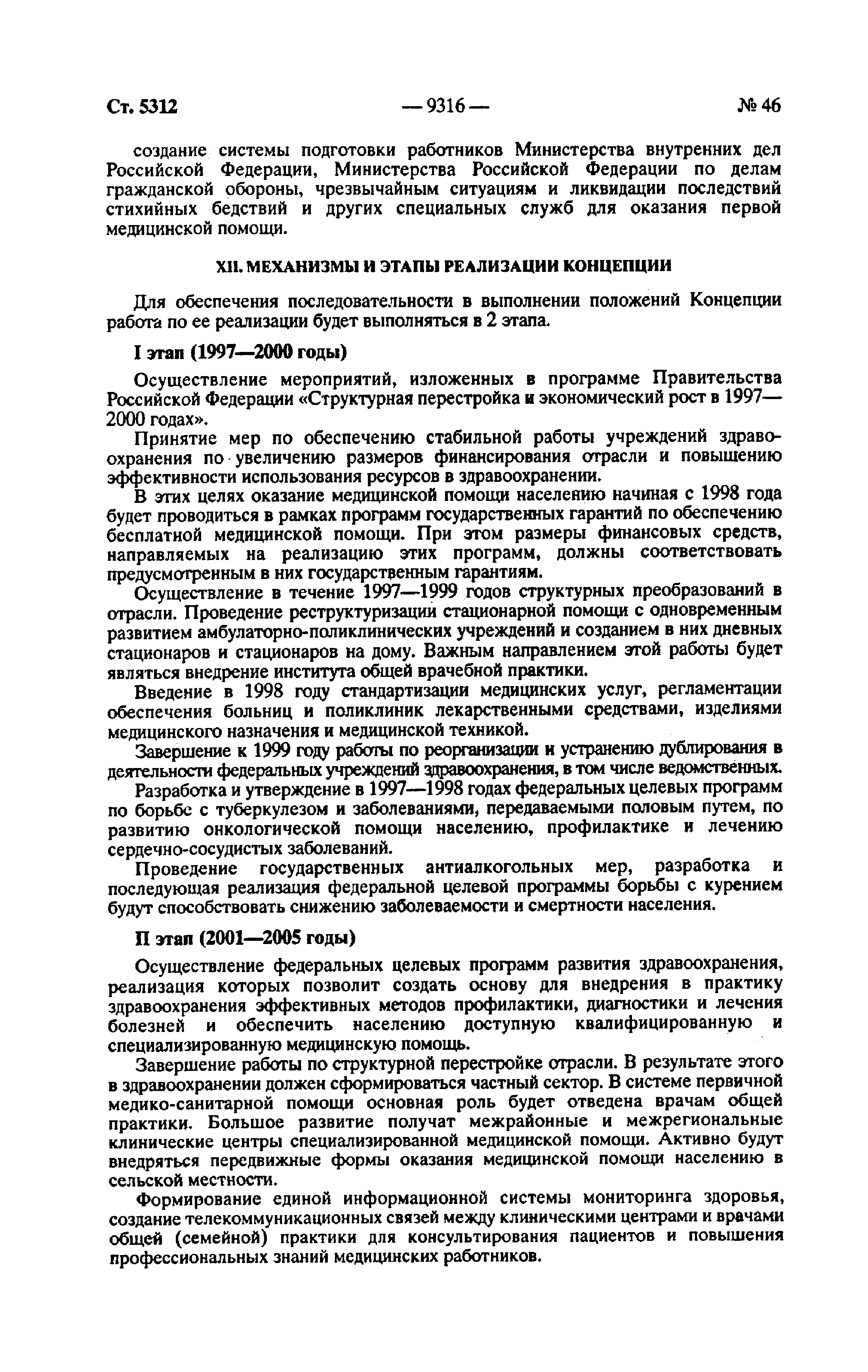| Оглавление: | I. Введение II. Основные направления развития системы здравоохранения III. Совершенствование организации медицинской помощи IV. Совершенствование системы финансирования здравоохранения V. Организация здравоохранения VI. Обеспечение санитарно-эпидемиологического благополучия VII. Государственные гарантии по предоставлению бесплатной медицинской помощи и защита прав пациентов VIII. Развитие медицинской науки IX. Совершенствование медицинского образования и кадровой политики X. Совершенствование лекарственного обеспечения, гарантии в области лекарственной помощи населению XI. Расширение социальной базы здравоохранения XII. Механизмы и этапы реализации Концепции План мероприятий по реализации Концепции развития здравоохранения и медицинской науки в РФ на 1997 - 1998 гг. |