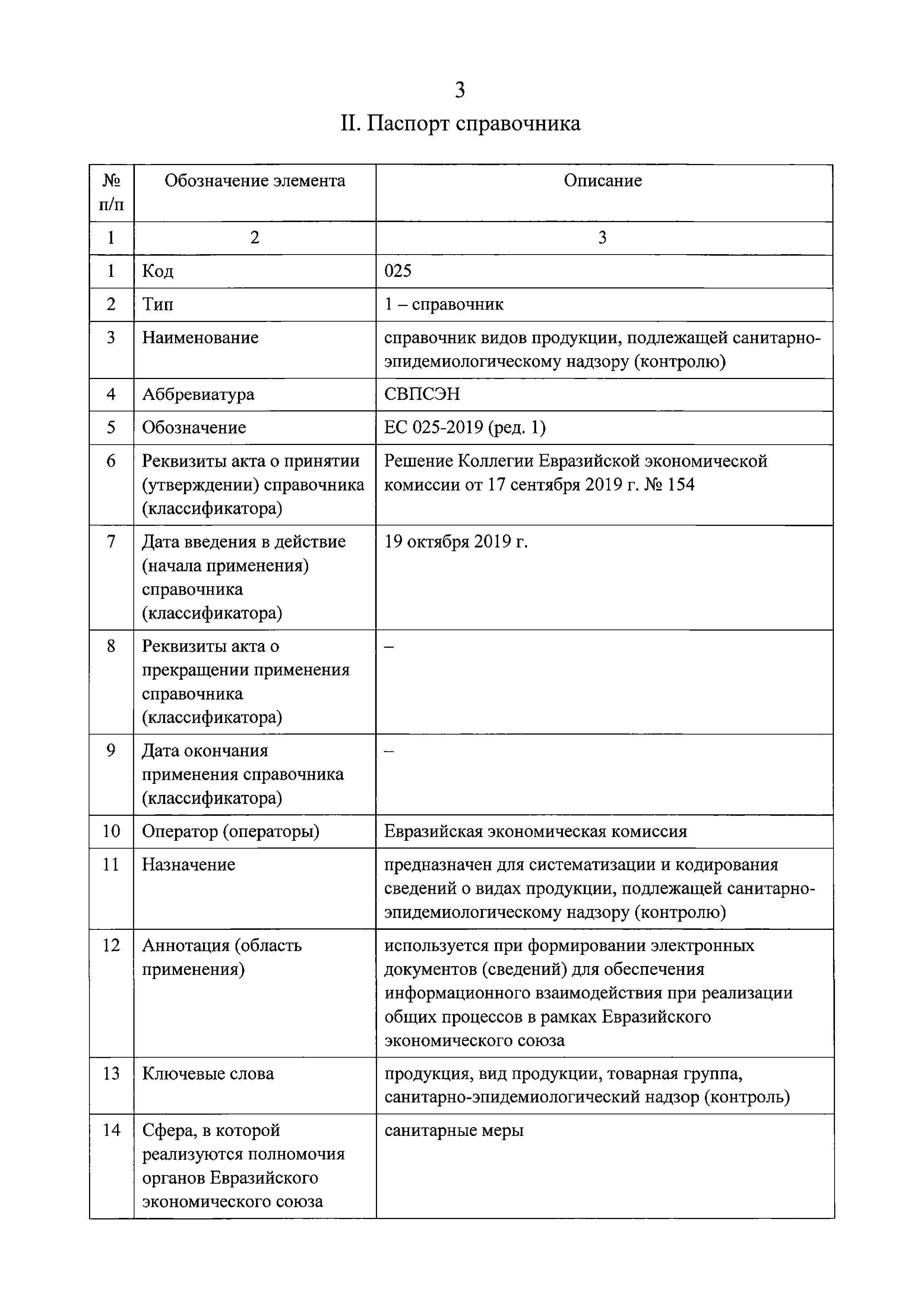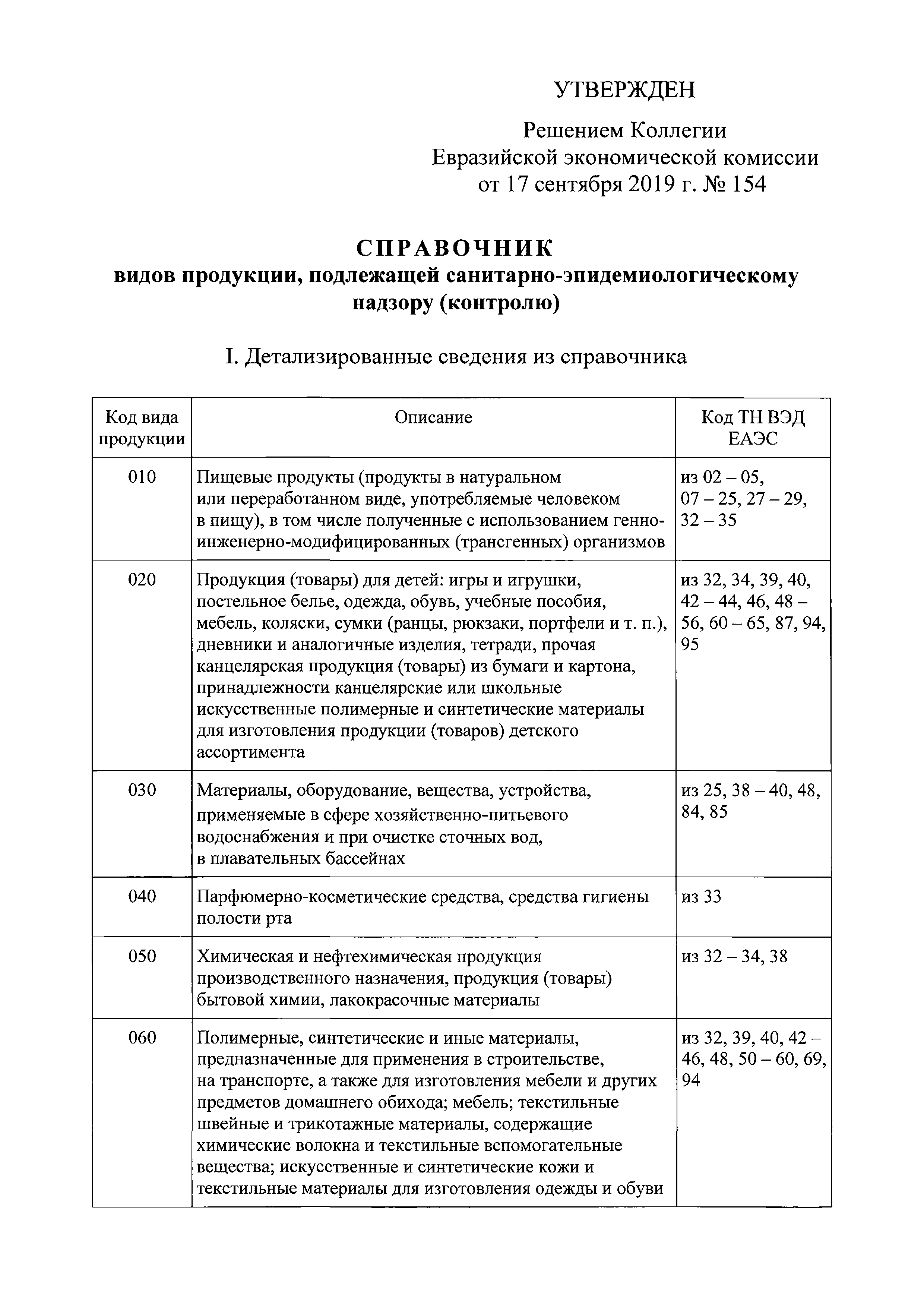 Справочник видов продукции, подлежащей санитарно-эпидемиологическому надзору (контролю)| Статус: | действует | | Название рус.: | Справочник видов продукции, подлежащей санитарно-эпидемиологическому надзору (контролю) | | Дата добавления в базу: | 01.02.2020 | | Дата актуализации: | 01.01.2021 | | Дата введения: | 19.10.2019 | | Оглавление: | I. Детализированные сведения из справочника II. Паспорт справочника III. Описание структуры справочника | | Утверждён: | 17.09.2019 Коллегия Евразийской экономической комиссии (154)