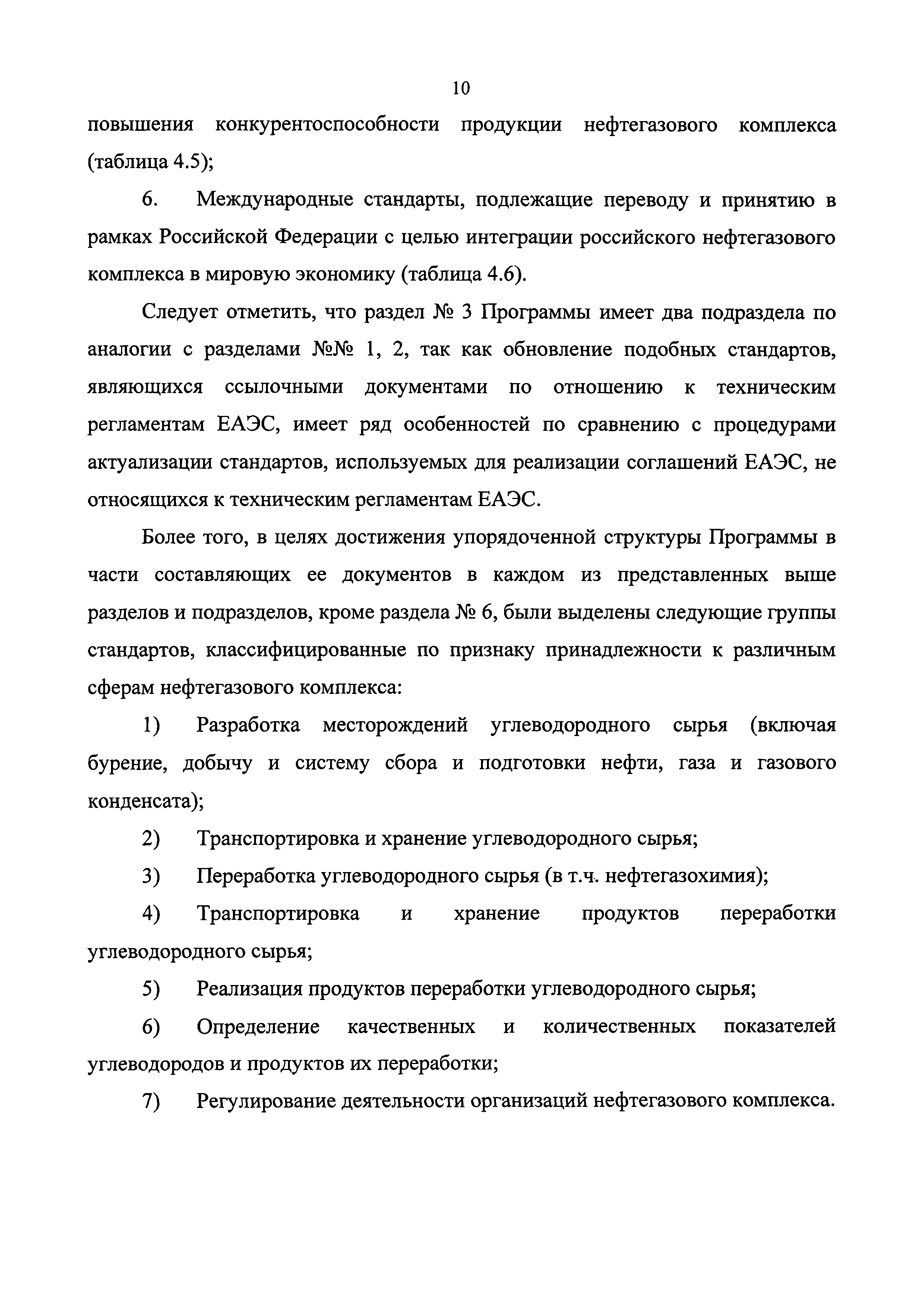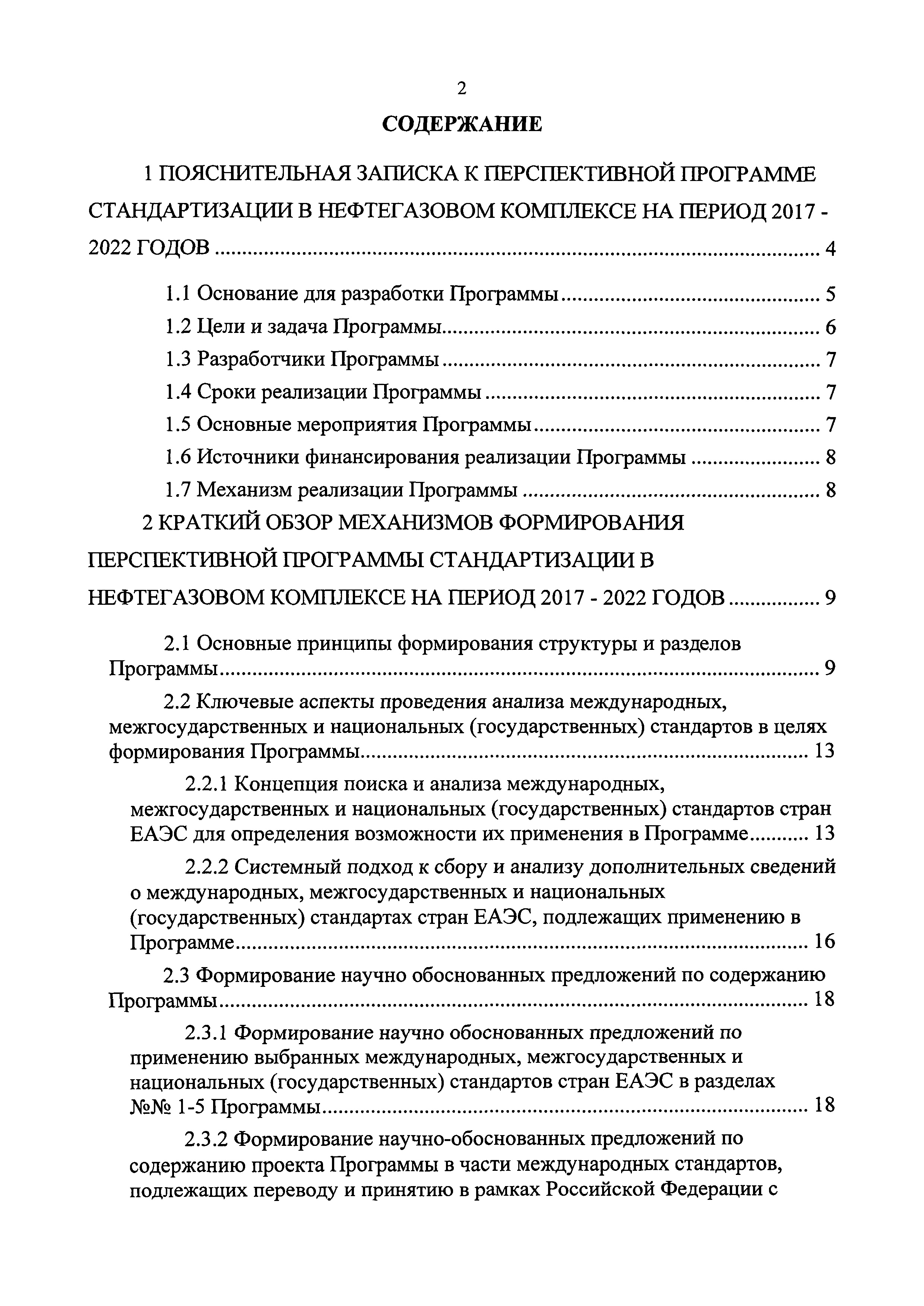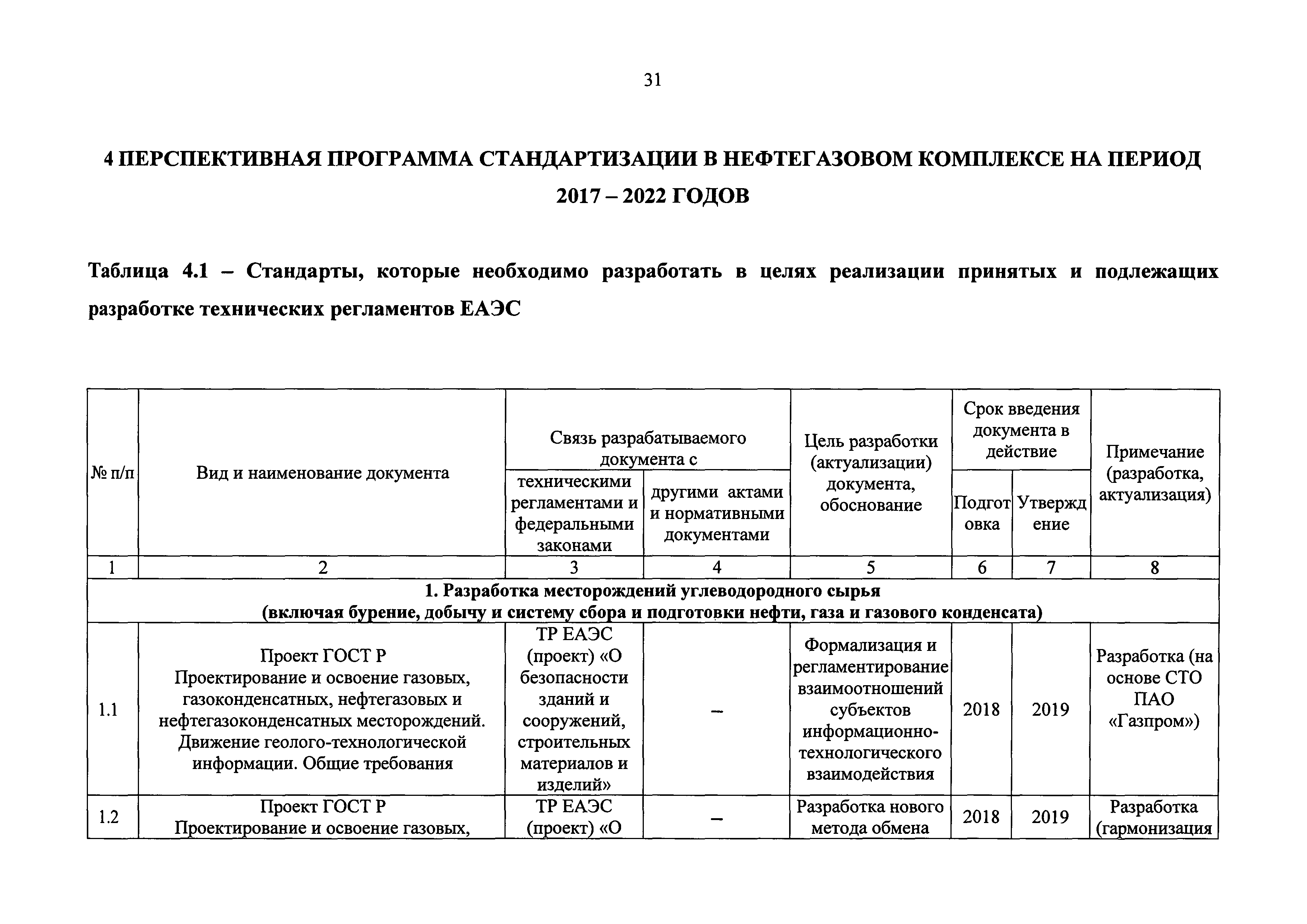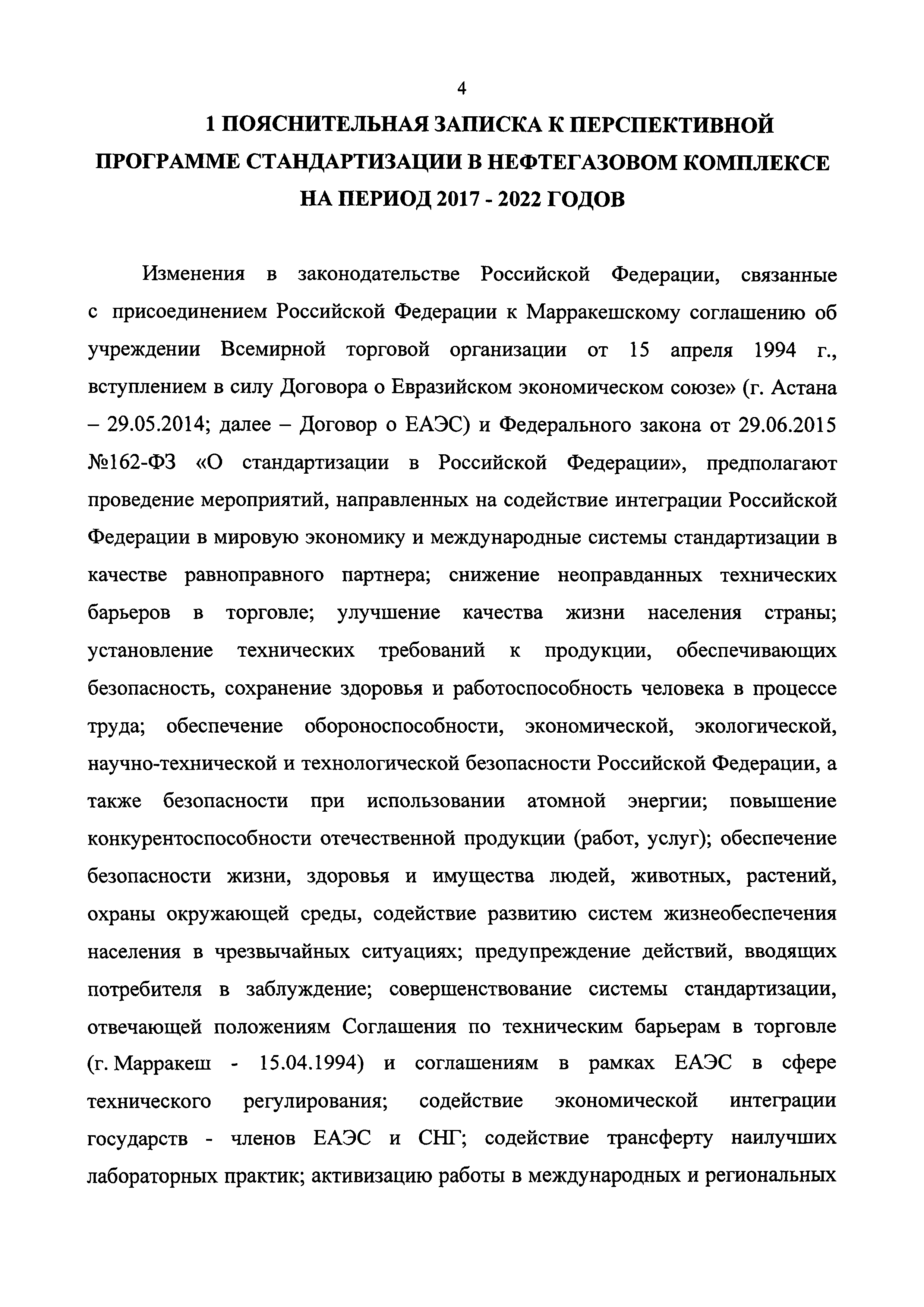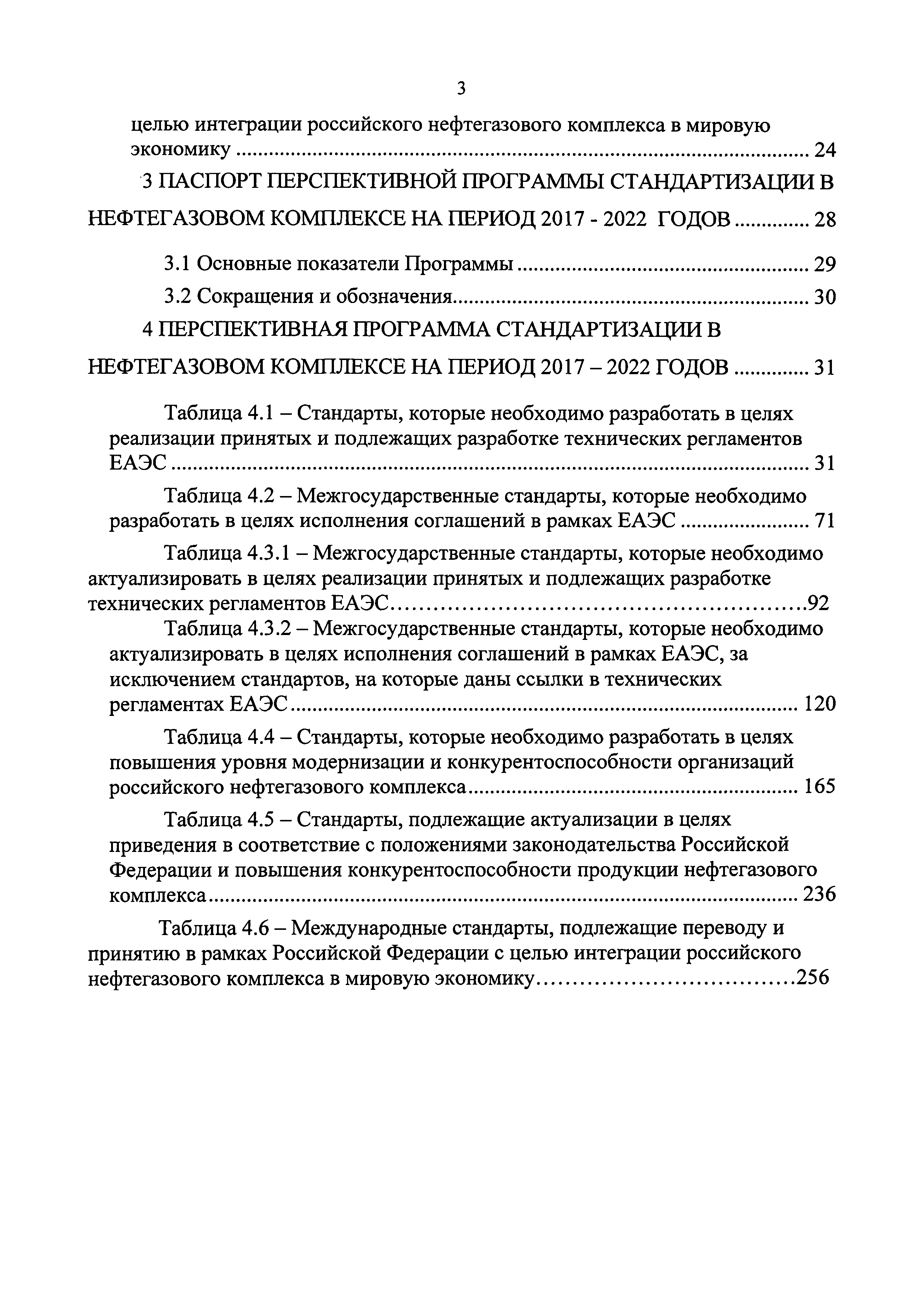 | Оглавление: | 1. Пояснительная записка к Перспективной программе стандартизации в нефтегазовом комплексе на период 2017 - 2022 годов 1.1. Основание для разработки Программы 1.2. Цели и задача Программы 1.3. Разработчики Программы 1.4. Сроки реализации Программы 1.5. Основные мероприятия Программы 1.6. Источники финансирования реализации Программы 1.7. Механизм реализации Программы 2. Краткий обзор механизмов формирования Перспективной программы стандартизации в нефтегазовом комплексе на период 2017 - 2022 годов 2.1. Основные принципы формирования структуры и разделов Программы 2.2. Ключевые аспекты проведения анализа международных, межгосударственных и национальных (государственных) стандартов в целях формирования Программы 2.3. Формирование научно обоснованных предложений по содержанию Программы 3. Паспорт Перспективной программы стандартизации в нефтегазовом комплексе на период 2017 - 2022 годов 3.1. Основные показатели Программы 3.2. Сокращения и обозначения 4. Перспективная программа стандартизации в нефтегазовом комплексе на период 2017 - 2022 годов Таблица 4.1 - Стандарты, которые необходимо разработать в целях реализации принятых и подлежащих разработке технических регламентов ЕАЭС Таблица 4.2 - Межгосударственные стандарты, которые необходимо разработать в целях исполнения соглашений в рамках ЕАЭС Таблица 4.3.1 - Межгосударственные стандарты, которые необходимо актуализировать в целях реализации принятых и подлежащих разработке технических регламентов ЕАЭС Таблица 4.3.2 - Межгосударственные стандарты, которые необходимо актуализировать в целях исполнения соглашений в рамках ЕАЭС, за исключением стандартов, на которые даны ссылки в технических регламентах ЕАЭС Таблица 4.4 - Стандарты, которые необходимо разработать в целях повышения уровня модернизации и конкурентоспособности организаций российского нефтегазового комплекса Таблица 4.5 - Стандарты, подлежащие актуализации в целях приведения в соответствие с положениями законодательства Российской Федерации и повышения конкурентоспособности продукции нефтегазового комплекса Таблица 4.6 - Международные стандарты, подлежащие переводу и принятию в рамках Российской Федерации с целью интеграции российского нефтегазового комплекса в мировую экономику |