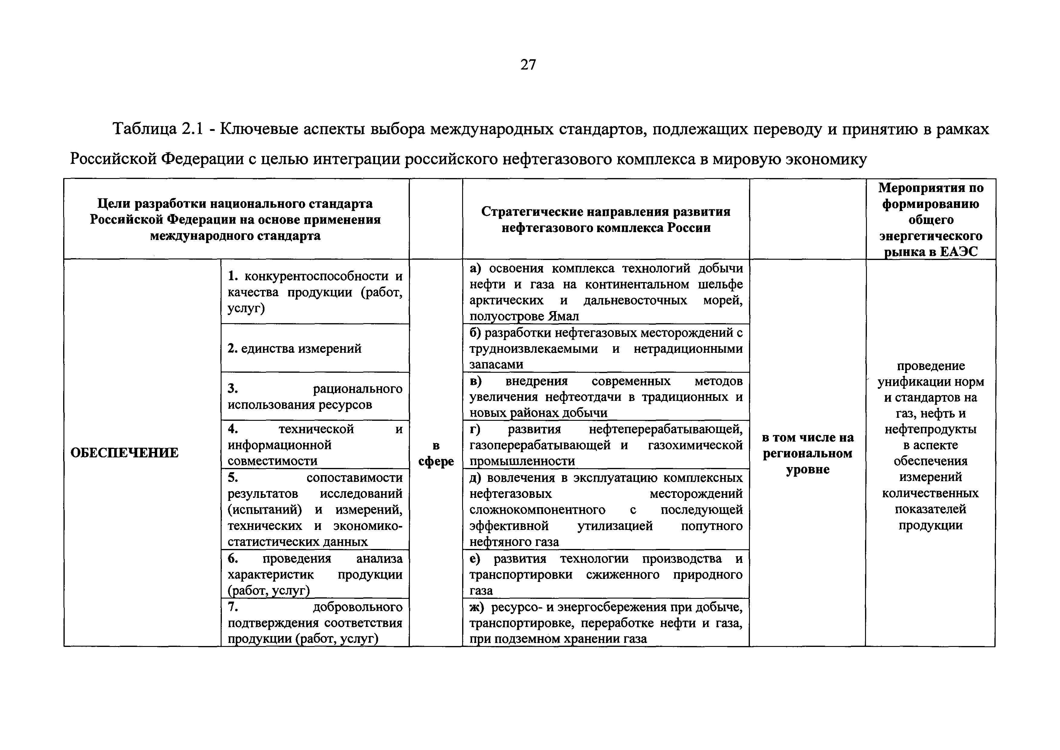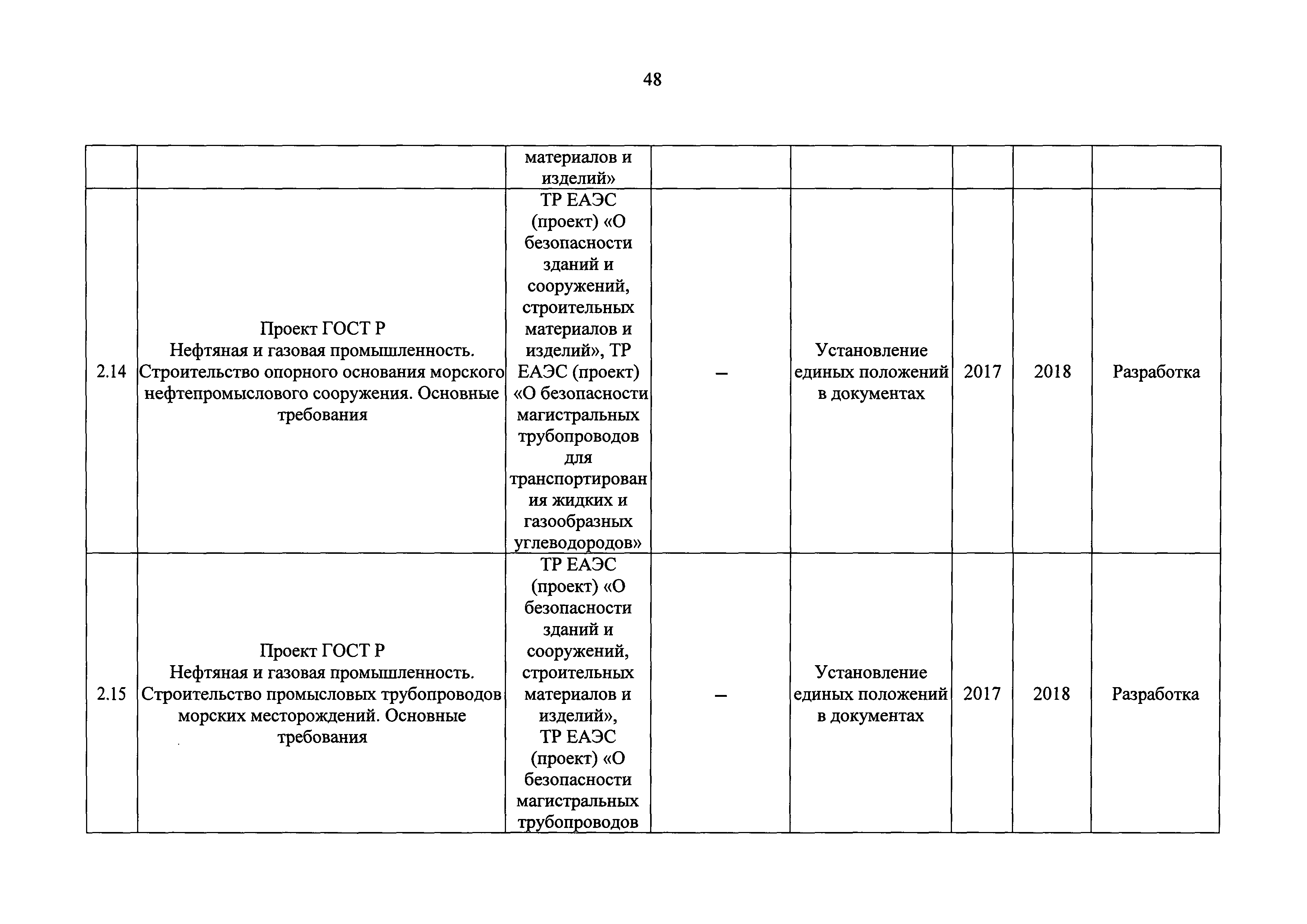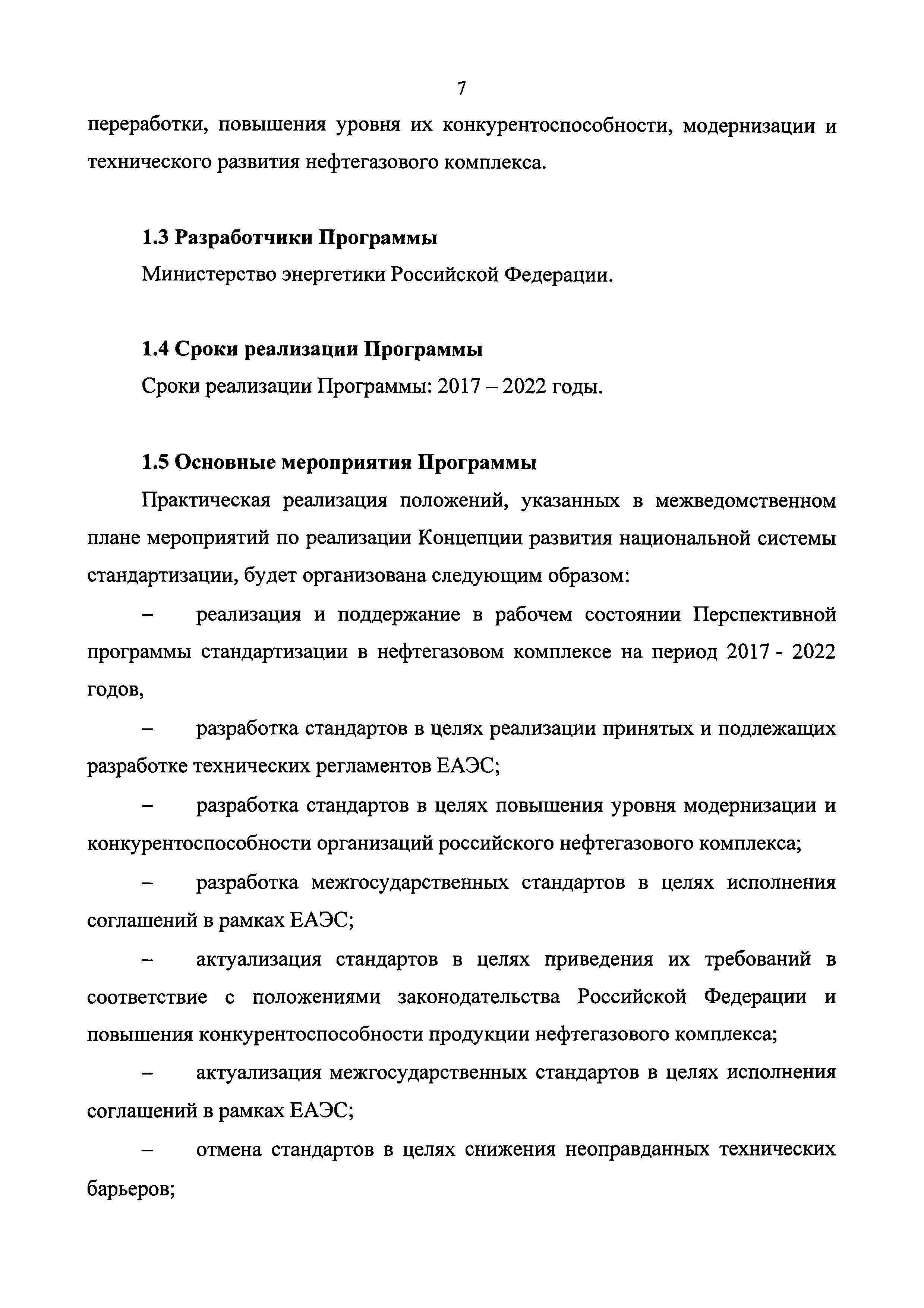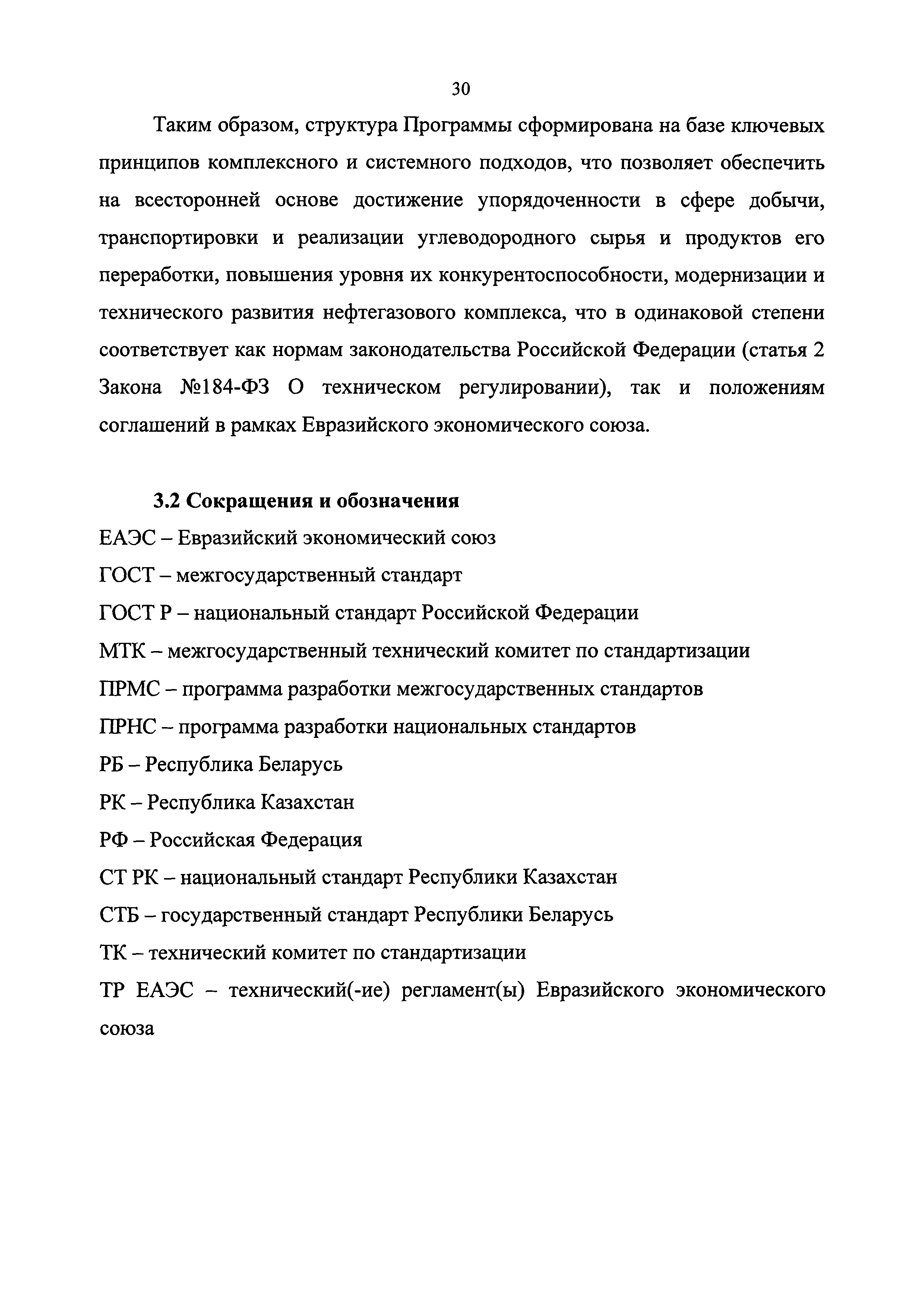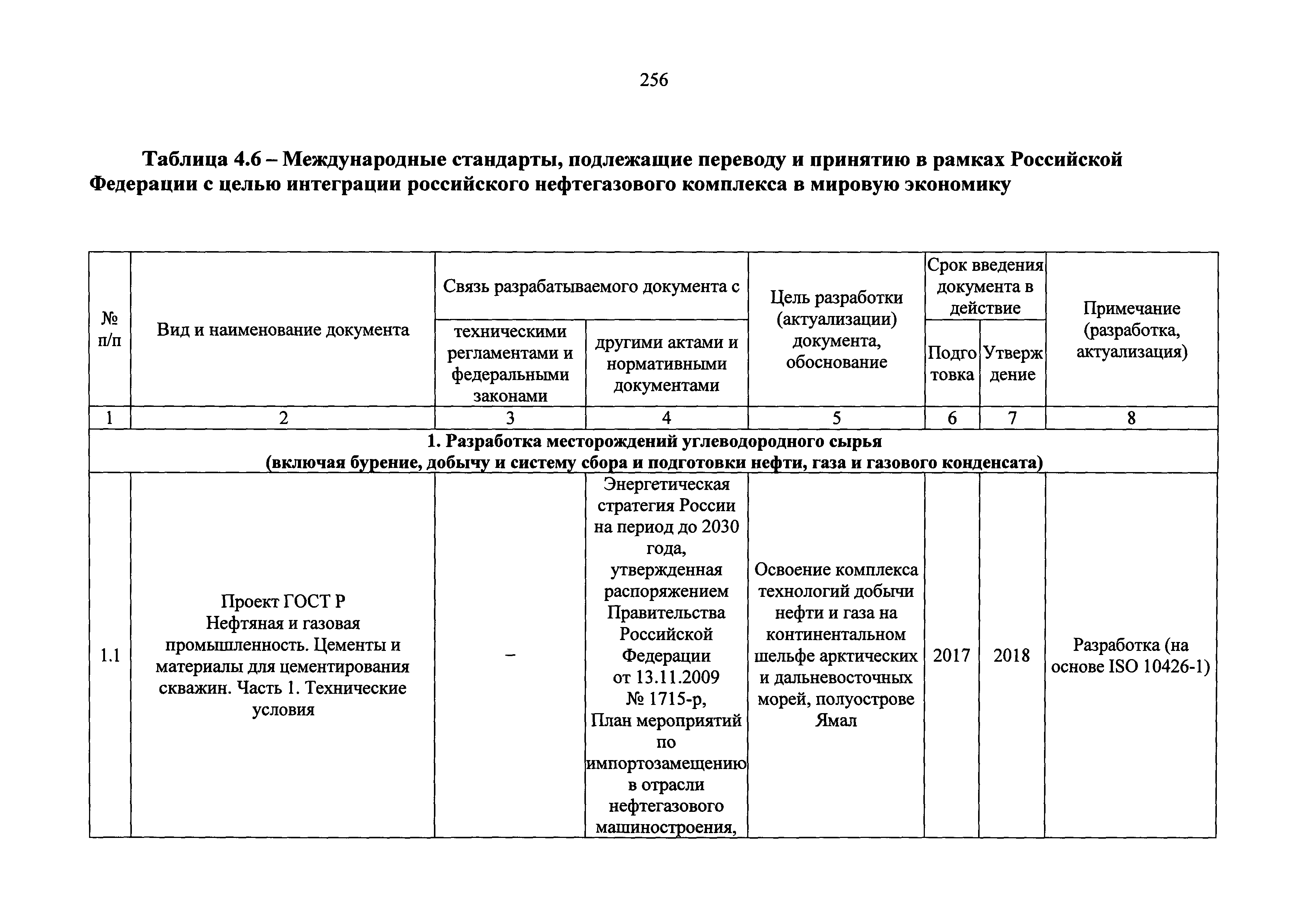 | Оглавление: | 1. Пояснительная записка к Перспективной программе стандартизации в нефтегазовом комплексе на период 2017 - 2022 годов 1.1. Основание для разработки Программы 1.2. Цели и задача Программы 1.3. Разработчики Программы 1.4. Сроки реализации Программы 1.5. Основные мероприятия Программы 1.6. Источники финансирования реализации Программы 1.7. Механизм реализации Программы 2. Краткий обзор механизмов формирования Перспективной программы стандартизации в нефтегазовом комплексе на период 2017 - 2022 годов 2.1. Основные принципы формирования структуры и разделов Программы 2.2. Ключевые аспекты проведения анализа международных, межгосударственных и национальных (государственных) стандартов в целях формирования Программы 2.3. Формирование научно обоснованных предложений по содержанию Программы 3. Паспорт Перспективной программы стандартизации в нефтегазовом комплексе на период 2017 - 2022 годов 3.1. Основные показатели Программы 3.2. Сокращения и обозначения 4. Перспективная программа стандартизации в нефтегазовом комплексе на период 2017 - 2022 годов Таблица 4.1 - Стандарты, которые необходимо разработать в целях реализации принятых и подлежащих разработке технических регламентов ЕАЭС Таблица 4.2 - Межгосударственные стандарты, которые необходимо разработать в целях исполнения соглашений в рамках ЕАЭС Таблица 4.3.1 - Межгосударственные стандарты, которые необходимо актуализировать в целях реализации принятых и подлежащих разработке технических регламентов ЕАЭС Таблица 4.3.2 - Межгосударственные стандарты, которые необходимо актуализировать в целях исполнения соглашений в рамках ЕАЭС, за исключением стандартов, на которые даны ссылки в технических регламентах ЕАЭС Таблица 4.4 - Стандарты, которые необходимо разработать в целях повышения уровня модернизации и конкурентоспособности организаций российского нефтегазового комплекса Таблица 4.5 - Стандарты, подлежащие актуализации в целях приведения в соответствие с положениями законодательства Российской Федерации и повышения конкурентоспособности продукции нефтегазового комплекса Таблица 4.6 - Международные стандарты, подлежащие переводу и принятию в рамках Российской Федерации с целью интеграции российского нефтегазового комплекса в мировую экономику |
