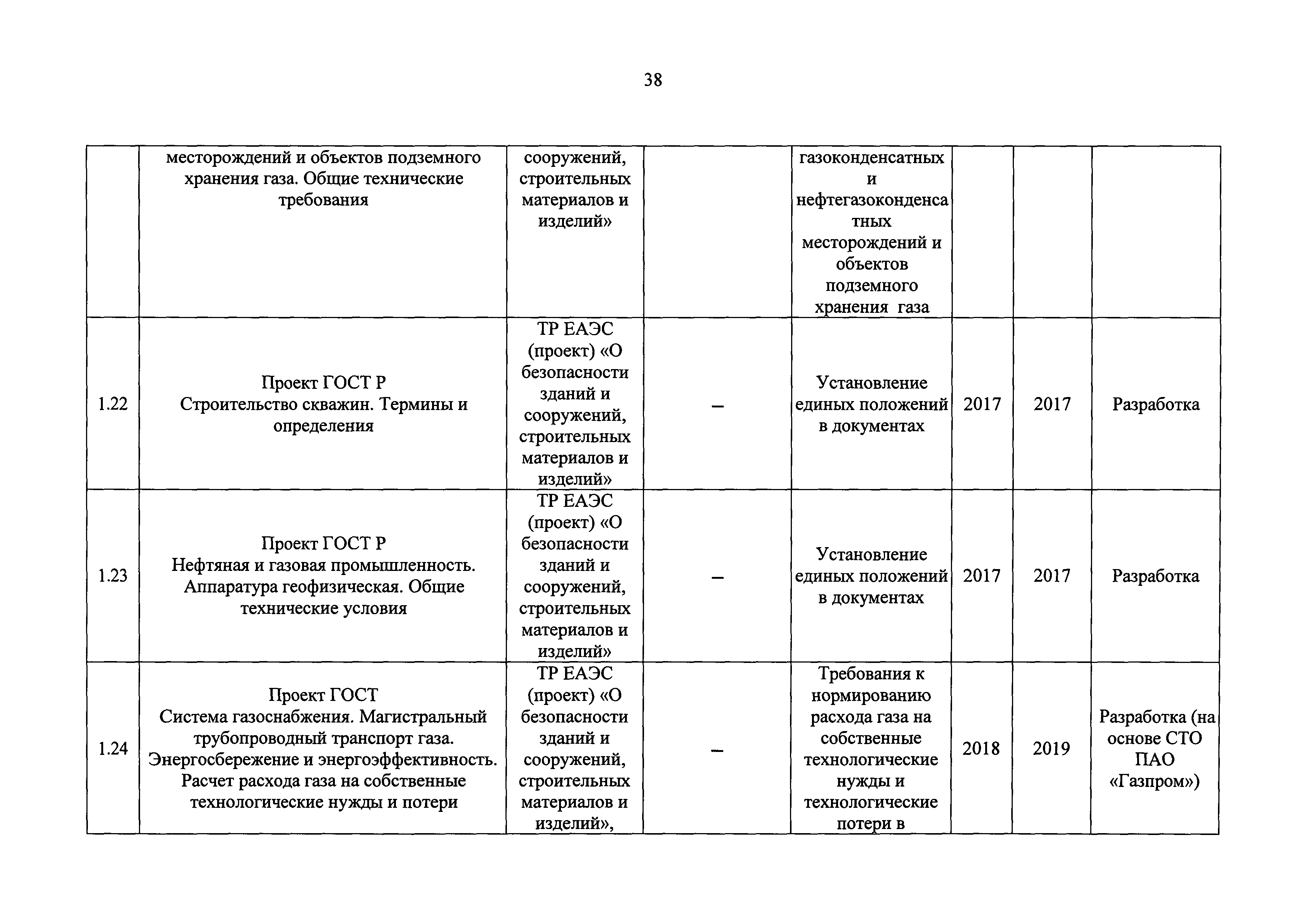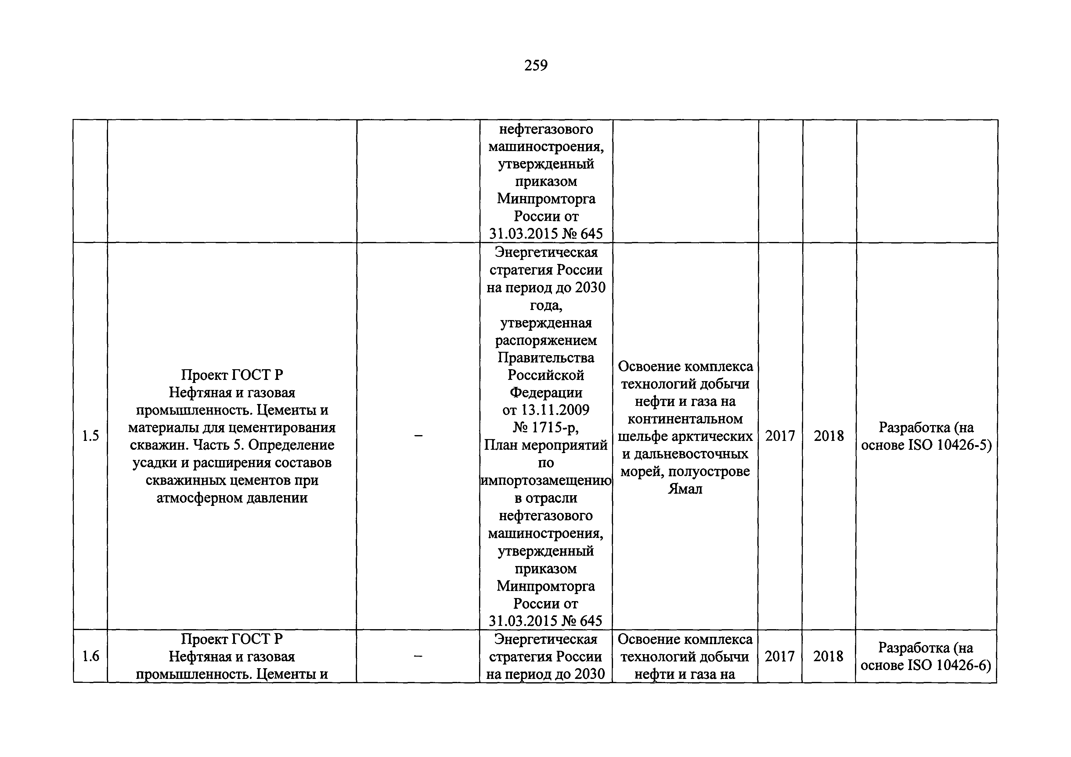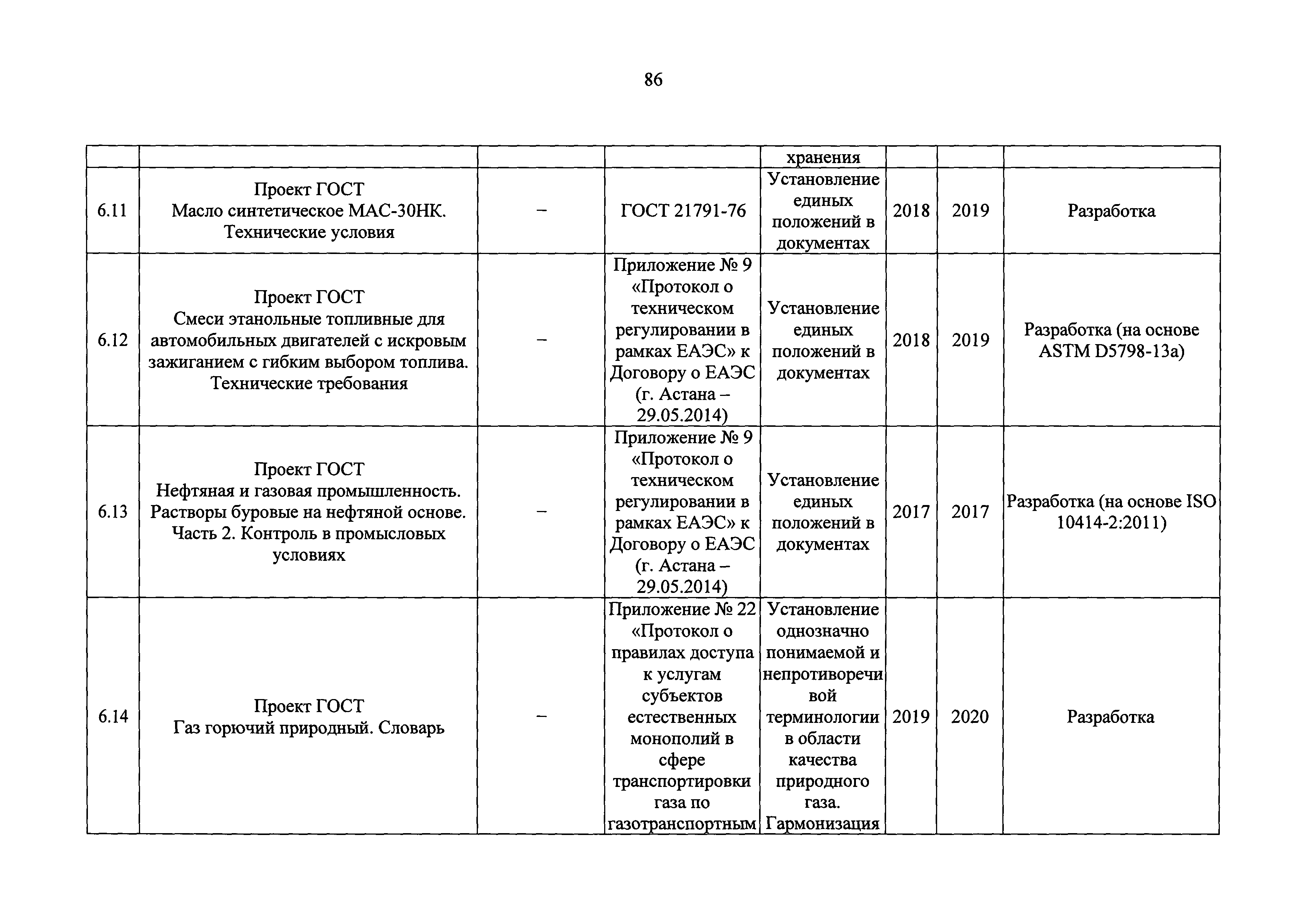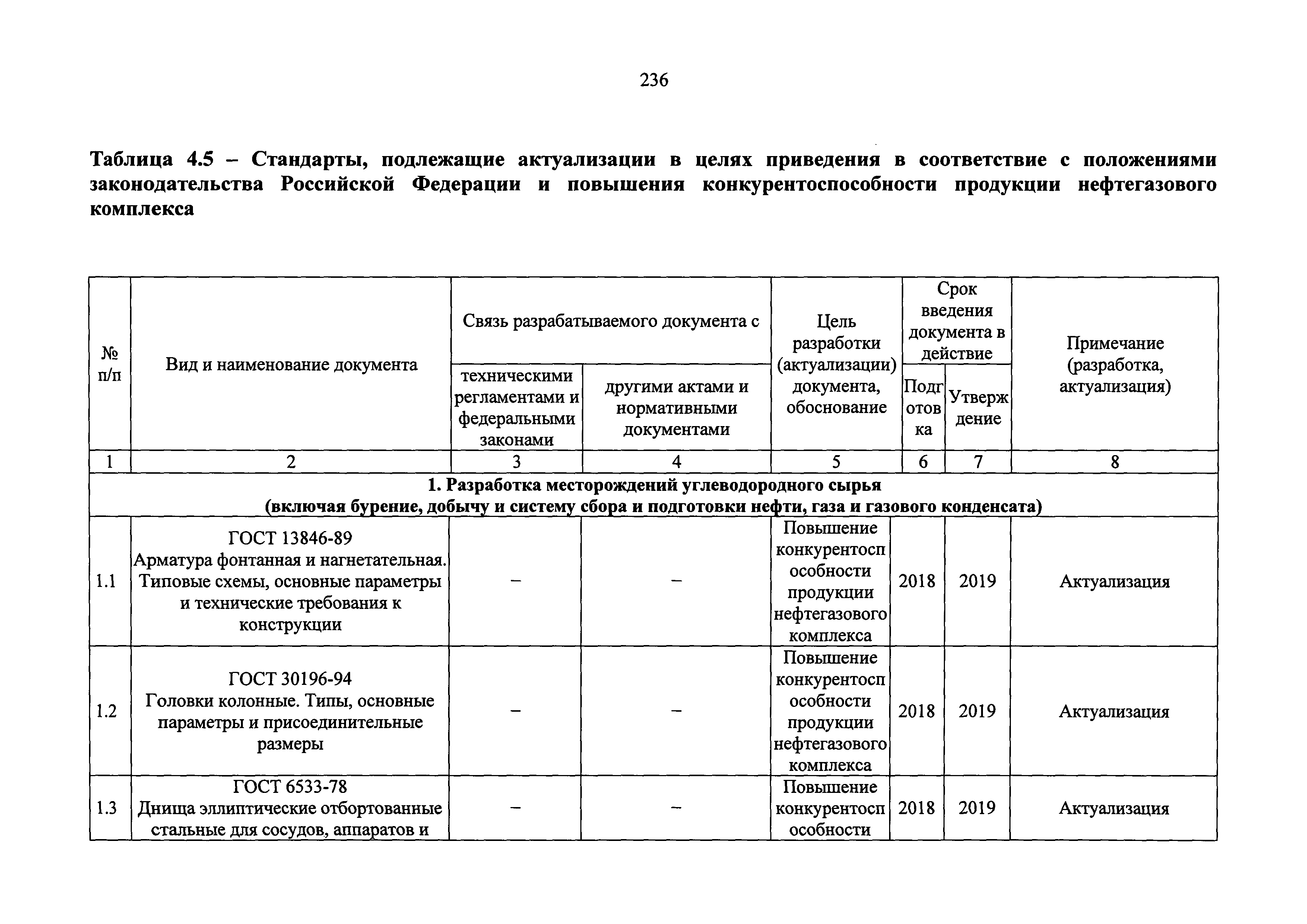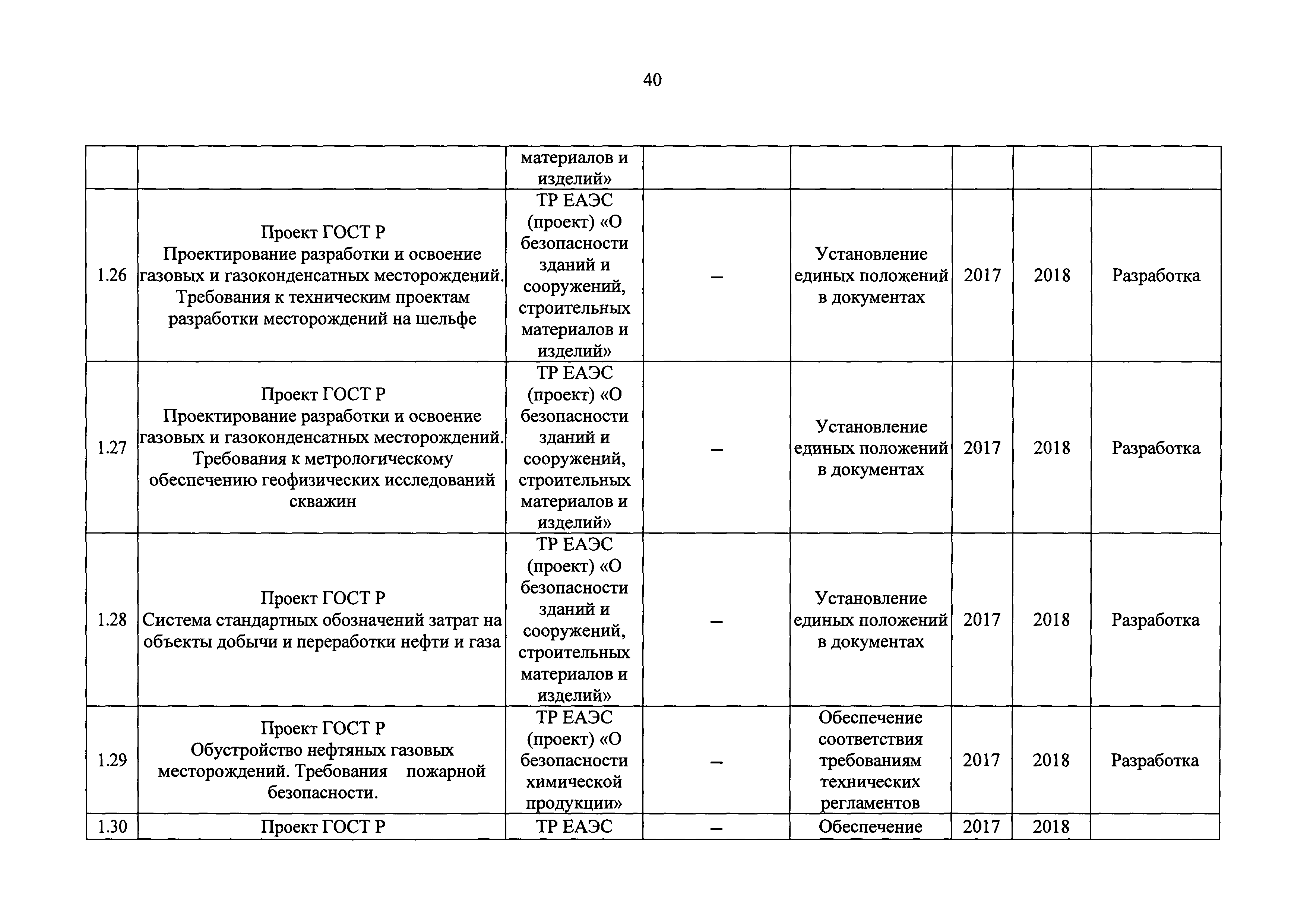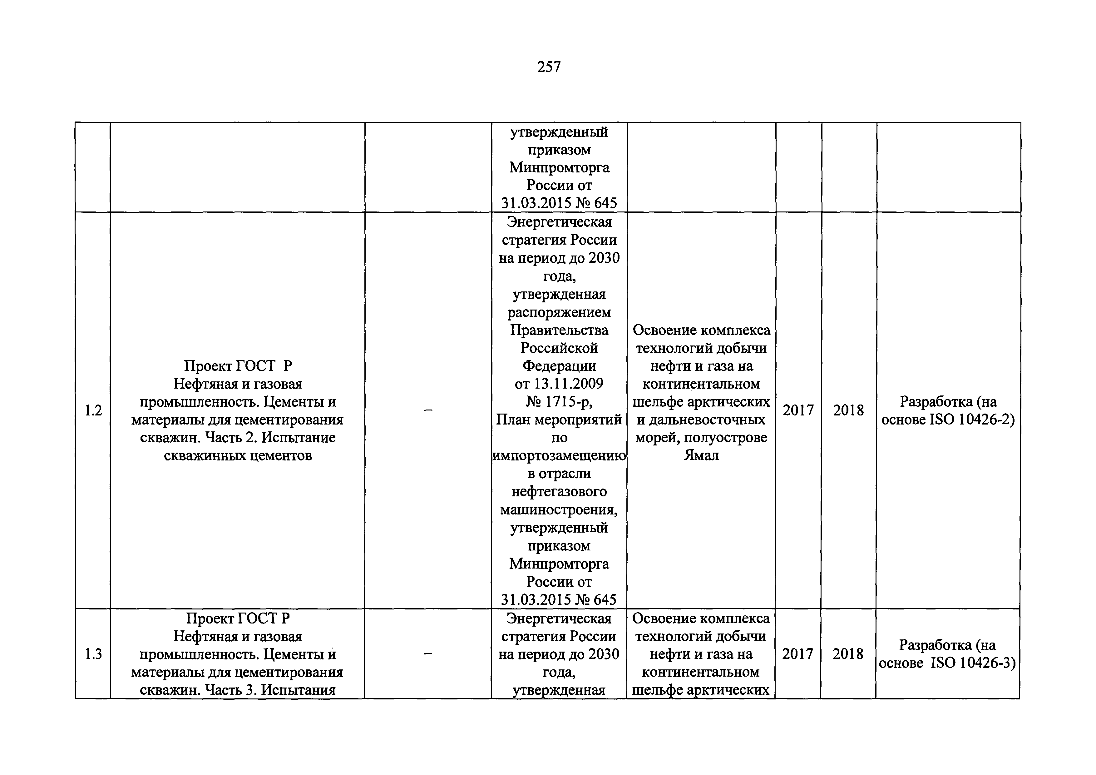 | Оглавление: | 1. Пояснительная записка к Перспективной программе стандартизации в нефтегазовом комплексе на период 2017 - 2022 годов 1.1. Основание для разработки Программы 1.2. Цели и задача Программы 1.3. Разработчики Программы 1.4. Сроки реализации Программы 1.5. Основные мероприятия Программы 1.6. Источники финансирования реализации Программы 1.7. Механизм реализации Программы 2. Краткий обзор механизмов формирования Перспективной программы стандартизации в нефтегазовом комплексе на период 2017 - 2022 годов 2.1. Основные принципы формирования структуры и разделов Программы 2.2. Ключевые аспекты проведения анализа международных, межгосударственных и национальных (государственных) стандартов в целях формирования Программы 2.3. Формирование научно обоснованных предложений по содержанию Программы 3. Паспорт Перспективной программы стандартизации в нефтегазовом комплексе на период 2017 - 2022 годов 3.1. Основные показатели Программы 3.2. Сокращения и обозначения 4. Перспективная программа стандартизации в нефтегазовом комплексе на период 2017 - 2022 годов Таблица 4.1 - Стандарты, которые необходимо разработать в целях реализации принятых и подлежащих разработке технических регламентов ЕАЭС Таблица 4.2 - Межгосударственные стандарты, которые необходимо разработать в целях исполнения соглашений в рамках ЕАЭС Таблица 4.3.1 - Межгосударственные стандарты, которые необходимо актуализировать в целях реализации принятых и подлежащих разработке технических регламентов ЕАЭС Таблица 4.3.2 - Межгосударственные стандарты, которые необходимо актуализировать в целях исполнения соглашений в рамках ЕАЭС, за исключением стандартов, на которые даны ссылки в технических регламентах ЕАЭС Таблица 4.4 - Стандарты, которые необходимо разработать в целях повышения уровня модернизации и конкурентоспособности организаций российского нефтегазового комплекса Таблица 4.5 - Стандарты, подлежащие актуализации в целях приведения в соответствие с положениями законодательства Российской Федерации и повышения конкурентоспособности продукции нефтегазового комплекса Таблица 4.6 - Международные стандарты, подлежащие переводу и принятию в рамках Российской Федерации с целью интеграции российского нефтегазового комплекса в мировую экономику |