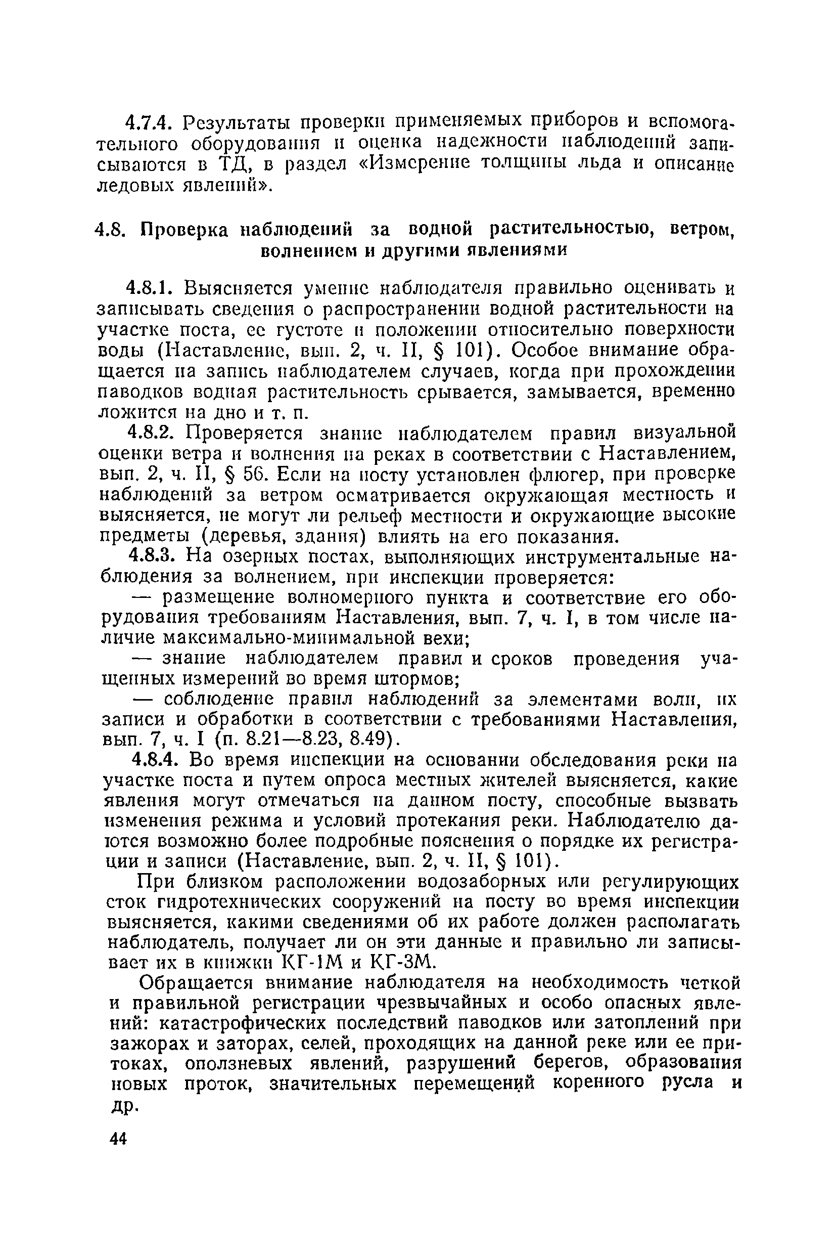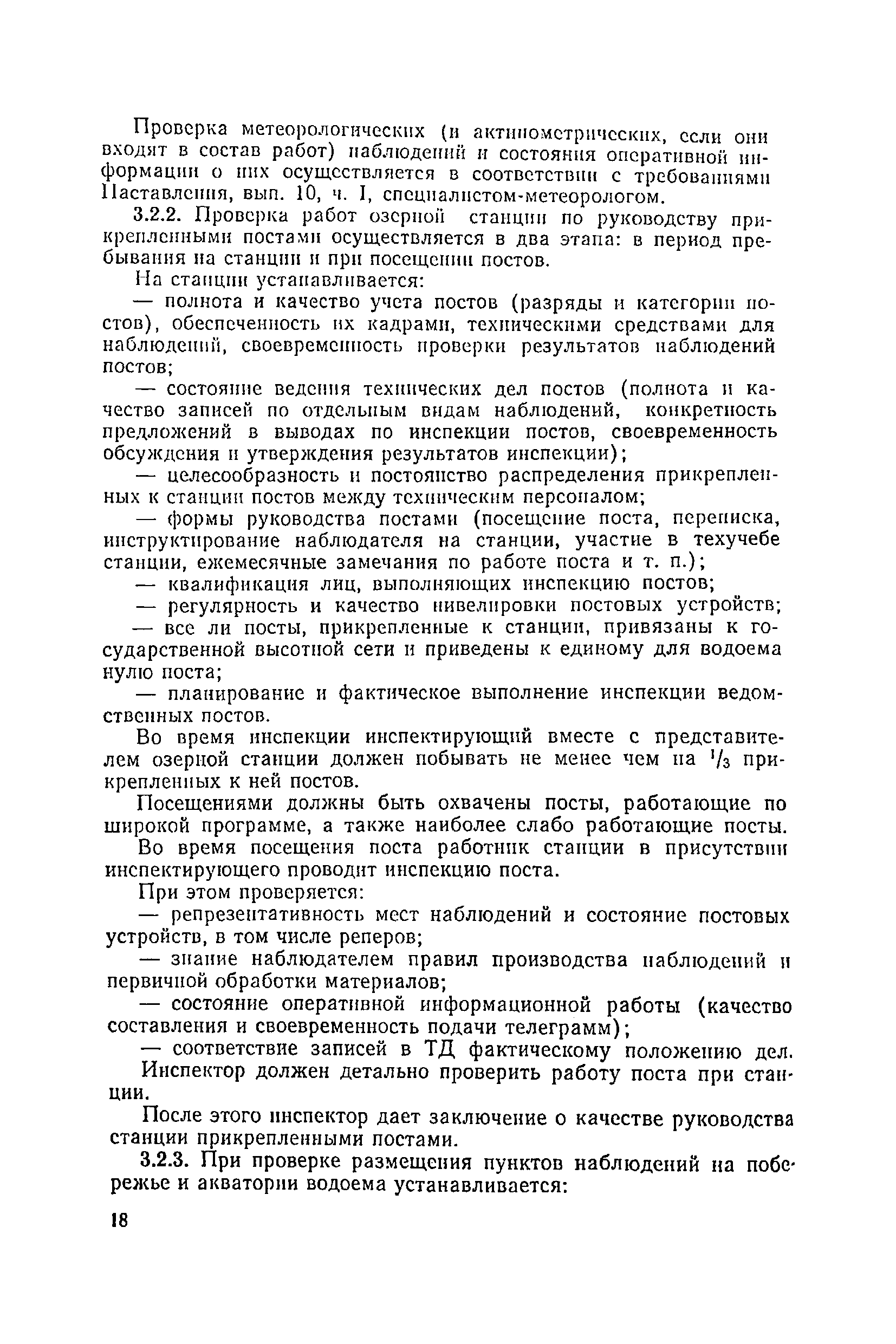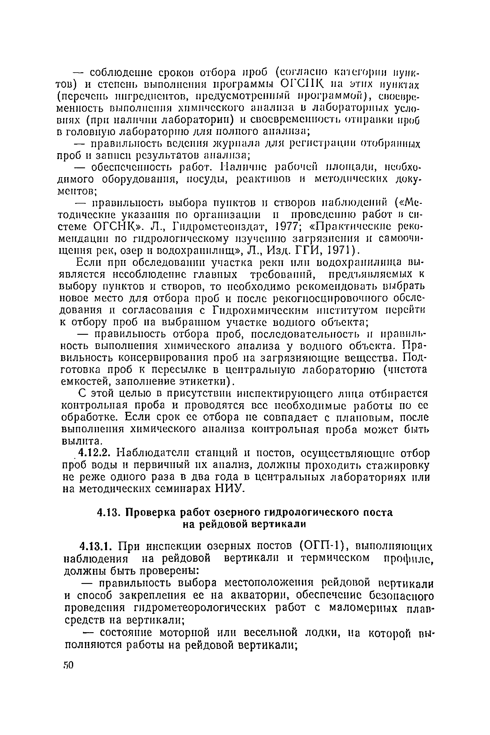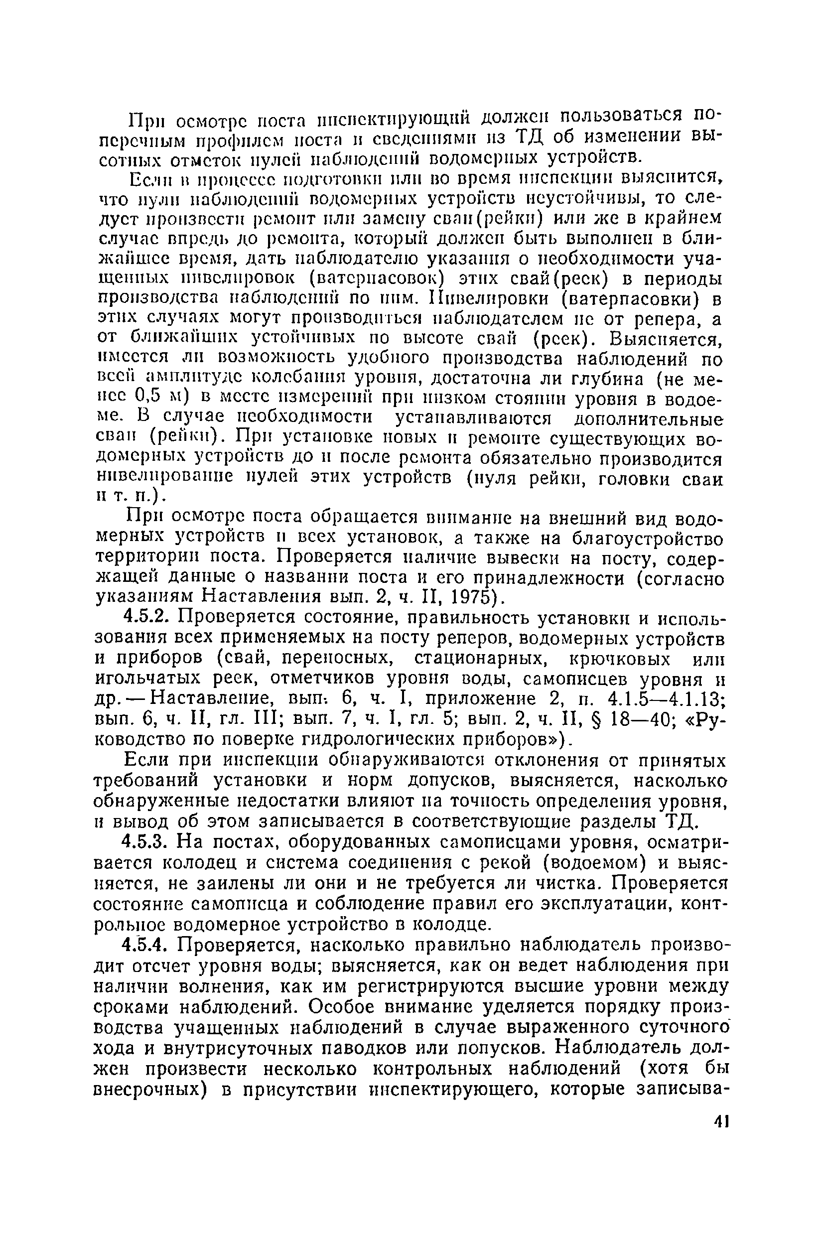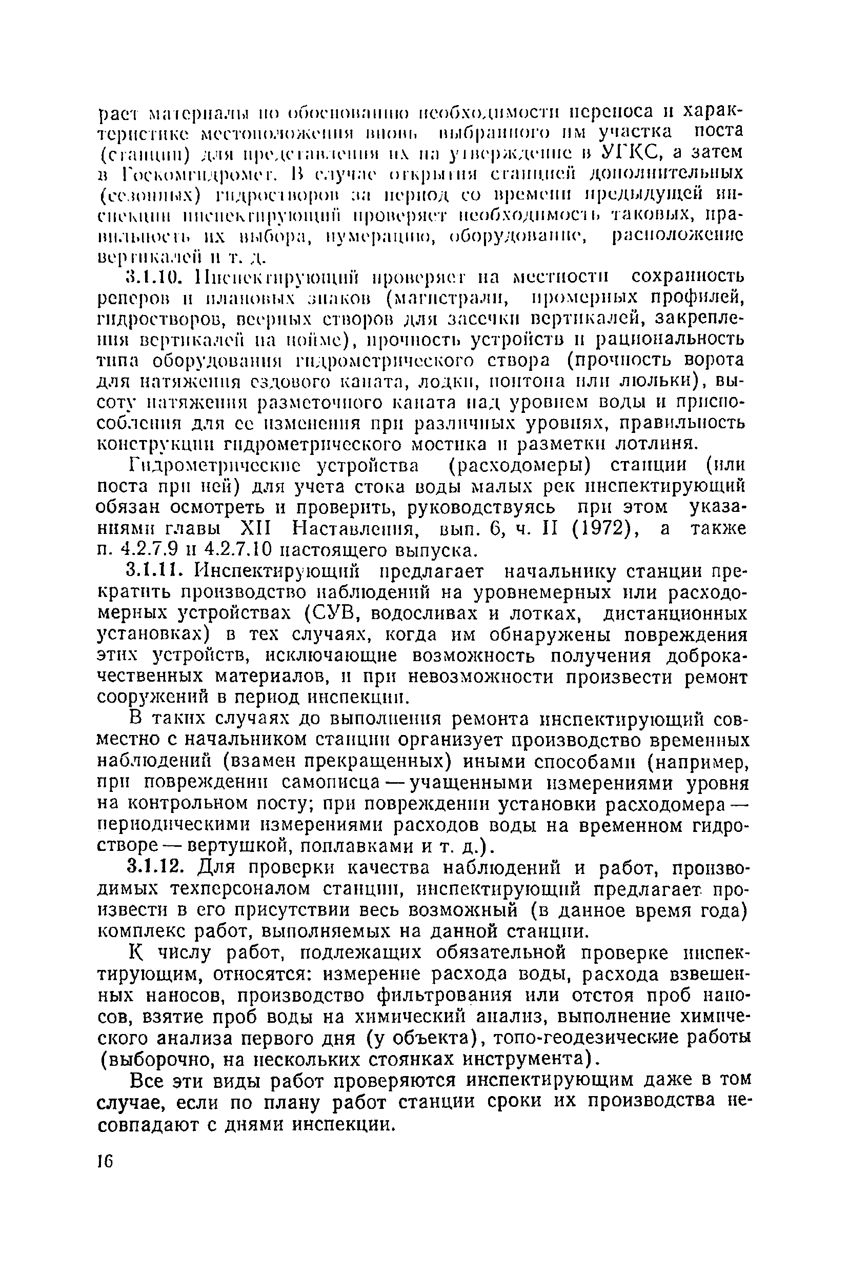 Наставление гидрометеорологическим станциям и постам. Выпуск 10. Инспекции гидрометеорологических станций и постов. Часть II. Инспекция гидрологических станций и постов| Статус: | действует | | Название рус.: | Наставление гидрометеорологическим станциям и постам. Выпуск 10. Инспекции гидрометеорологических станций и постов. Часть II. Инспекция гидрологических станций и постов | | Дата добавления в базу: | 01.02.2020 | | Дата актуализации: | 01.01.2021 | | Дата введения: | 01.01.1981 | | Область применения: | Документ является пособием для работников сети, обеспечивающих текущий контроль и надзор за работой станций и прикрепленных к станциям постов в период между инспекциями | | Оглавление: | Предисловие 1 Общие положения 1.1 Задачи инспекций станций и постов 1.2 Виды и сроки инспекций 1.3 Инспекция ведомственных постов (станций) 1.4 Состав инспектирующих 1.5 Обязанности и права инспектирующих 1.6 Этапы проведения инспекций и контроль за выполнением предложений инспектирующих 2 Подготовка к инспекции станции 2.1 Состав подготовительных работ 2.2 Рекомендации по проведению подготовительных работ 3 Проведение инспекция гидрологических и озерных станций 3.1 Проверка выполнения гидрологической станцией плана работ и руководства постами 3.2 Проверка работы озерной станции по производству наблюдений и руководству постами 3.3 Проверка технического и метрологического обеспечения работ станций 3.4 Проверка работ по обработке и подготовке к печати материалов наблюдений 3.5 Проверка состояния работ по гидрометеорологическому обеспечению народнохозяйственных организаций 3.6 Проверка выполнения методических и научно-исследовательских работ 3.7 Проверка организации труда на станции и ее хозяйственно-финансовой деятельности 3.8 Подведение итогов и оформление результатов инспекция 4 Инспекция гидрологических постов 4.1 Подготовка к инспекции постов. Ознакомление с Техническим делом 4.2 Виды работ при инспекции поста 4.3 Обследование водного объекта на участке поста 4.4 Проверка топографо-геодезического обоснования поста 4.5 Проверка наблюдений за уровнем воды и уклоном водной поверхности 4.6 Проверка наблюдений за температурой воды и воздуха 4.7 Проверка наблюдений за ледовой обстановкой и измерений толщины льда 4.8 Проверка наблюдений за водной растительностью, ветром, волнением и другими явлениями 4.9 Проверка работы по учету стока воды 4.10 Особенности инспекция постов, учитывающих сток в створах гидротехнических сооружений 4.11 Проверка работы по учету стока наносов 4.12 Проверка работ по организации и проведению наблюдений и контроля за загрязнением поверхностных вод суши в системе ОГСНК 4.13 Проверка работ озерного гидрологического поста на рейдовой вертикали 4.14 Проверка информационной работы постов 4.15 Общие вопросы инспекции постов 4.16 Оформление результатов инспекции постов Приложение 1. Схема акта инспекции гидрологических станций Приложение 2. Перечень основных дел (папок) и журналов, которые должны вестись на гидрологических станциях 1 разряда Приложение 3. Акт Инспекторского осмотра поста | | Разработан: | ФГБУ ВНИИСХМ