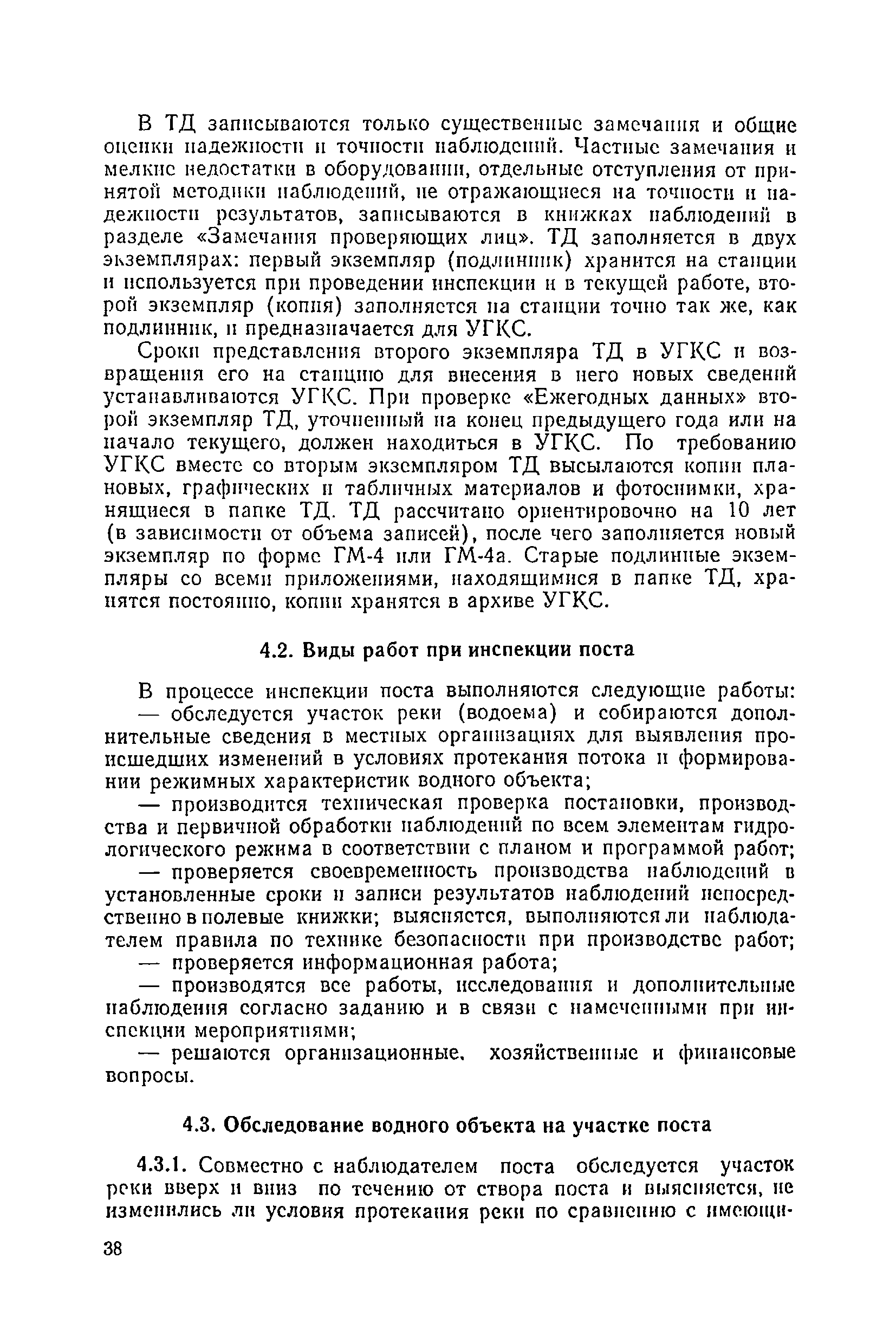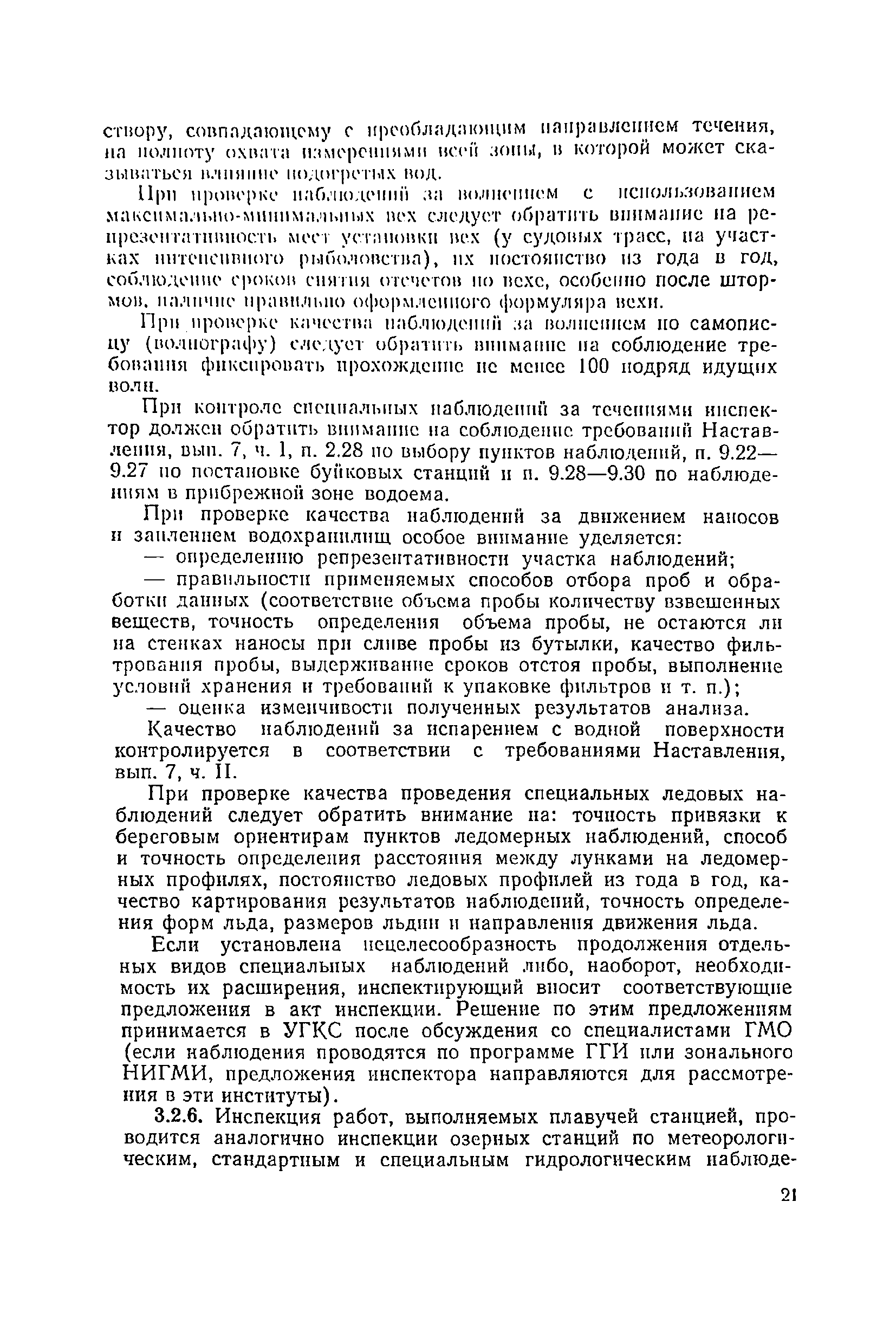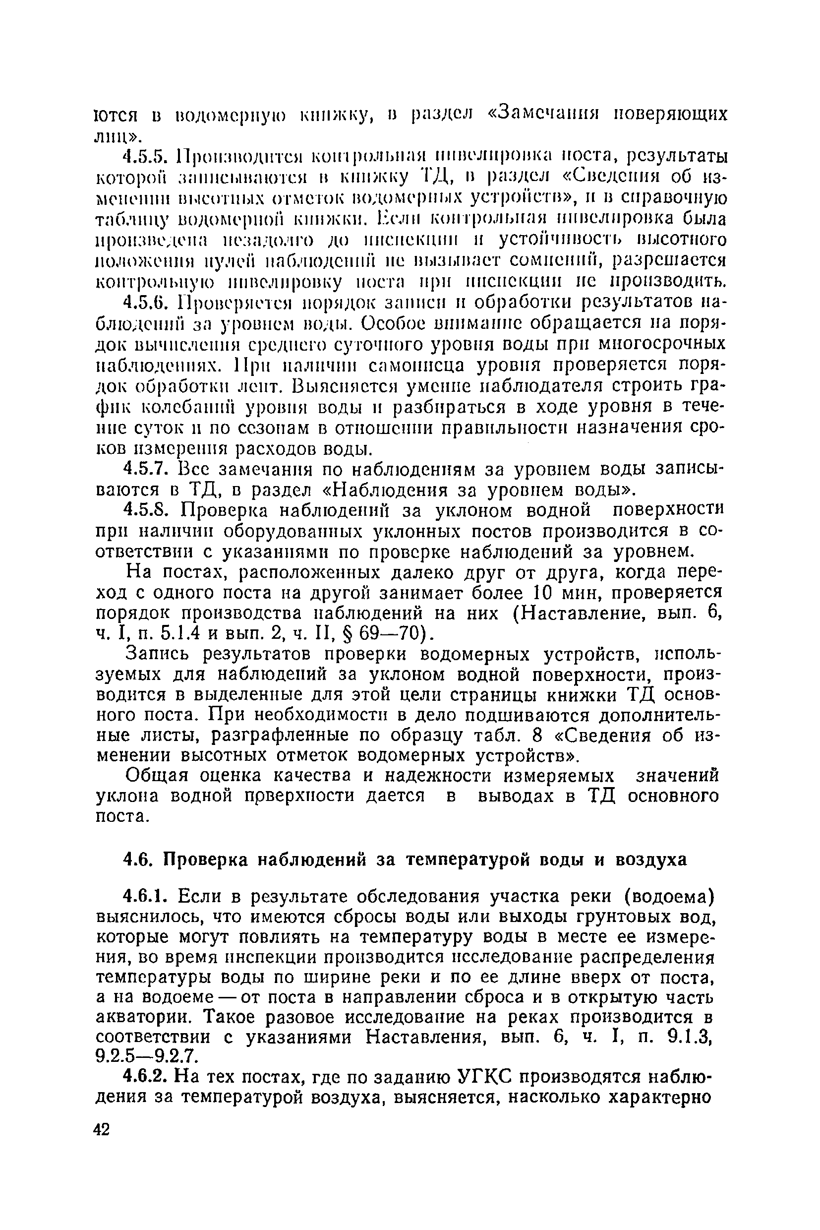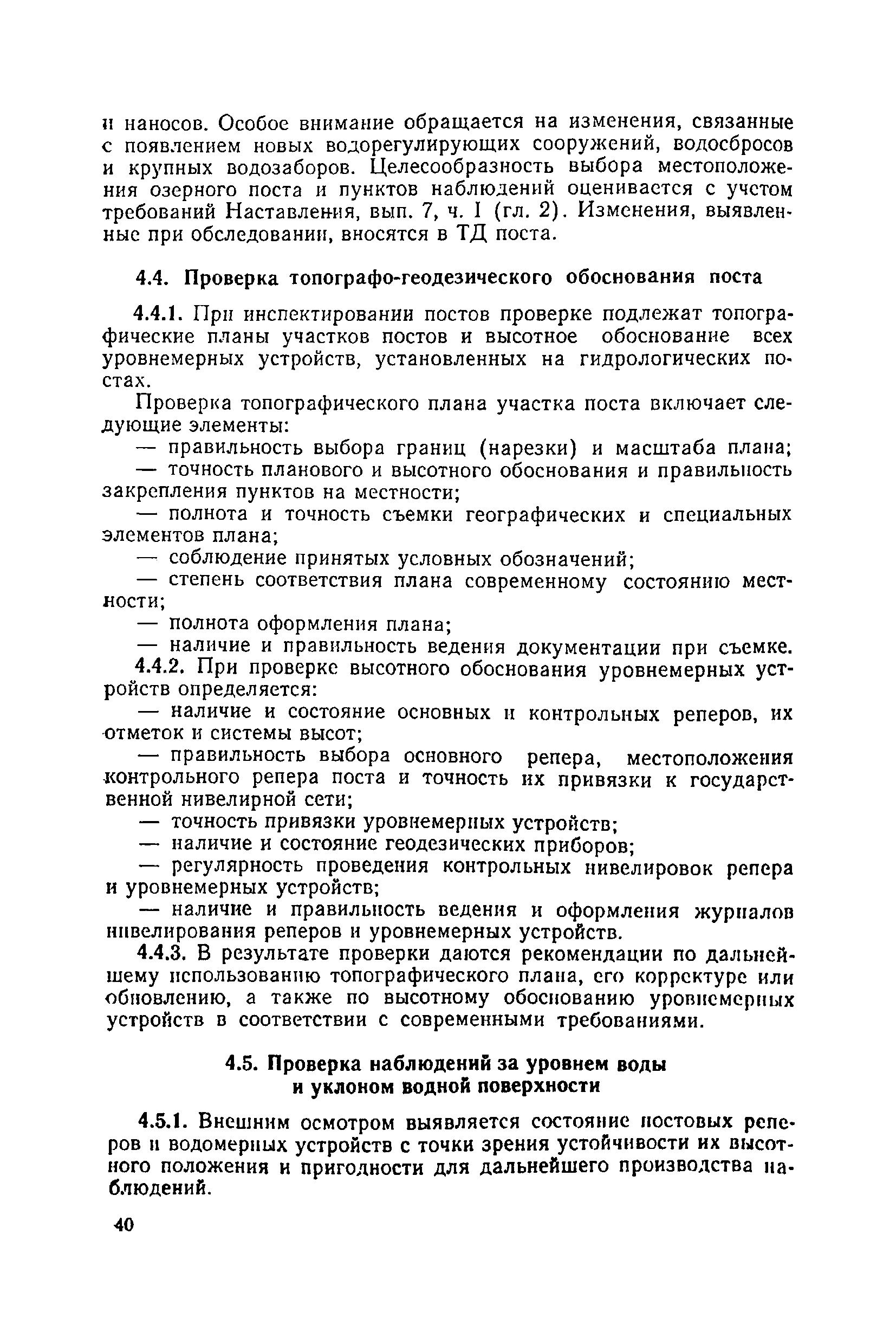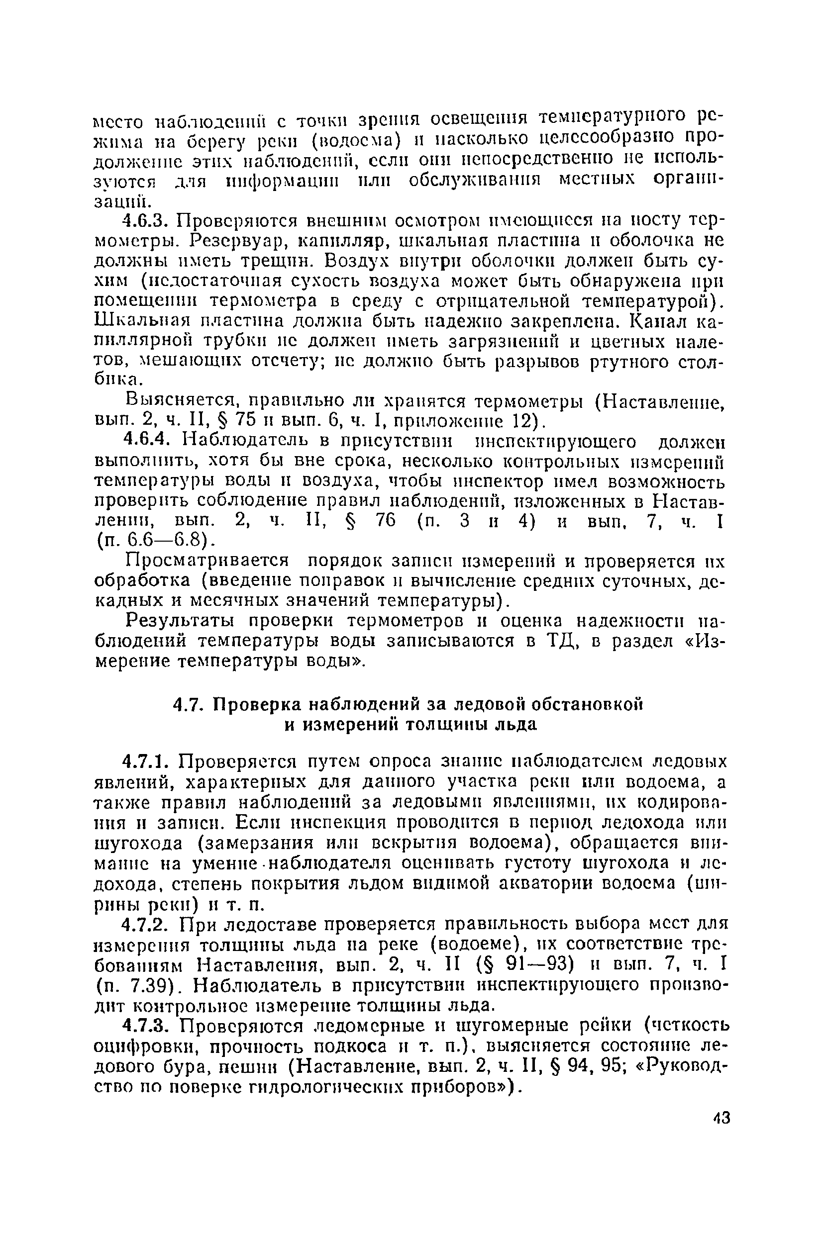 Наставление гидрометеорологическим станциям и постам. Выпуск 10. Инспекции гидрометеорологических станций и постов. Часть II. Инспекция гидрологических станций и постов| Статус: | действует | | Название рус.: | Наставление гидрометеорологическим станциям и постам. Выпуск 10. Инспекции гидрометеорологических станций и постов. Часть II. Инспекция гидрологических станций и постов | | Дата добавления в базу: | 01.02.2020 | | Дата актуализации: | 01.01.2021 | | Дата введения: | 01.01.1981 | | Область применения: | Документ является пособием для работников сети, обеспечивающих текущий контроль и надзор за работой станций и прикрепленных к станциям постов в период между инспекциями | | Оглавление: | Предисловие 1 Общие положения 1.1 Задачи инспекций станций и постов 1.2 Виды и сроки инспекций 1.3 Инспекция ведомственных постов (станций) 1.4 Состав инспектирующих 1.5 Обязанности и права инспектирующих 1.6 Этапы проведения инспекций и контроль за выполнением предложений инспектирующих 2 Подготовка к инспекции станции 2.1 Состав подготовительных работ 2.2 Рекомендации по проведению подготовительных работ 3 Проведение инспекция гидрологических и озерных станций 3.1 Проверка выполнения гидрологической станцией плана работ и руководства постами 3.2 Проверка работы озерной станции по производству наблюдений и руководству постами 3.3 Проверка технического и метрологического обеспечения работ станций 3.4 Проверка работ по обработке и подготовке к печати материалов наблюдений 3.5 Проверка состояния работ по гидрометеорологическому обеспечению народнохозяйственных организаций 3.6 Проверка выполнения методических и научно-исследовательских работ 3.7 Проверка организации труда на станции и ее хозяйственно-финансовой деятельности 3.8 Подведение итогов и оформление результатов инспекция 4 Инспекция гидрологических постов 4.1 Подготовка к инспекции постов. Ознакомление с Техническим делом 4.2 Виды работ при инспекции поста 4.3 Обследование водного объекта на участке поста 4.4 Проверка топографо-геодезического обоснования поста 4.5 Проверка наблюдений за уровнем воды и уклоном водной поверхности 4.6 Проверка наблюдений за температурой воды и воздуха 4.7 Проверка наблюдений за ледовой обстановкой и измерений толщины льда 4.8 Проверка наблюдений за водной растительностью, ветром, волнением и другими явлениями 4.9 Проверка работы по учету стока воды 4.10 Особенности инспекция постов, учитывающих сток в створах гидротехнических сооружений 4.11 Проверка работы по учету стока наносов 4.12 Проверка работ по организации и проведению наблюдений и контроля за загрязнением поверхностных вод суши в системе ОГСНК 4.13 Проверка работ озерного гидрологического поста на рейдовой вертикали 4.14 Проверка информационной работы постов 4.15 Общие вопросы инспекции постов 4.16 Оформление результатов инспекции постов Приложение 1. Схема акта инспекции гидрологических станций Приложение 2. Перечень основных дел (папок) и журналов, которые должны вестись на гидрологических станциях 1 разряда Приложение 3. Акт Инспекторского осмотра поста | | Разработан: | ФГБУ ВНИИСХМ