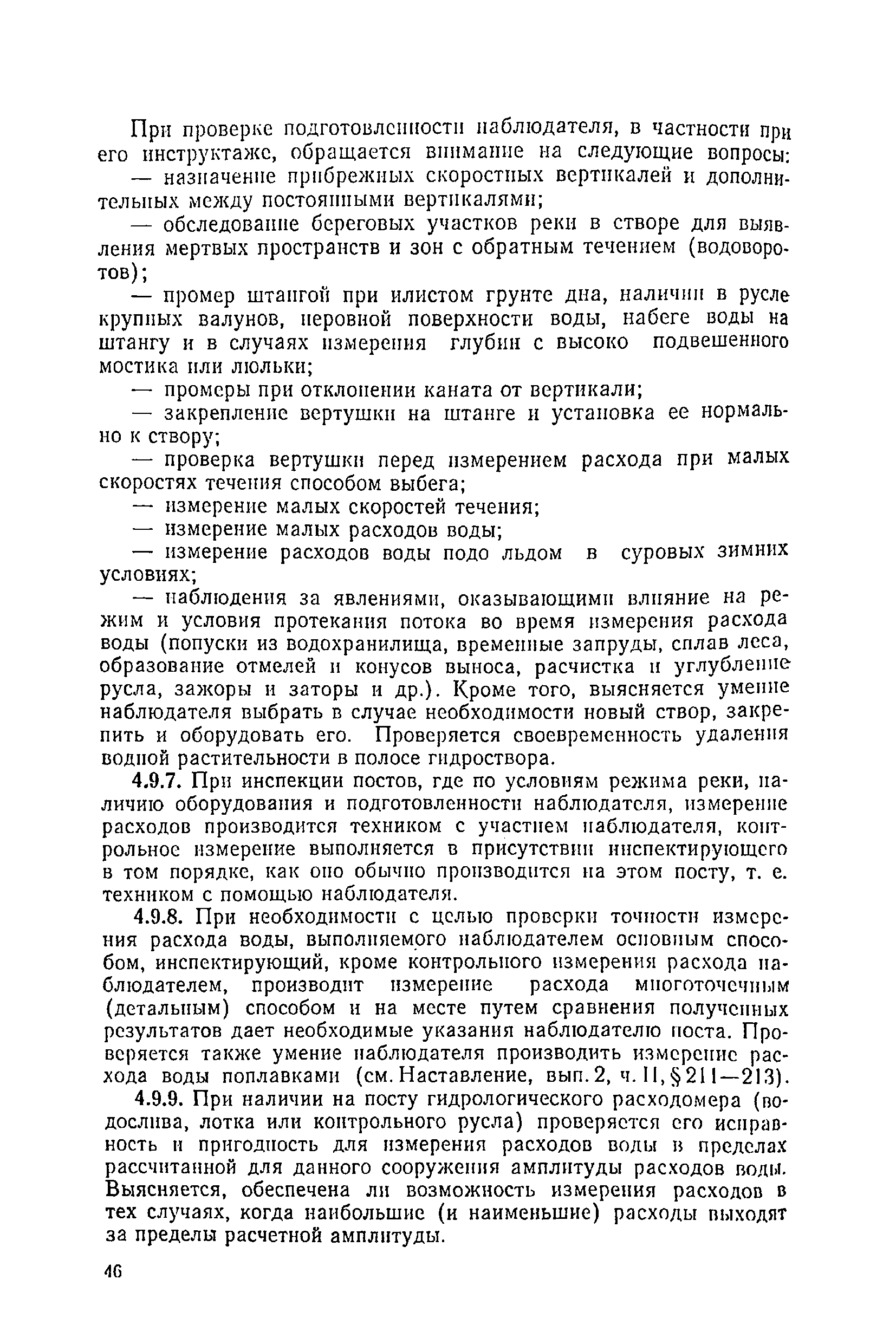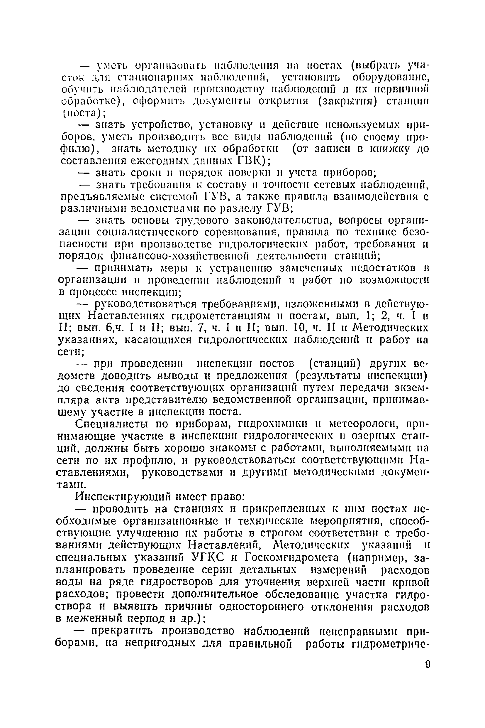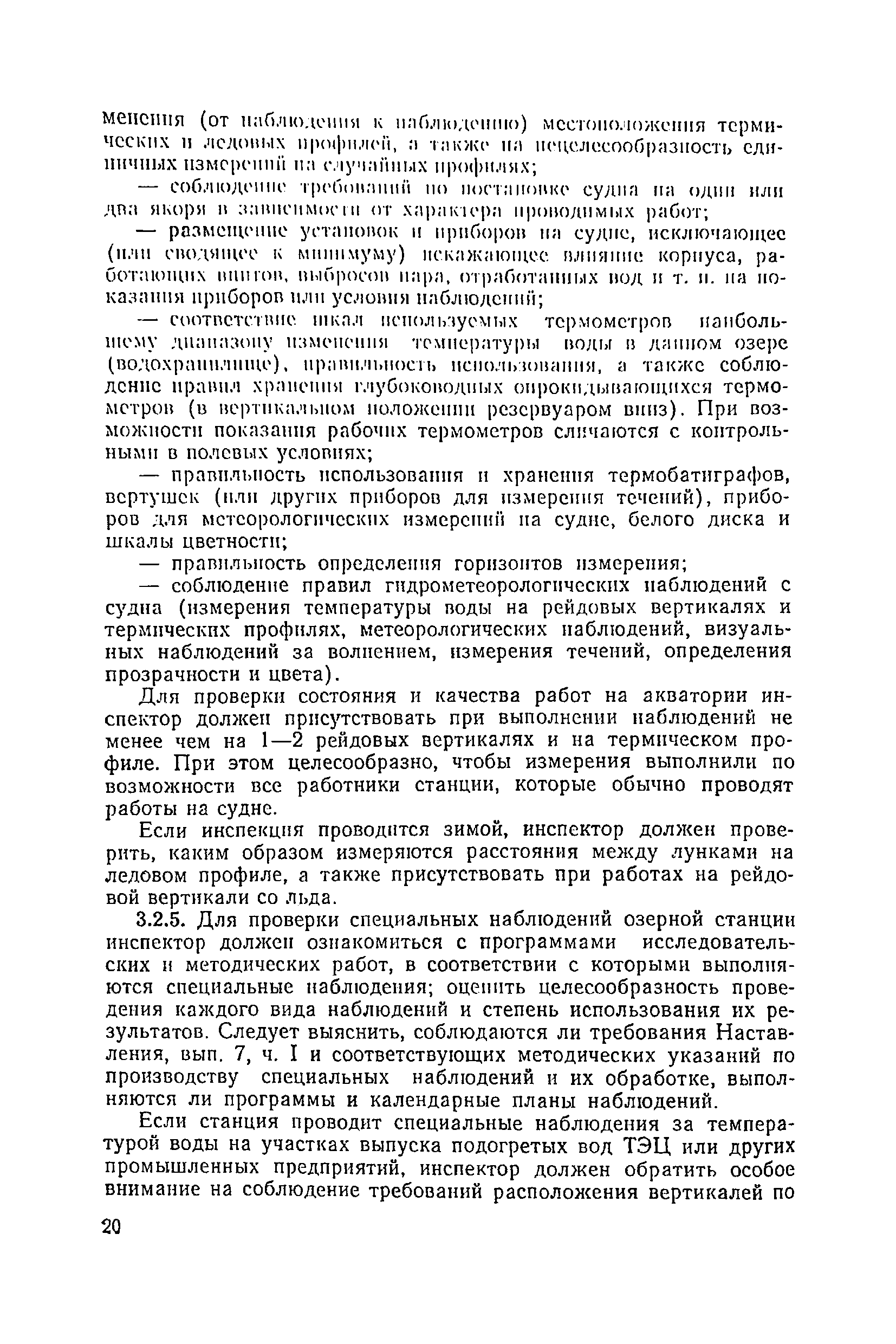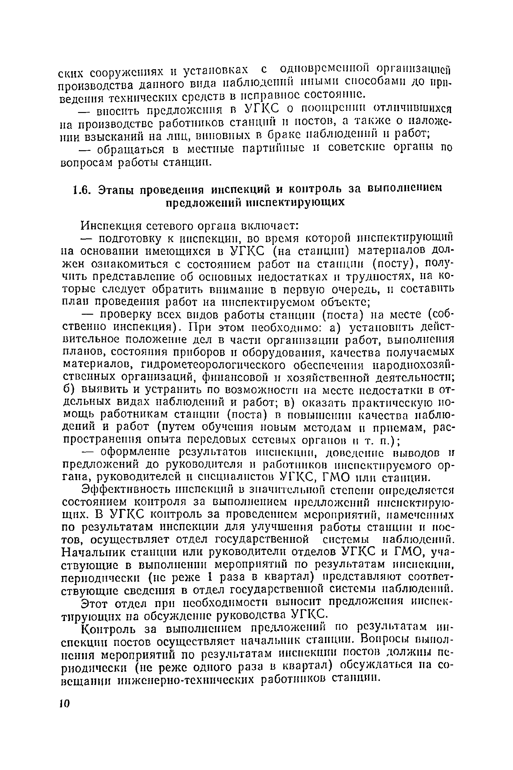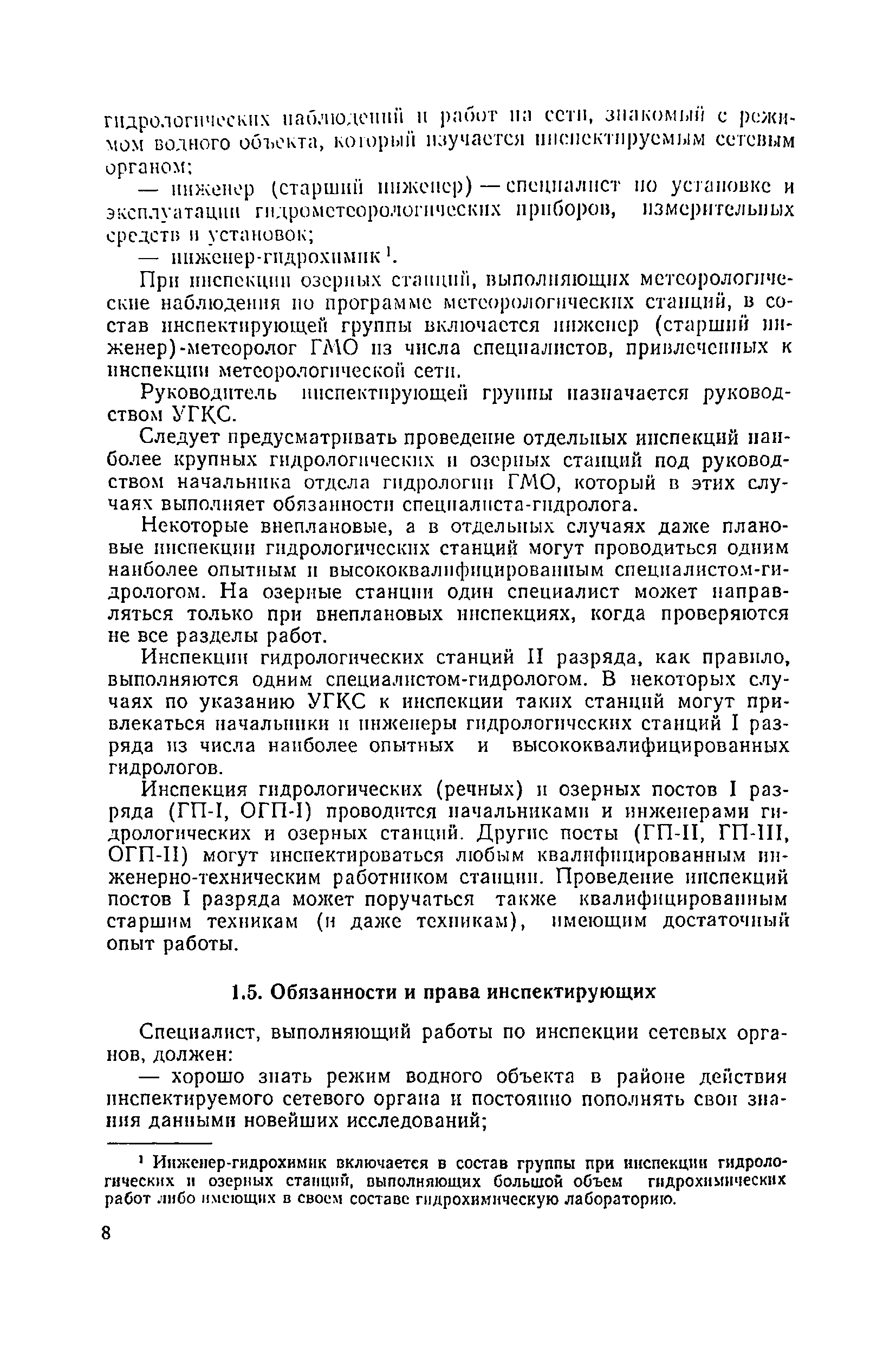 Наставление гидрометеорологическим станциям и постам. Выпуск 10. Инспекции гидрометеорологических станций и постов. Часть II. Инспекция гидрологических станций и постов| Статус: | действует | | Название рус.: | Наставление гидрометеорологическим станциям и постам. Выпуск 10. Инспекции гидрометеорологических станций и постов. Часть II. Инспекция гидрологических станций и постов | | Дата добавления в базу: | 01.02.2020 | | Дата актуализации: | 01.01.2021 | | Дата введения: | 01.01.1981 | | Область применения: | Документ является пособием для работников сети, обеспечивающих текущий контроль и надзор за работой станций и прикрепленных к станциям постов в период между инспекциями | | Оглавление: | Предисловие 1 Общие положения 1.1 Задачи инспекций станций и постов 1.2 Виды и сроки инспекций 1.3 Инспекция ведомственных постов (станций) 1.4 Состав инспектирующих 1.5 Обязанности и права инспектирующих 1.6 Этапы проведения инспекций и контроль за выполнением предложений инспектирующих 2 Подготовка к инспекции станции 2.1 Состав подготовительных работ 2.2 Рекомендации по проведению подготовительных работ 3 Проведение инспекция гидрологических и озерных станций 3.1 Проверка выполнения гидрологической станцией плана работ и руководства постами 3.2 Проверка работы озерной станции по производству наблюдений и руководству постами 3.3 Проверка технического и метрологического обеспечения работ станций 3.4 Проверка работ по обработке и подготовке к печати материалов наблюдений 3.5 Проверка состояния работ по гидрометеорологическому обеспечению народнохозяйственных организаций 3.6 Проверка выполнения методических и научно-исследовательских работ 3.7 Проверка организации труда на станции и ее хозяйственно-финансовой деятельности 3.8 Подведение итогов и оформление результатов инспекция 4 Инспекция гидрологических постов 4.1 Подготовка к инспекции постов. Ознакомление с Техническим делом 4.2 Виды работ при инспекции поста 4.3 Обследование водного объекта на участке поста 4.4 Проверка топографо-геодезического обоснования поста 4.5 Проверка наблюдений за уровнем воды и уклоном водной поверхности 4.6 Проверка наблюдений за температурой воды и воздуха 4.7 Проверка наблюдений за ледовой обстановкой и измерений толщины льда 4.8 Проверка наблюдений за водной растительностью, ветром, волнением и другими явлениями 4.9 Проверка работы по учету стока воды 4.10 Особенности инспекция постов, учитывающих сток в створах гидротехнических сооружений 4.11 Проверка работы по учету стока наносов 4.12 Проверка работ по организации и проведению наблюдений и контроля за загрязнением поверхностных вод суши в системе ОГСНК 4.13 Проверка работ озерного гидрологического поста на рейдовой вертикали 4.14 Проверка информационной работы постов 4.15 Общие вопросы инспекции постов 4.16 Оформление результатов инспекции постов Приложение 1. Схема акта инспекции гидрологических станций Приложение 2. Перечень основных дел (папок) и журналов, которые должны вестись на гидрологических станциях 1 разряда Приложение 3. Акт Инспекторского осмотра поста | | Разработан: | ФГБУ ВНИИСХМ