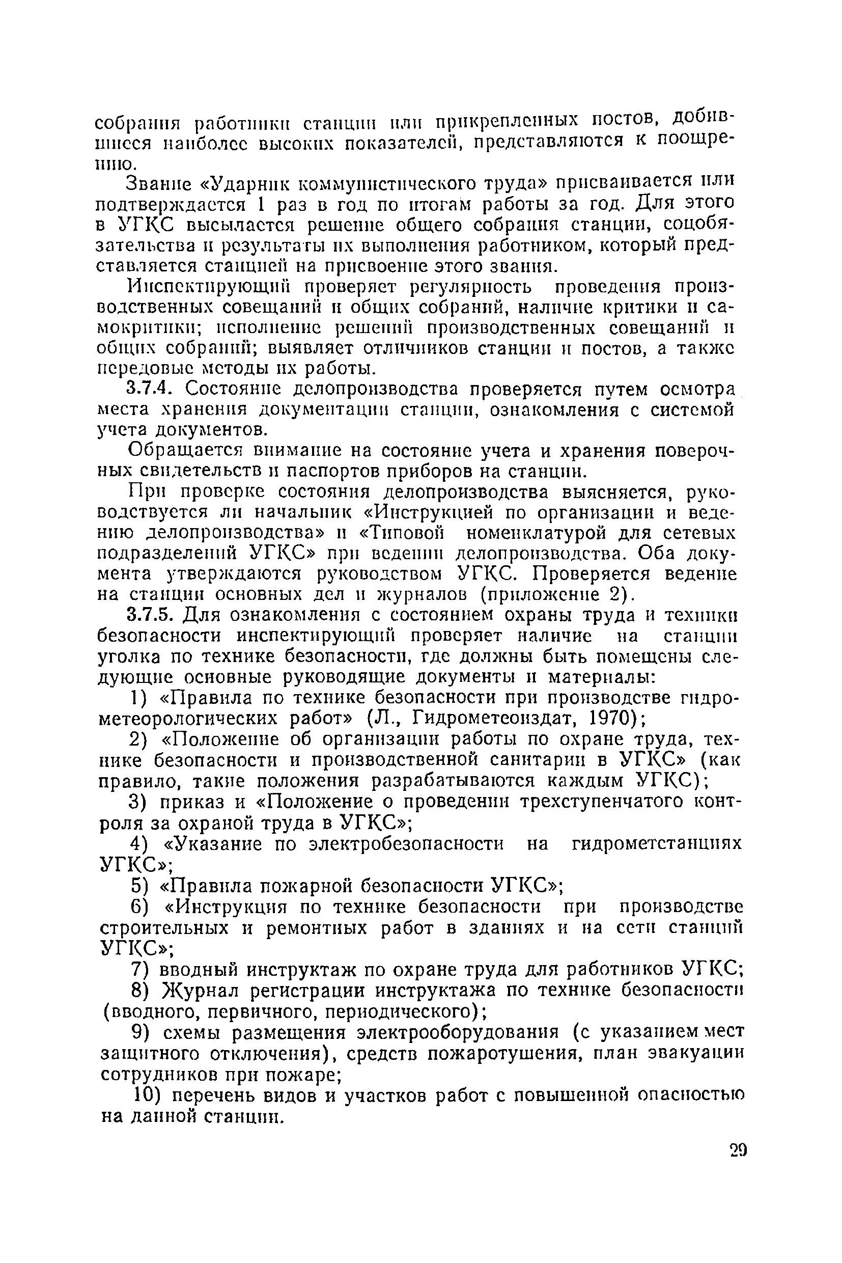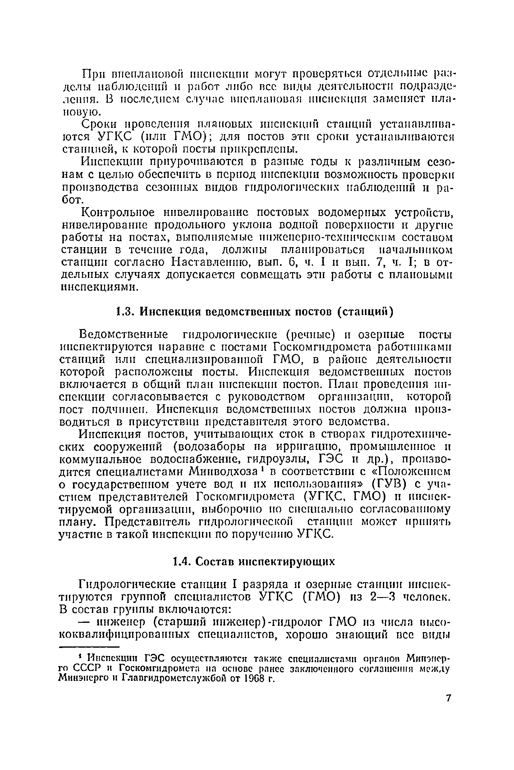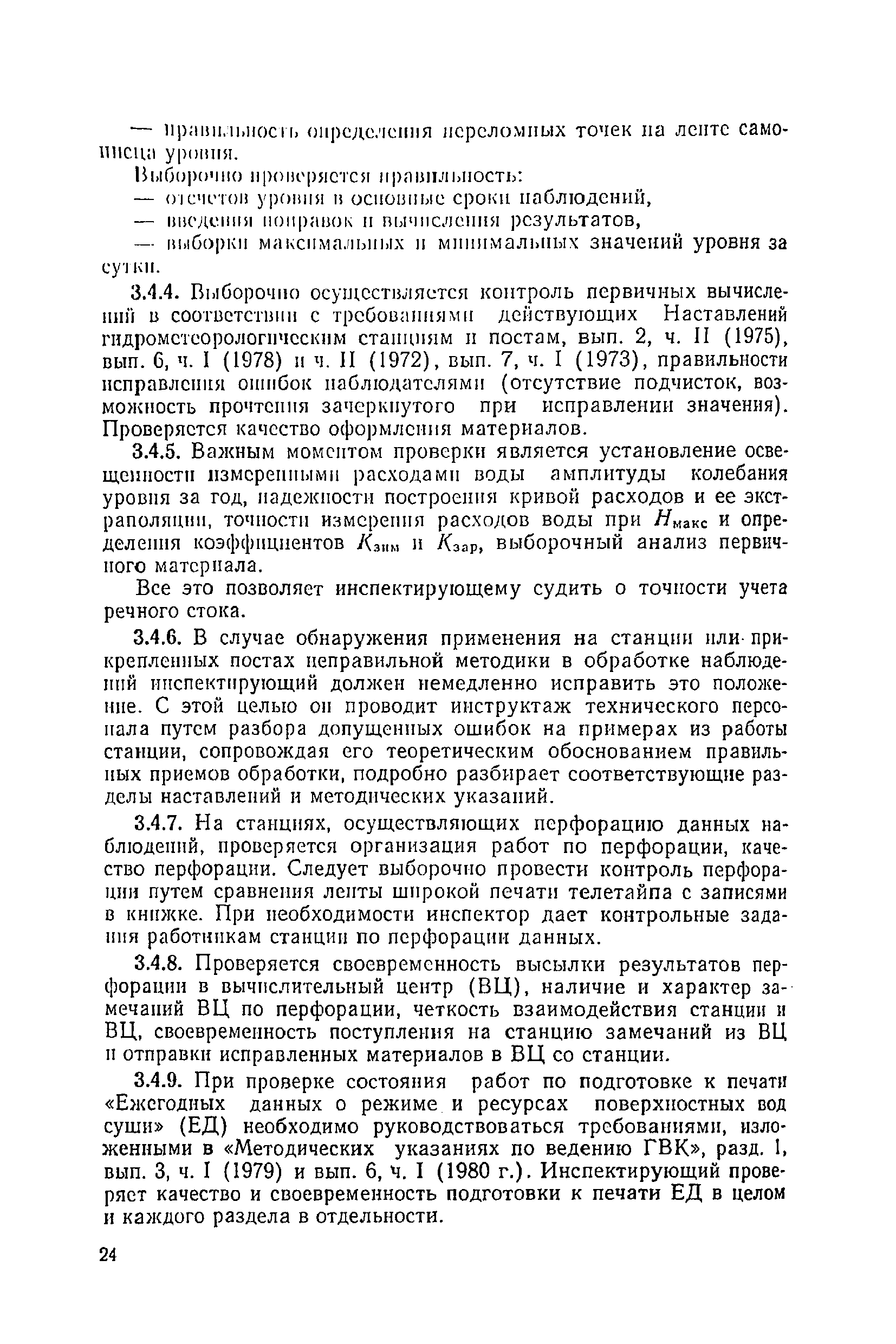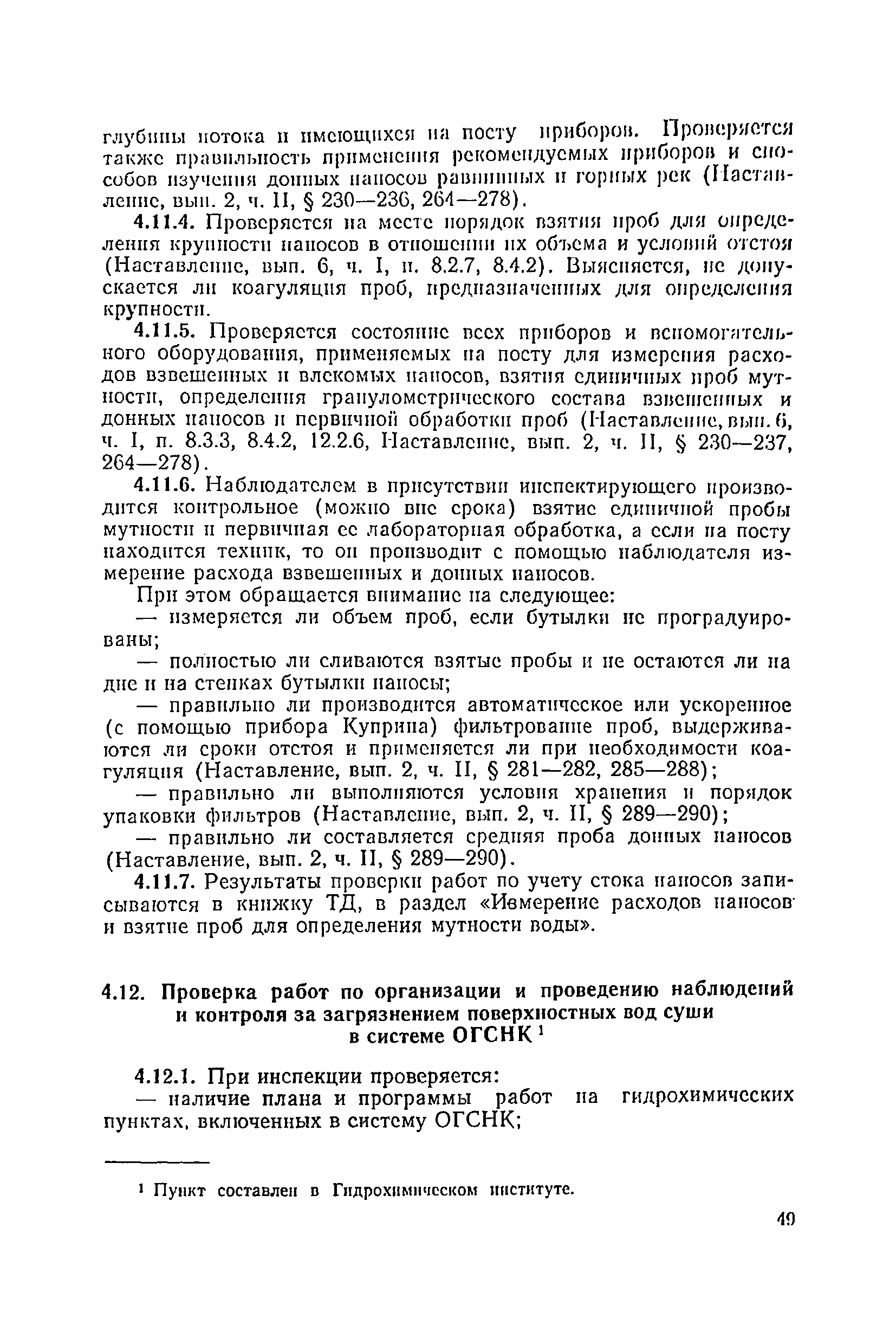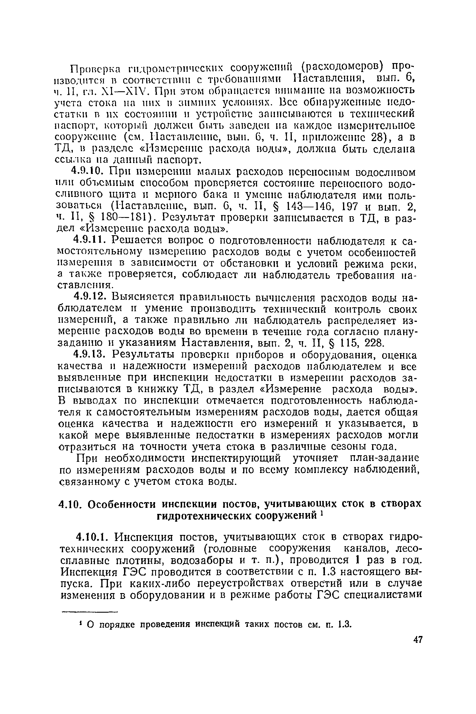 Наставление гидрометеорологическим станциям и постам. Выпуск 10. Инспекции гидрометеорологических станций и постов. Часть II. Инспекция гидрологических станций и постов| Статус: | действует | | Название рус.: | Наставление гидрометеорологическим станциям и постам. Выпуск 10. Инспекции гидрометеорологических станций и постов. Часть II. Инспекция гидрологических станций и постов | | Дата добавления в базу: | 01.02.2020 | | Дата актуализации: | 01.01.2021 | | Дата введения: | 01.01.1981 | | Область применения: | Документ является пособием для работников сети, обеспечивающих текущий контроль и надзор за работой станций и прикрепленных к станциям постов в период между инспекциями | | Оглавление: | Предисловие 1 Общие положения 1.1 Задачи инспекций станций и постов 1.2 Виды и сроки инспекций 1.3 Инспекция ведомственных постов (станций) 1.4 Состав инспектирующих 1.5 Обязанности и права инспектирующих 1.6 Этапы проведения инспекций и контроль за выполнением предложений инспектирующих 2 Подготовка к инспекции станции 2.1 Состав подготовительных работ 2.2 Рекомендации по проведению подготовительных работ 3 Проведение инспекция гидрологических и озерных станций 3.1 Проверка выполнения гидрологической станцией плана работ и руководства постами 3.2 Проверка работы озерной станции по производству наблюдений и руководству постами 3.3 Проверка технического и метрологического обеспечения работ станций 3.4 Проверка работ по обработке и подготовке к печати материалов наблюдений 3.5 Проверка состояния работ по гидрометеорологическому обеспечению народнохозяйственных организаций 3.6 Проверка выполнения методических и научно-исследовательских работ 3.7 Проверка организации труда на станции и ее хозяйственно-финансовой деятельности 3.8 Подведение итогов и оформление результатов инспекция 4 Инспекция гидрологических постов 4.1 Подготовка к инспекции постов. Ознакомление с Техническим делом 4.2 Виды работ при инспекции поста 4.3 Обследование водного объекта на участке поста 4.4 Проверка топографо-геодезического обоснования поста 4.5 Проверка наблюдений за уровнем воды и уклоном водной поверхности 4.6 Проверка наблюдений за температурой воды и воздуха 4.7 Проверка наблюдений за ледовой обстановкой и измерений толщины льда 4.8 Проверка наблюдений за водной растительностью, ветром, волнением и другими явлениями 4.9 Проверка работы по учету стока воды 4.10 Особенности инспекция постов, учитывающих сток в створах гидротехнических сооружений 4.11 Проверка работы по учету стока наносов 4.12 Проверка работ по организации и проведению наблюдений и контроля за загрязнением поверхностных вод суши в системе ОГСНК 4.13 Проверка работ озерного гидрологического поста на рейдовой вертикали 4.14 Проверка информационной работы постов 4.15 Общие вопросы инспекции постов 4.16 Оформление результатов инспекции постов Приложение 1. Схема акта инспекции гидрологических станций Приложение 2. Перечень основных дел (папок) и журналов, которые должны вестись на гидрологических станциях 1 разряда Приложение 3. Акт Инспекторского осмотра поста | | Разработан: | ФГБУ ВНИИСХМ